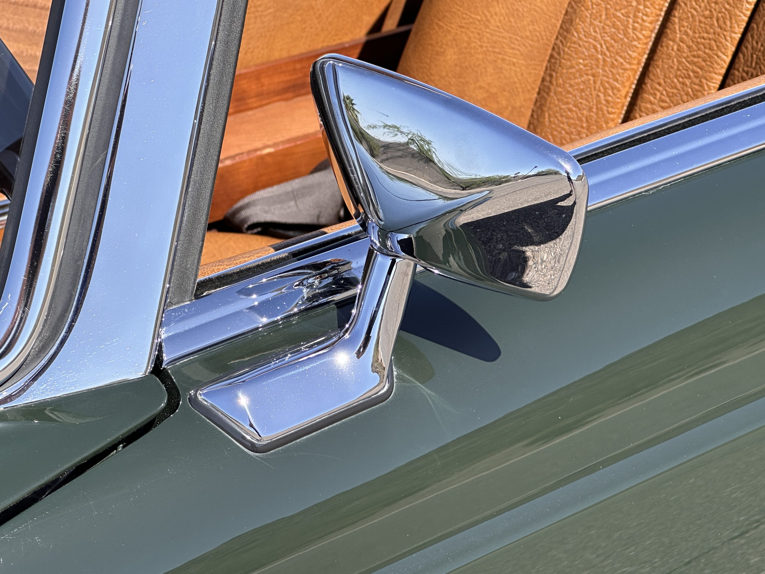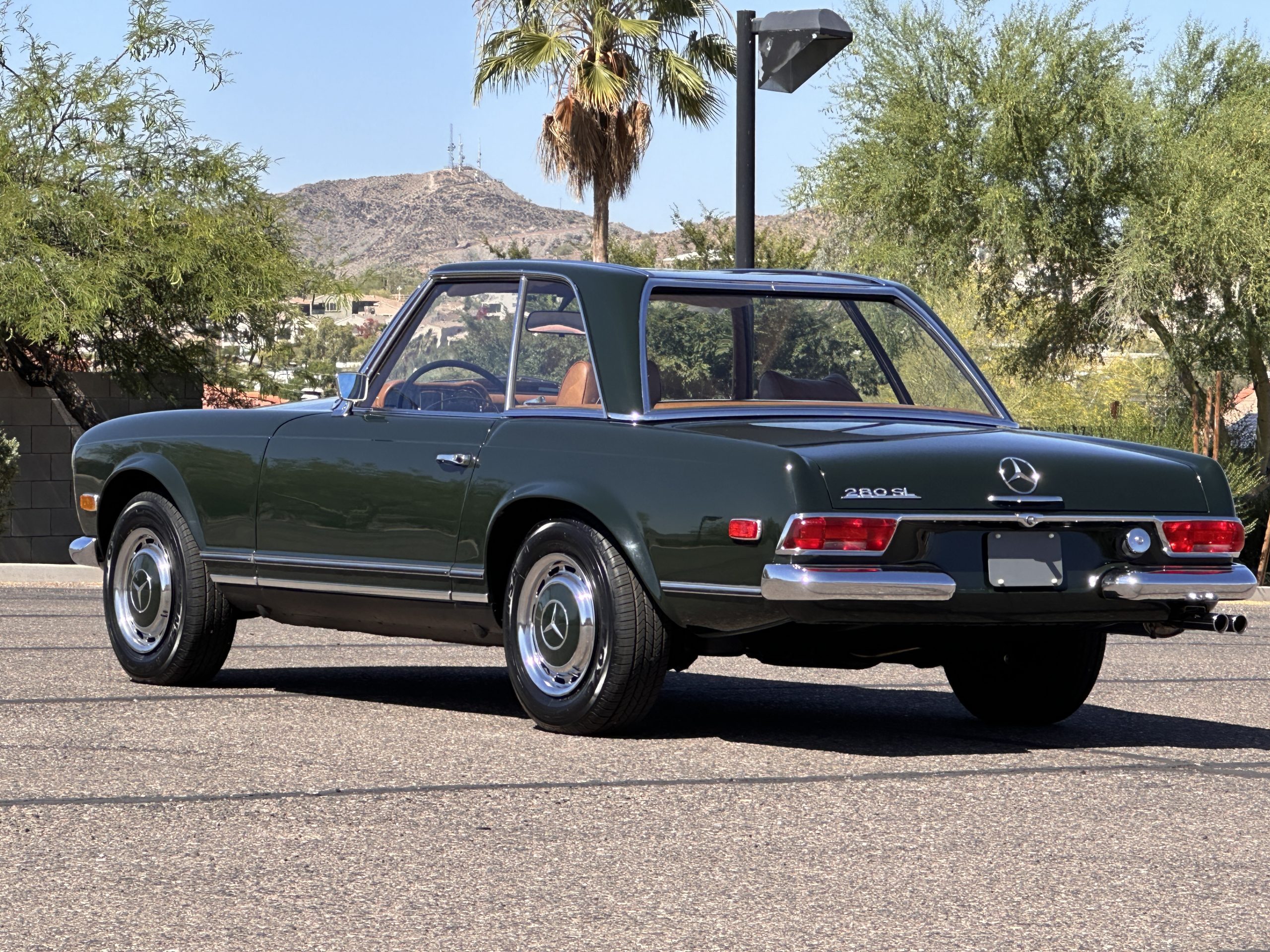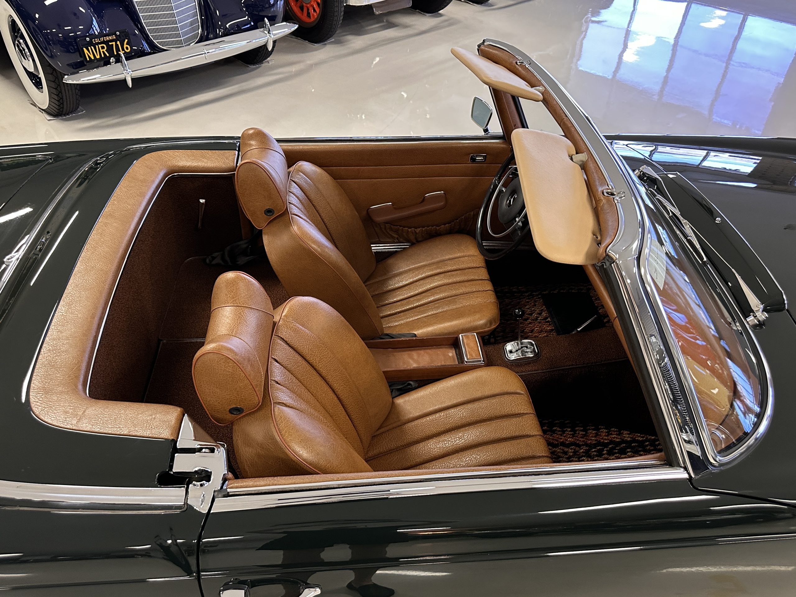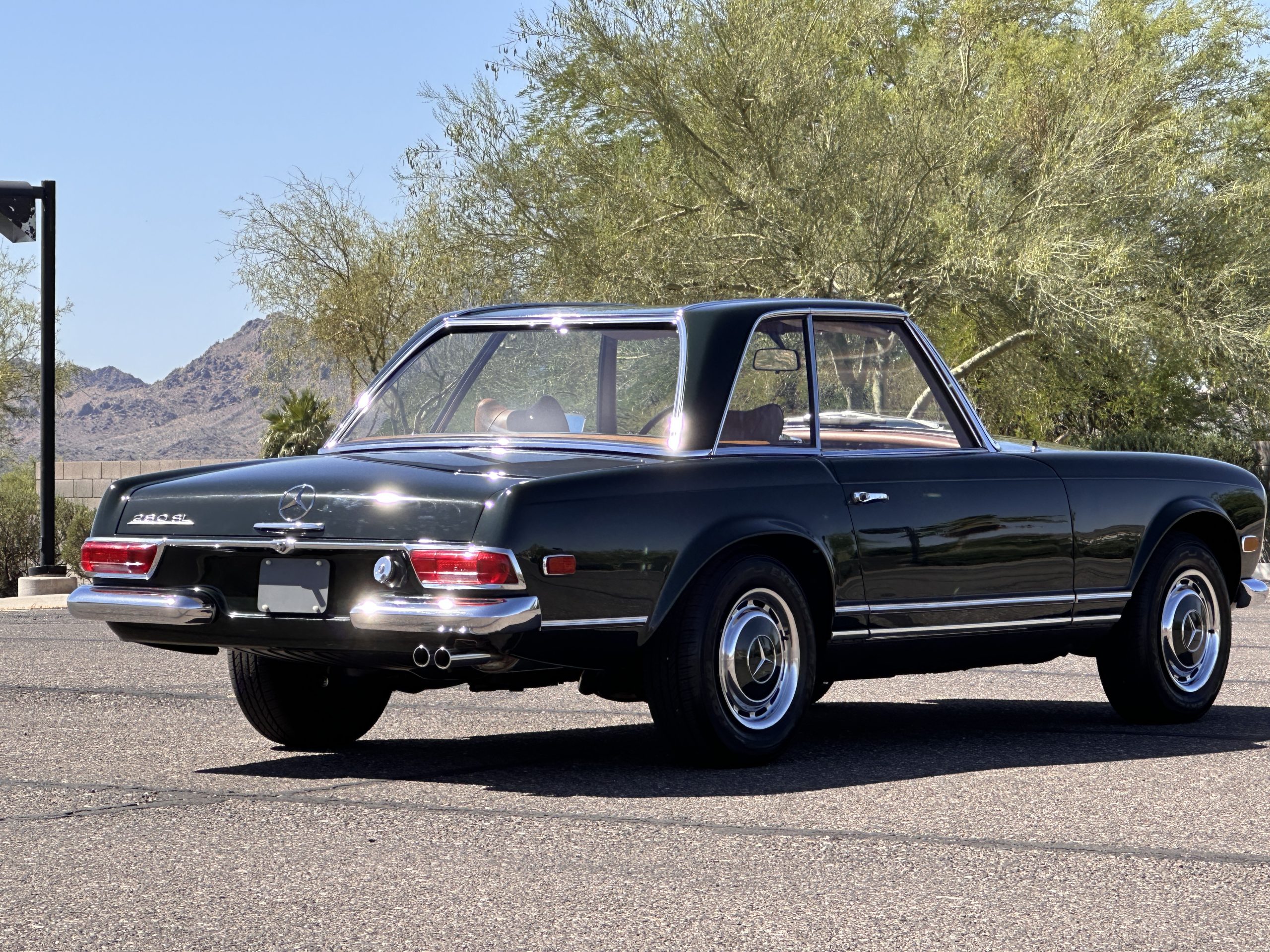 The livery is in concours-ready condition in its Dark Olive Green (Paint Code 291).  The paint is nearly perfect condition with a few very small imperfections that are only noticeable upon very close inspection (which is our role).  The body panel fit is perfect and all the important inspections for Pagoda’s check out: the spot welds in the engine compartment, the VIN stamp in the hood and hardtop, the notches in the headlight area, even the date code of July 1968 is revealed on the trunk seal.  Service stickers are still proudly displayed on the driver’s door from 1969 and 1970.  This 280SL is a proverbial time capsule.  The chrome and stainless-steel trim are all in excellent original condition.  The present owner had a Mercedes-Benz dealer install a new correct windshield and seals to add to the cars concours quality presentation.
