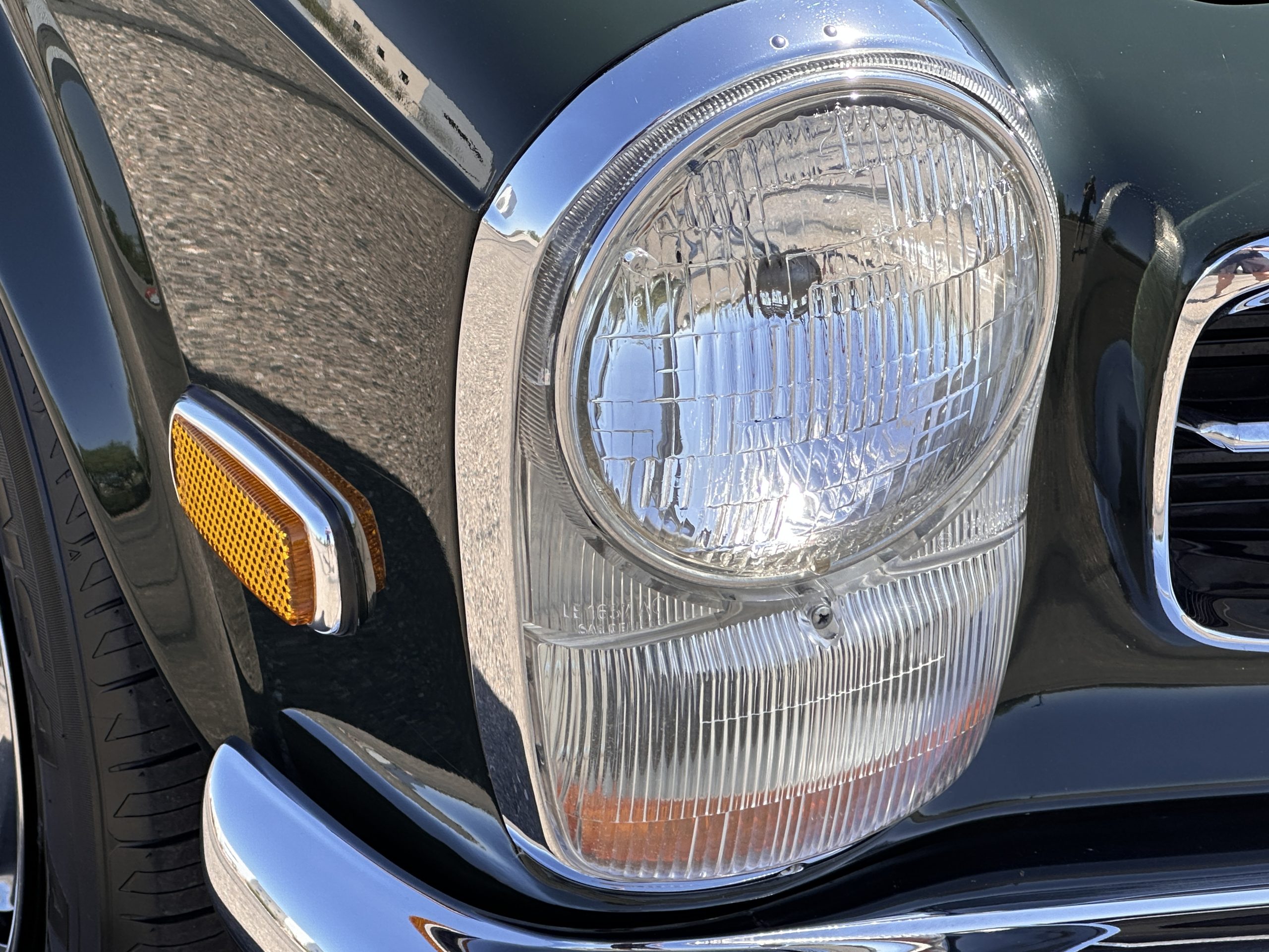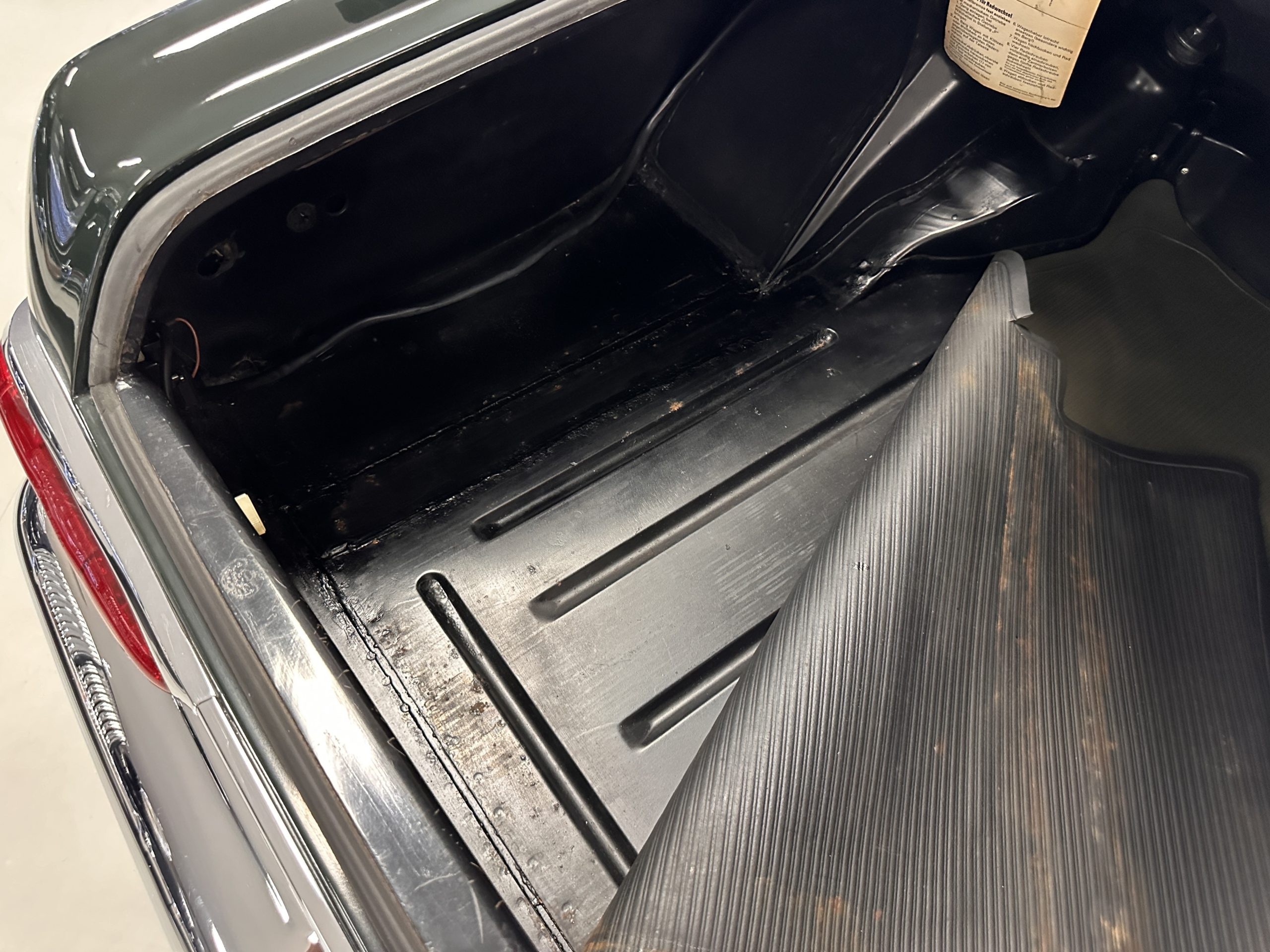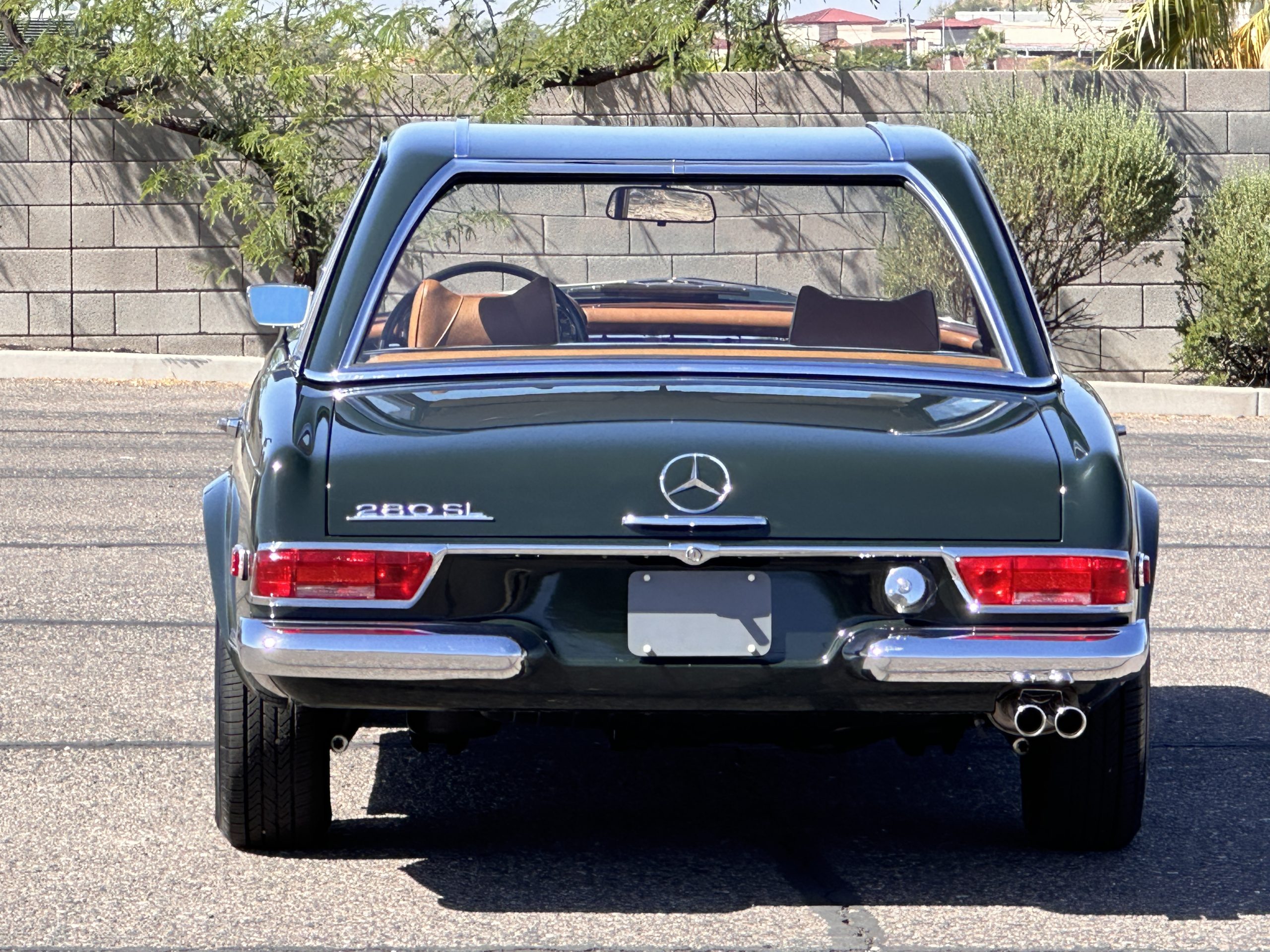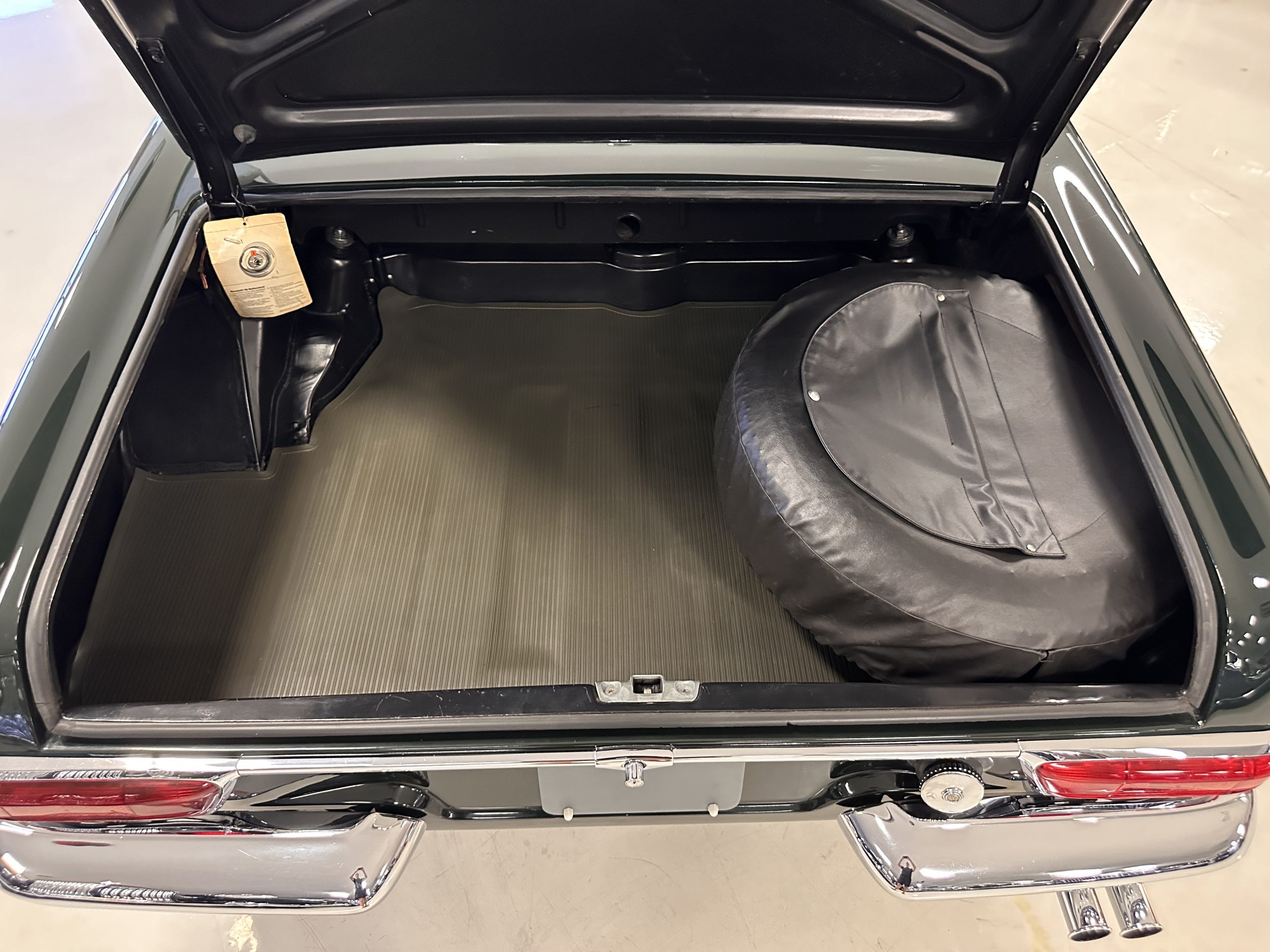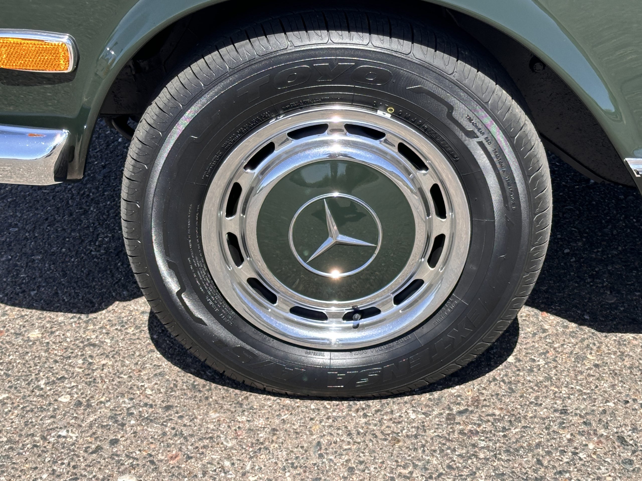 The livery is in concours-ready condition in its Dark Olive Green (Paint Code 291).  The paint is nearly perfect condition with a few very small imperfections that are only noticeable upon very close inspection (which is our role).  The body panel fit is perfect and all the important inspections for Pagoda’s check out: the spot welds in the engine compartment, the VIN stamp in the hood and hardtop, the notches in the headlight area, even the date code of July 1968 is revealed on the trunk seal.  Service stickers are still proudly displayed on the driver’s door from 1969 and 1970.  This 280SL is a proverbial time capsule.  The chrome and stainless-steel trim are all in excellent original condition.  The present owner had a Mercedes-Benz dealer install a new correct windshield and seals to add to the cars concours quality presentation.