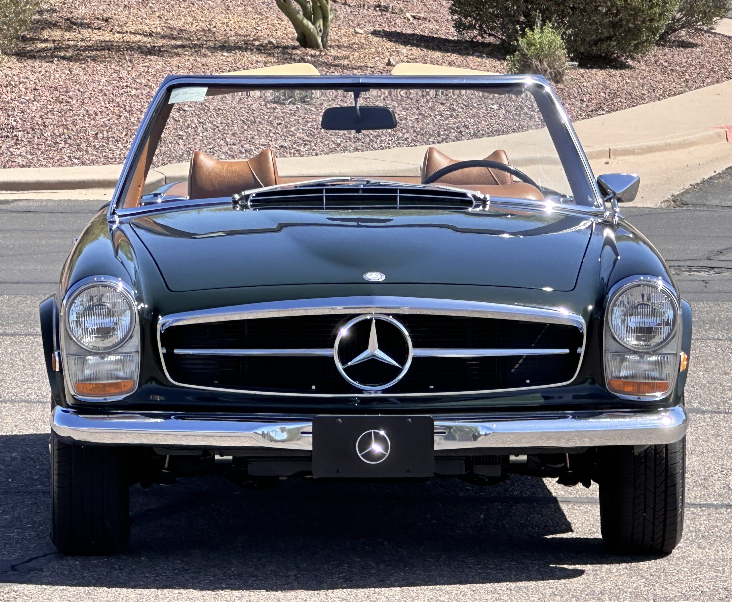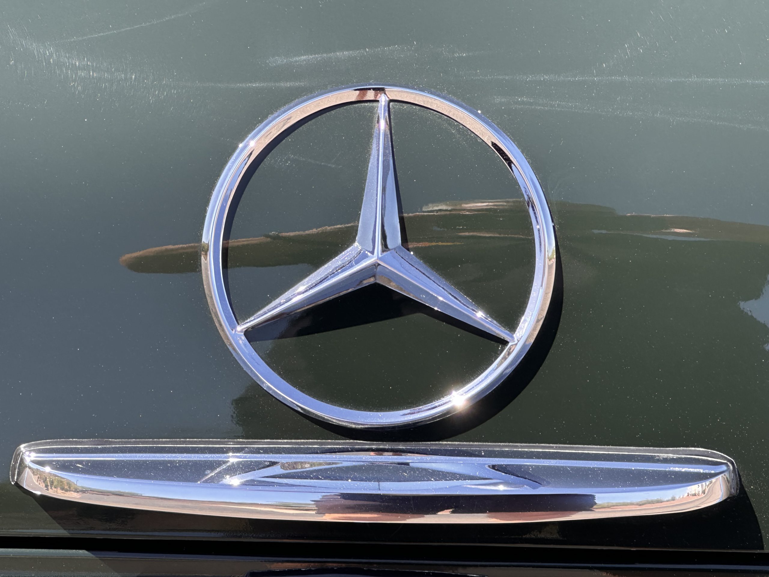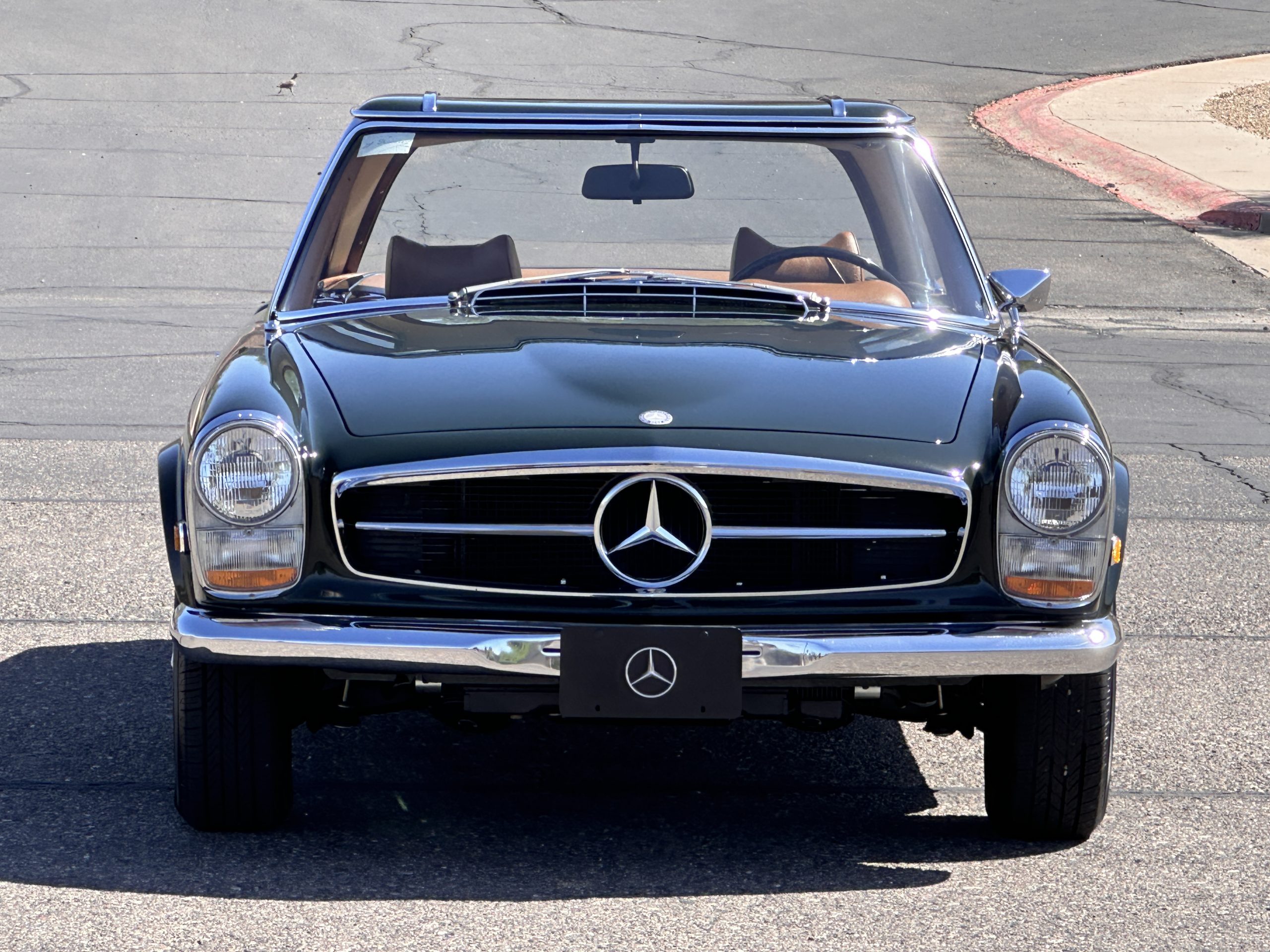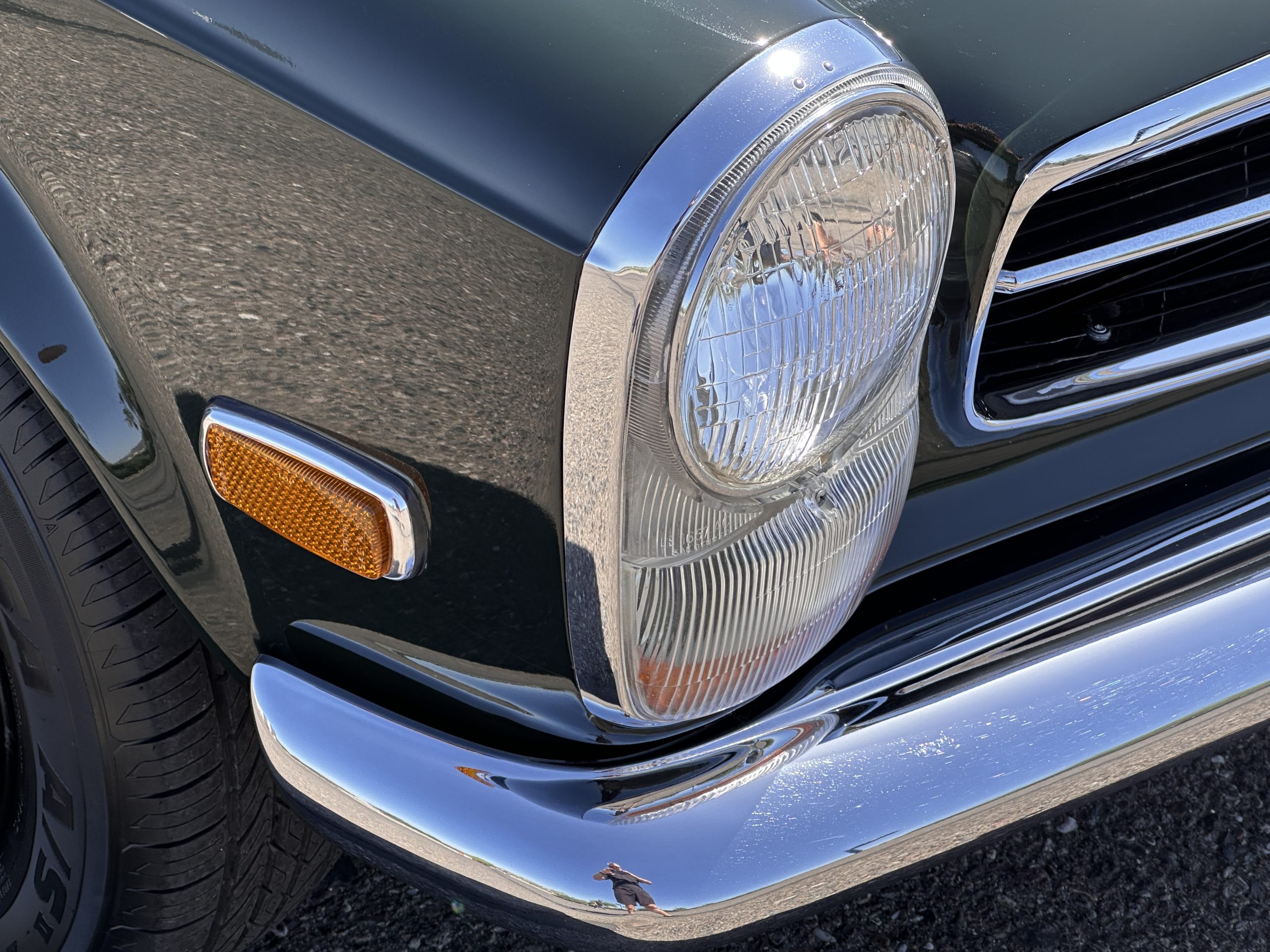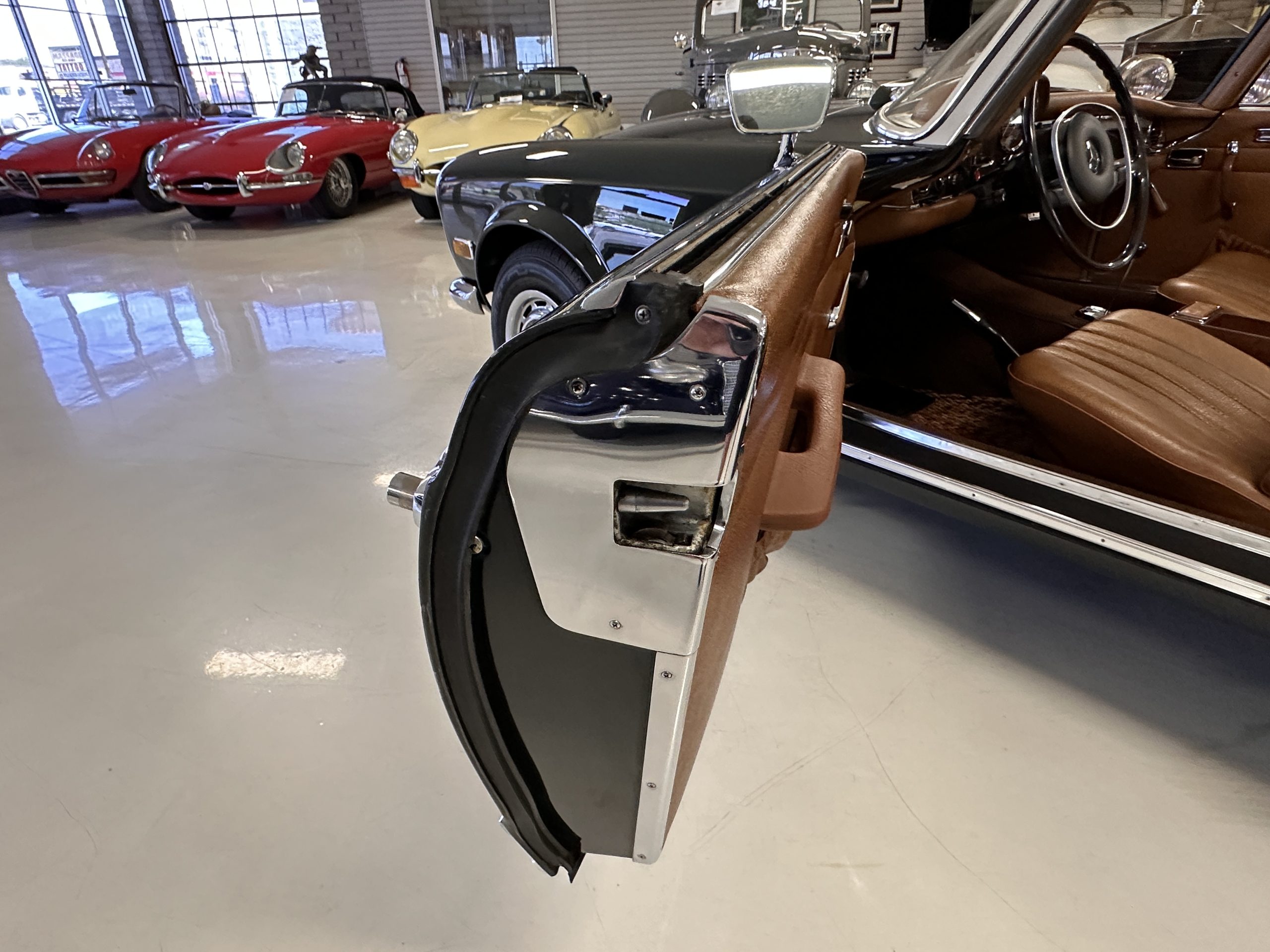 The livery is in concours-ready condition in its Dark Olive Green (Paint Code 291).  The paint is nearly perfect condition with a few very small imperfections that are only noticeable upon very close inspection (which is our role).  The body panel fit is perfect and all the important inspections for Pagoda’s check out: the spot welds in the engine compartment, the VIN stamp in the hood and hardtop, the notches in the headlight area, even the date code of July 1968 is revealed on the trunk seal.  Service stickers are still proudly displayed on the driver’s door from 1969 and 1970.  This 280SL is a proverbial time capsule.  The chrome and stainless-steel trim are all in excellent original condition.  The present owner had a Mercedes-Benz dealer install a new correct windshield and seals to add to the cars concours quality presentation.