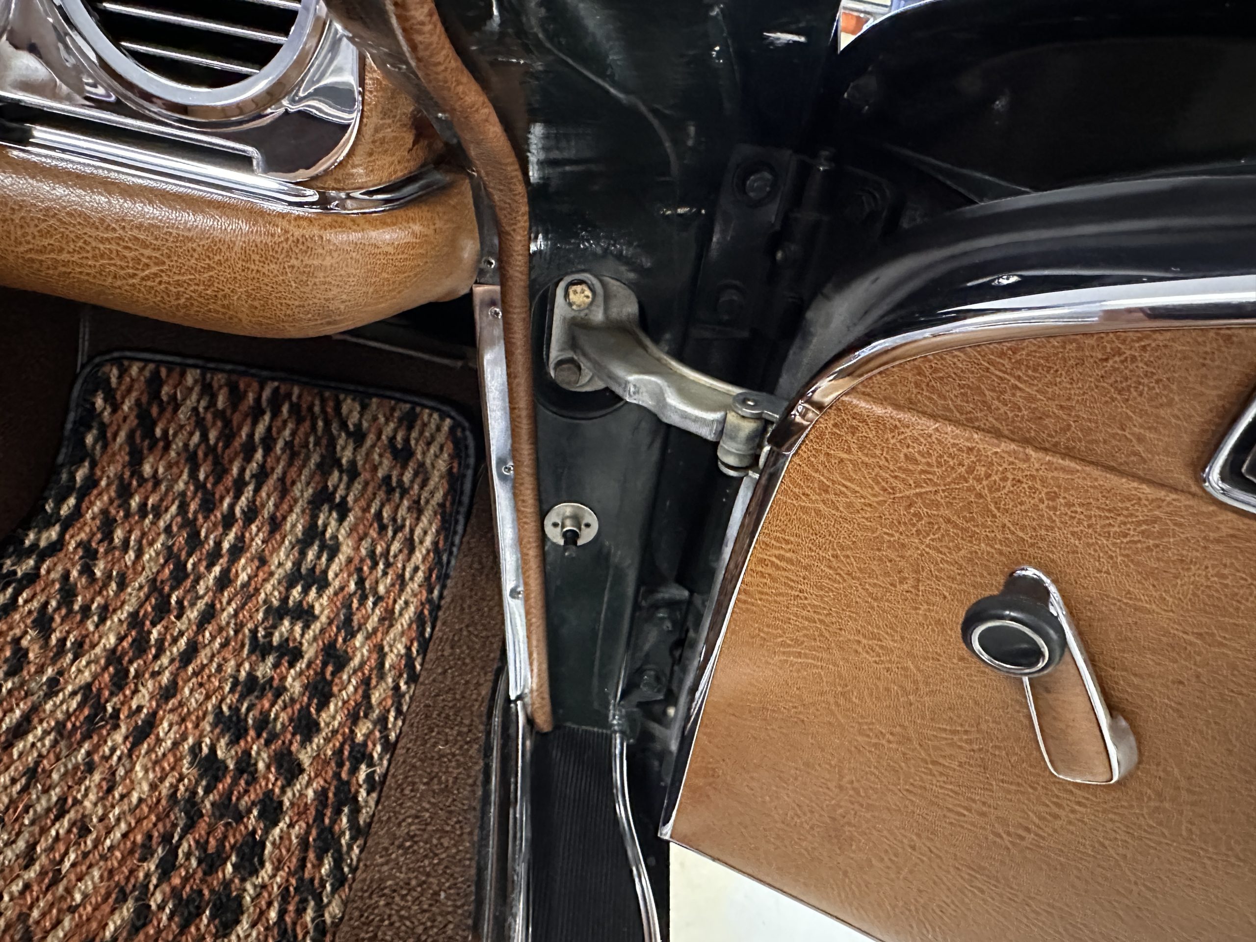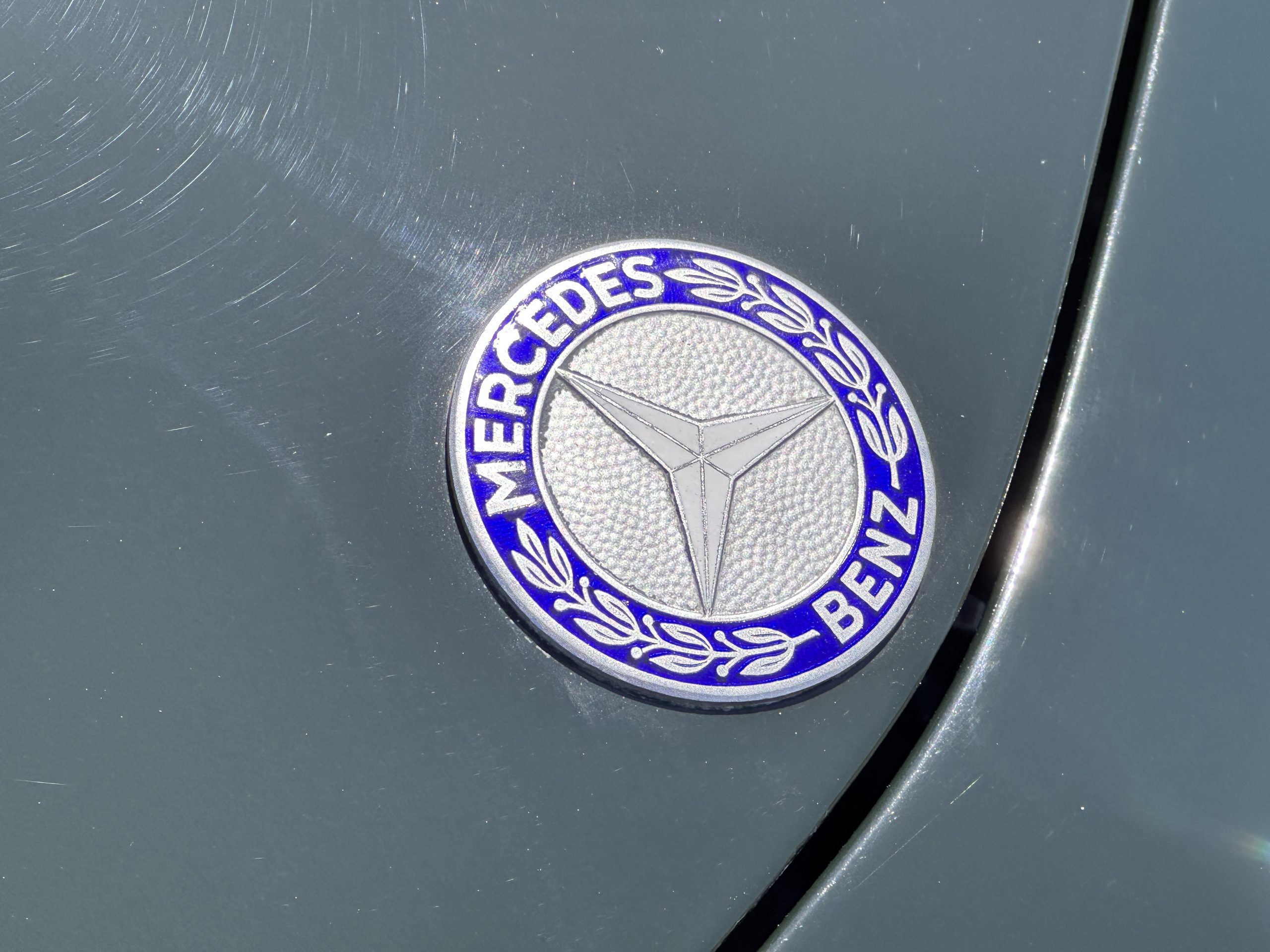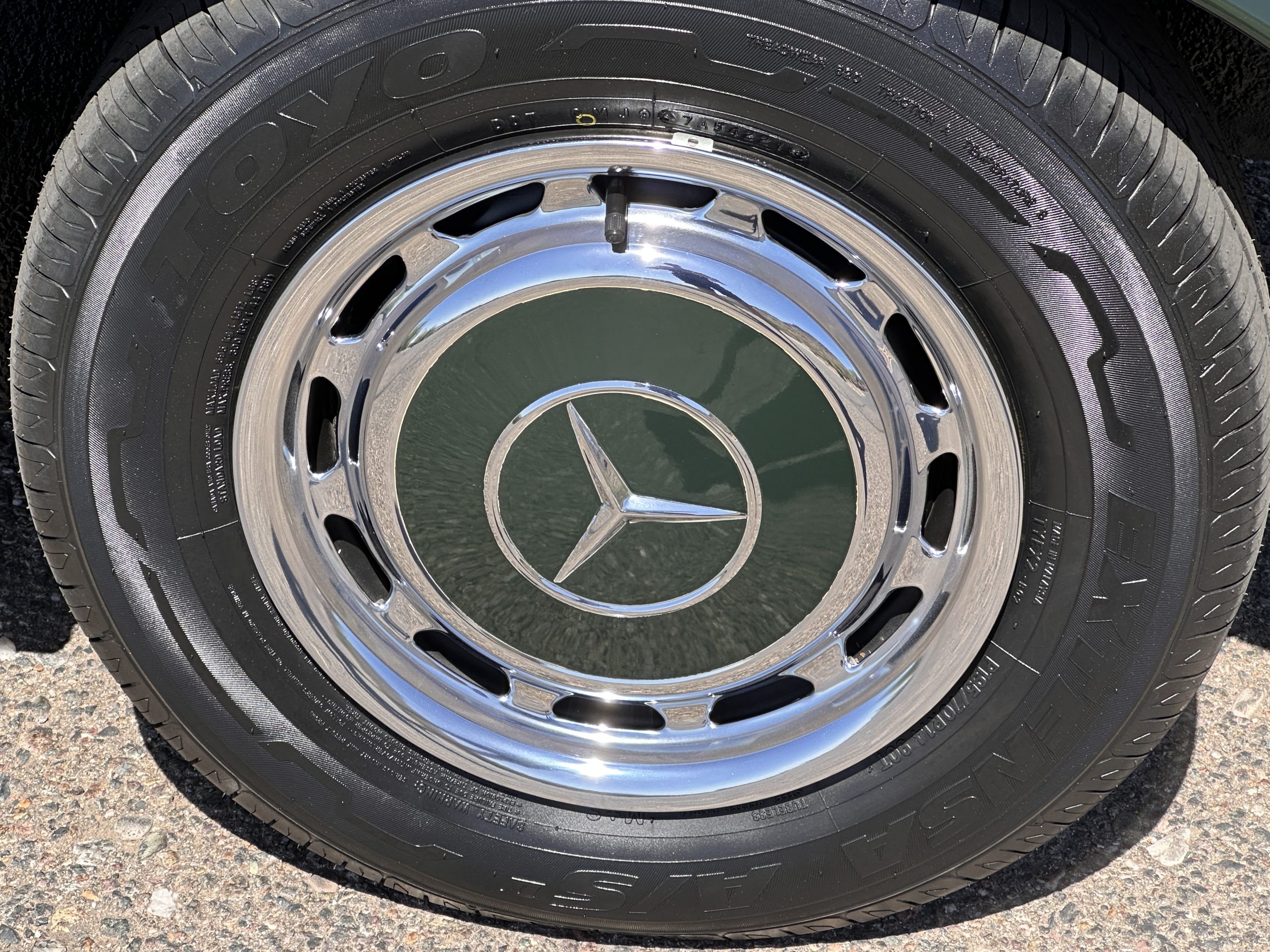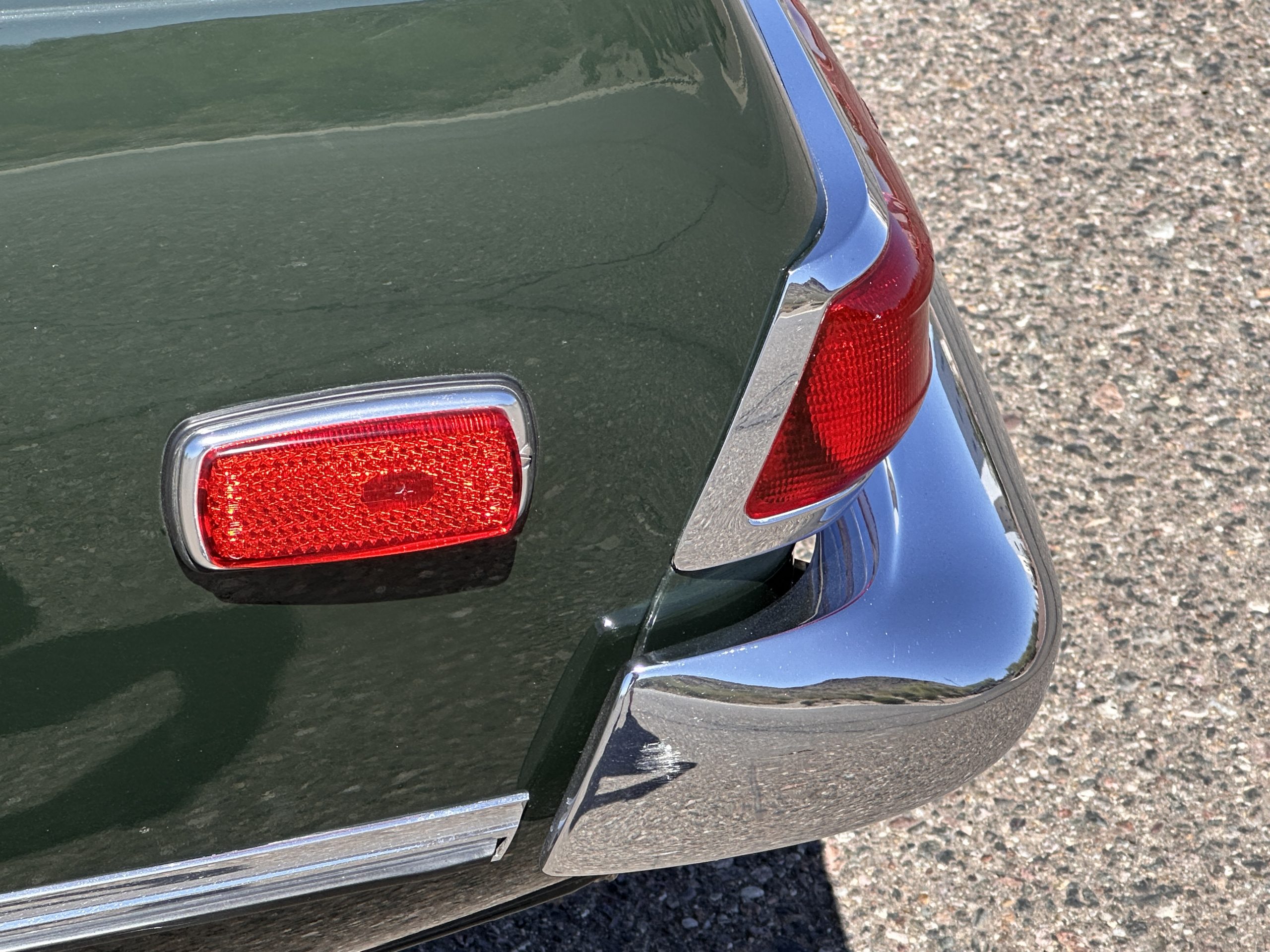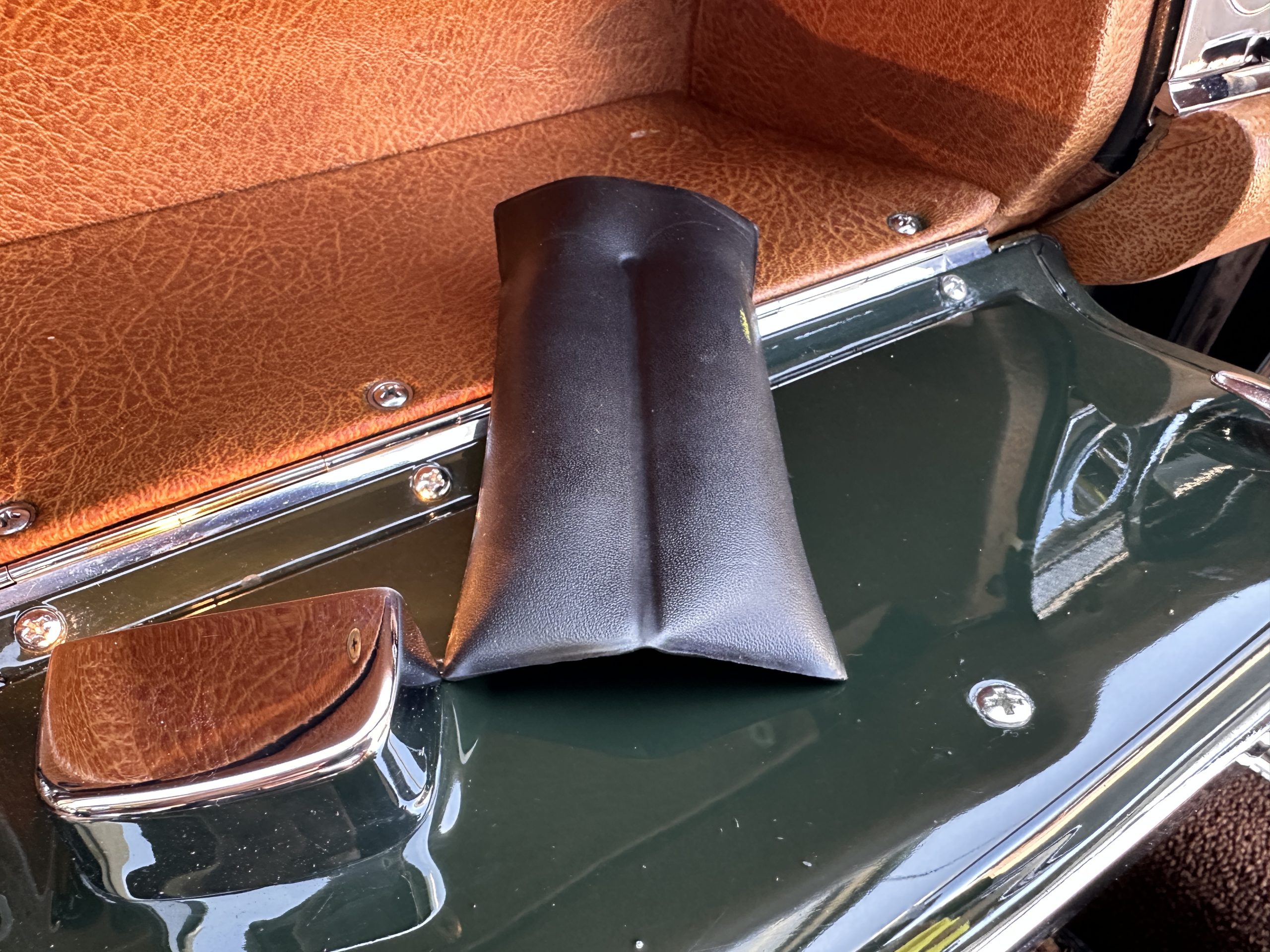 The livery is in concours-ready condition in its Dark Olive Green (Paint Code 291).  The paint is nearly perfect condition with a few very small imperfections that are only noticeable upon very close inspection (which is our role).  The body panel fit is perfect and all the important inspections for Pagoda’s check out: the spot welds in the engine compartment, the VIN stamp in the hood and hardtop, the notches in the headlight area, even the date code of July 1968 is revealed on the trunk seal.  Service stickers are still proudly displayed on the driver’s door from 1969 and 1970.  This 280SL is a proverbial time capsule.  The chrome and stainless-steel trim are all in excellent original condition.  The present owner had a Mercedes-Benz dealer install a new correct windshield and seals to add to the cars concours quality presentation.