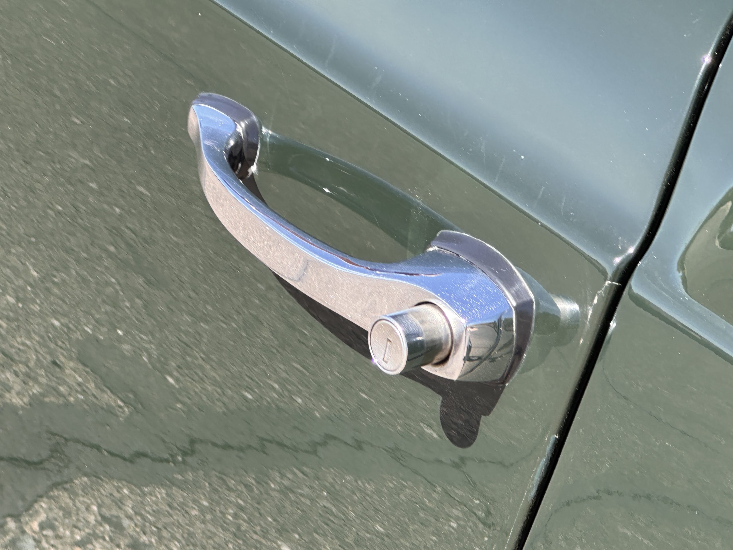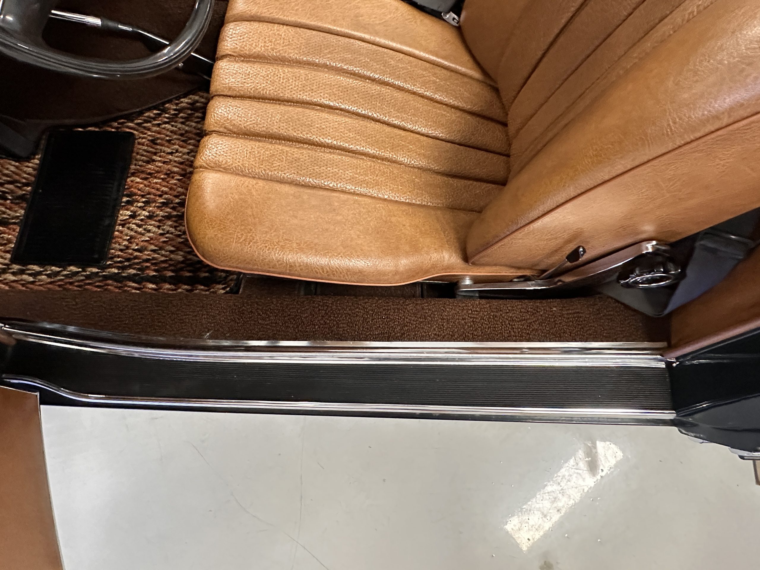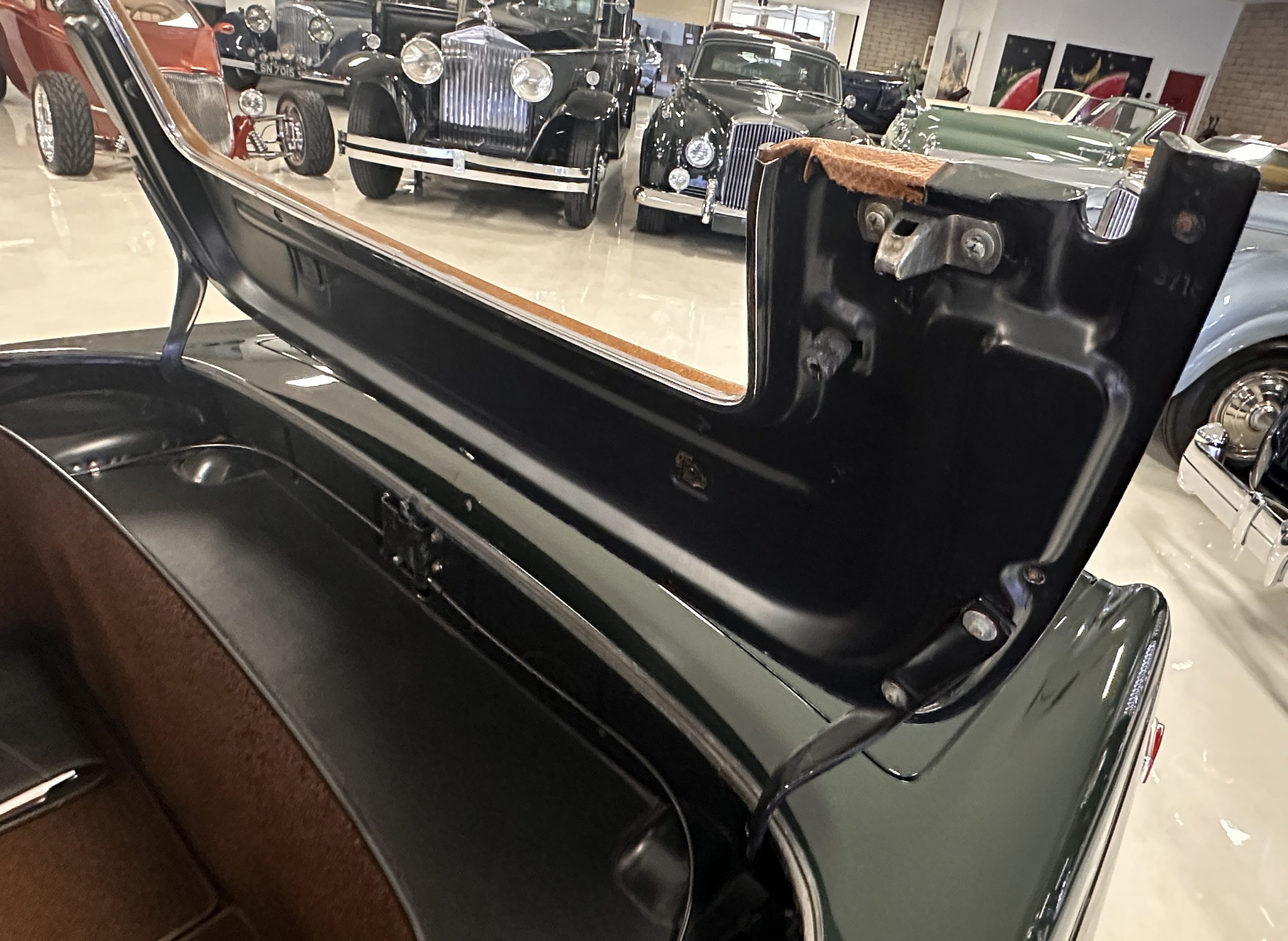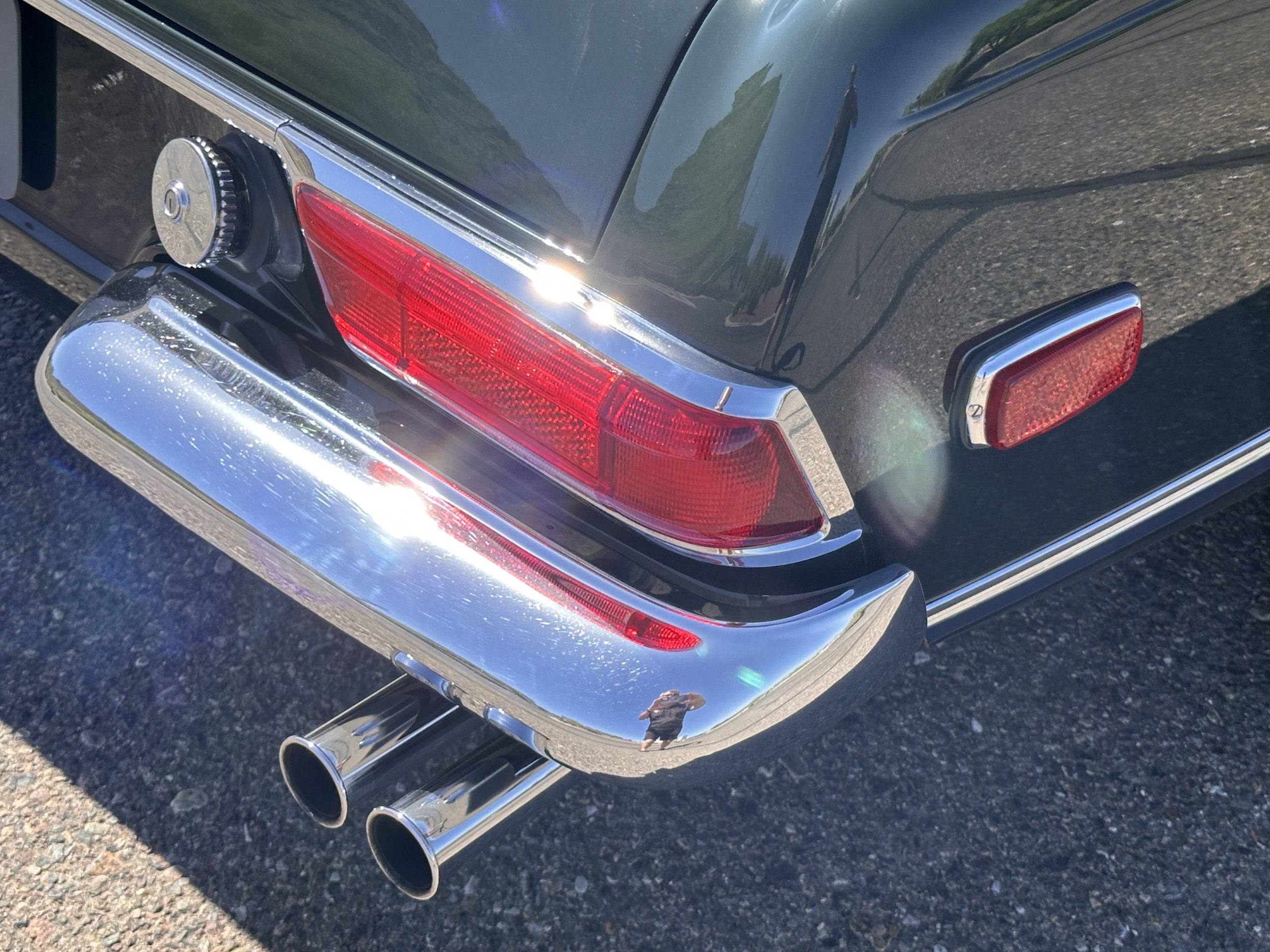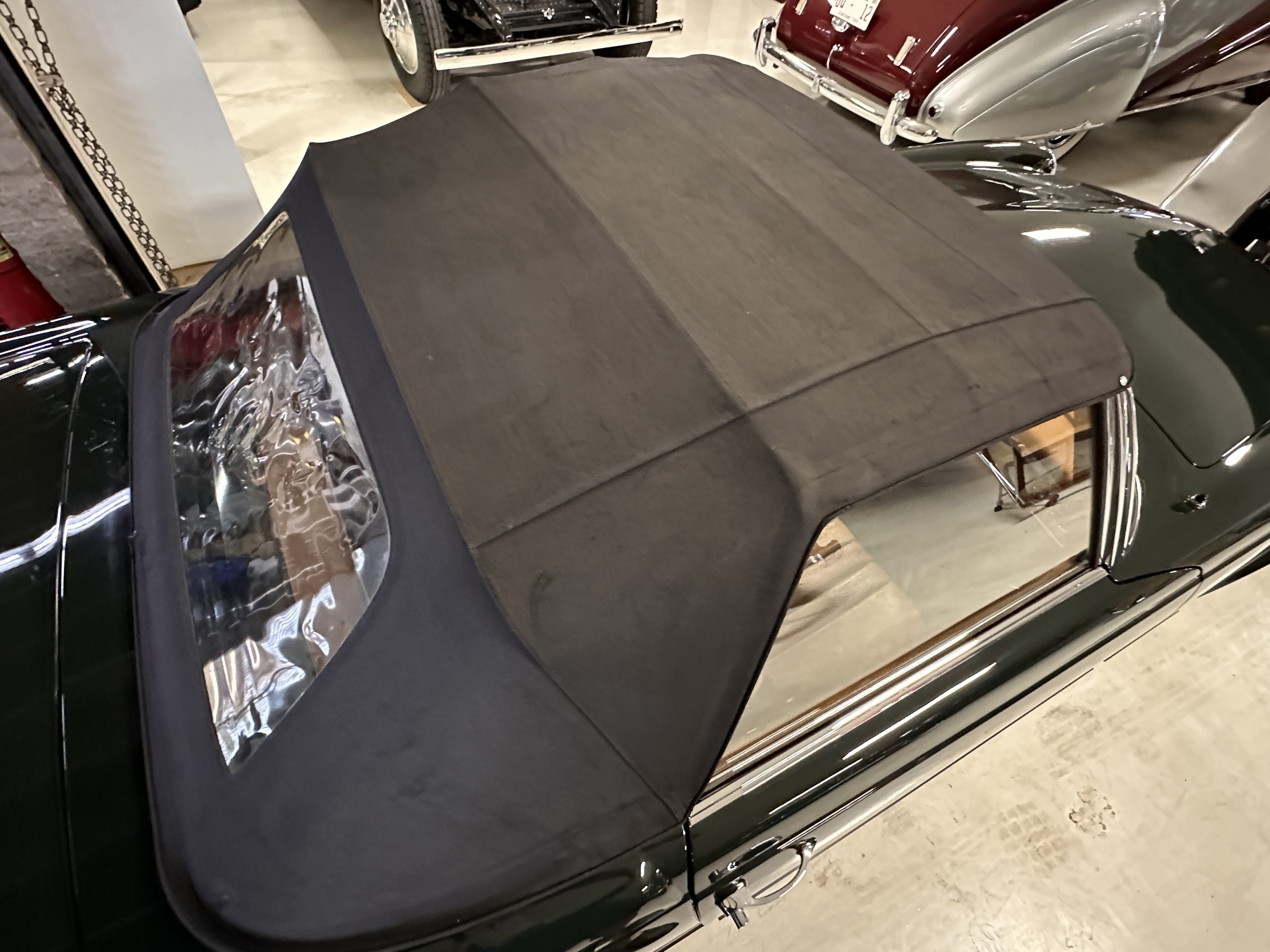 The livery is in concours-ready condition in its Dark Olive Green (Paint Code 291).  The paint is nearly perfect condition with a few very small imperfections that are only noticeable upon very close inspection (which is our role).  The body panel fit is perfect and all the important inspections for Pagoda’s check out: the spot welds in the engine compartment, the VIN stamp in the hood and hardtop, the notches in the headlight area, even the date code of July 1968 is revealed on the trunk seal.  Service stickers are still proudly displayed on the driver’s door from 1969 and 1970.  This 280SL is a proverbial time capsule.  The chrome and stainless-steel trim are all in excellent original condition.  The present owner had a Mercedes-Benz dealer install a new correct windshield and seals to add to the cars concours quality presentation.