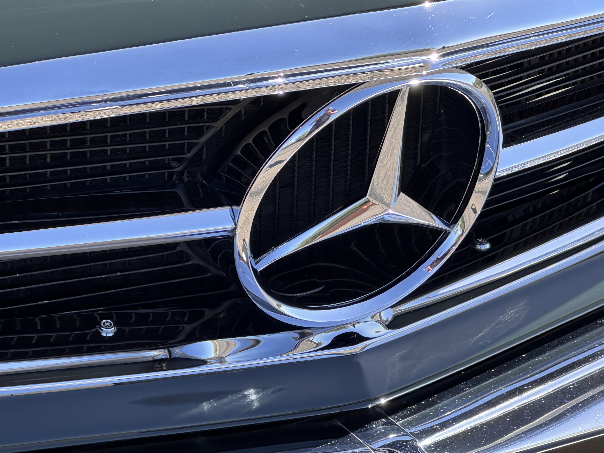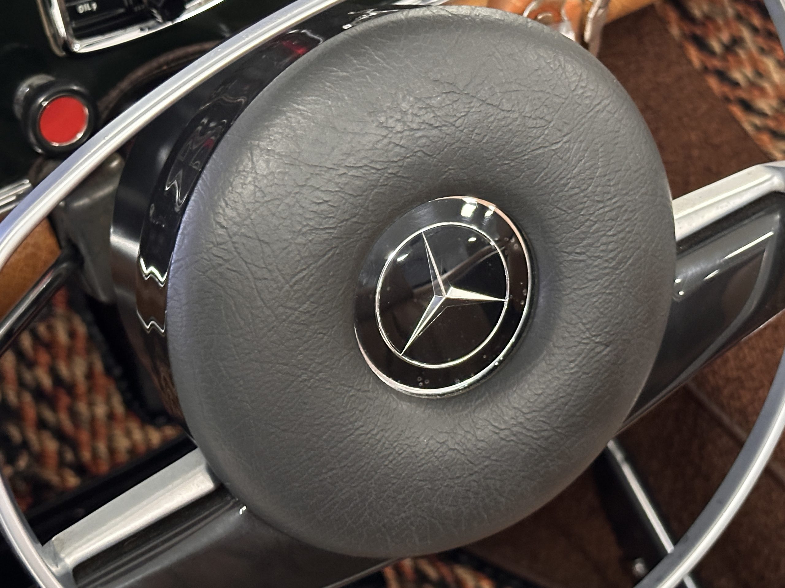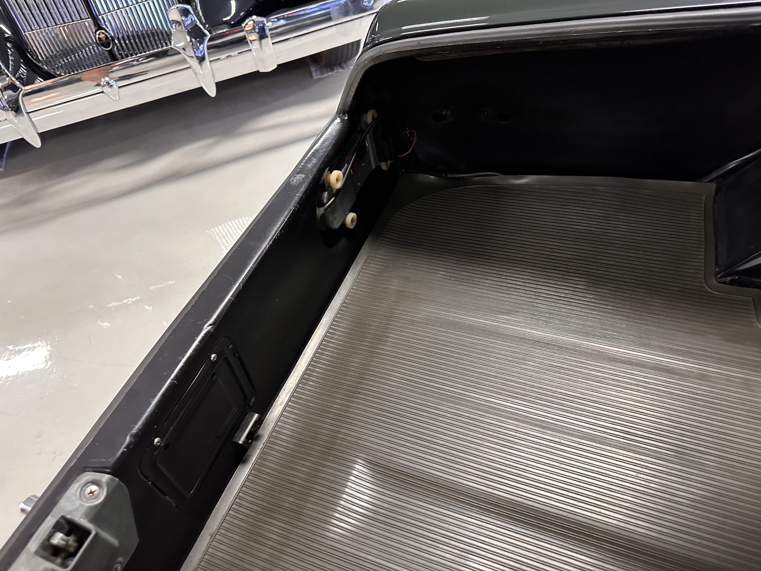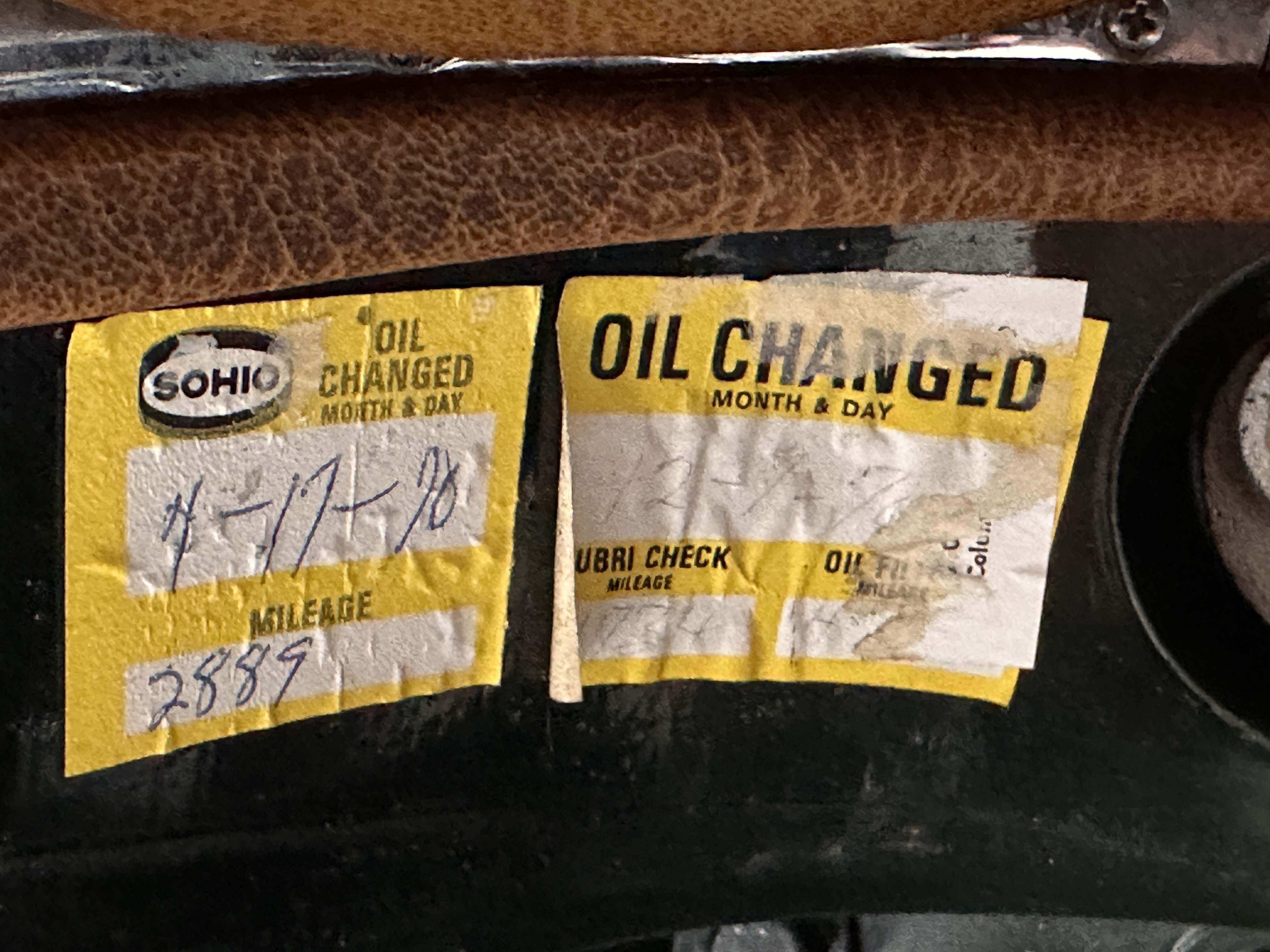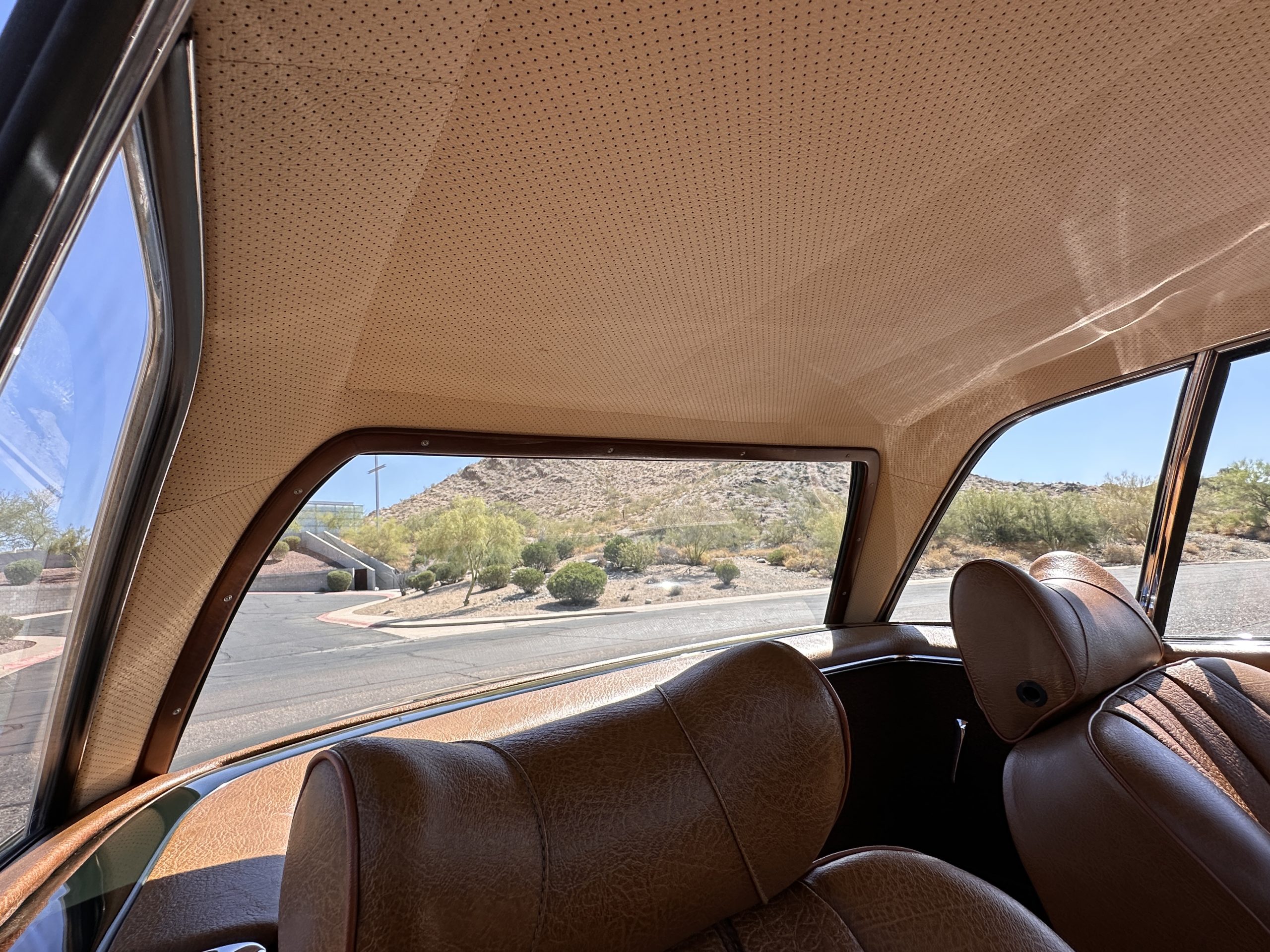 The livery is in concours-ready condition in its Dark Olive Green (Paint Code 291).  The paint is nearly perfect condition with a few very small imperfections that are only noticeable upon very close inspection (which is our role).  The body panel fit is perfect and all the important inspections for Pagoda’s check out: the spot welds in the engine compartment, the VIN stamp in the hood and hardtop, the notches in the headlight area, even the date code of July 1968 is revealed on the trunk seal.  Service stickers are still proudly displayed on the driver’s door from 1969 and 1970.  This 280SL is a proverbial time capsule.  The chrome and stainless-steel trim are all in excellent original condition.  The present owner had a Mercedes-Benz dealer install a new correct windshield and seals to add to the cars concours quality presentation.
