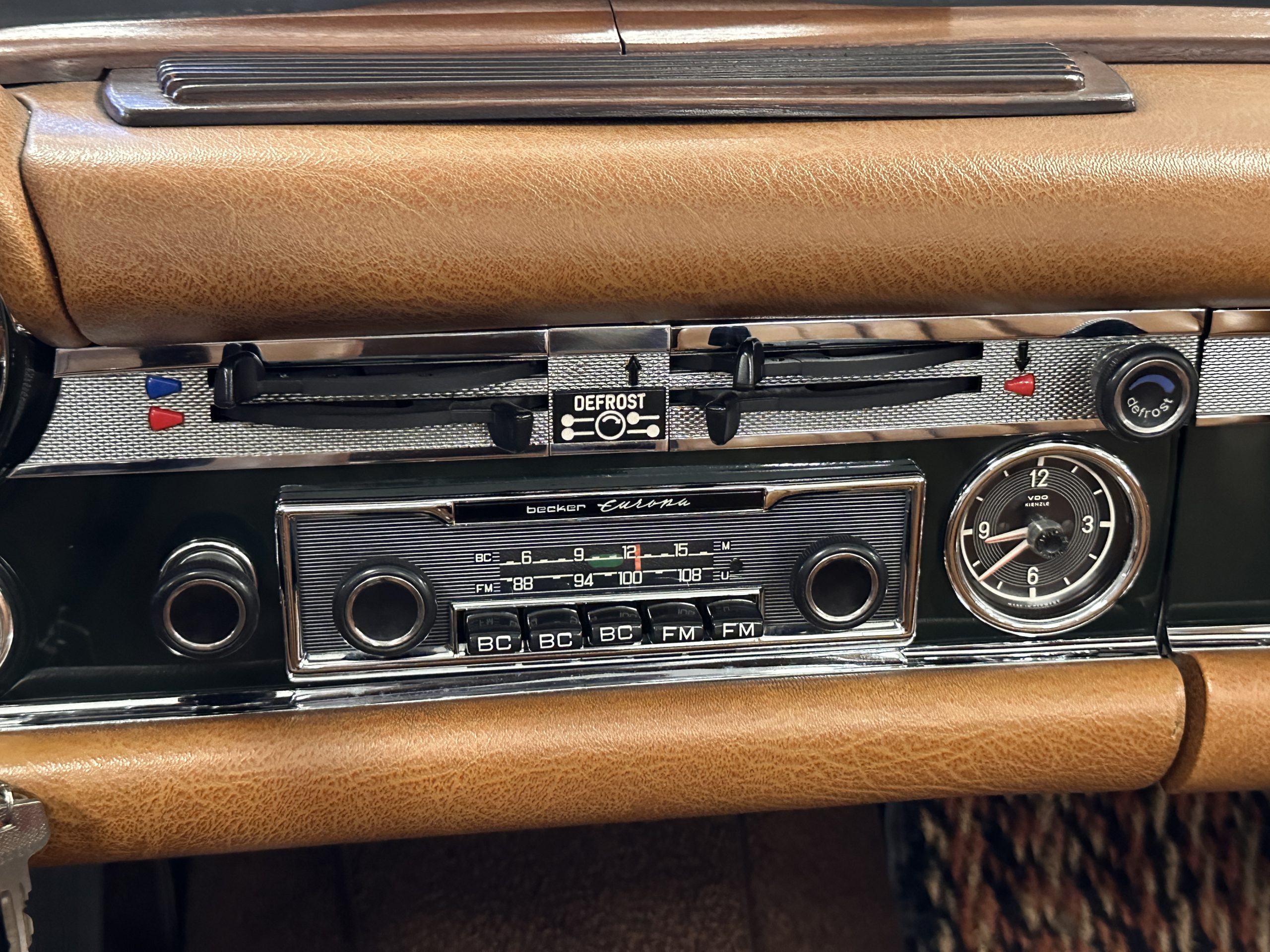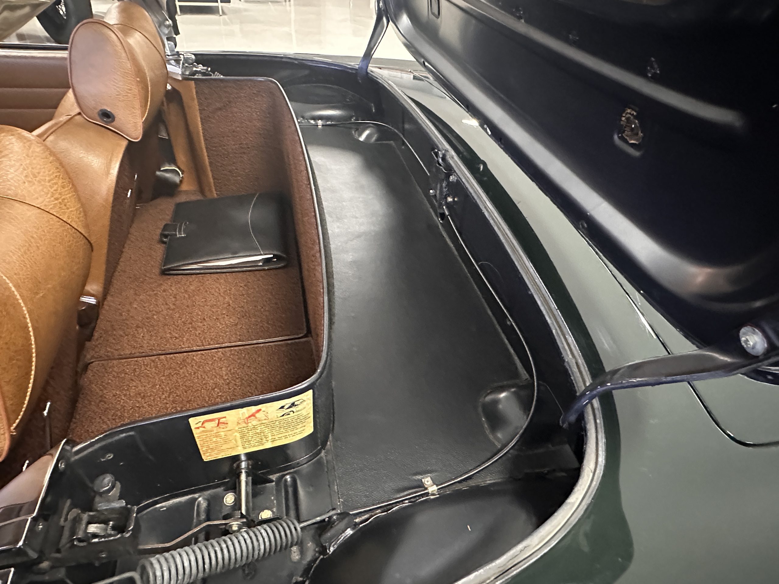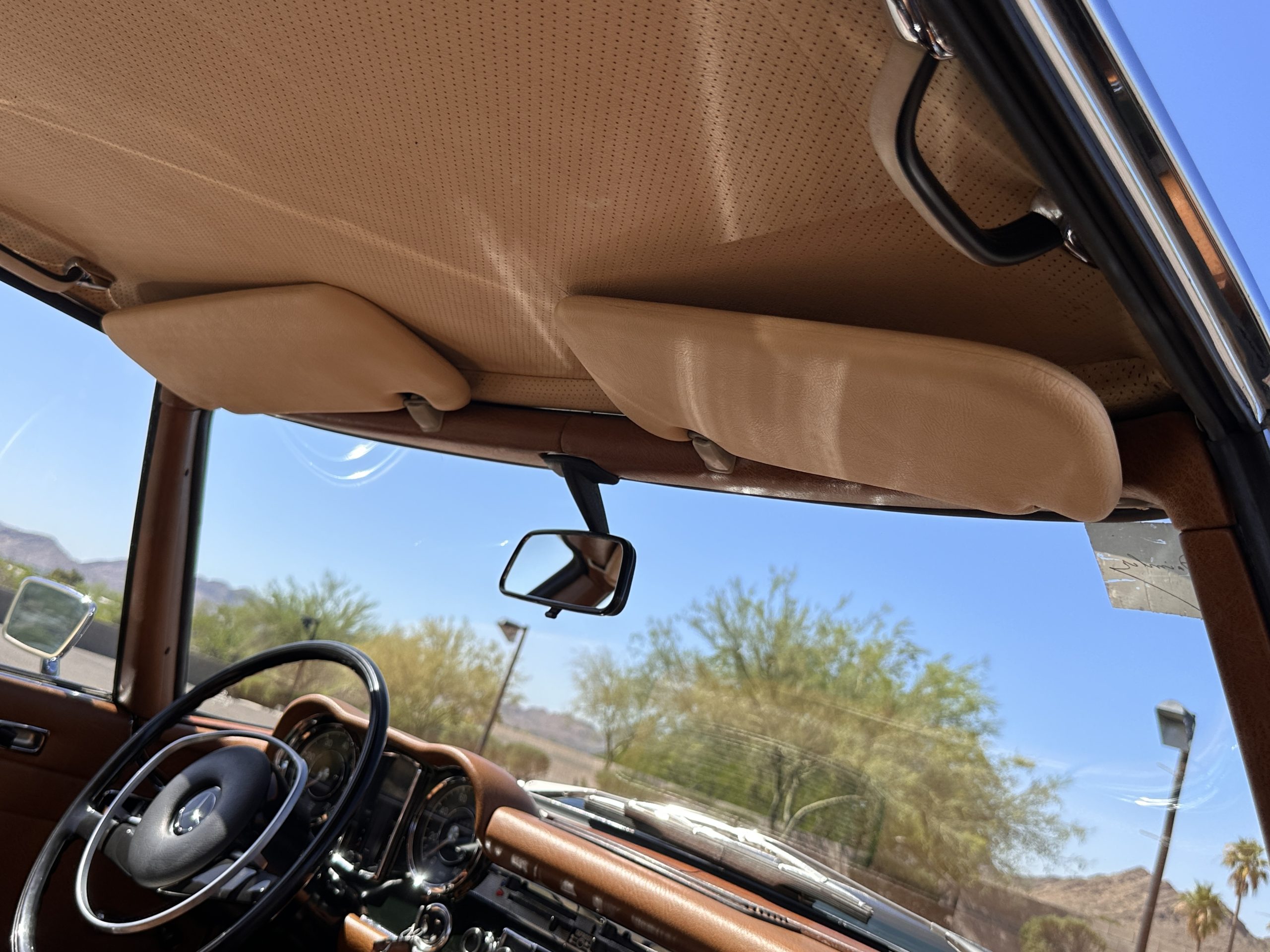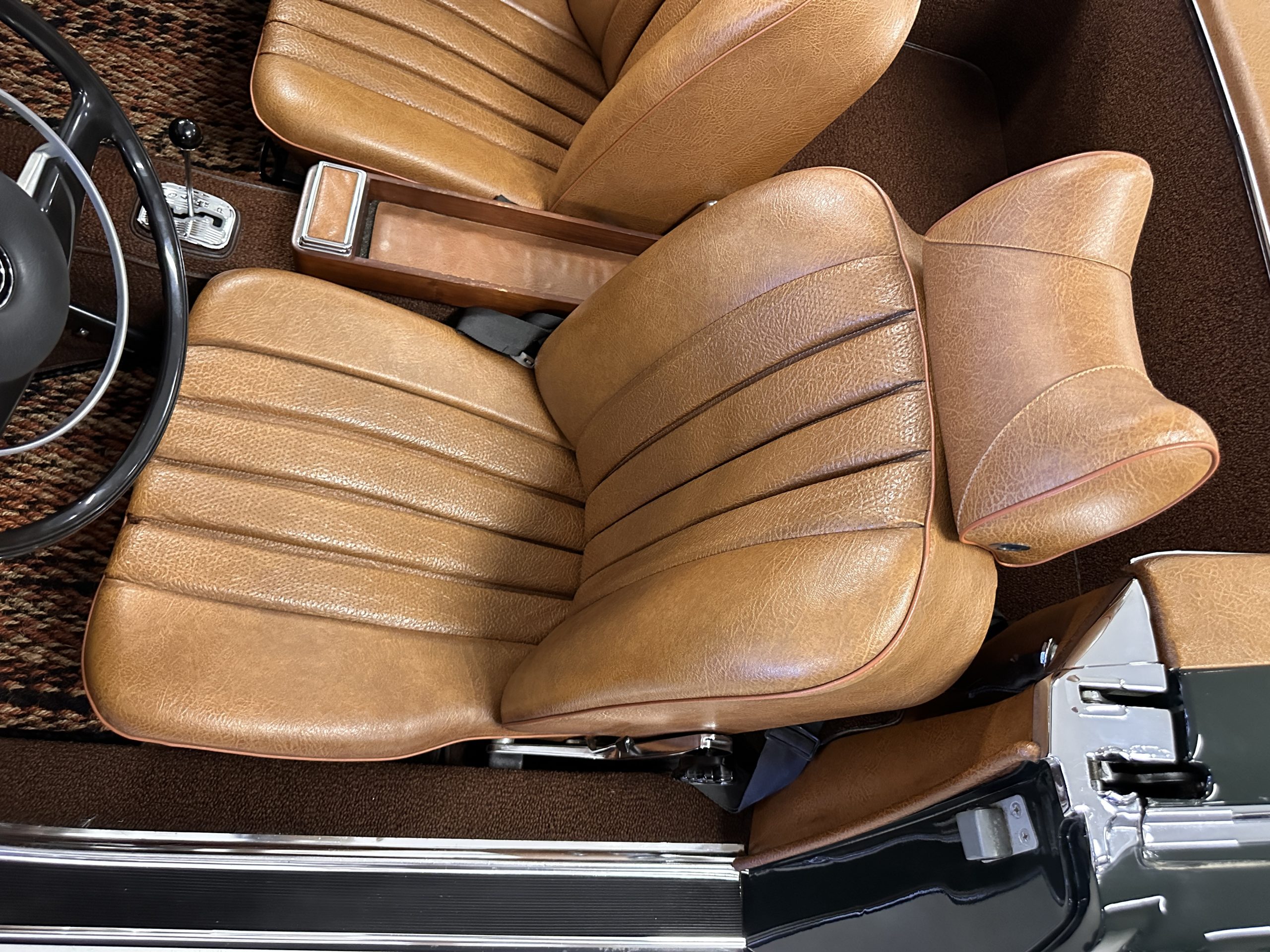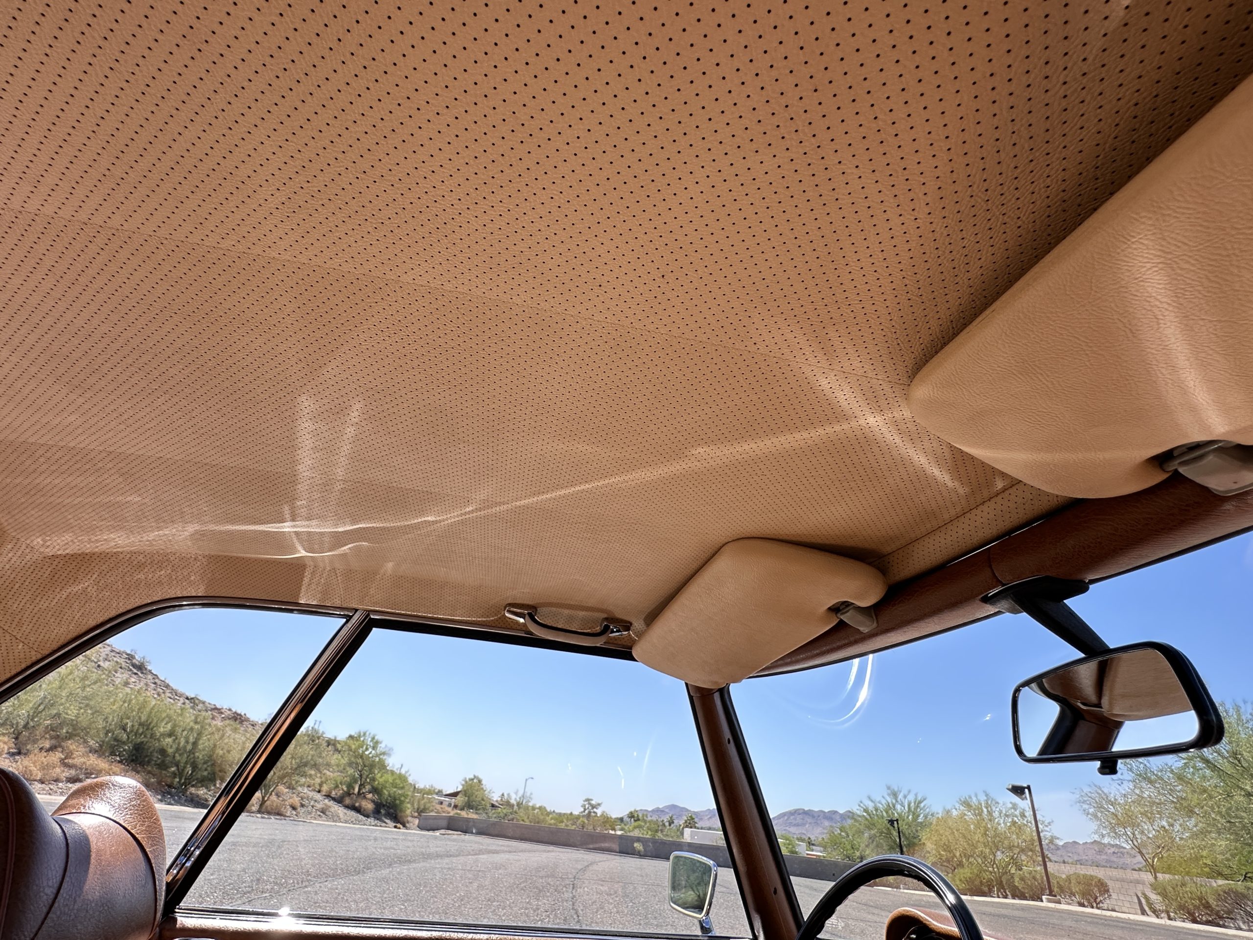 The interior is also in nearly perfect original condition, with its original Cognac MB Tex (Trim Code 140) in excellent condition.  The dashboard, instruments, steering wheel and carpet are also fantastic.  The wood trim is also in excellent condition.  As you would expect, all of the instrument’s work as new and the Becker Europa AM/FM radio also works well.  It still has its original Hirshman antenna.  The original black soft-top is securely stowed under its compartment.  Incredibly, it has not shrunk and was easy to close.  It is in wonderful original condition but obviously is showing patina.  The hardtop is also in nearly perfect original condition, including the headliner and wood trim.