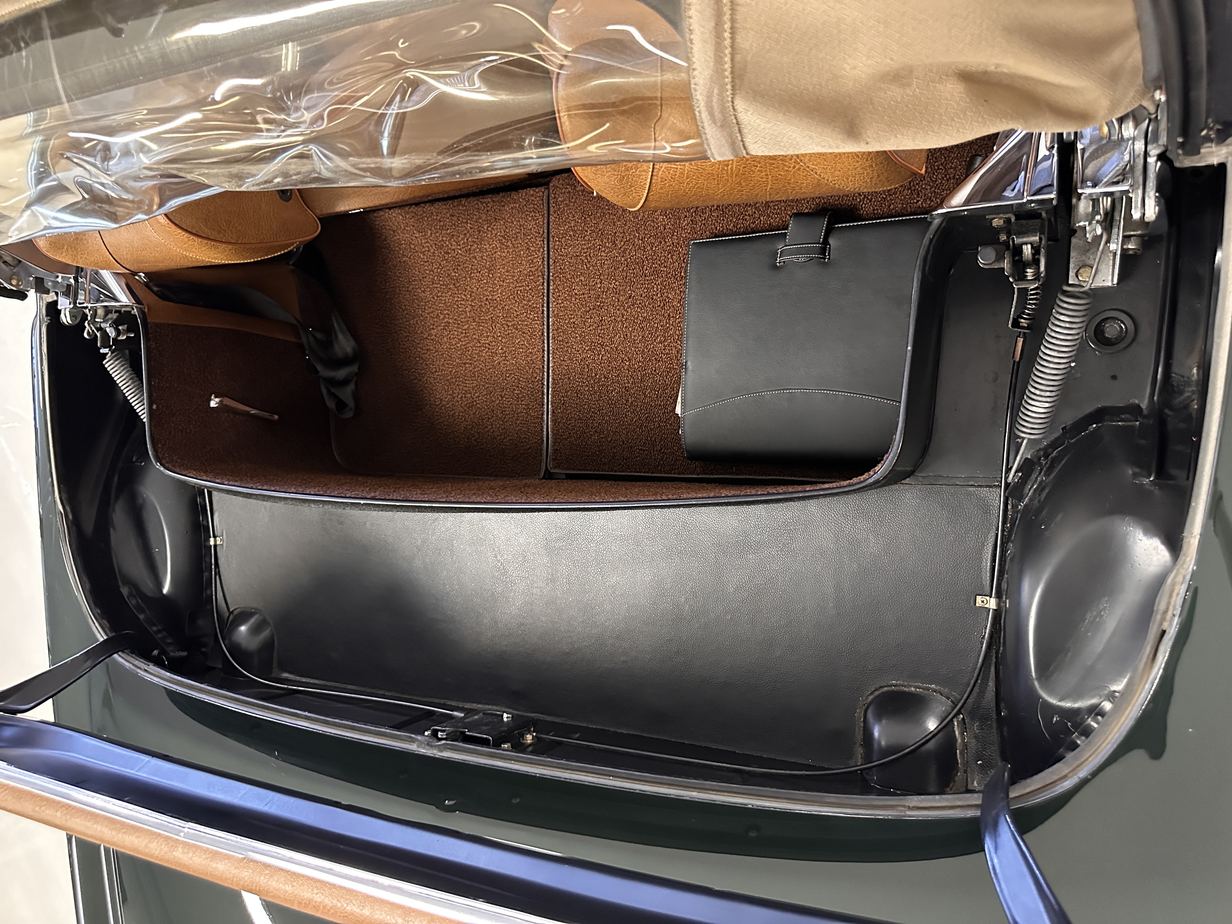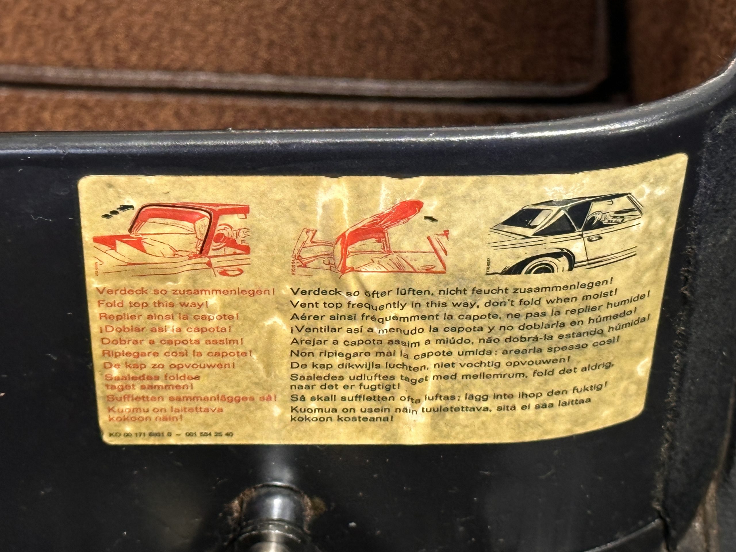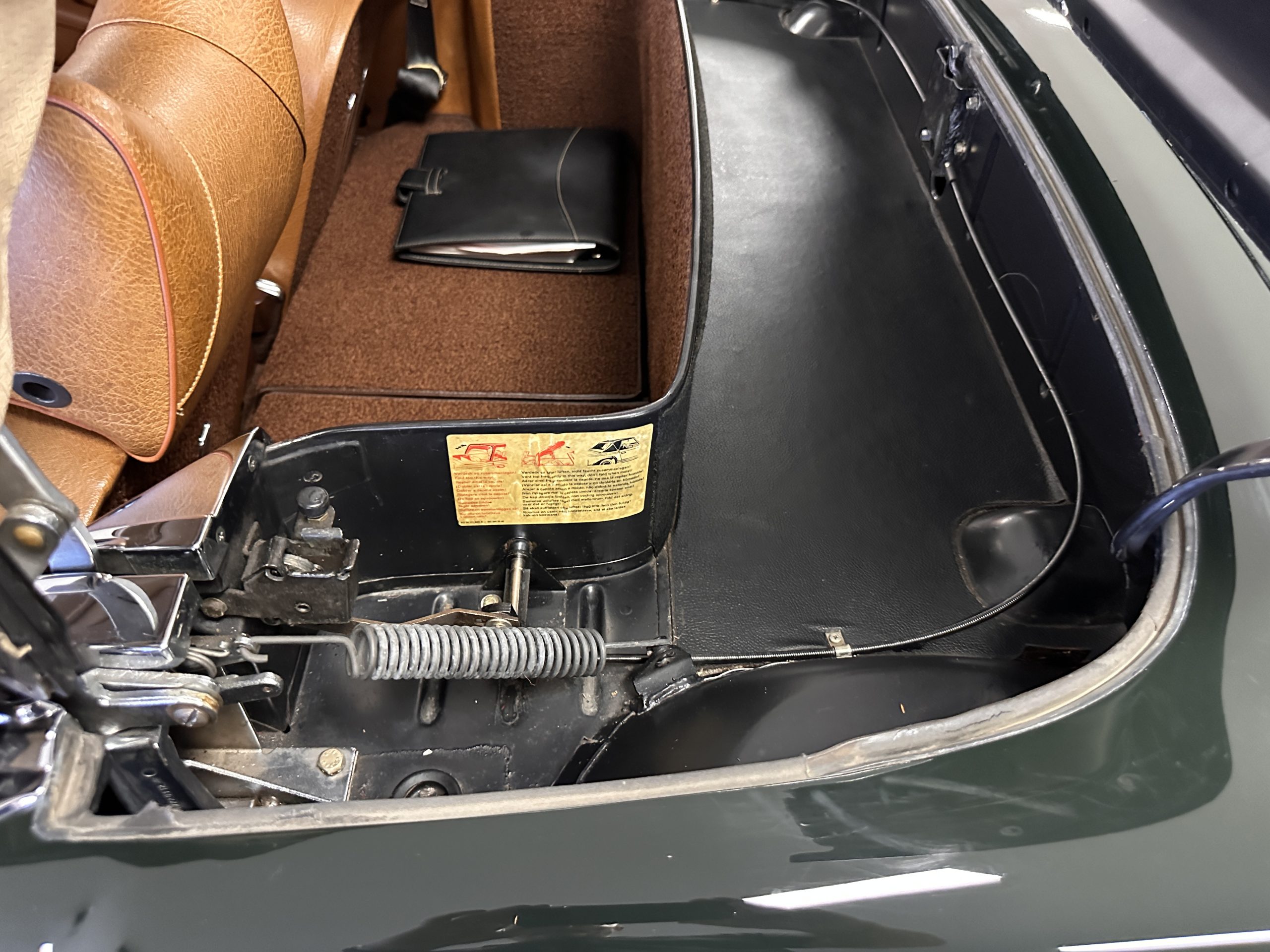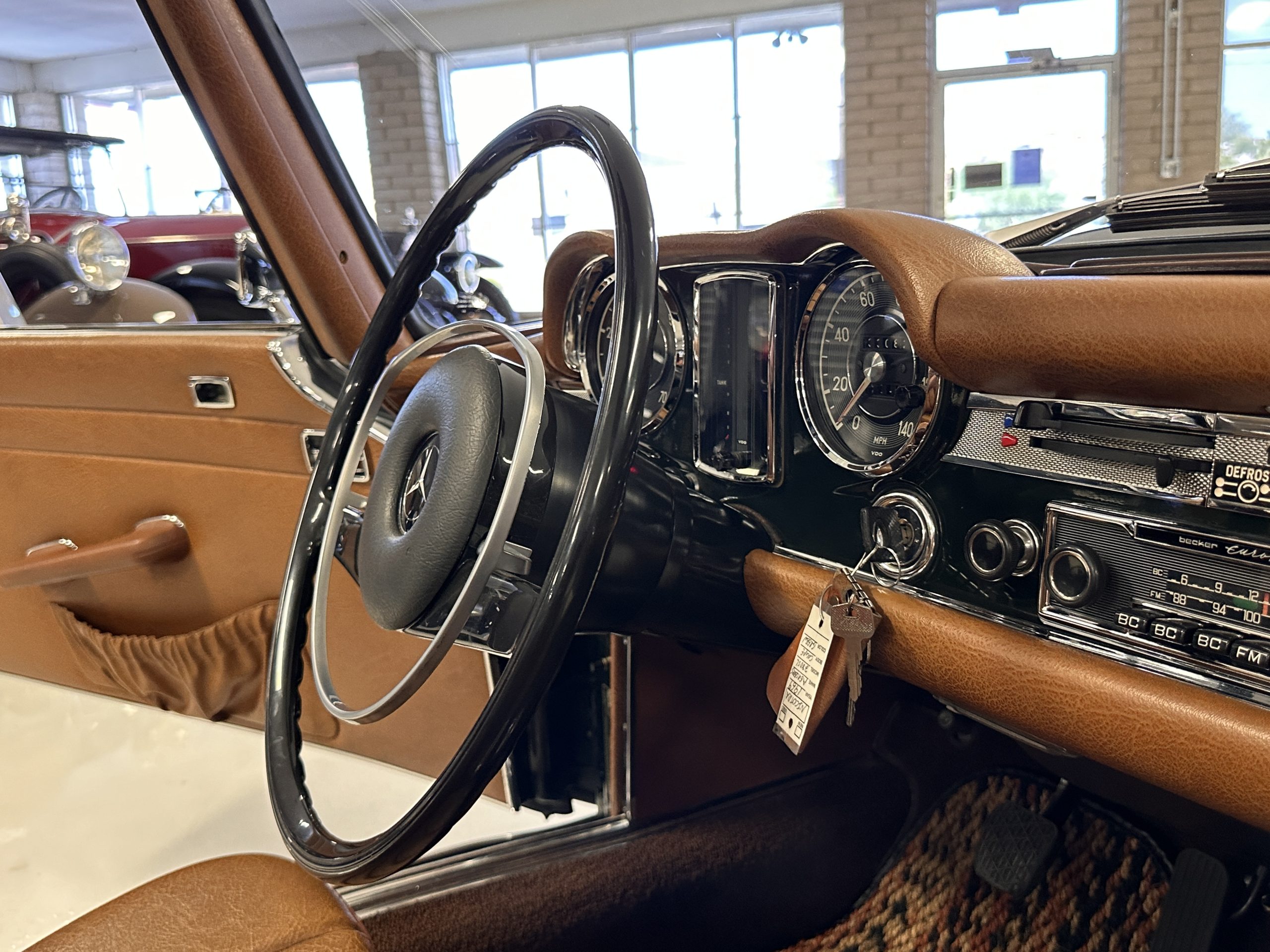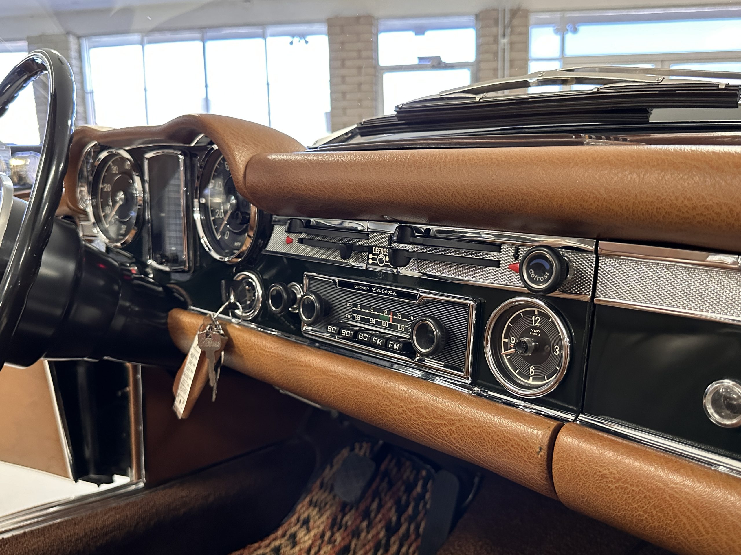 The interior is also in nearly perfect original condition, with its original Cognac MB Tex (Trim Code 140) in excellent condition.  The dashboard, instruments, steering wheel and carpet are also fantastic.  The wood trim is also in excellent condition.  As you would expect, all of the instrument’s work as new and the Becker Europa AM/FM radio also works well.  It still has its original Hirshman antenna.  The original black soft-top is securely stowed under its compartment.  Incredibly, it has not shrunk and was easy to close.  It is in wonderful original condition but obviously is showing patina.  The hardtop is also in nearly perfect original condition, including the headliner and wood trim.