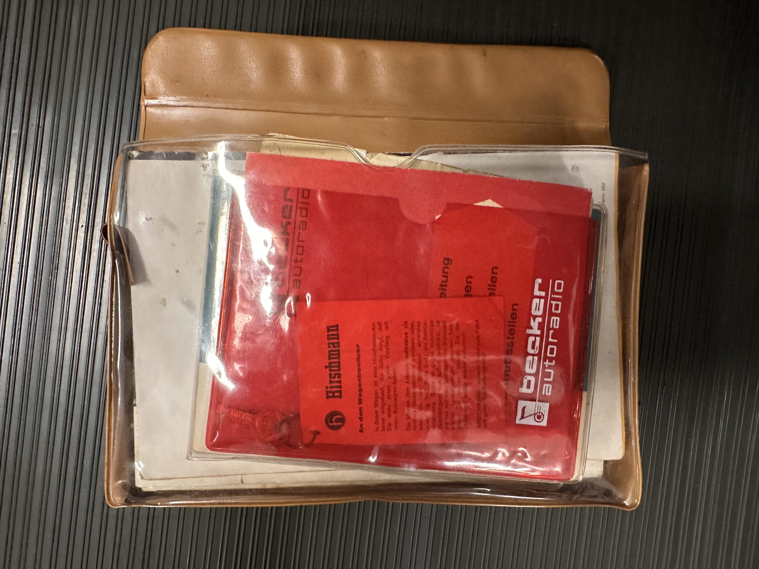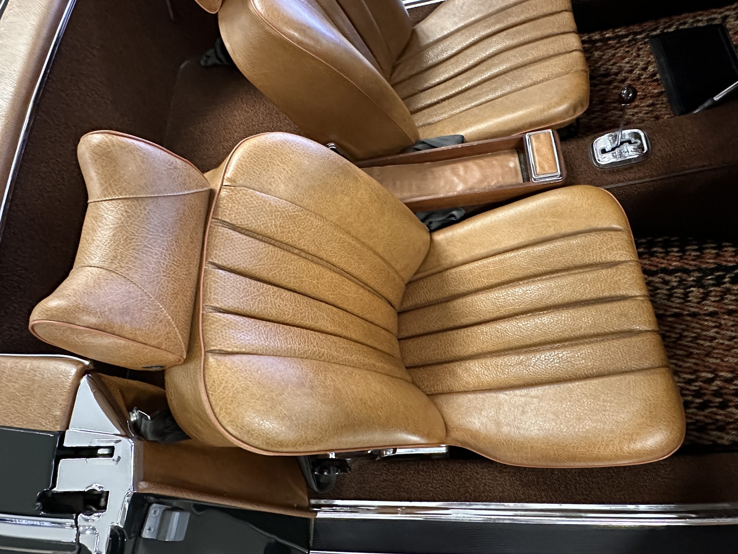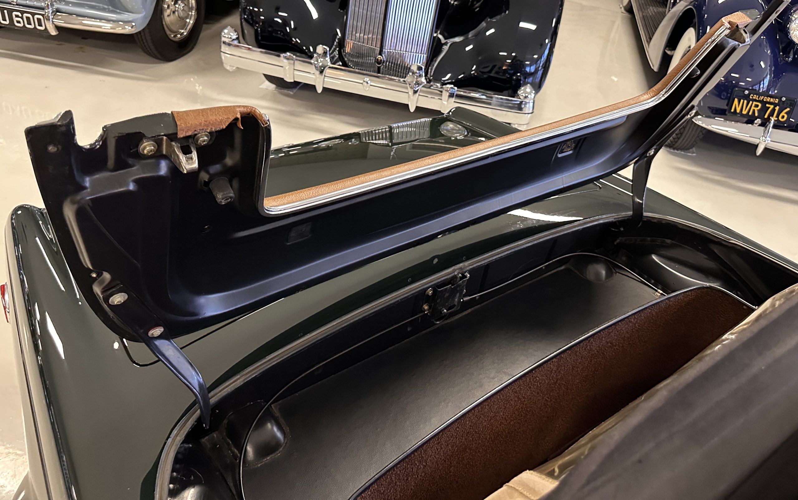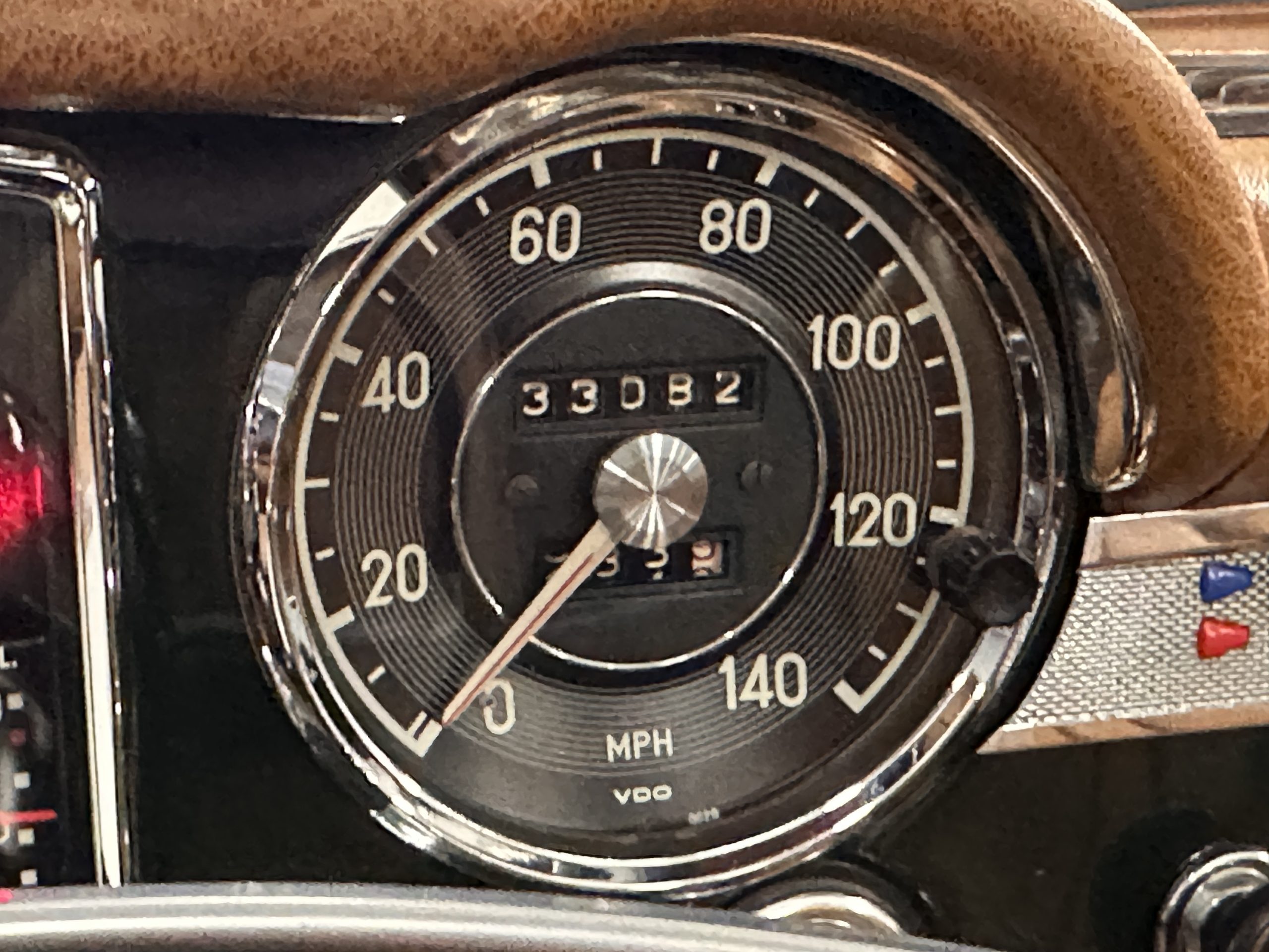 The interior is also in nearly perfect original condition, with its original Cognac MB Tex (Trim Code 140) in excellent condition.  The dashboard, instruments, steering wheel and carpet are also fantastic.  The wood trim is also in excellent condition.  As you would expect, all of the instrument’s work as new and the Becker Europa AM/FM radio also works well.  It still has its original Hirshman antenna.  The original black soft-top is securely stowed under its compartment.  Incredibly, it has not shrunk and was easy to close.  It is in wonderful original condition but obviously is showing patina.  The hardtop is also in nearly perfect original condition, including the headliner and wood trim.