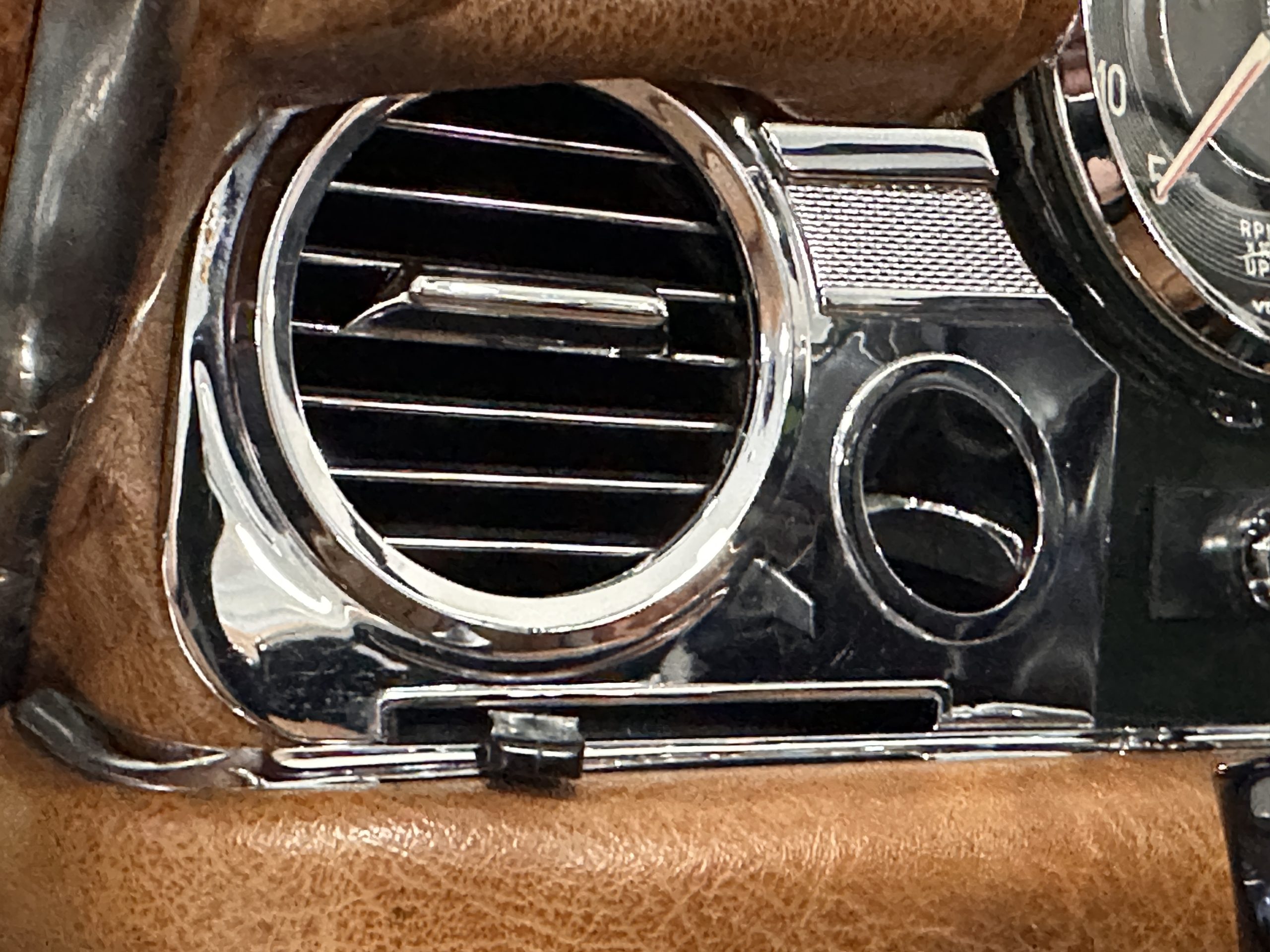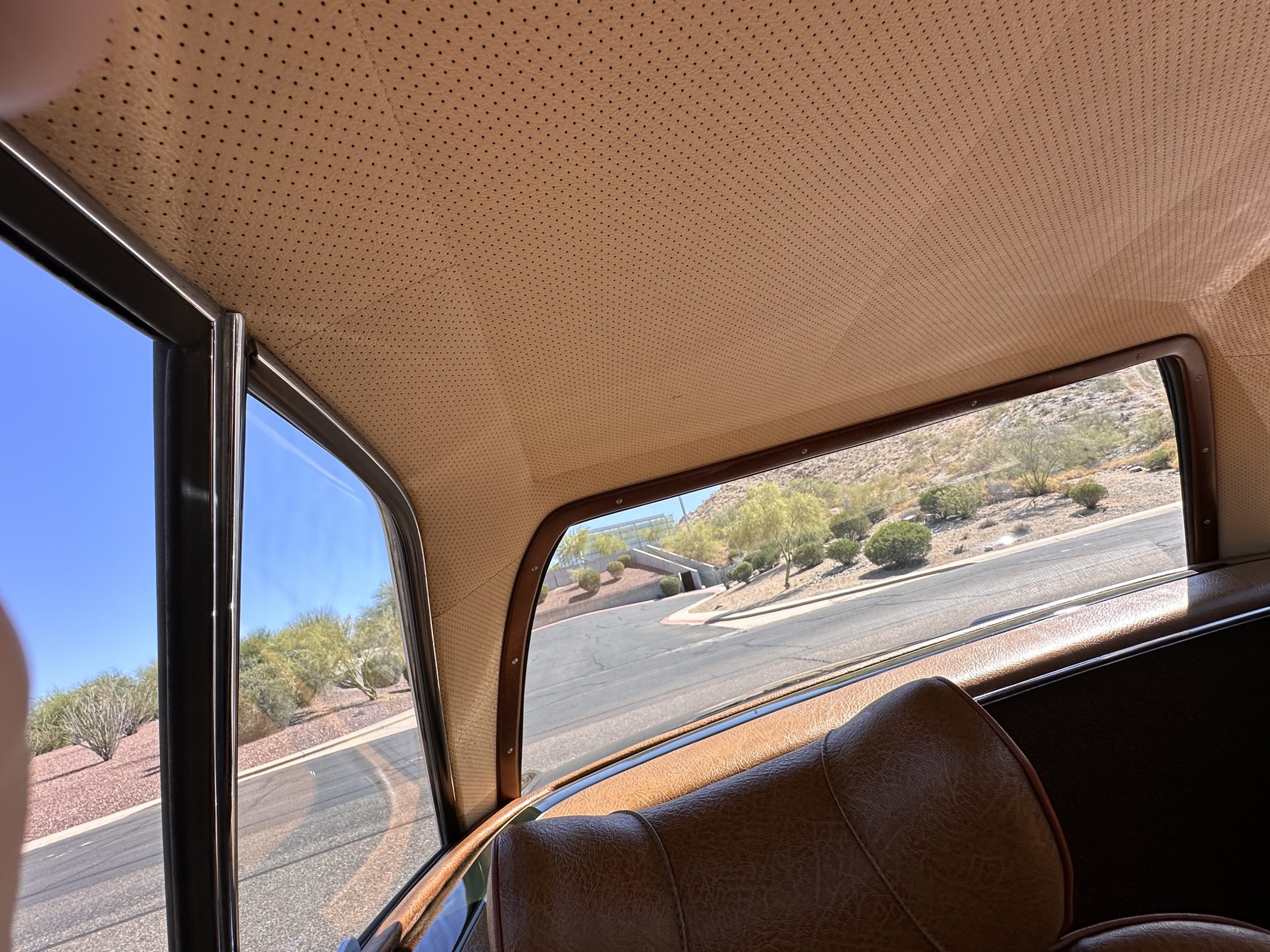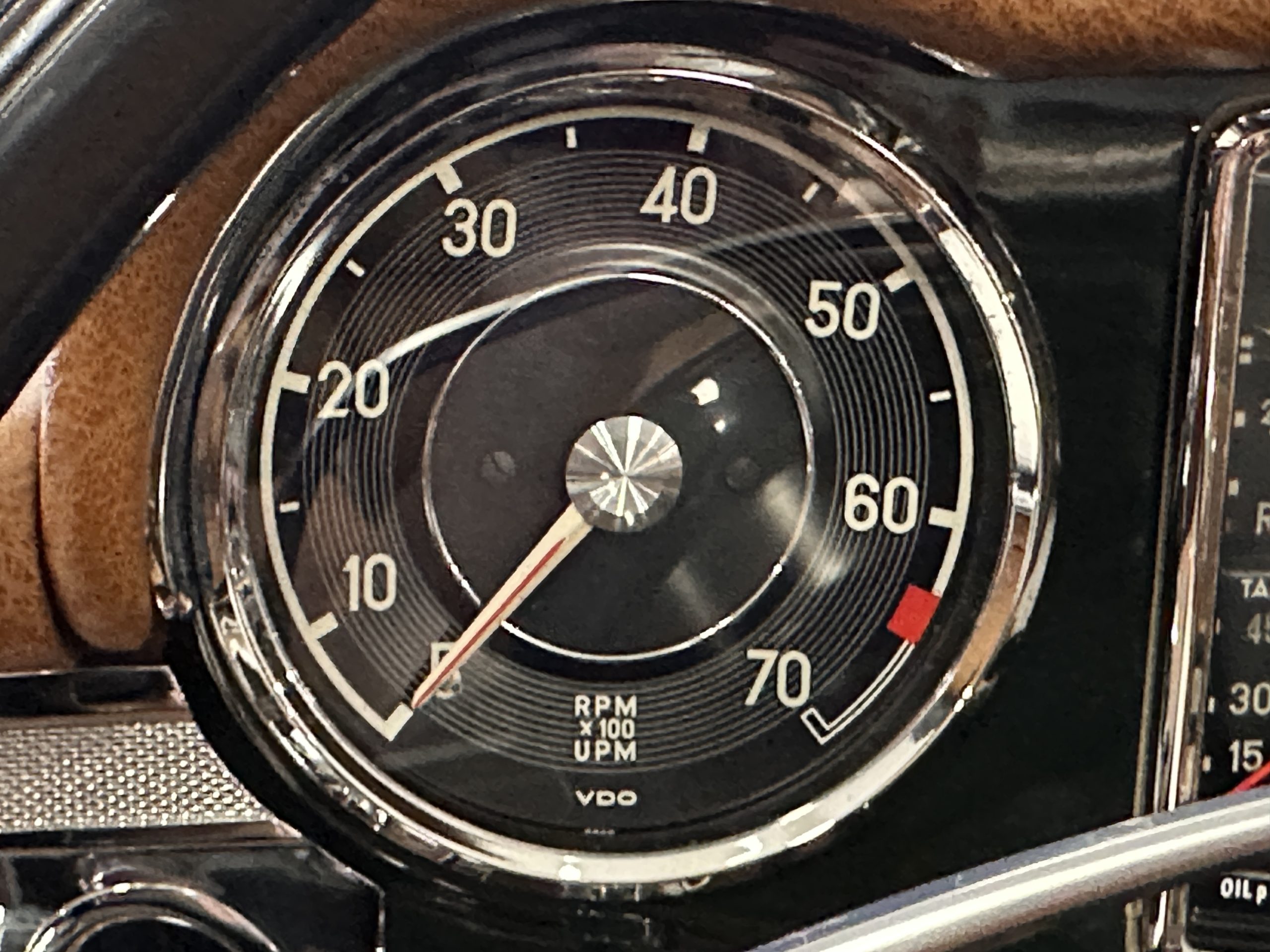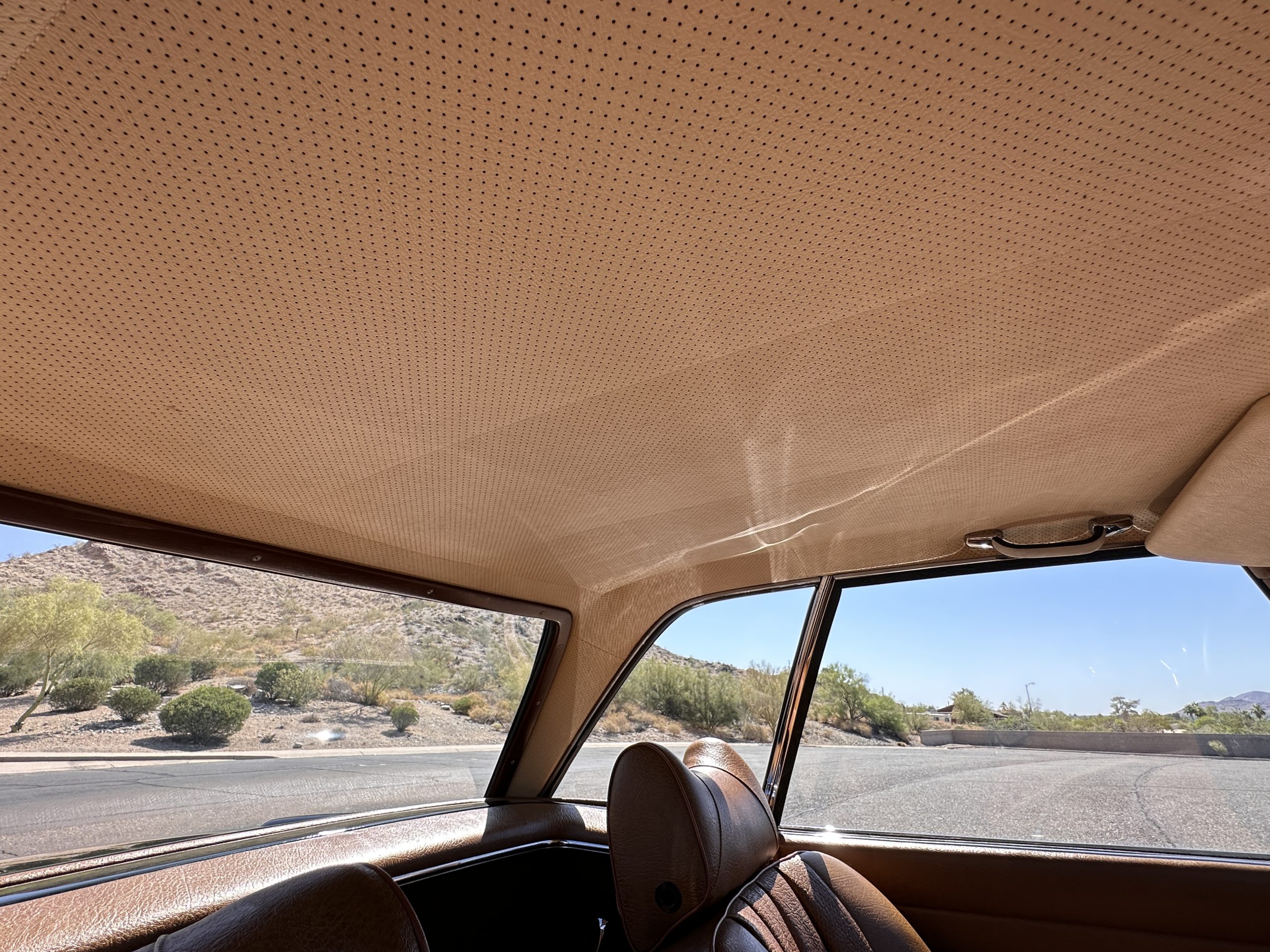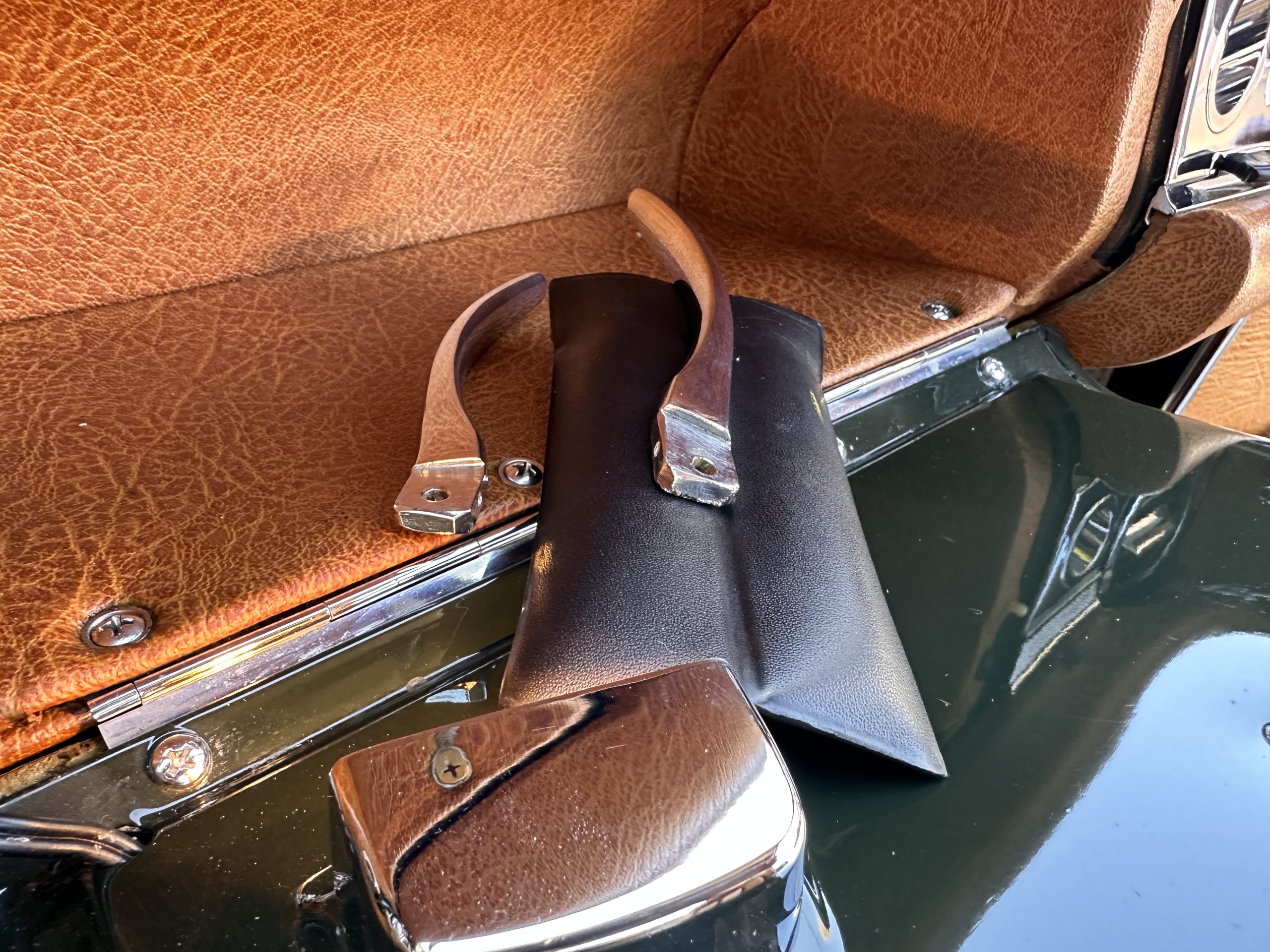 The interior is also in nearly perfect original condition, with its original Cognac MB Tex (Trim Code 140) in excellent condition.  The dashboard, instruments, steering wheel and carpet are also fantastic.  The wood trim is also in excellent condition.  As you would expect, all of the instrument’s work as new and the Becker Europa AM/FM radio also works well.  It still has its original Hirshman antenna.  The original black soft-top is securely stowed under its compartment.  Incredibly, it has not shrunk and was easy to close.  It is in wonderful original condition but obviously is showing patina.  The hardtop is also in nearly perfect original condition, including the headliner and wood trim.
