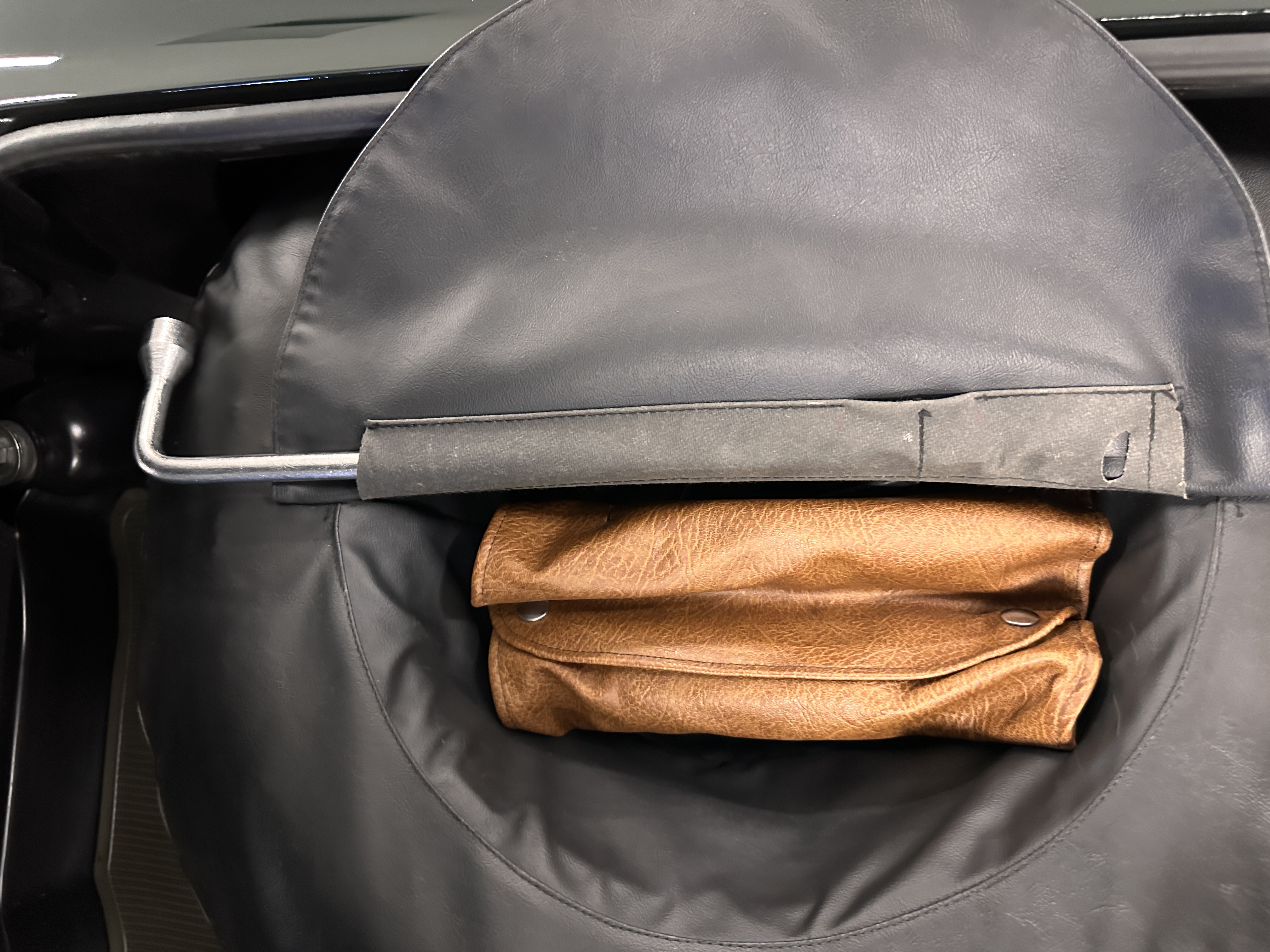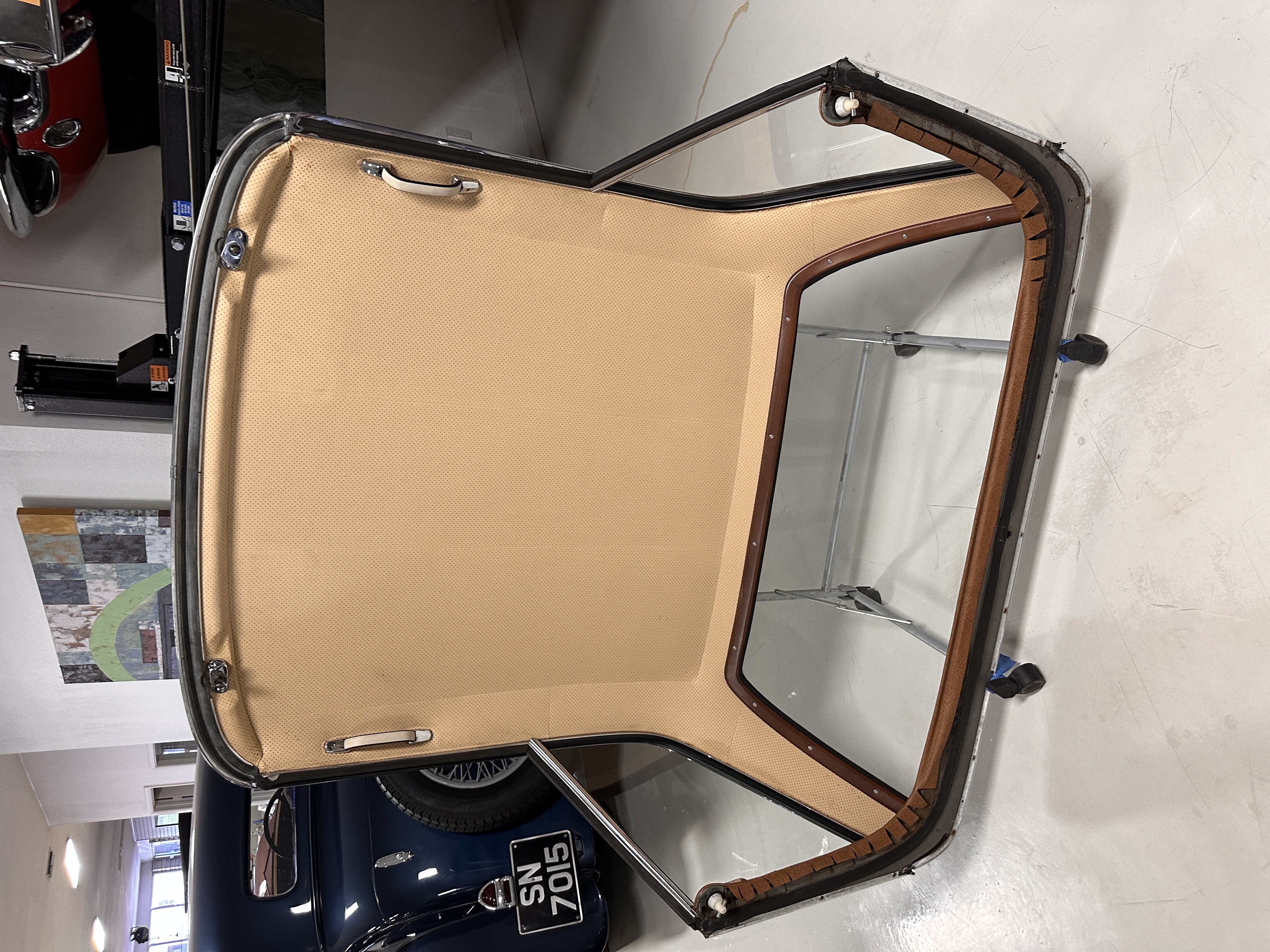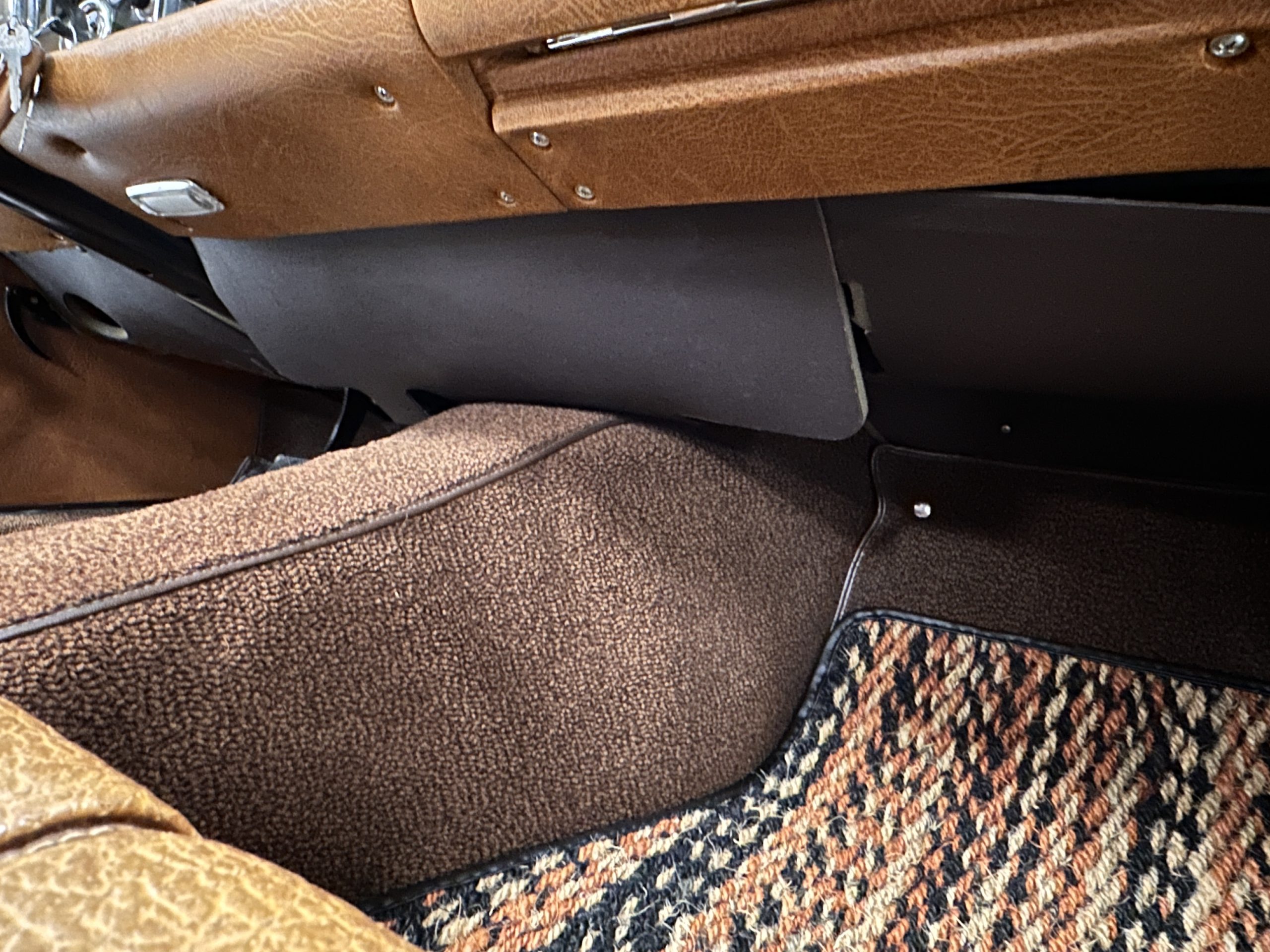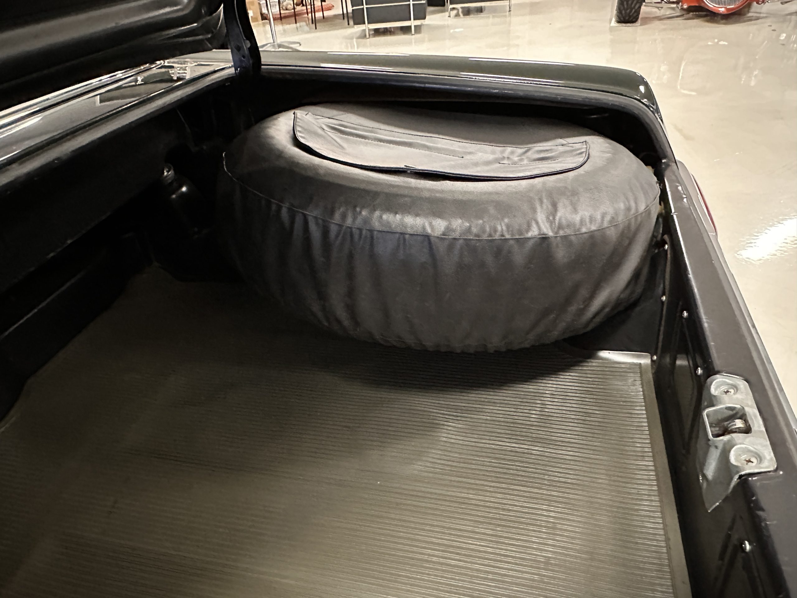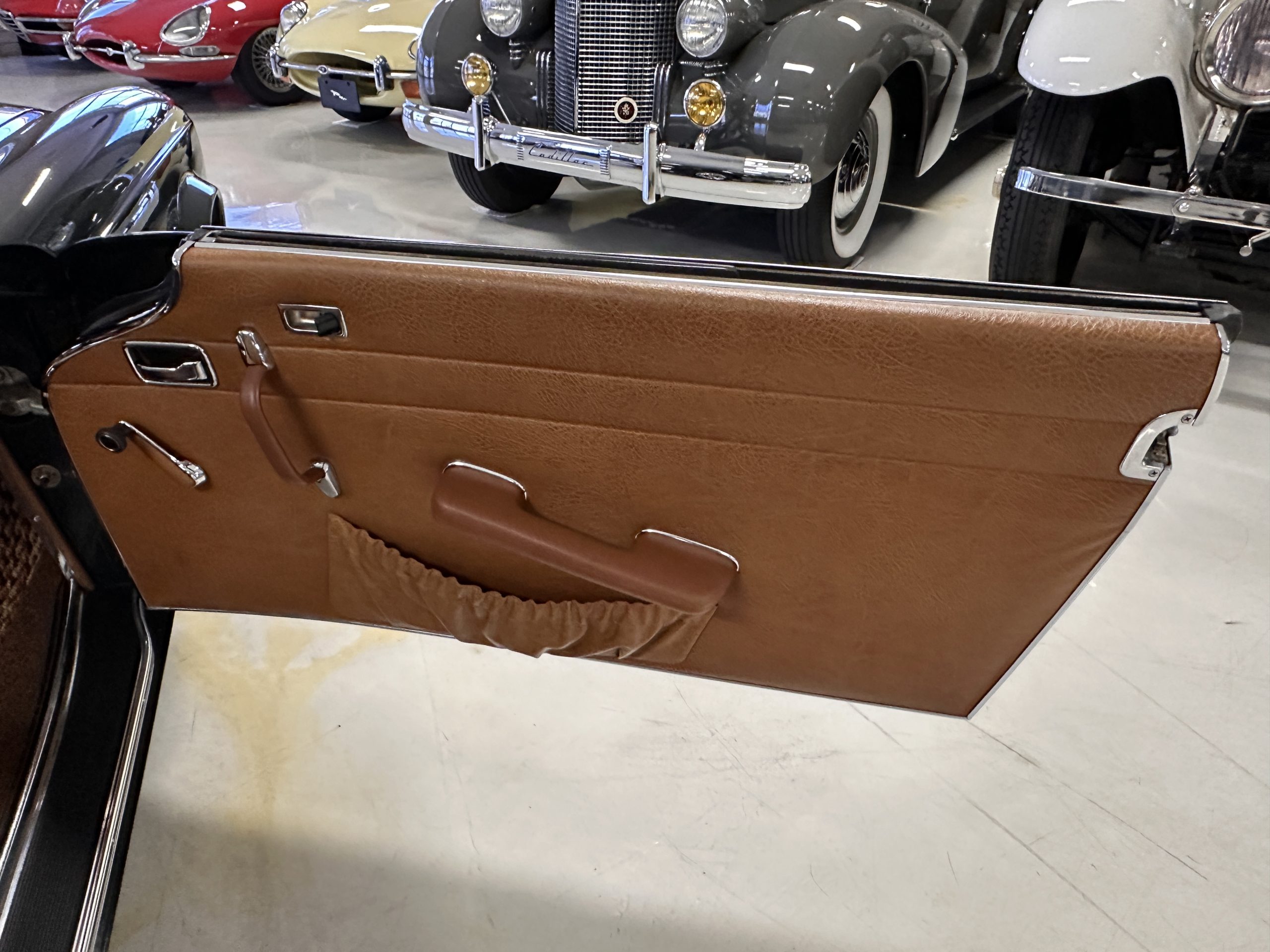 The interior is also in nearly perfect original condition, with its original Cognac MB Tex (Trim Code 140) in excellent condition.  The dashboard, instruments, steering wheel and carpet are also fantastic.  The wood trim is also in excellent condition.  As you would expect, all of the instrument’s work as new and the Becker Europa AM/FM radio also works well.  It still has its original Hirshman antenna.  The original black soft-top is securely stowed under its compartment.  Incredibly, it has not shrunk and was easy to close.  It is in wonderful original condition but obviously is showing patina.  The hardtop is also in nearly perfect original condition, including the headliner and wood trim.