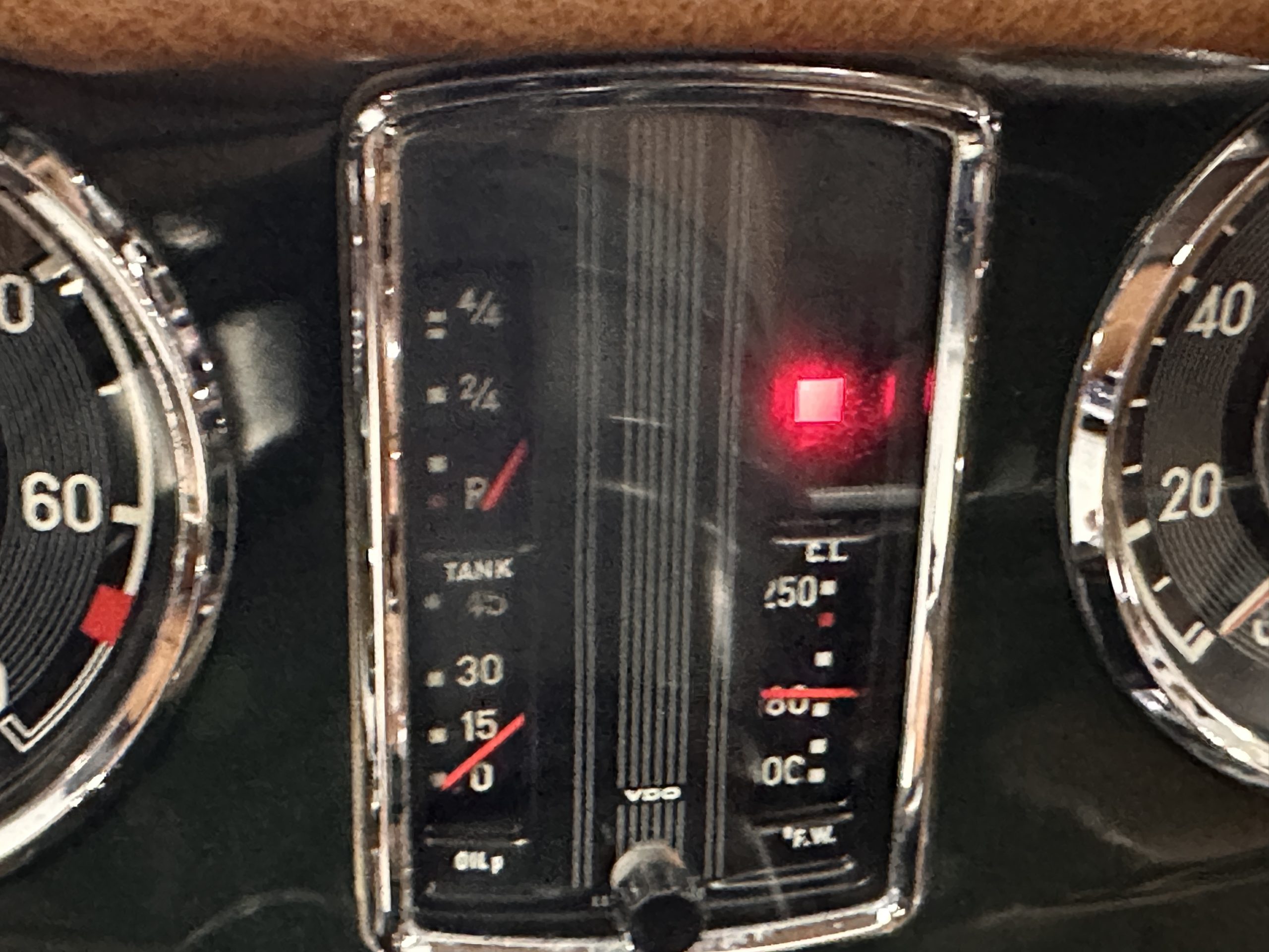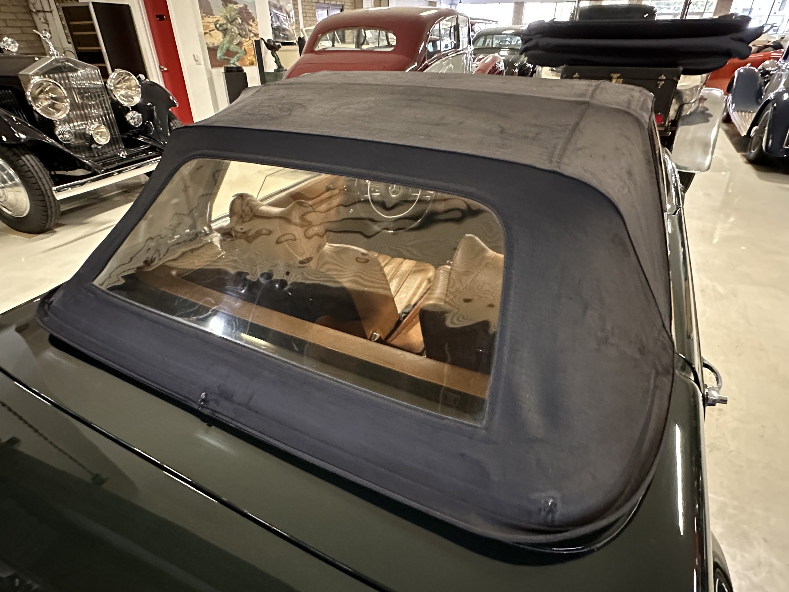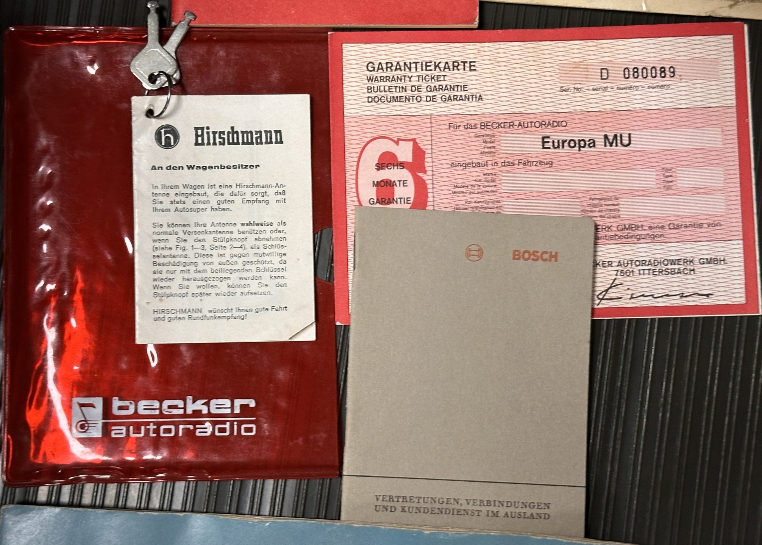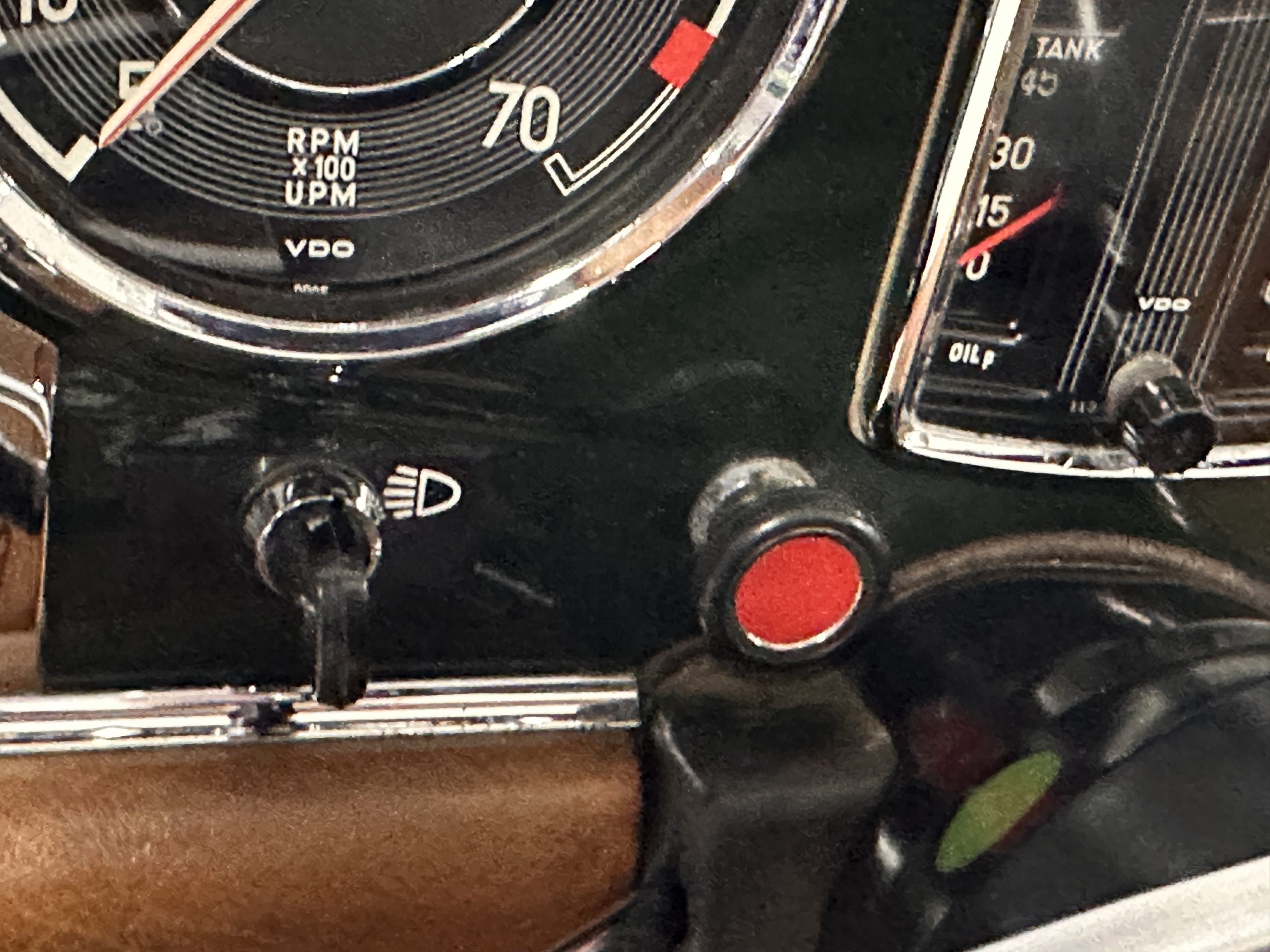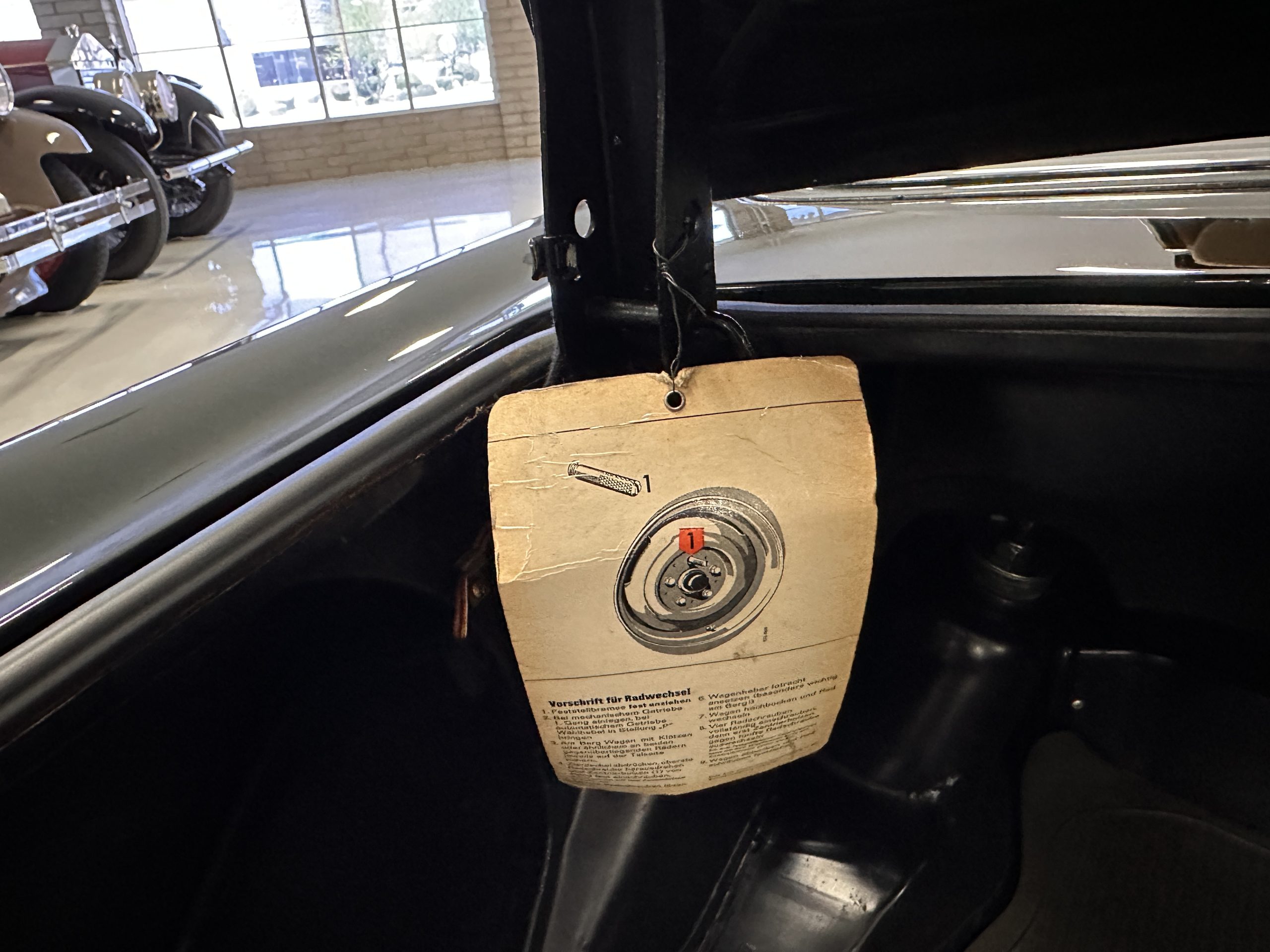 The interior is also in nearly perfect original condition, with its original Cognac MB Tex (Trim Code 140) in excellent condition.  The dashboard, instruments, steering wheel and carpet are also fantastic.  The wood trim is also in excellent condition.  As you would expect, all of the instrument’s work as new and the Becker Europa AM/FM radio also works well.  It still has its original Hirshman antenna.  The original black soft-top is securely stowed under its compartment.  Incredibly, it has not shrunk and was easy to close.  It is in wonderful original condition but obviously is showing patina.  The hardtop is also in nearly perfect original condition, including the headliner and wood trim.
