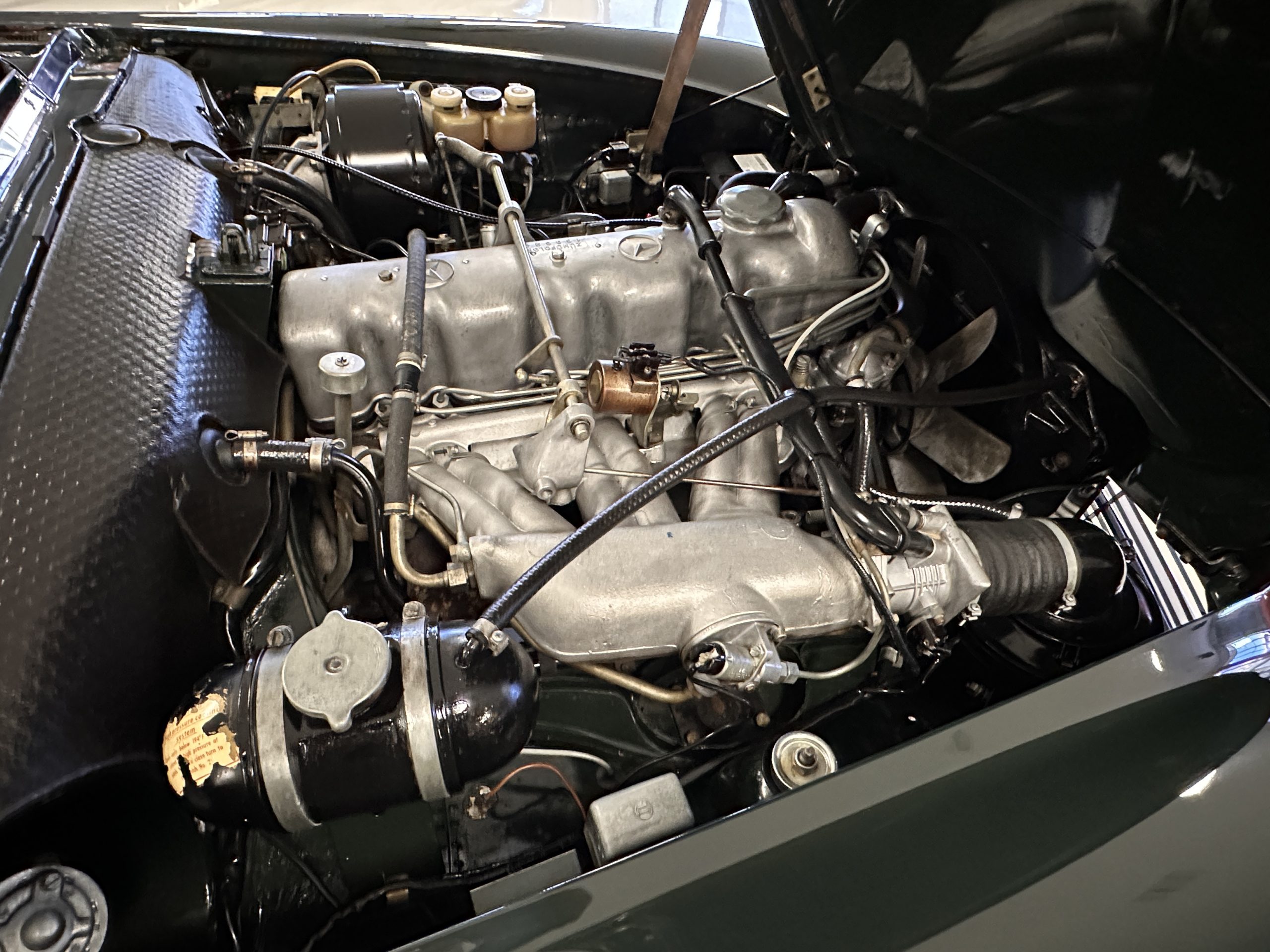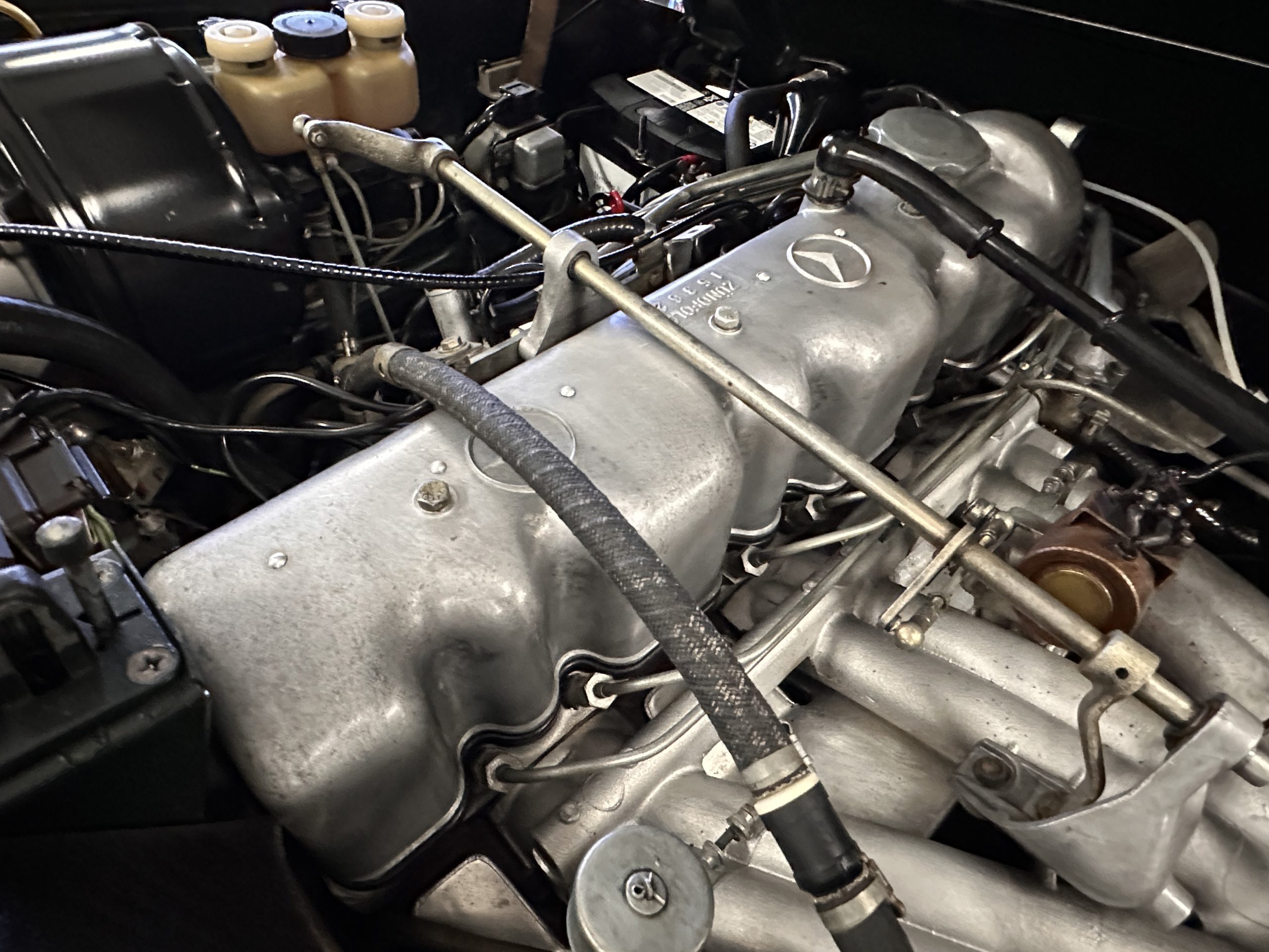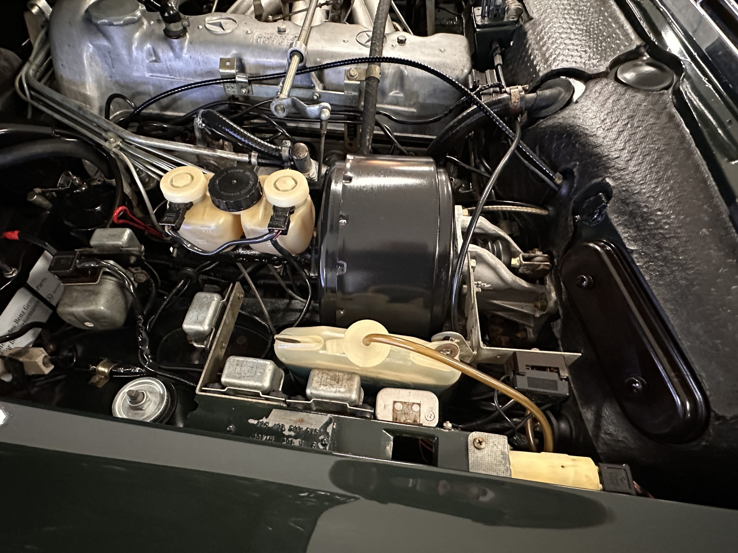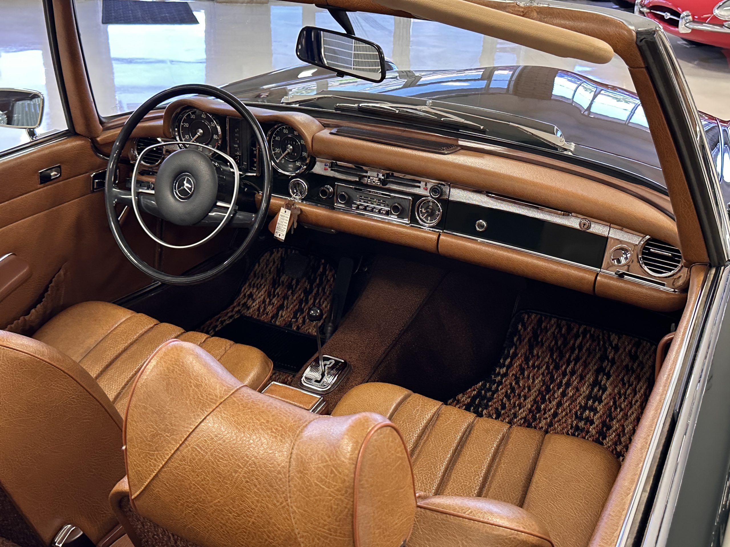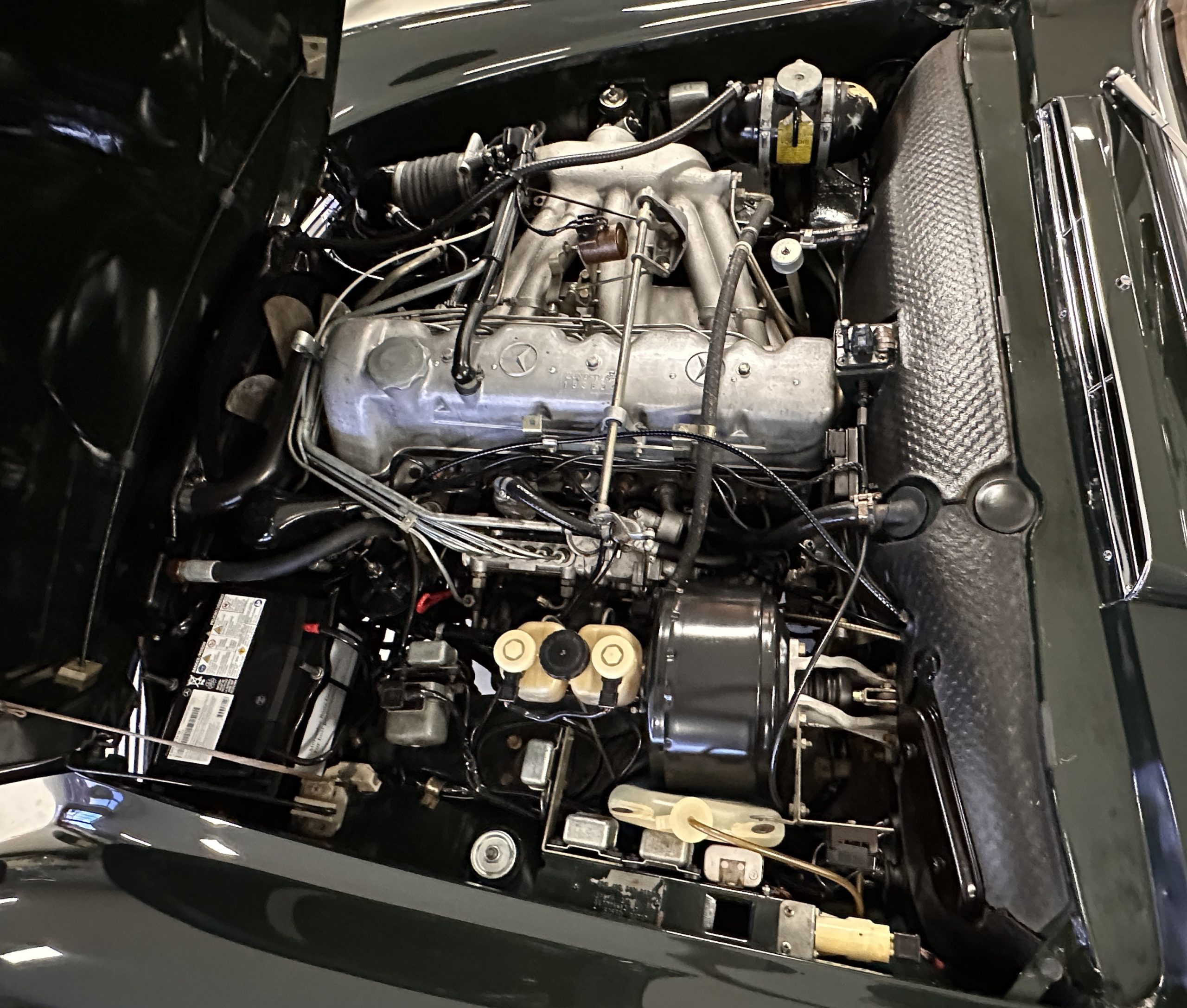 The engine compartment is also beautifully detailed and ready to show.  The original firewall pad is in gorgeous condition, which reflects the care this 280SL received throughout its life.  The 2.8-liter SOHC 6-Cylinder Engine has 170 bhp with its Bosch Mechanical Multi-Port Fuel Injection.  This 280SL performs brilliantly and our driving videos show you the wonderful power of this venerable powerplant.  Its Four-Speed Automatic Gearbox shifts perfectly at all speeds and conditions without any hesitation or unwanted noises.  Its Four-Wheel Disc Brakes inspire confidence in all conditions, feeling much like a newer Mercedes.  Recent work included the installation of a new stainless-steel exhaust system and Bilstein shocks.