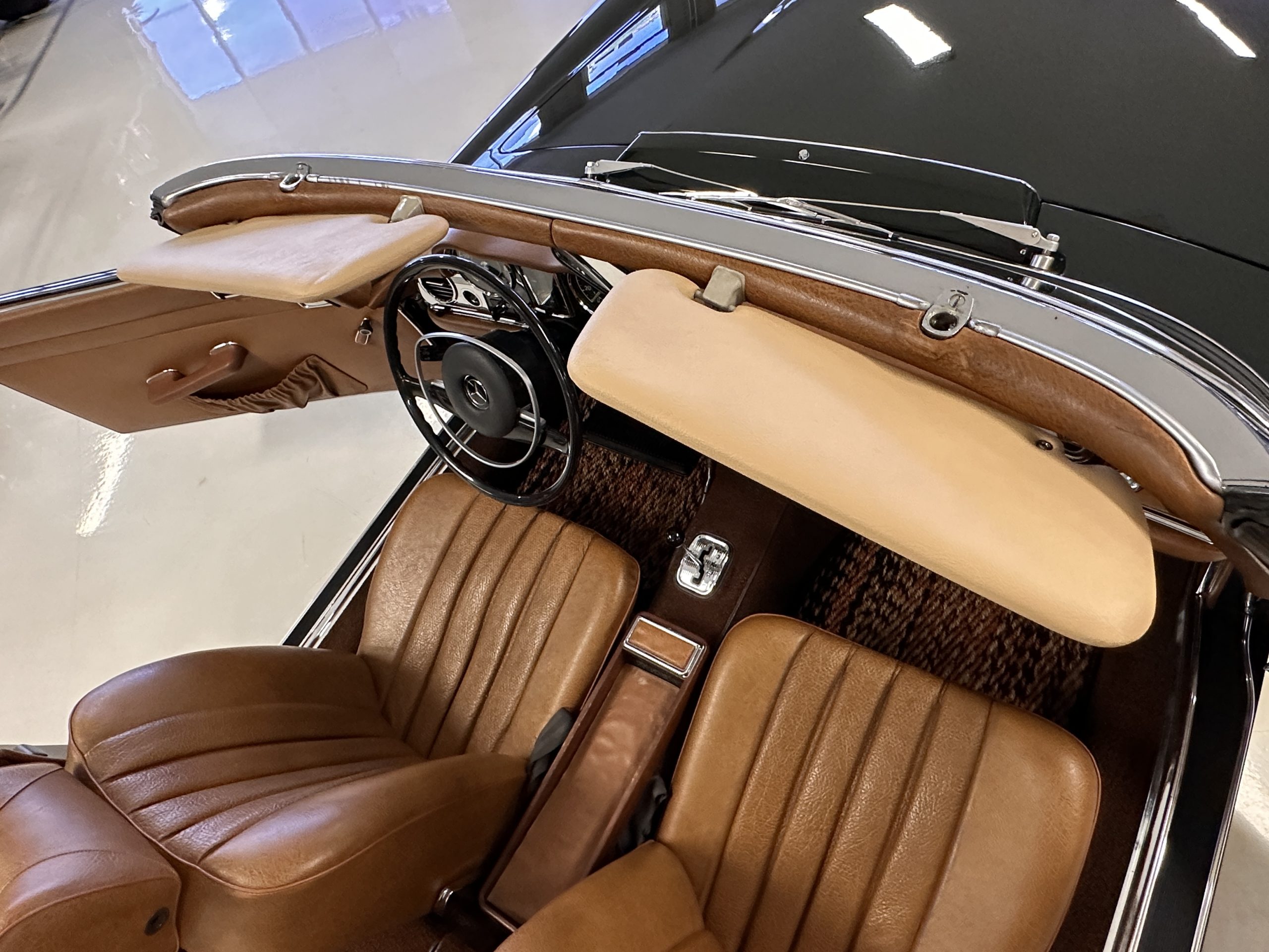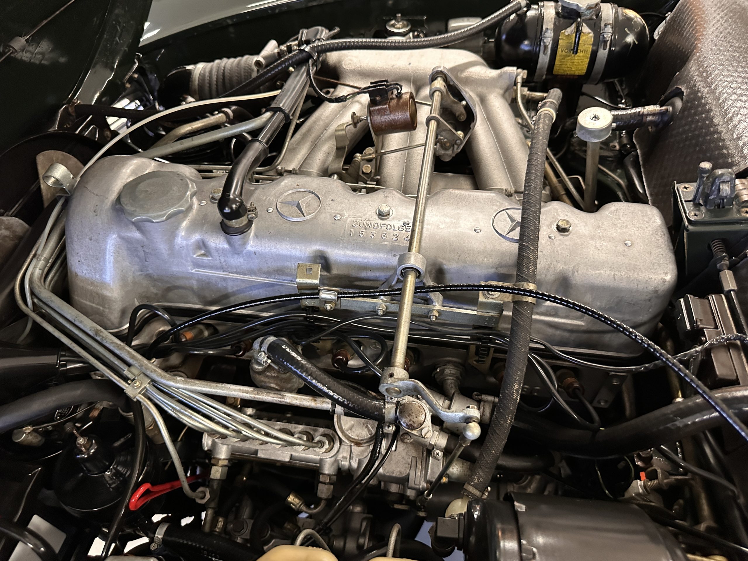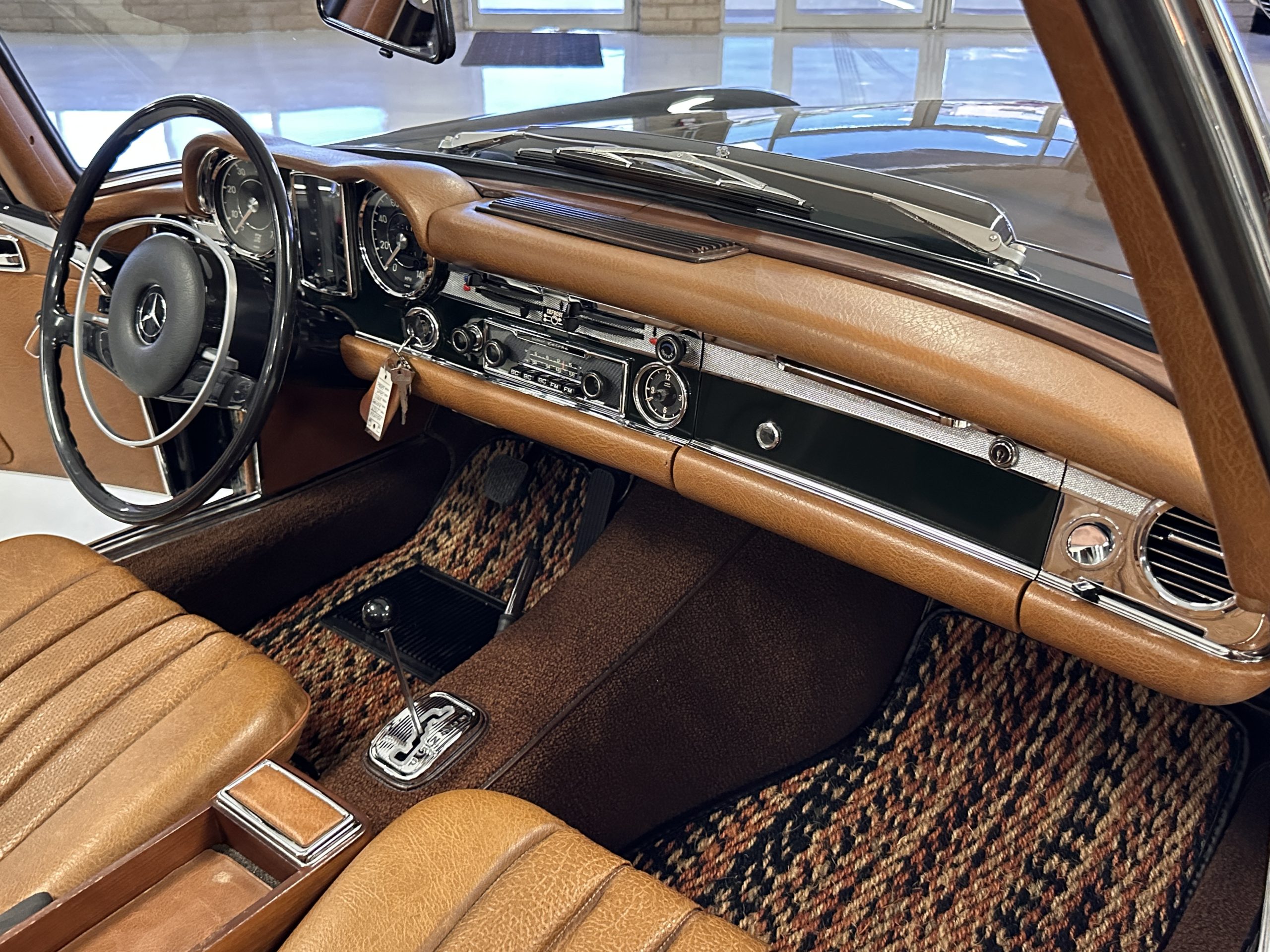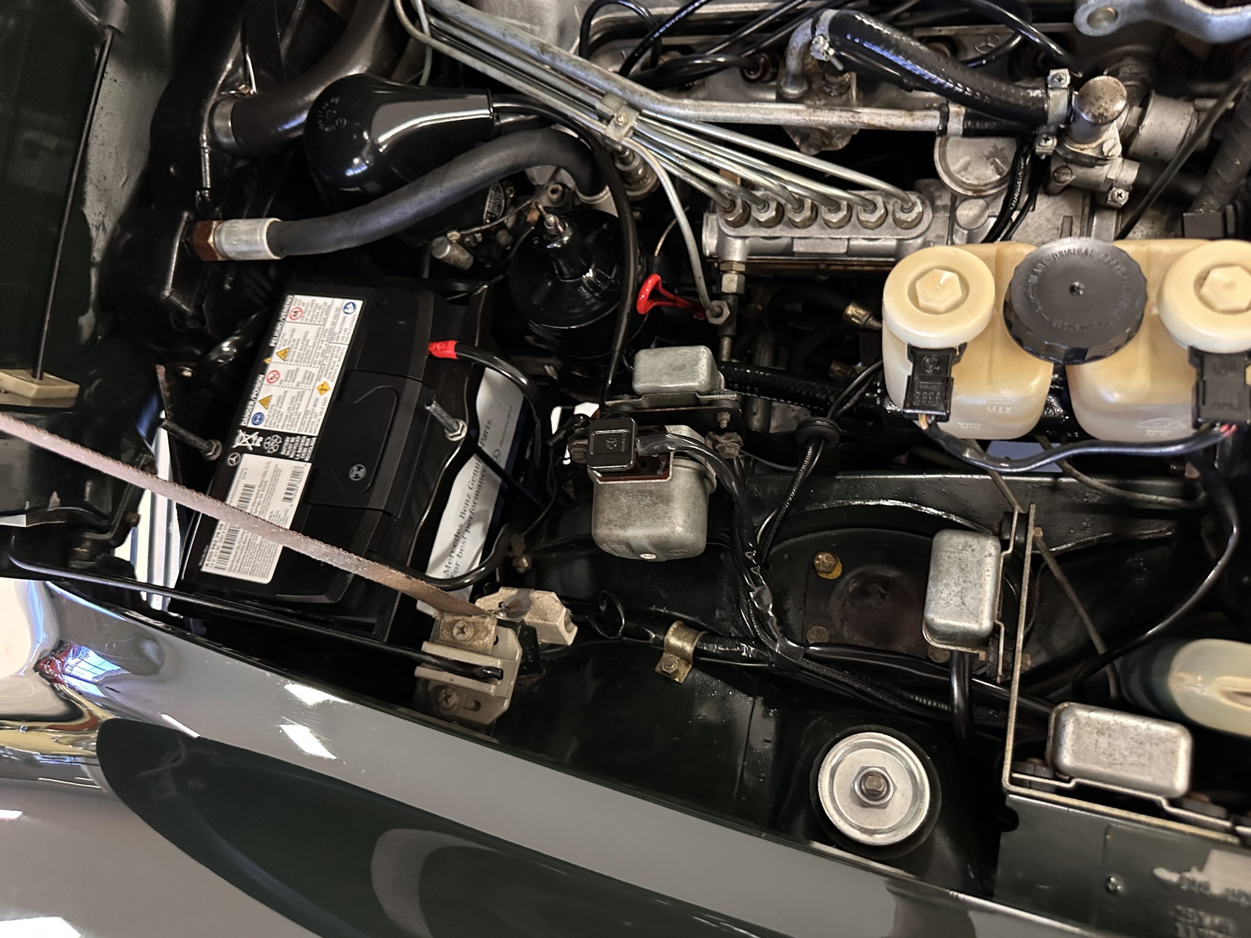 The engine compartment is also beautifully detailed and ready to show.  The original firewall pad is in gorgeous condition, which reflects the care this 280SL received throughout its life.  The 2.8-liter SOHC 6-Cylinder Engine has 170 bhp with its Bosch Mechanical Multi-Port Fuel Injection.  This 280SL performs brilliantly and our driving videos show you the wonderful power of this venerable powerplant.  Its Four-Speed Automatic Gearbox shifts perfectly at all speeds and conditions without any hesitation or unwanted noises.  Its Four-Wheel Disc Brakes inspire confidence in all conditions, feeling much like a newer Mercedes.  Recent work included the installation of a new stainless-steel exhaust system and Bilstein shocks.