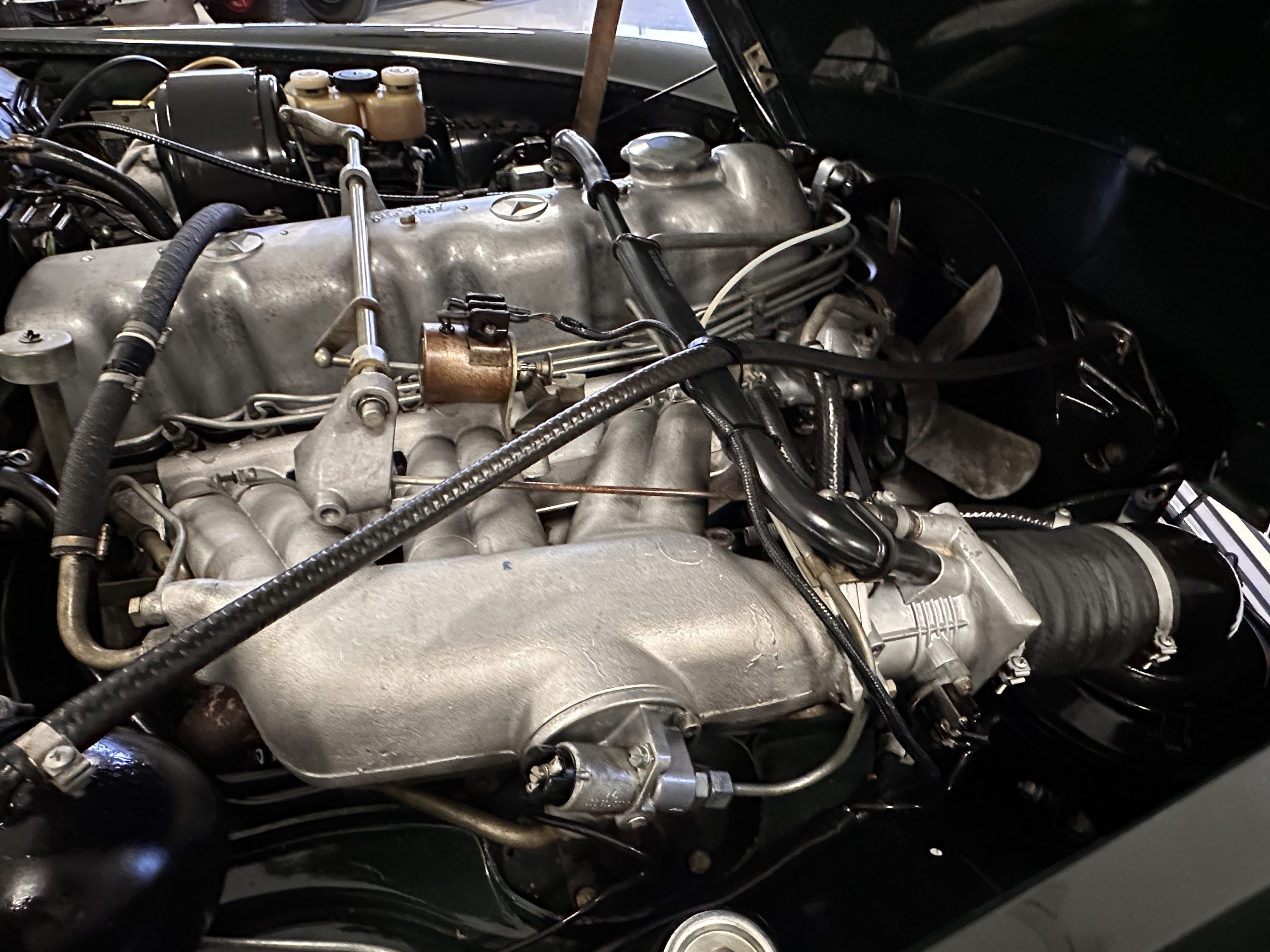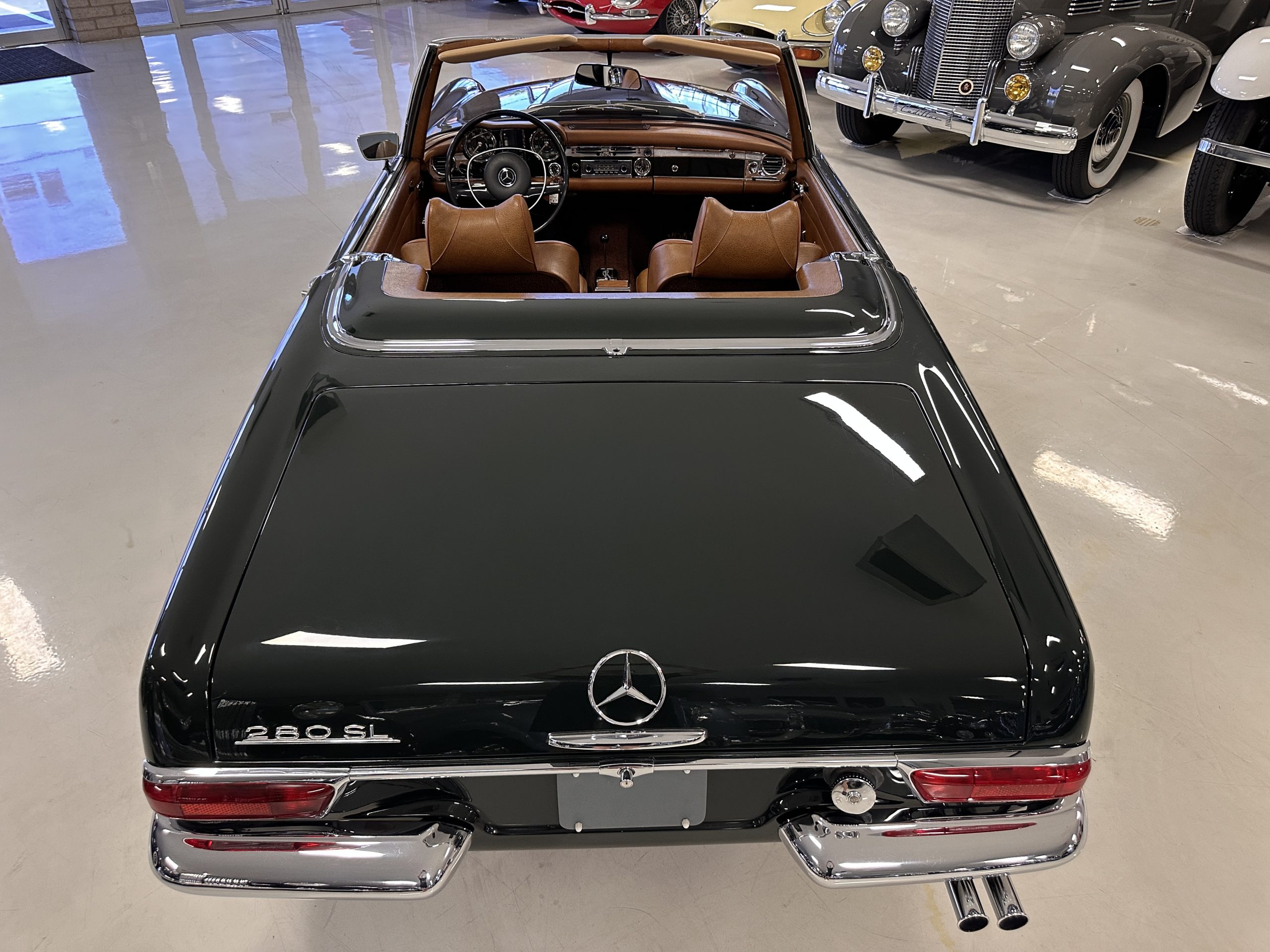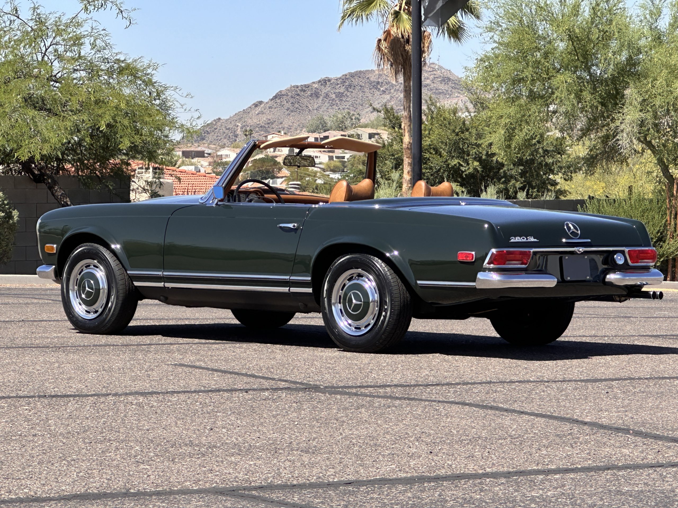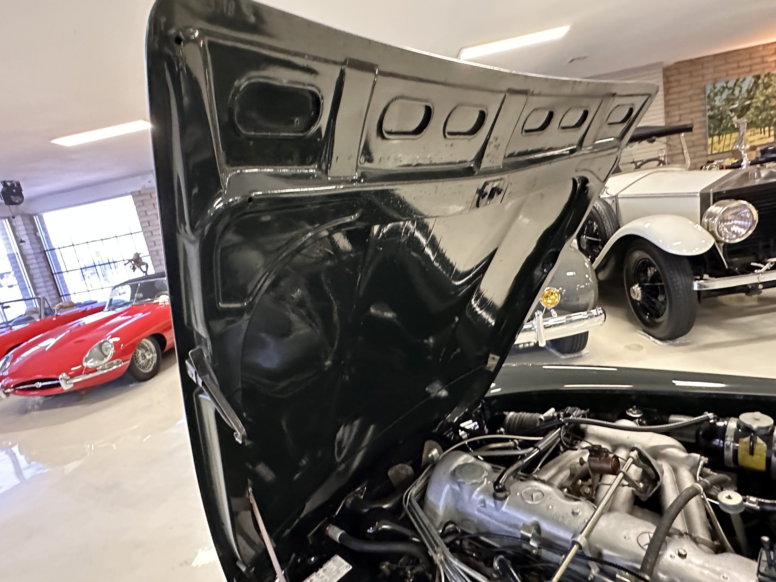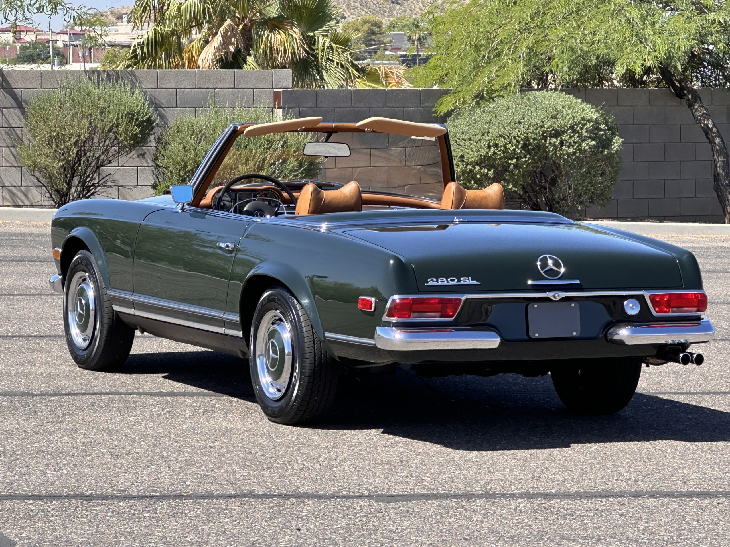 The engine compartment is also beautifully detailed and ready to show.  The original firewall pad is in gorgeous condition, which reflects the care this 280SL received throughout its life.  The 2.8-liter SOHC 6-Cylinder Engine has 170 bhp with its Bosch Mechanical Multi-Port Fuel Injection.  This 280SL performs brilliantly and our driving videos show you the wonderful power of this venerable powerplant.  Its Four-Speed Automatic Gearbox shifts perfectly at all speeds and conditions without any hesitation or unwanted noises.  Its Four-Wheel Disc Brakes inspire confidence in all conditions, feeling much like a newer Mercedes.  Recent work included the installation of a new stainless-steel exhaust system and Bilstein shocks.