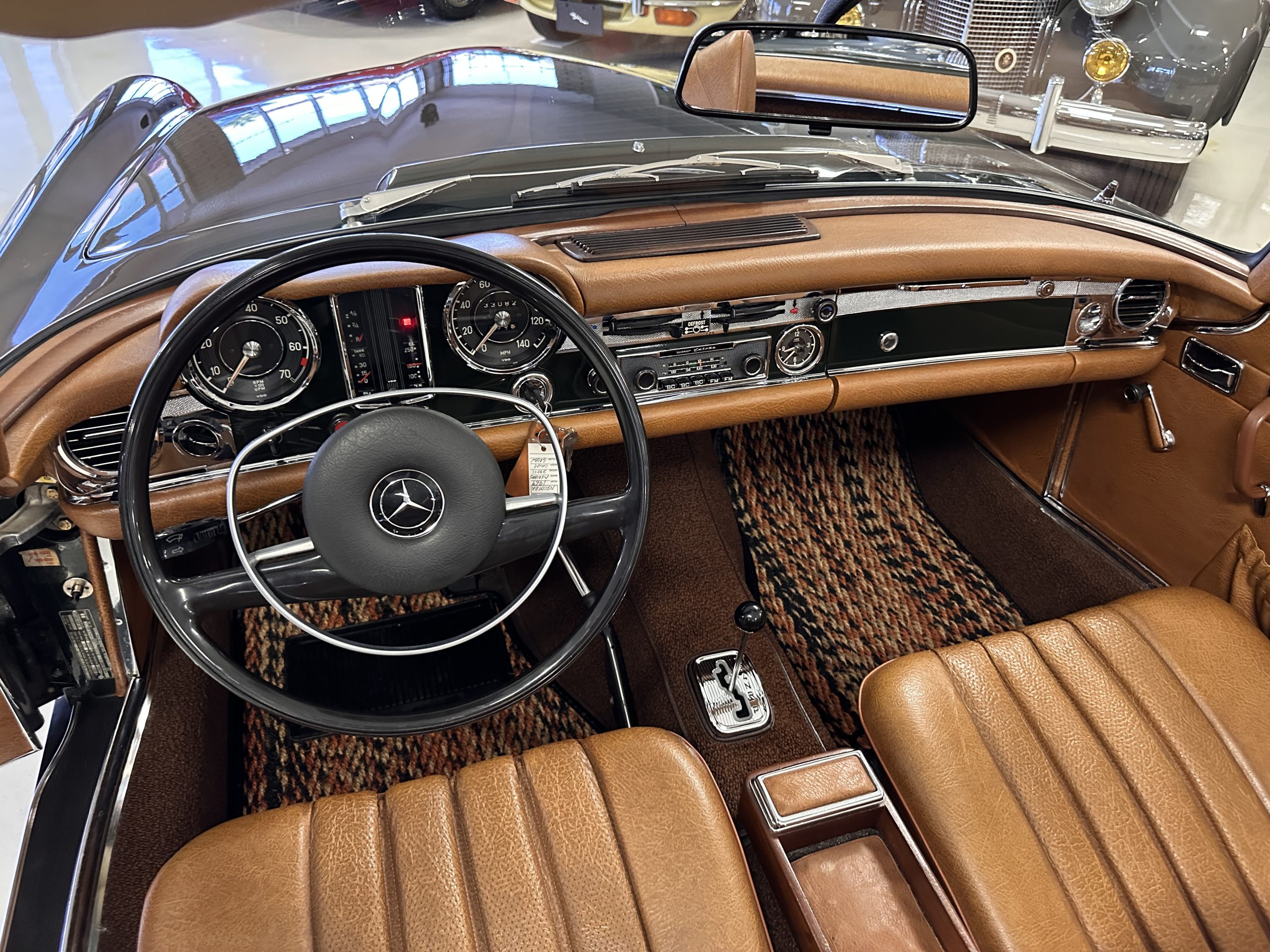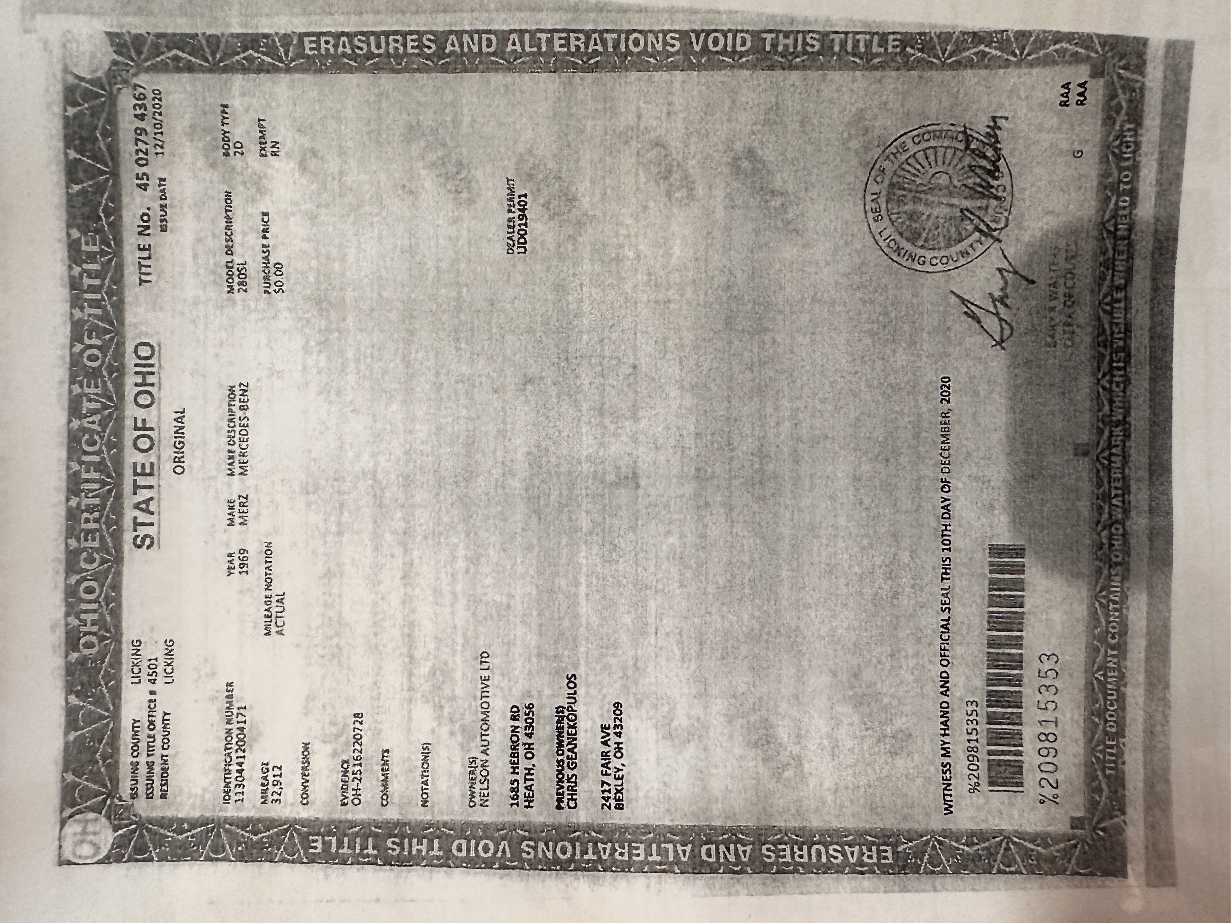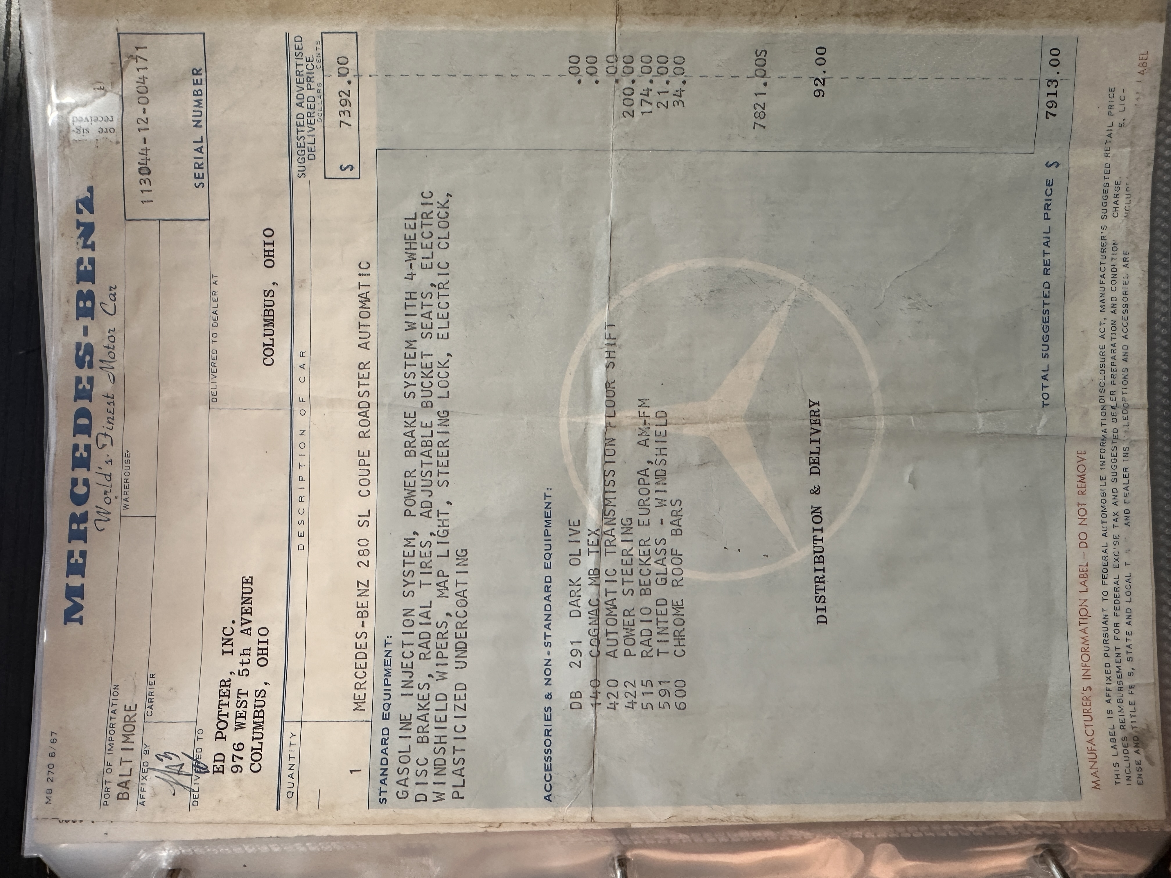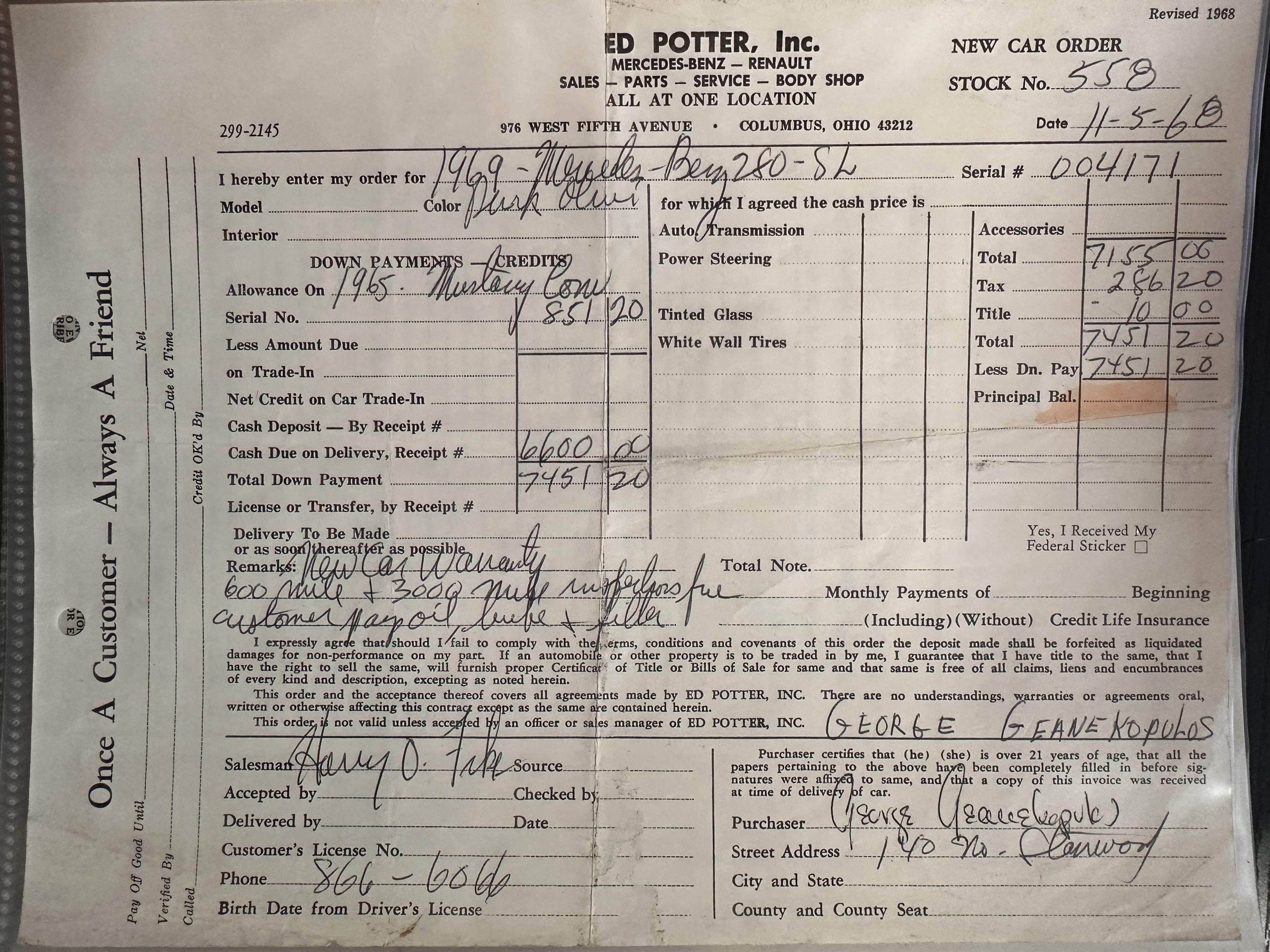 This 280SL was bought new on the 5th of November 1968 by Dr. George Geanekopulos from Ed Potter, Inc, the local Mercedes-Benz dealer in Columbus, OH.  Dr. George traded in his 1965 Mustang Convertible toward the purchase of the Mercedes.  Dr. George was a noted collector of cars and practiced dentistry in Columbus for 45 years.  He retained the 280SL within his collection for 50 years, until it was sold upon his passing on the 13th of October 2018.  It is now presented with 33,082 miles from new and nearly all original except one excellent repaint and normal service.