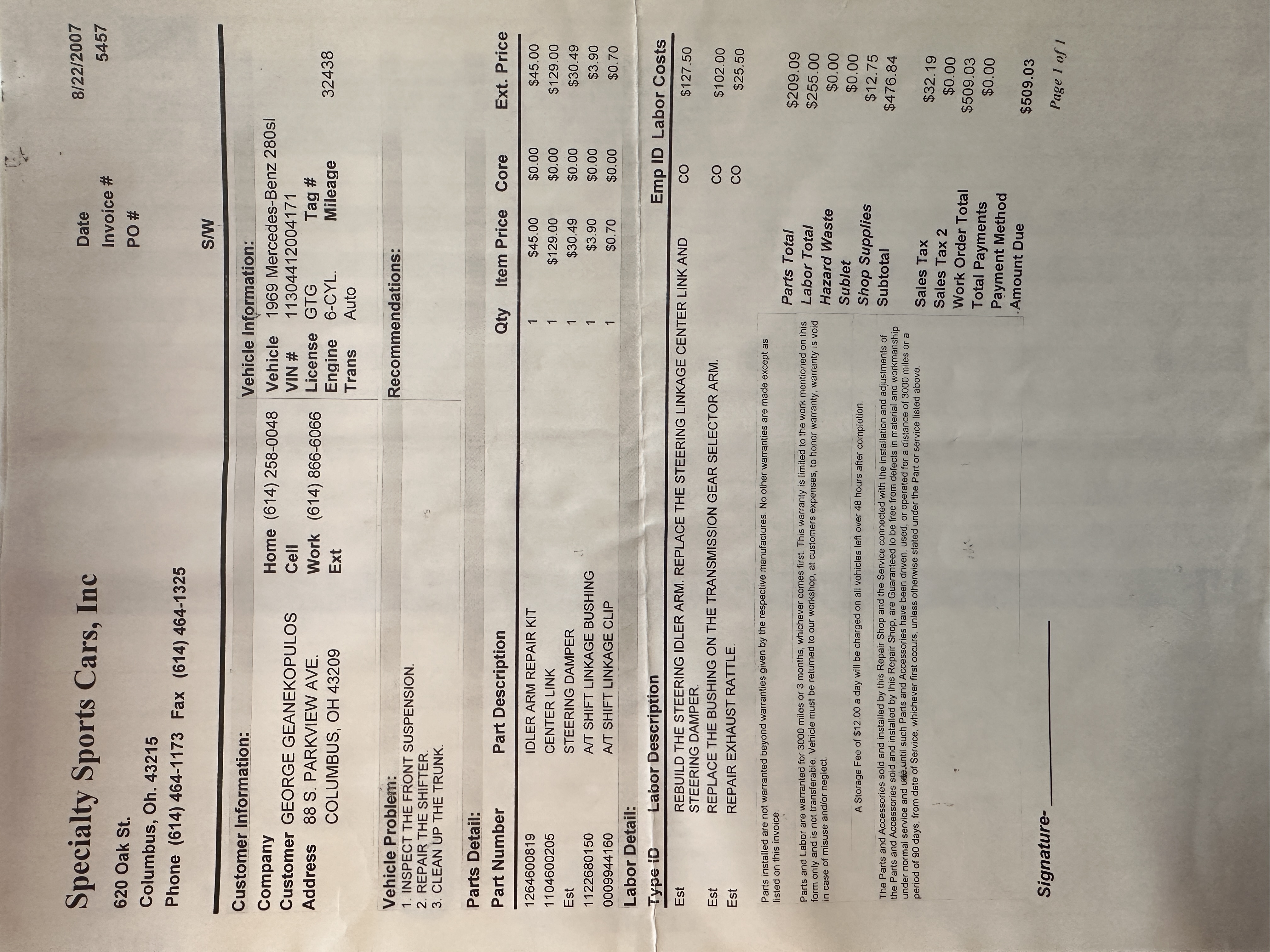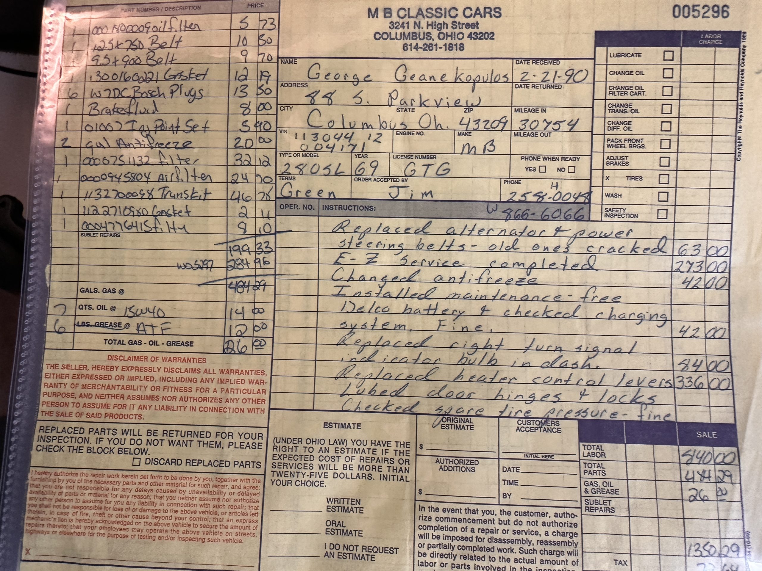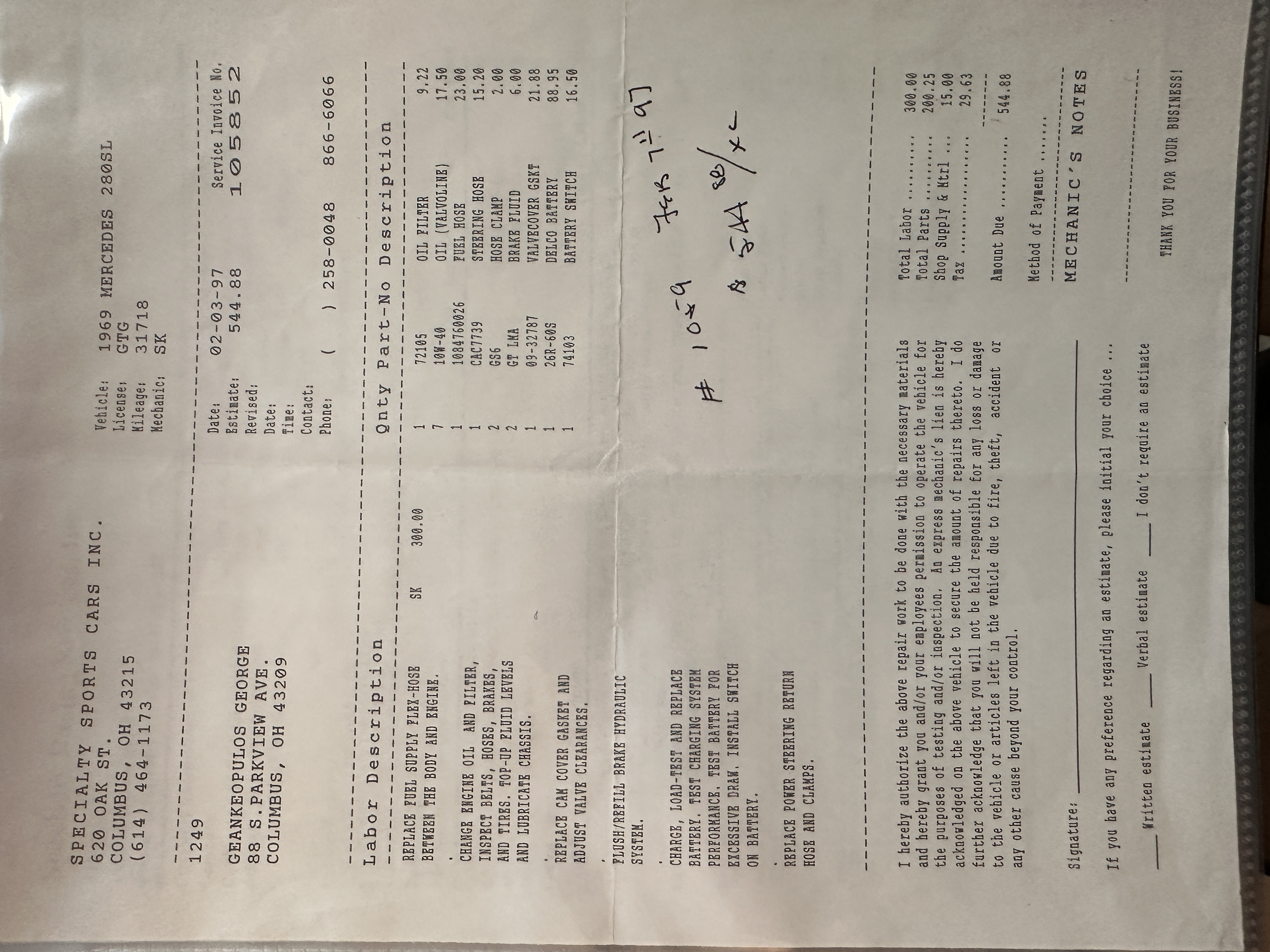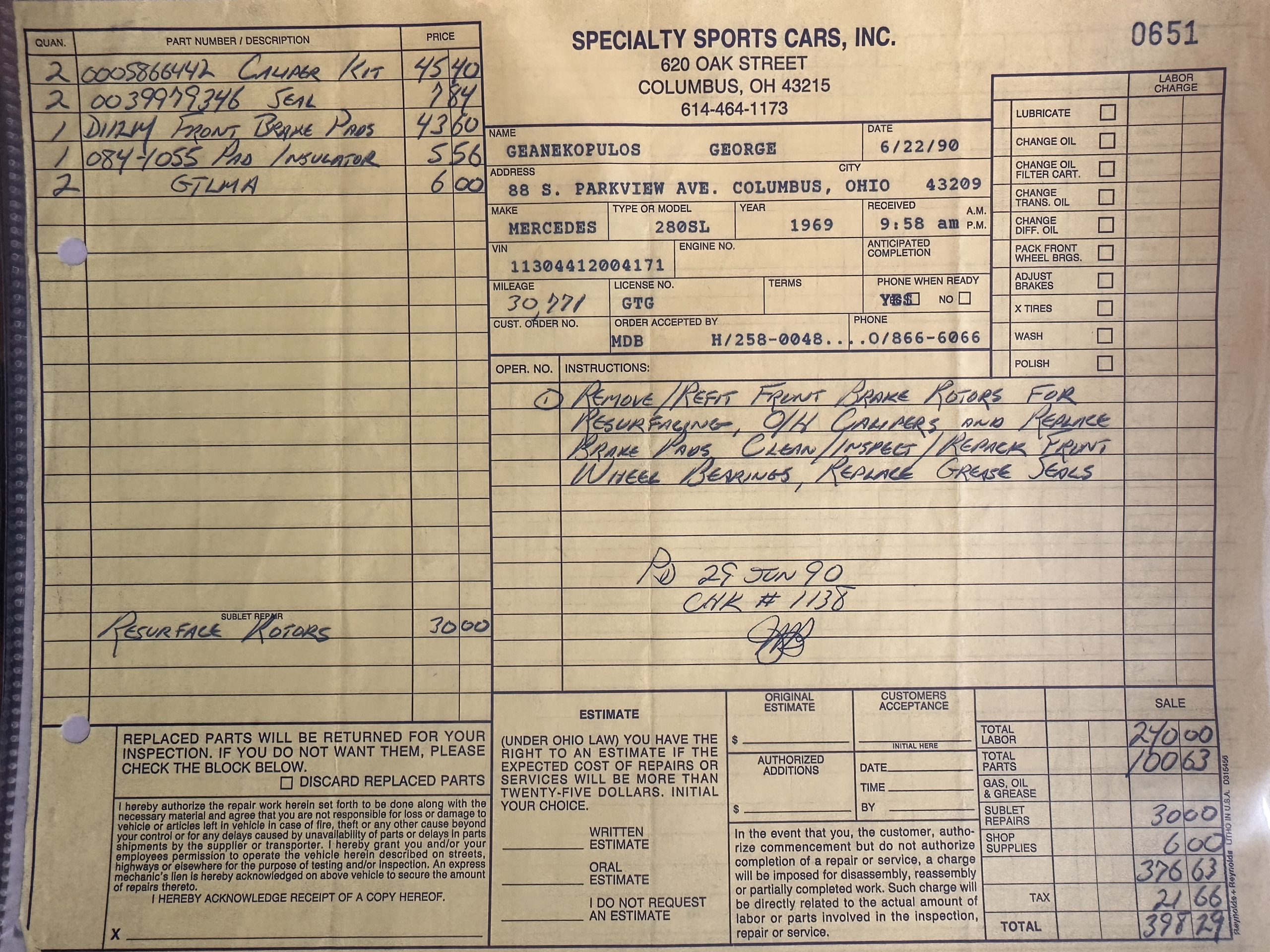 This 280SL was bought new on the 5th of November 1968 by Dr. George Geanekopulos from Ed Potter, Inc, the local Mercedes-Benz dealer in Columbus, OH.  Dr. George traded in his 1965 Mustang Convertible toward the purchase of the Mercedes.  Dr. George was a noted collector of cars and practiced dentistry in Columbus for 45 years.  He retained the 280SL within his collection for 50 years, until it was sold upon his passing on the 13th of October 2018.  It is now presented with 33,082 miles from new and nearly all original except one excellent repaint and normal service.