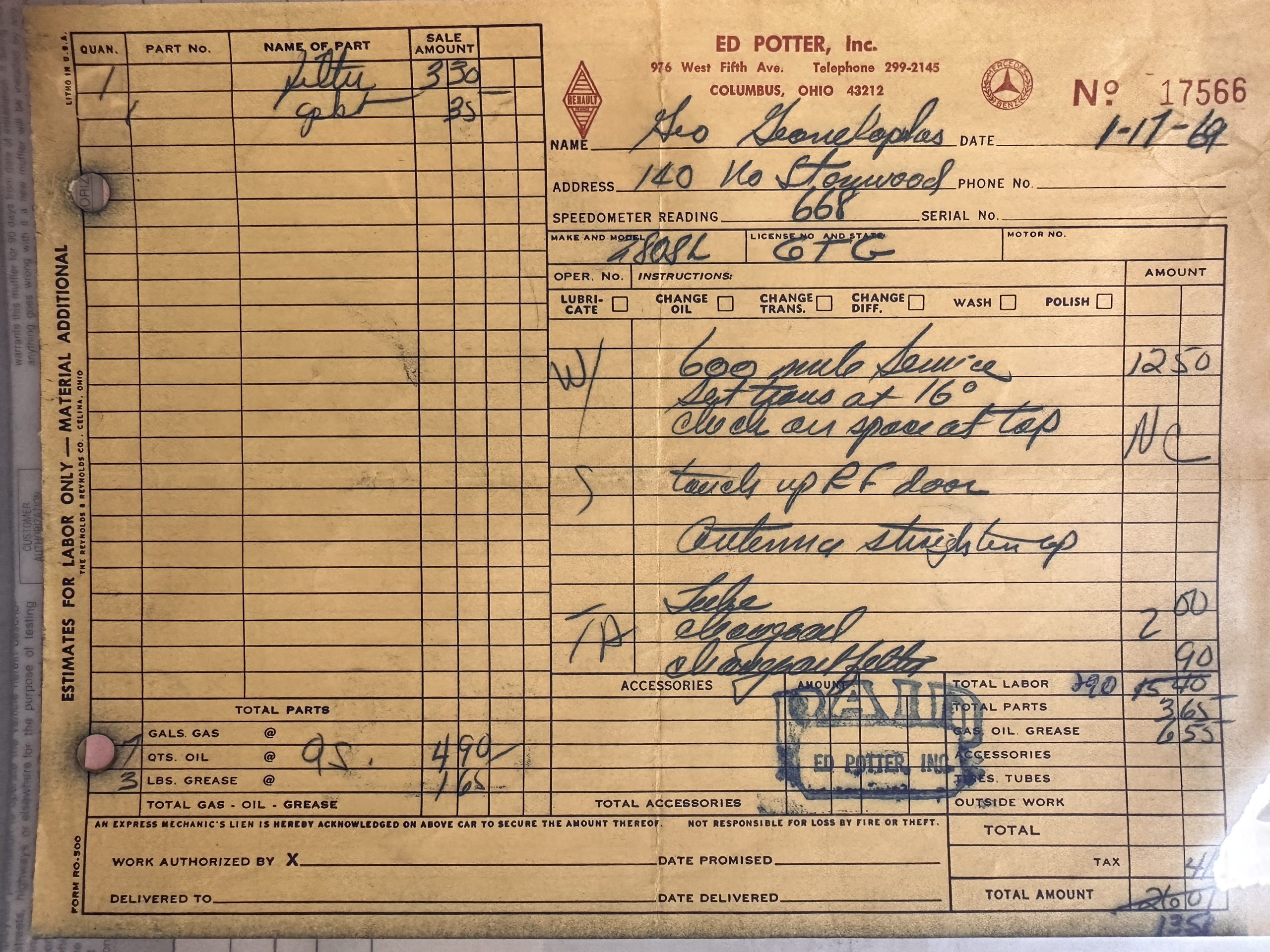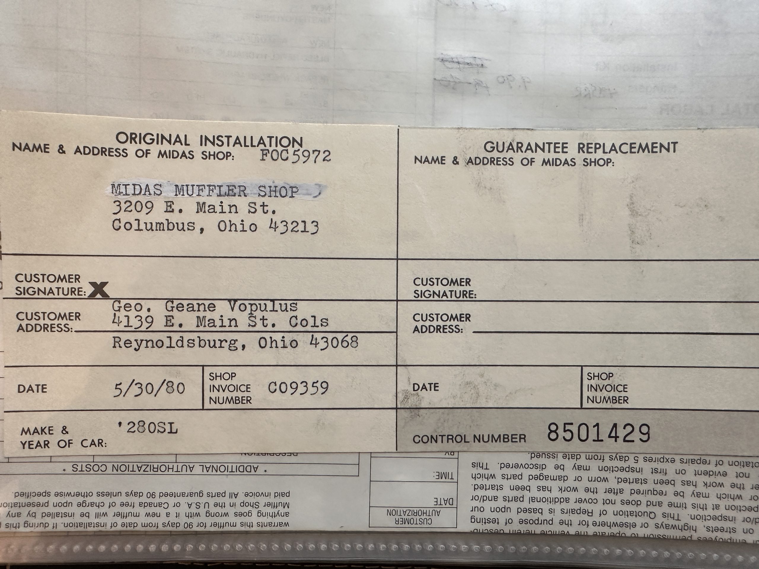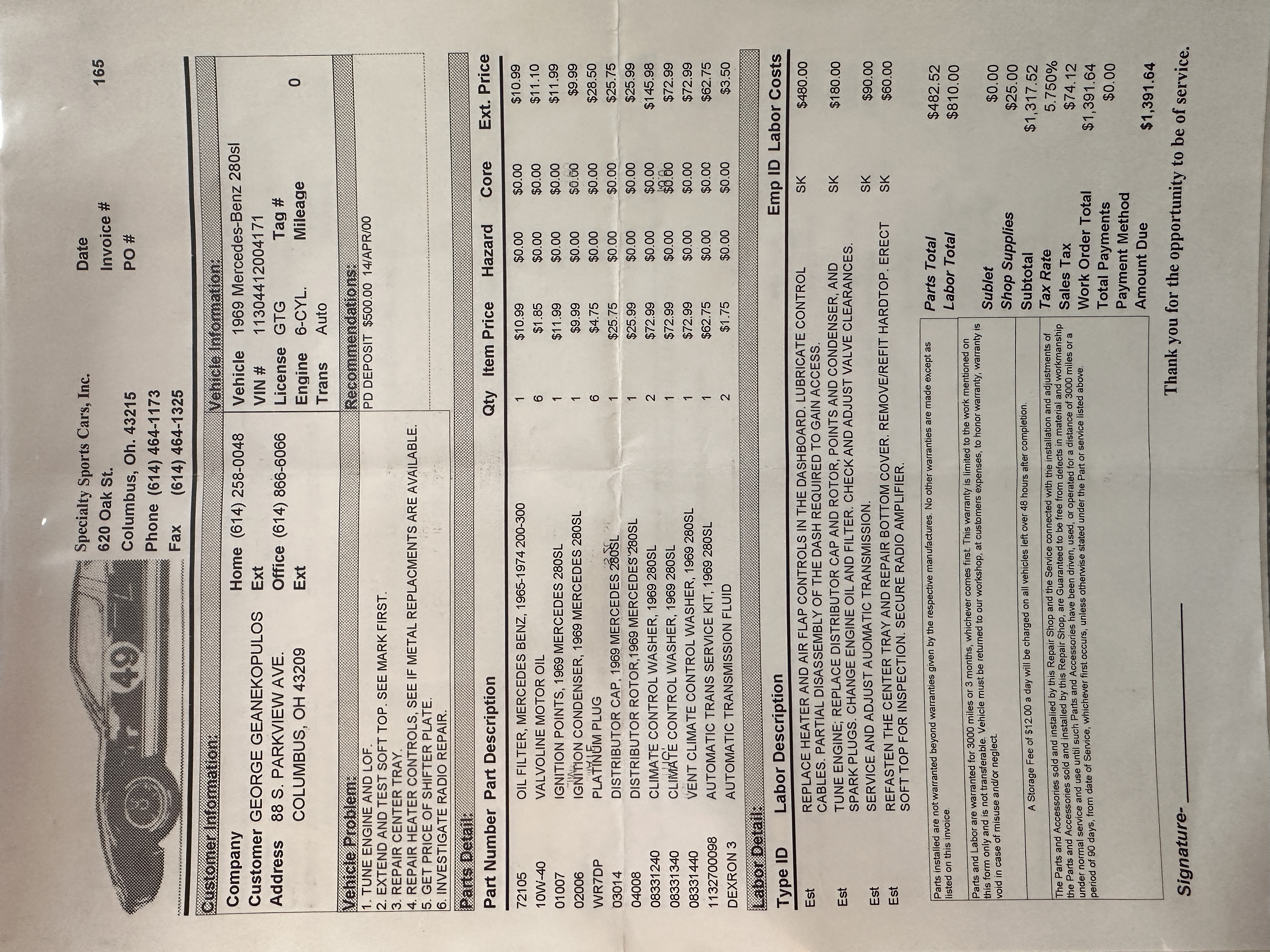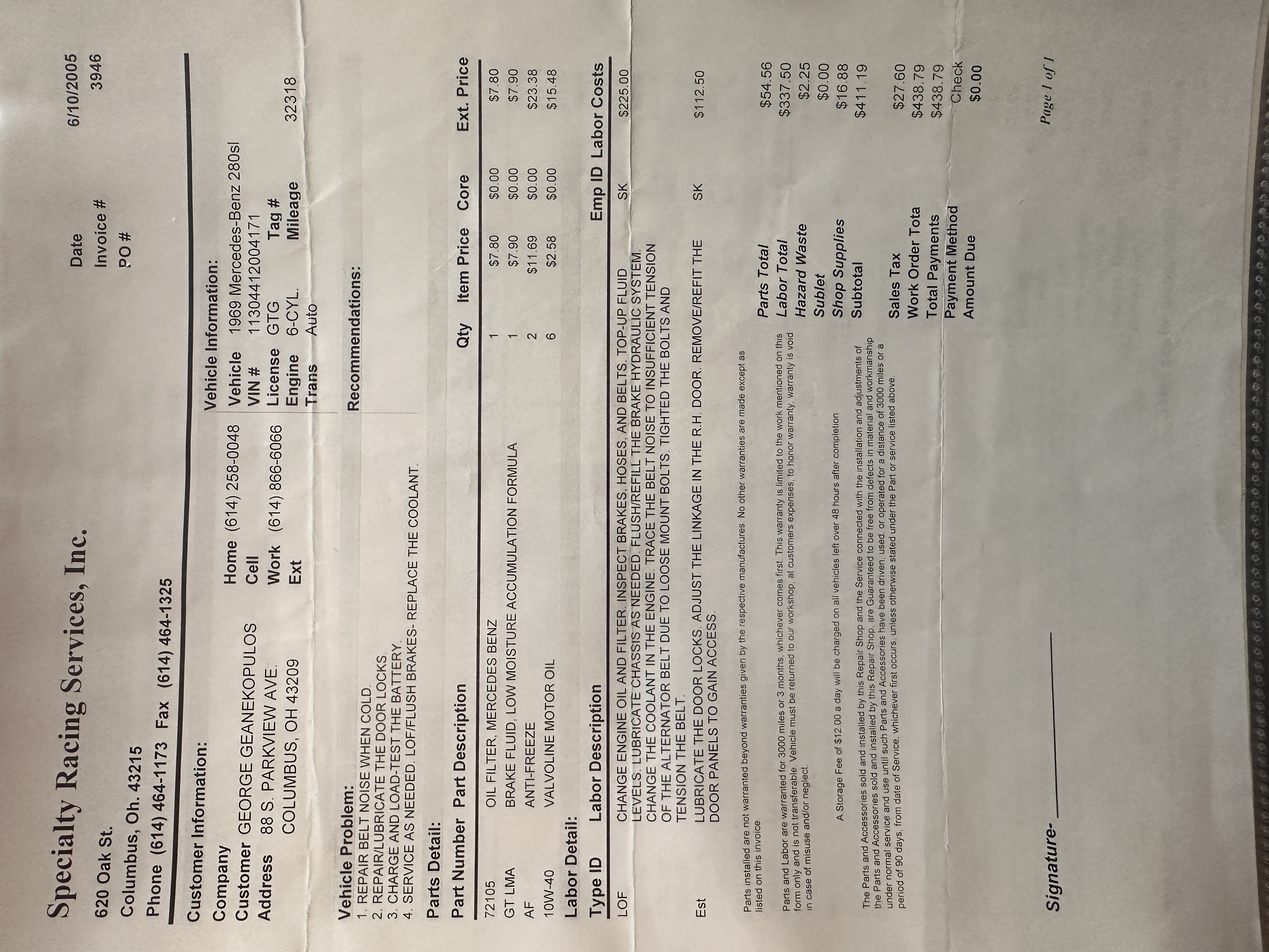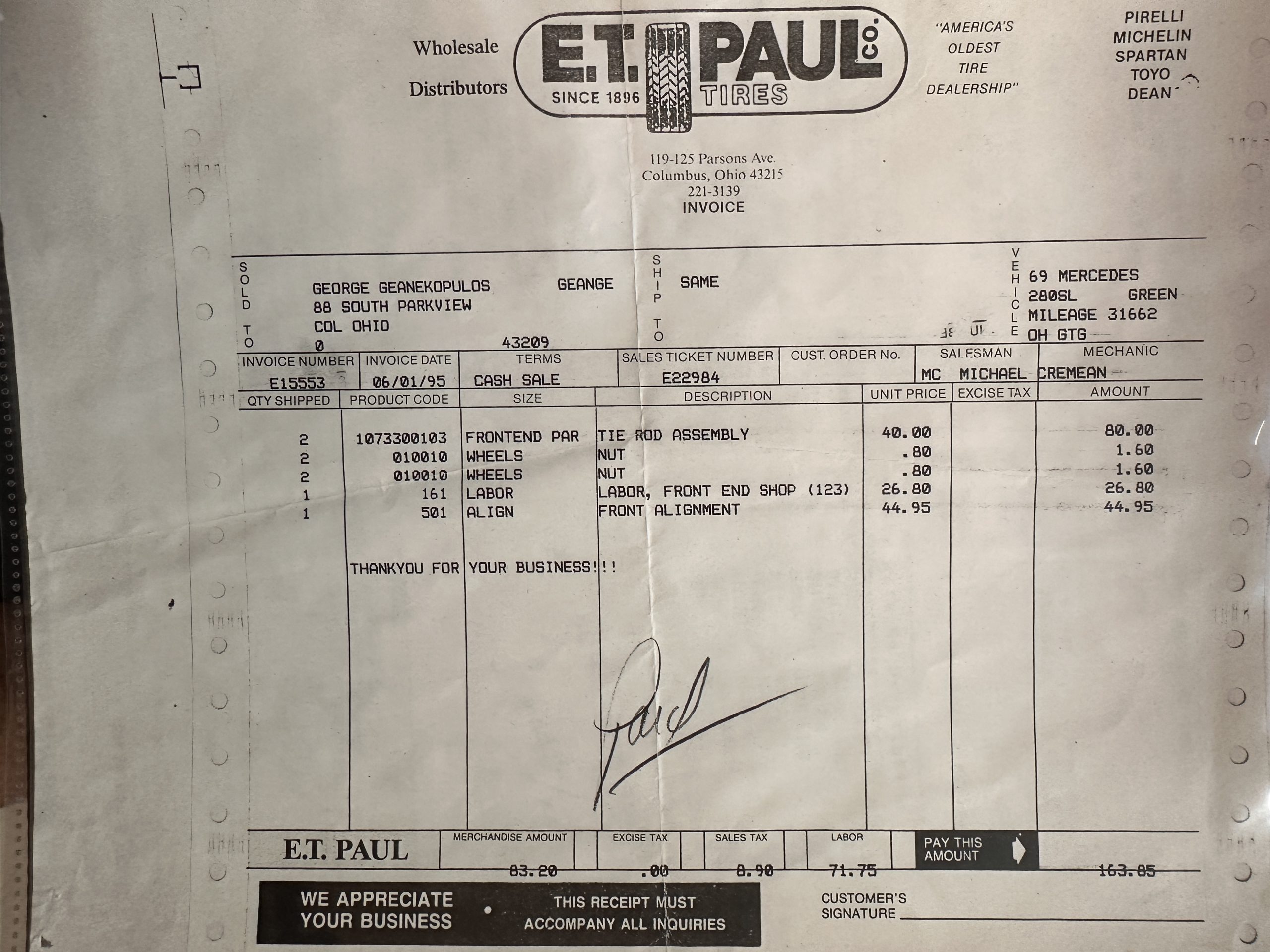 This 280SL was bought new on the 5th of November 1968 by Dr. George Geanekopulos from Ed Potter, Inc, the local Mercedes-Benz dealer in Columbus, OH.  Dr. George traded in his 1965 Mustang Convertible toward the purchase of the Mercedes.  Dr. George was a noted collector of cars and practiced dentistry in Columbus for 45 years.  He retained the 280SL within his collection for 50 years, until it was sold upon his passing on the 13th of October 2018.  It is now presented with 33,082 miles from new and nearly all original except one excellent repaint and normal service.