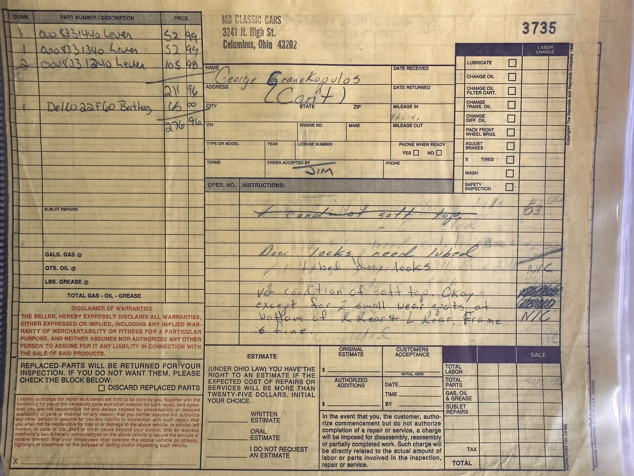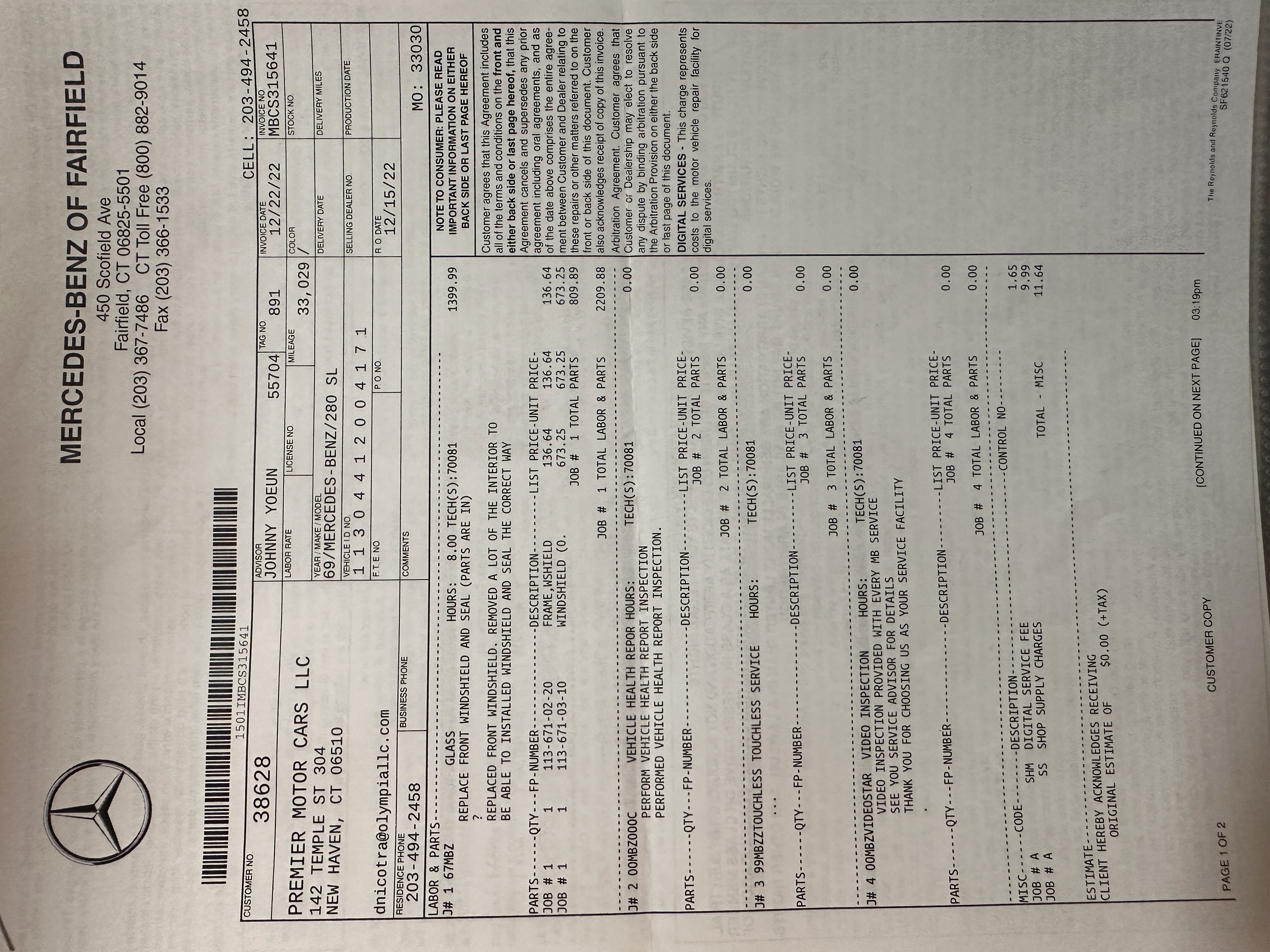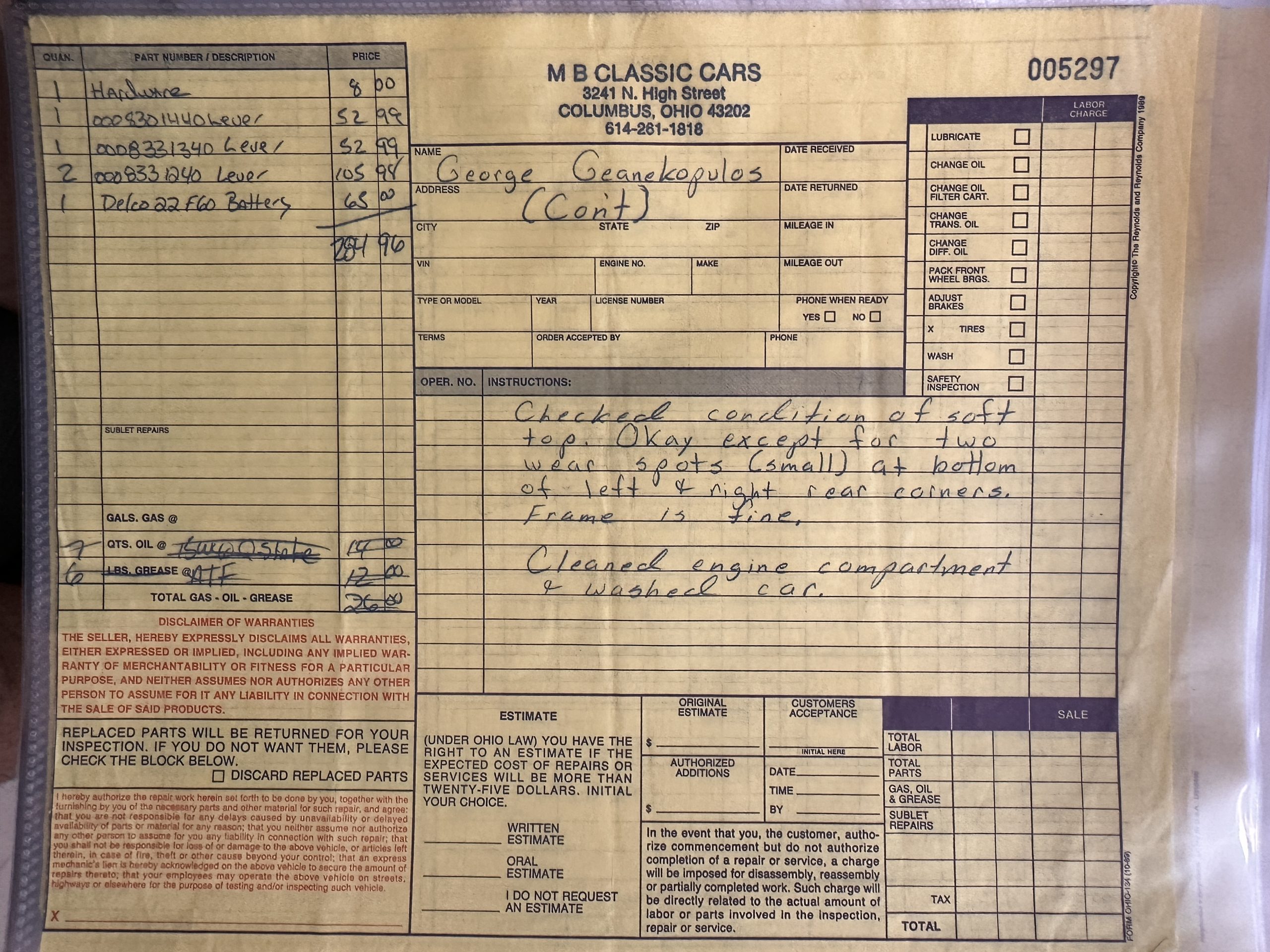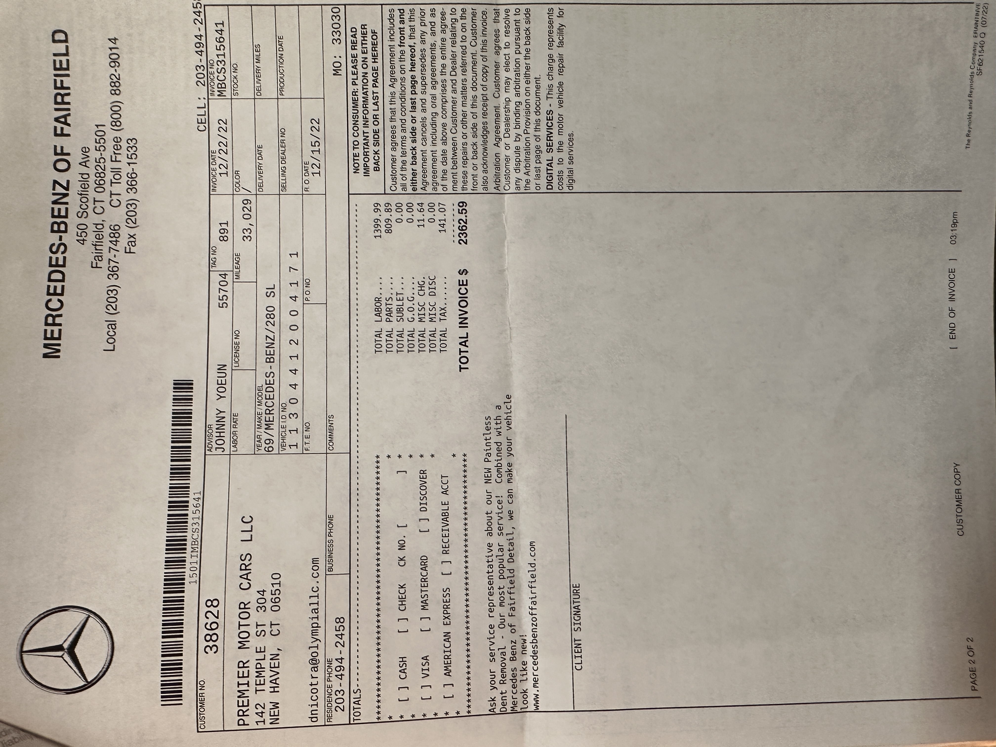 This 280SL was bought new on the 5th of November 1968 by Dr. George Geanekopulos from Ed Potter, Inc, the local Mercedes-Benz dealer in Columbus, OH.  Dr. George traded in his 1965 Mustang Convertible toward the purchase of the Mercedes.  Dr. George was a noted collector of cars and practiced dentistry in Columbus for 45 years.  He retained the 280SL within his collection for 50 years, until it was sold upon his passing on the 13th of October 2018.  It is now presented with 33,082 miles from new and nearly all original except one excellent repaint and normal service.