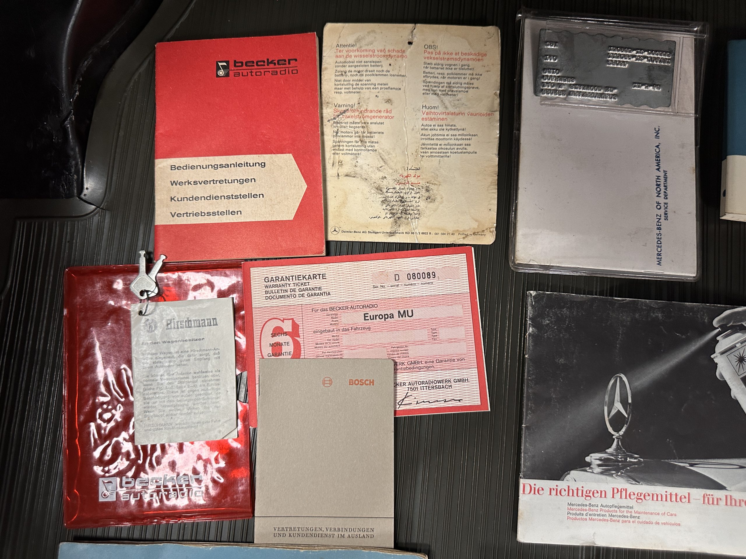 This 280SL comes complete with all of its pristine original tools in the correct original tool roll, its original owner’s manuals, original service booklet with aluminum data plate showing Dr. George as its owner, original warranty card, factory data card, original Kangol seat-belt instructions, the original window sticker and sales invoice and a stack of receipts from new.  As an investment grade Pagoda, this is very well documented in all respects.