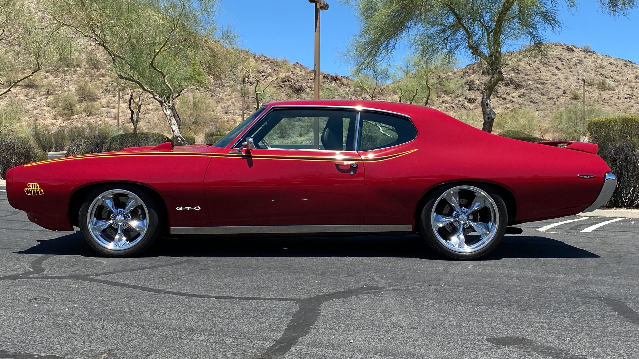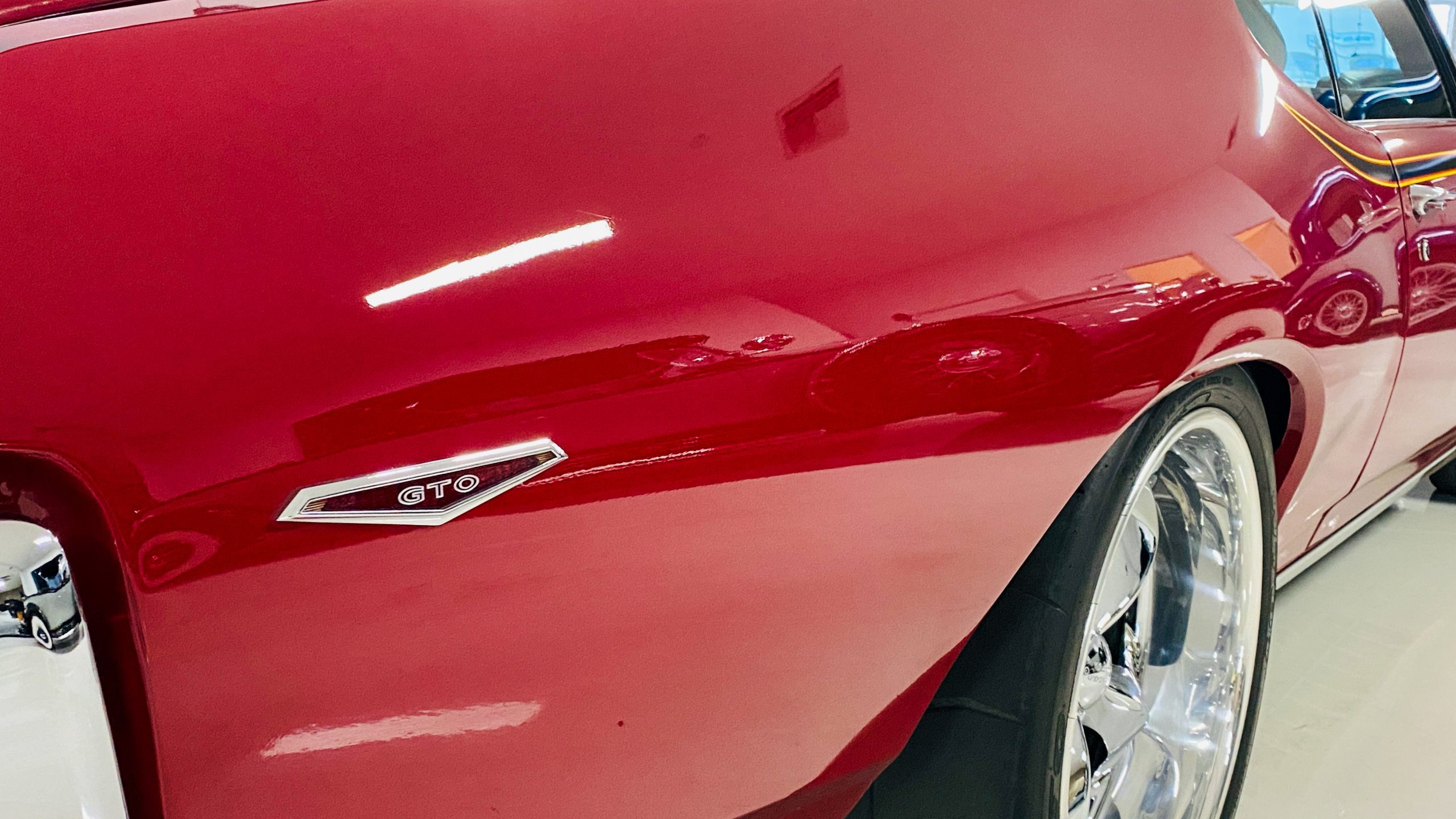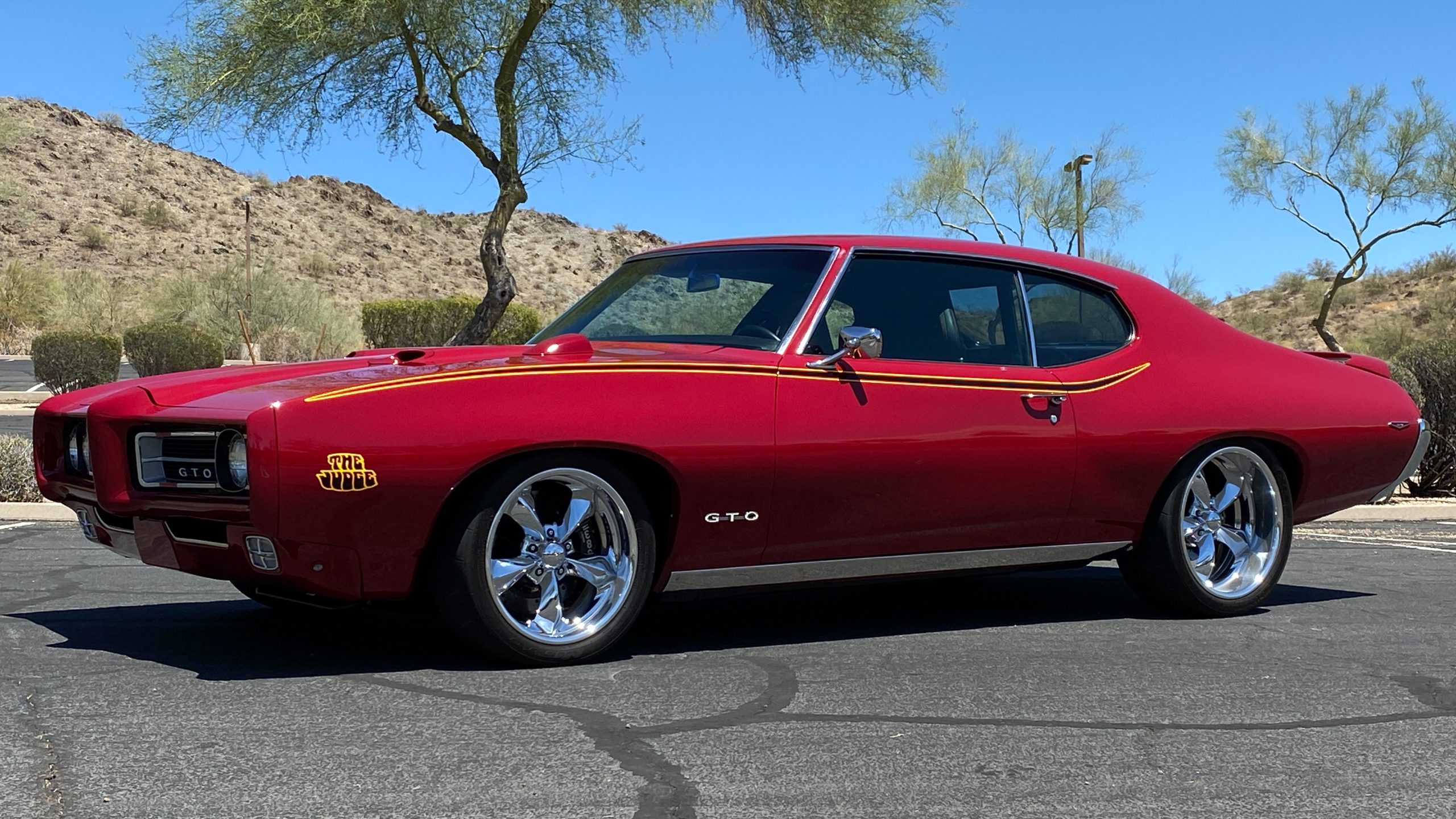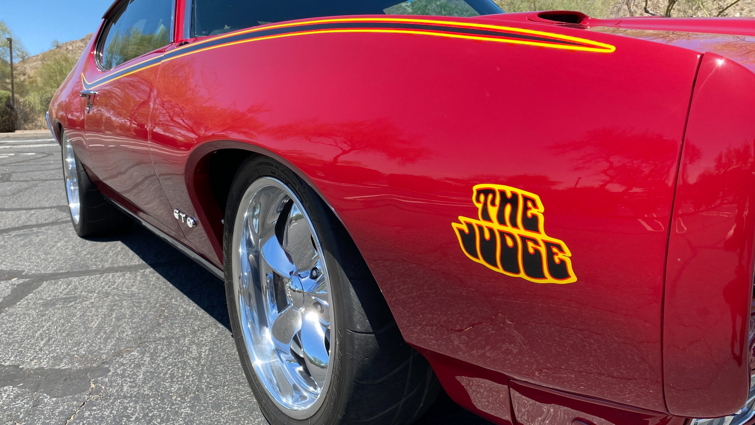 Refinished in sporty Matador Red paint, the quality of the paint is near flawless with an incredible depth and clarity. The ceramic coat over the clear coat makes this unique red hue really shine, while keeping the quality of the paint as maintenance-free as possible. This tribute has all of the expected physical trademarks of a GTO Judge. These include the brand new and correct “Judge” vinyl graphics, Judge badges, and the painted high rear deck spoiler. The endura front bumper fits beautifully and enthusiasts will love the working hood mounted tachometer. Other tasteful upgrades to the exterior include tinted glass all the way around, custom billet door handles, American Racing chrome alloy wheels with wide Nitto high performance tires.