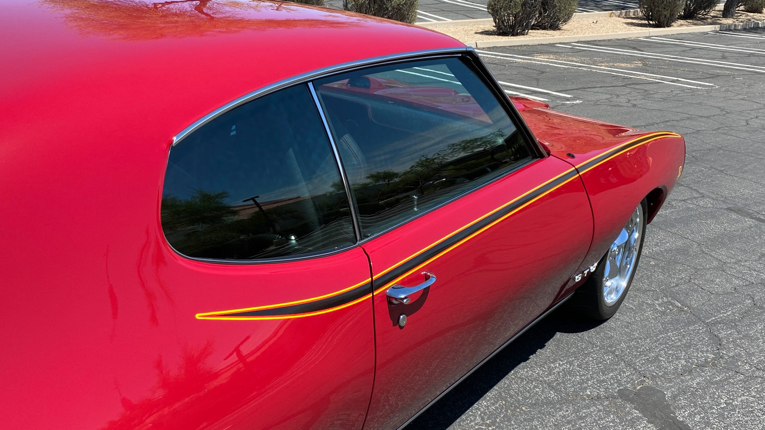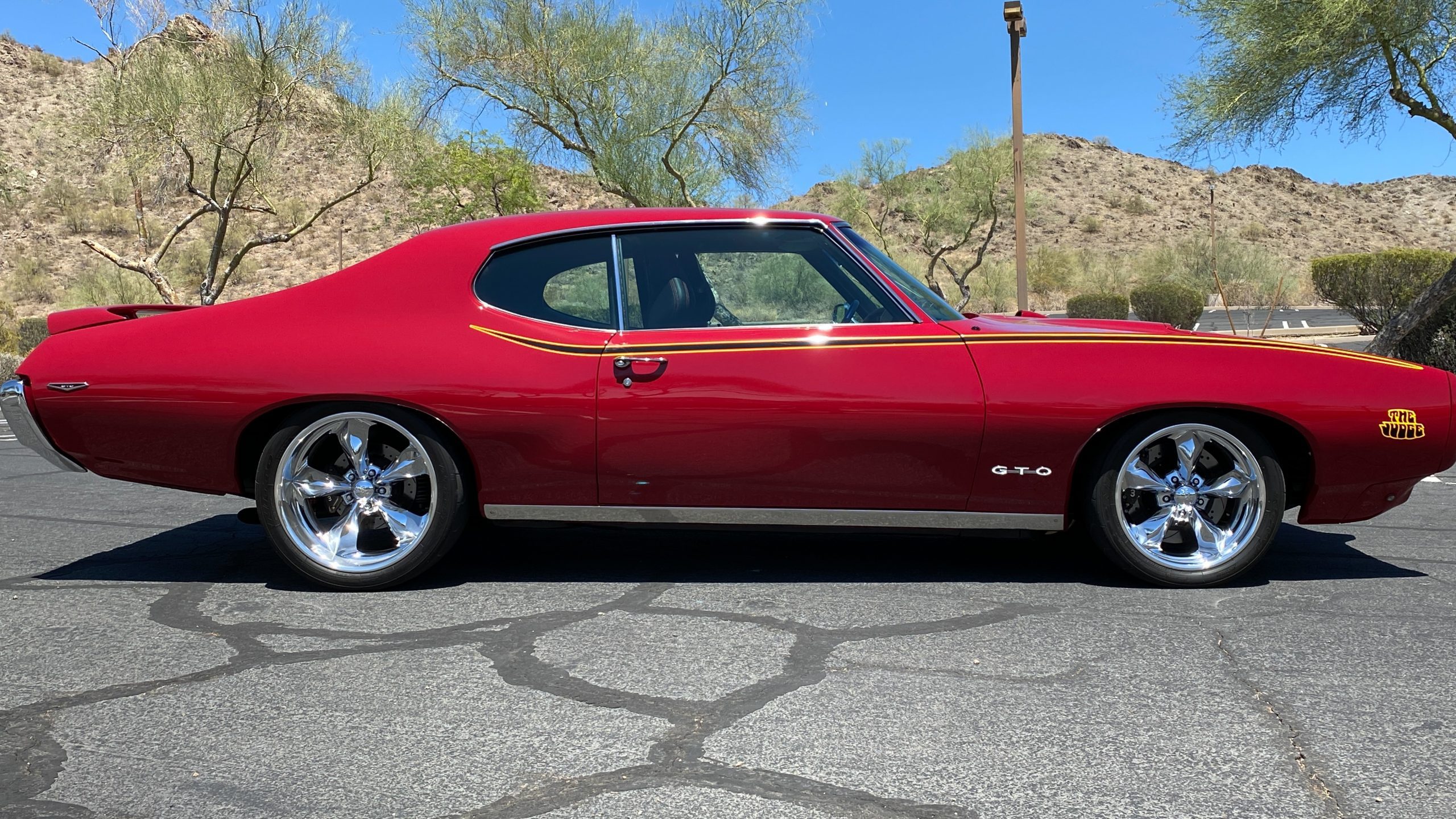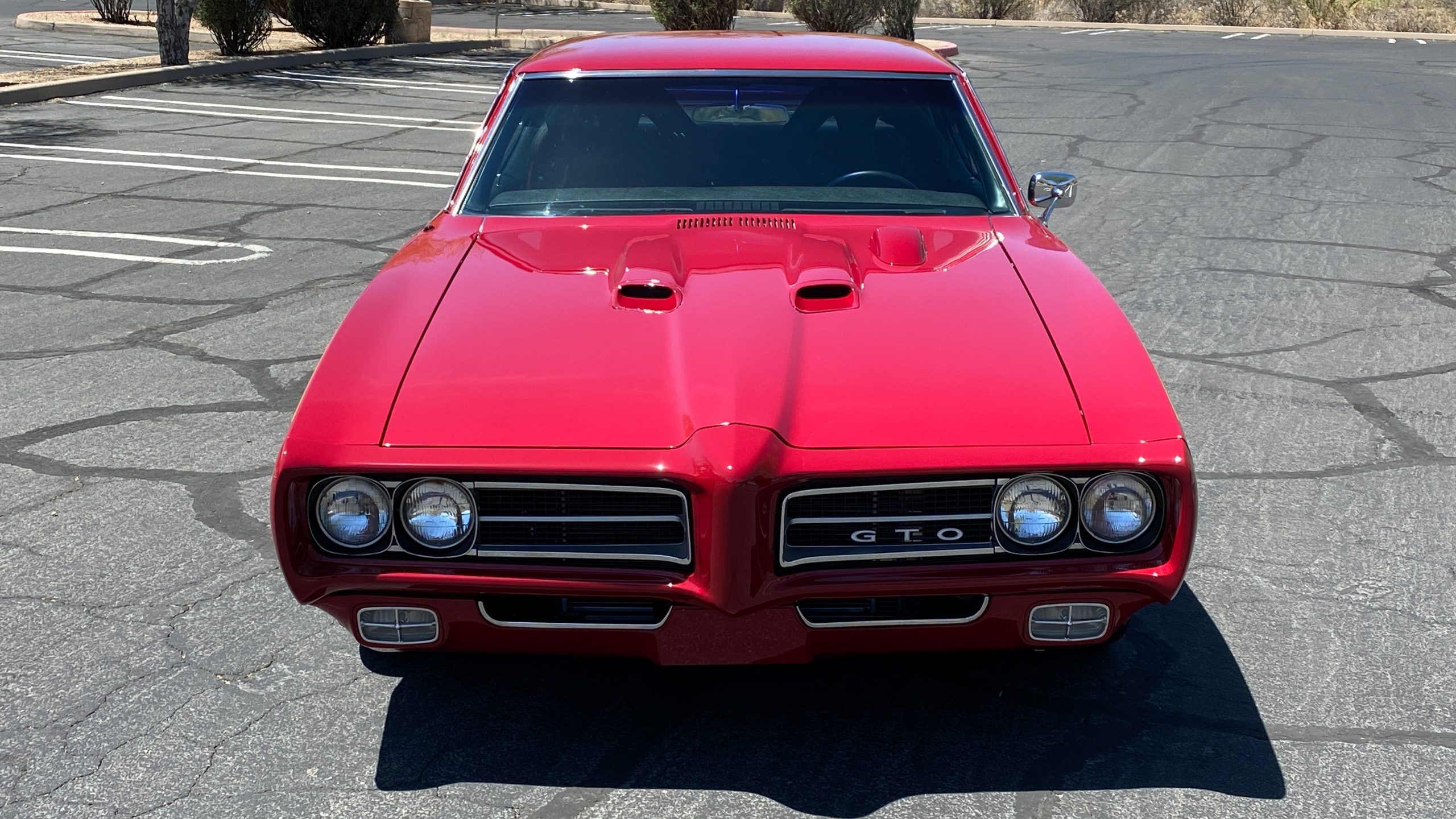 Refinished in sporty Matador Red paint, the quality of the paint is near flawless with an incredible depth and clarity. The ceramic coat over the clear coat makes this unique red hue really shine, while keeping the quality of the paint as maintenance-free as possible. This tribute has all of the expected physical trademarks of a GTO Judge. These include the brand new and correct “Judge” vinyl graphics, Judge badges, and the painted high rear deck spoiler. The endura front bumper fits beautifully and enthusiasts will love the working hood mounted tachometer. Other tasteful upgrades to the exterior include tinted glass all the way around, custom billet door handles, American Racing chrome alloy wheels with wide Nitto high performance tires.