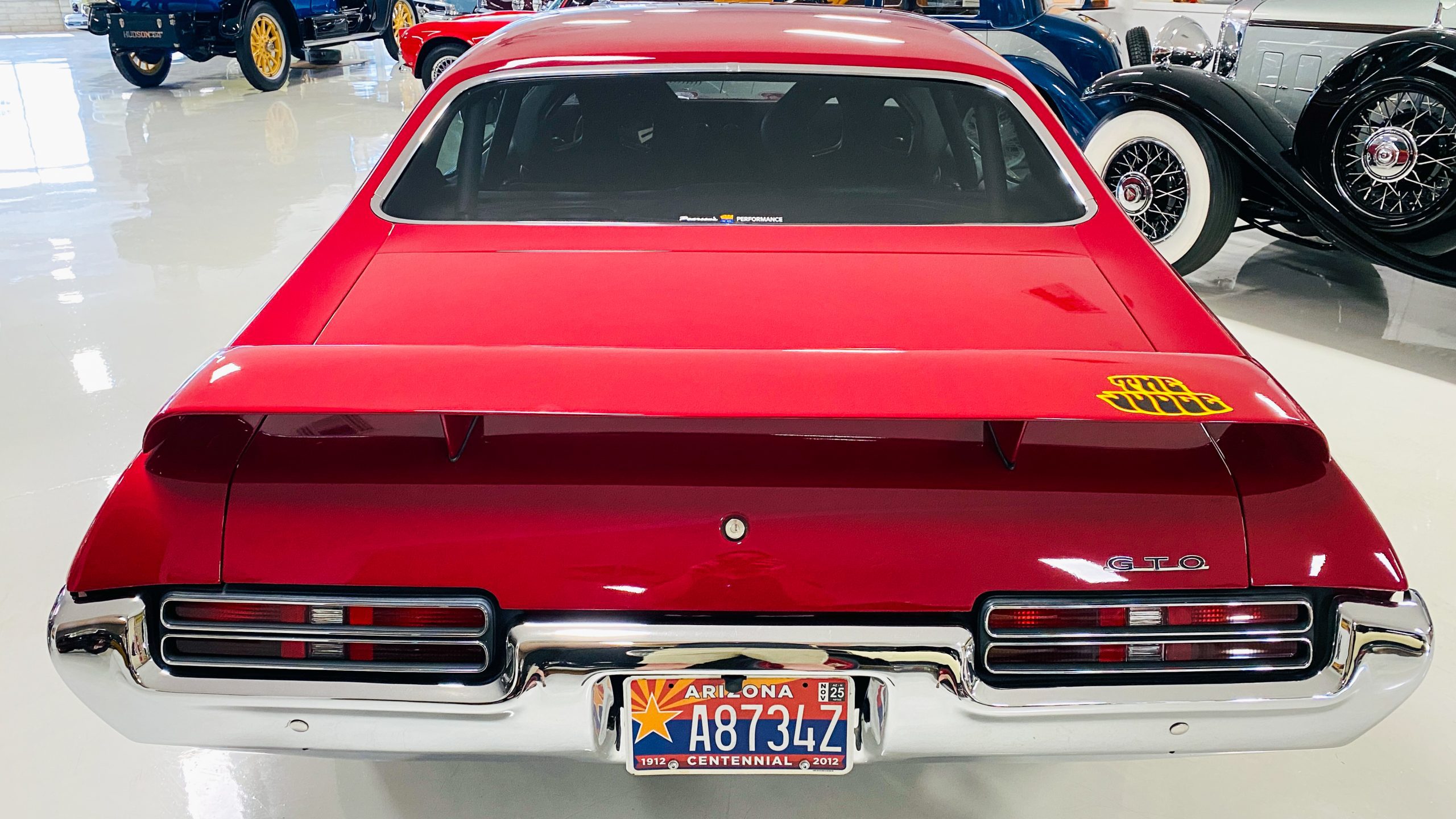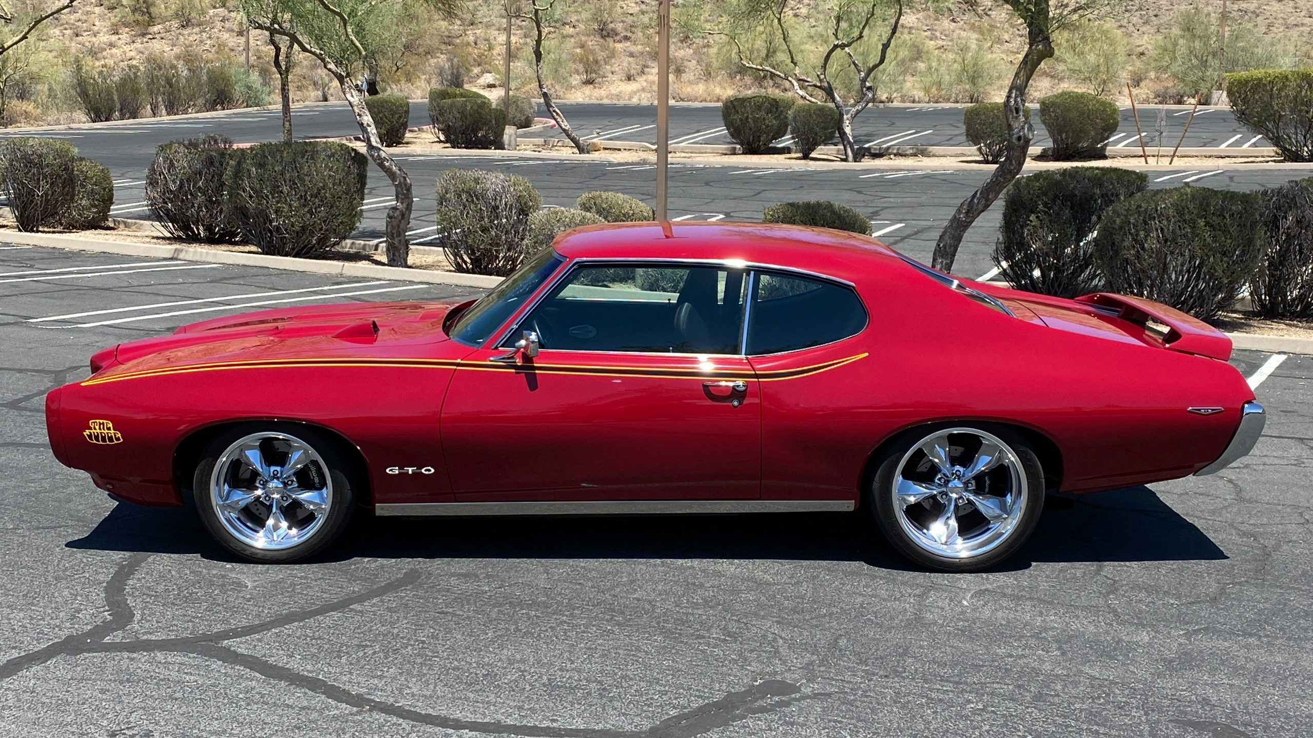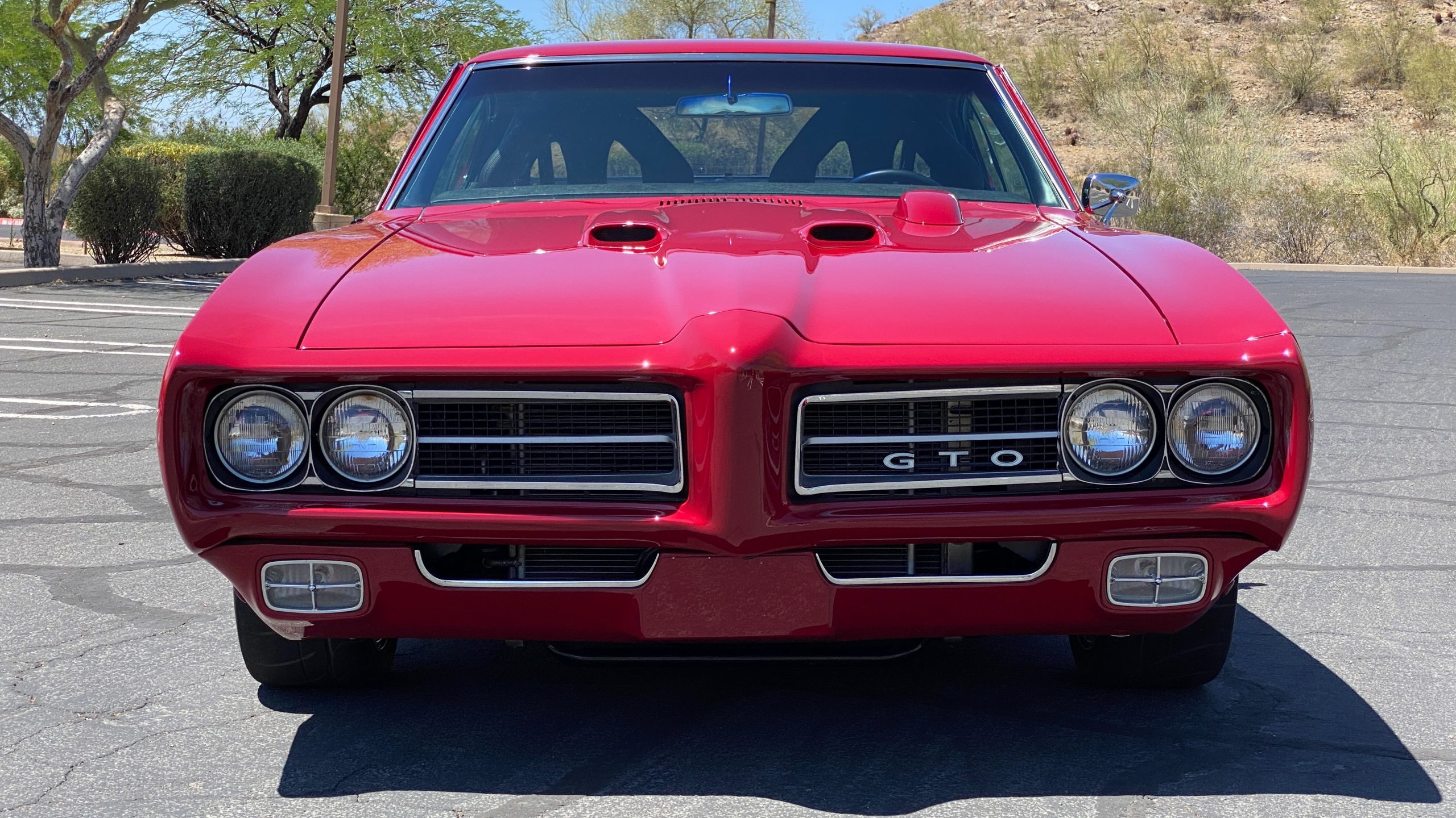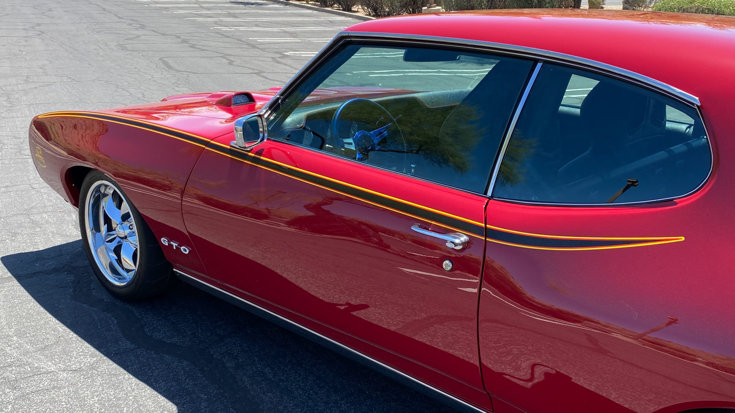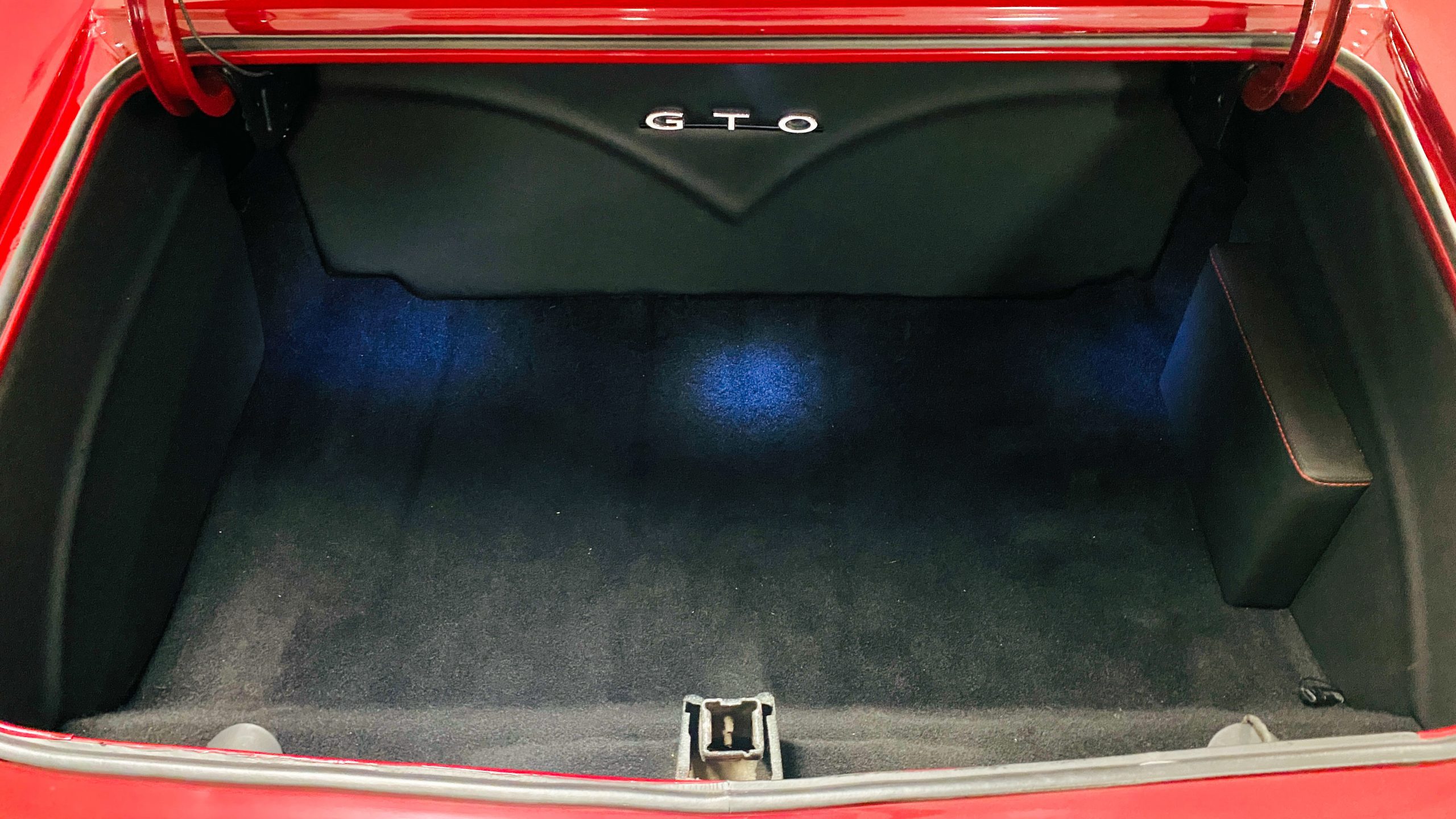 A custom built six point roll-bar all allude to the power and performance that awaits the driver in the engine bay. Added amenities include a Vintage Air AC system, custom molded and designed center console, and a full size Pioneer audio/video head unit with JL Audio speakers. The driver will also notice the AutoMeter white face gauges and Ididit steering column. One item that won’t be noticed, but is a welcome addition is the Dynamat heat and sound insulation layered throughout the car. Opening the trunk, you’ll notice the custom finished trunk with GTO badge.