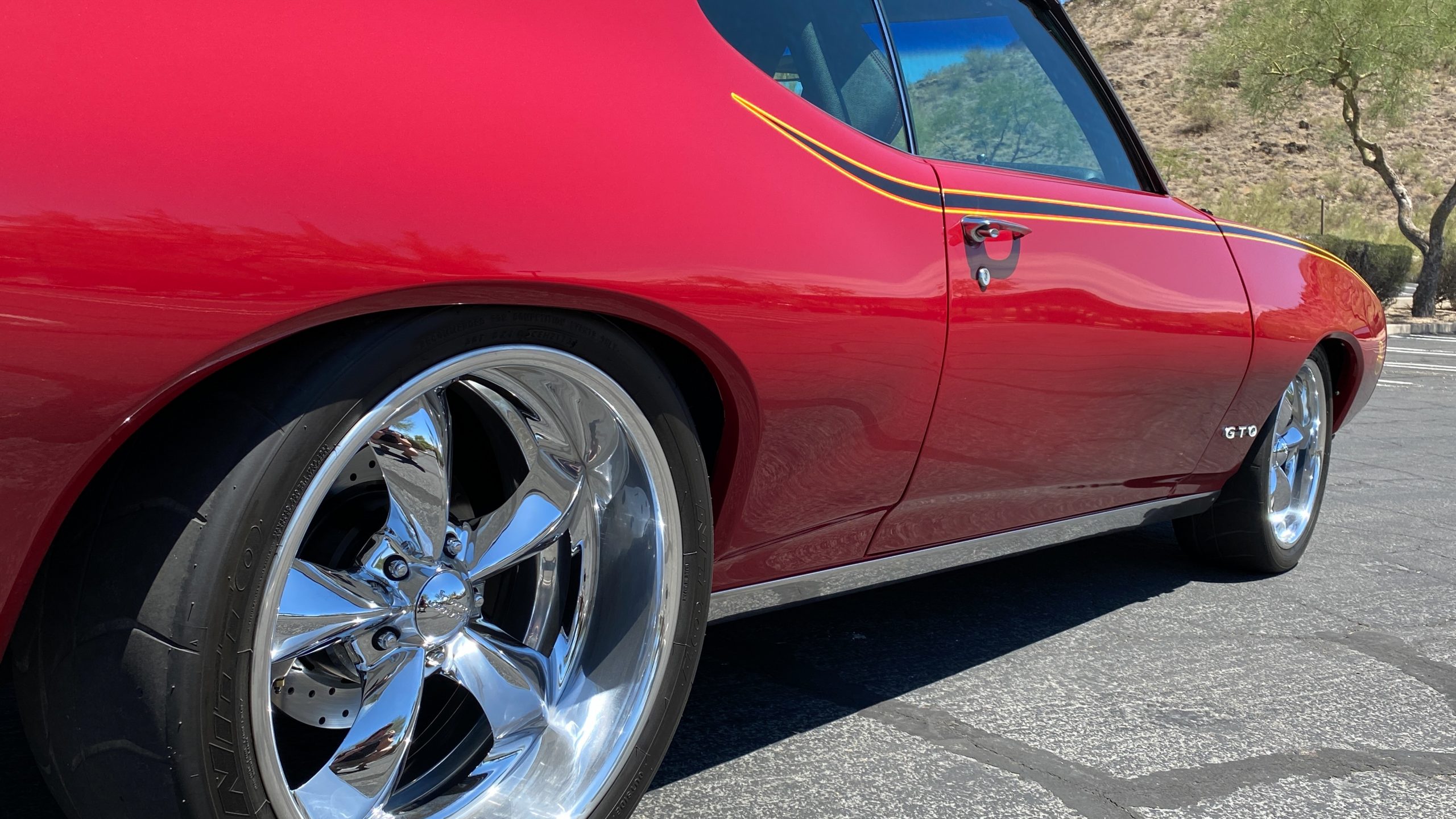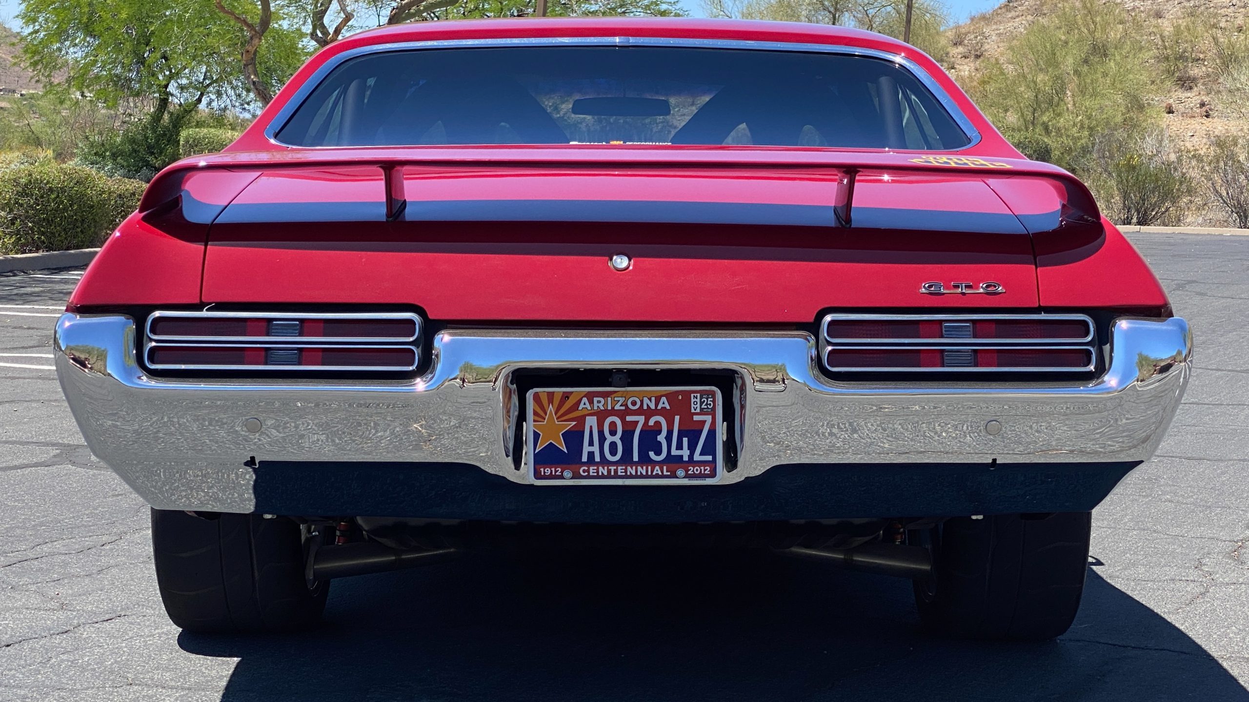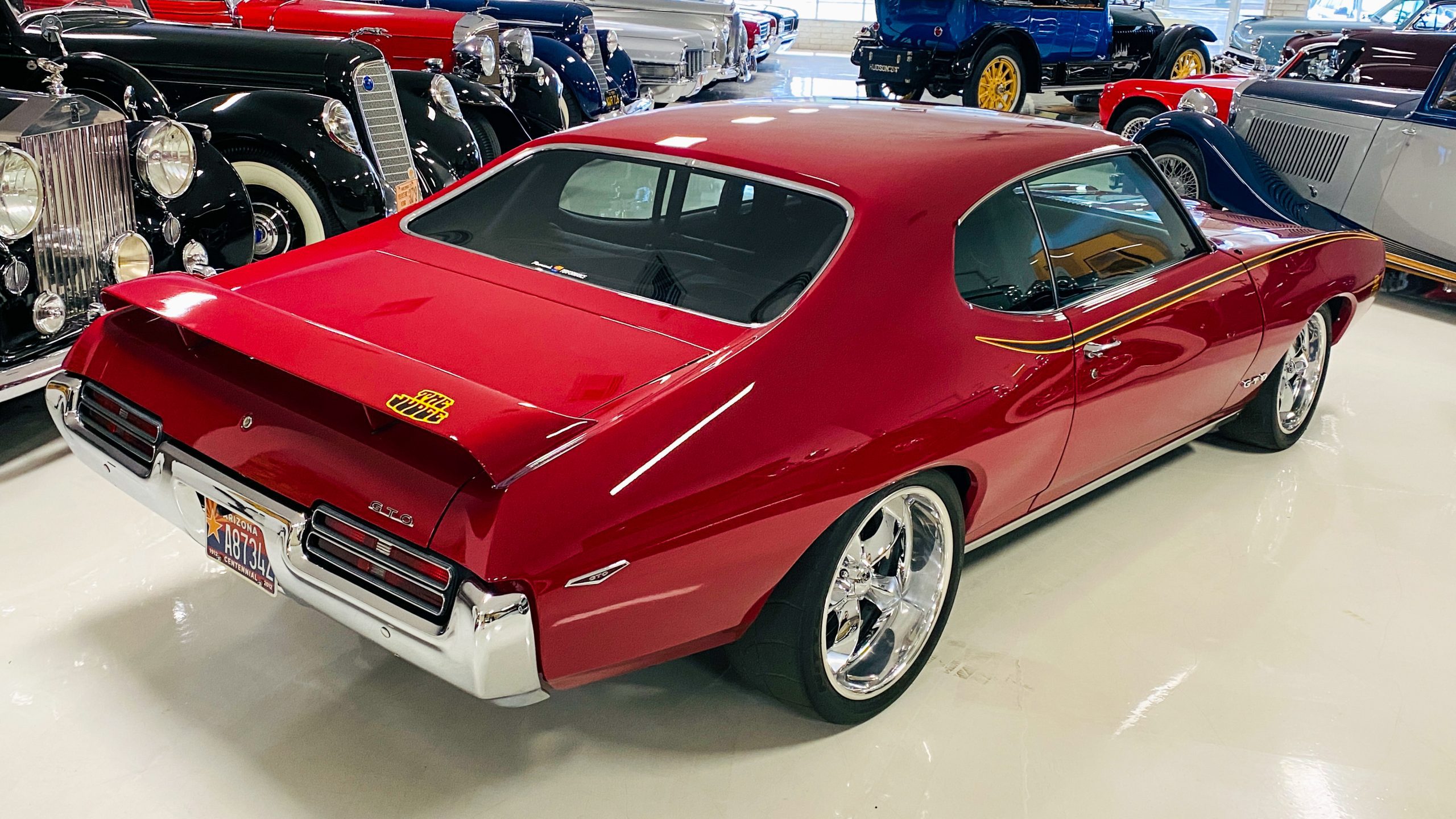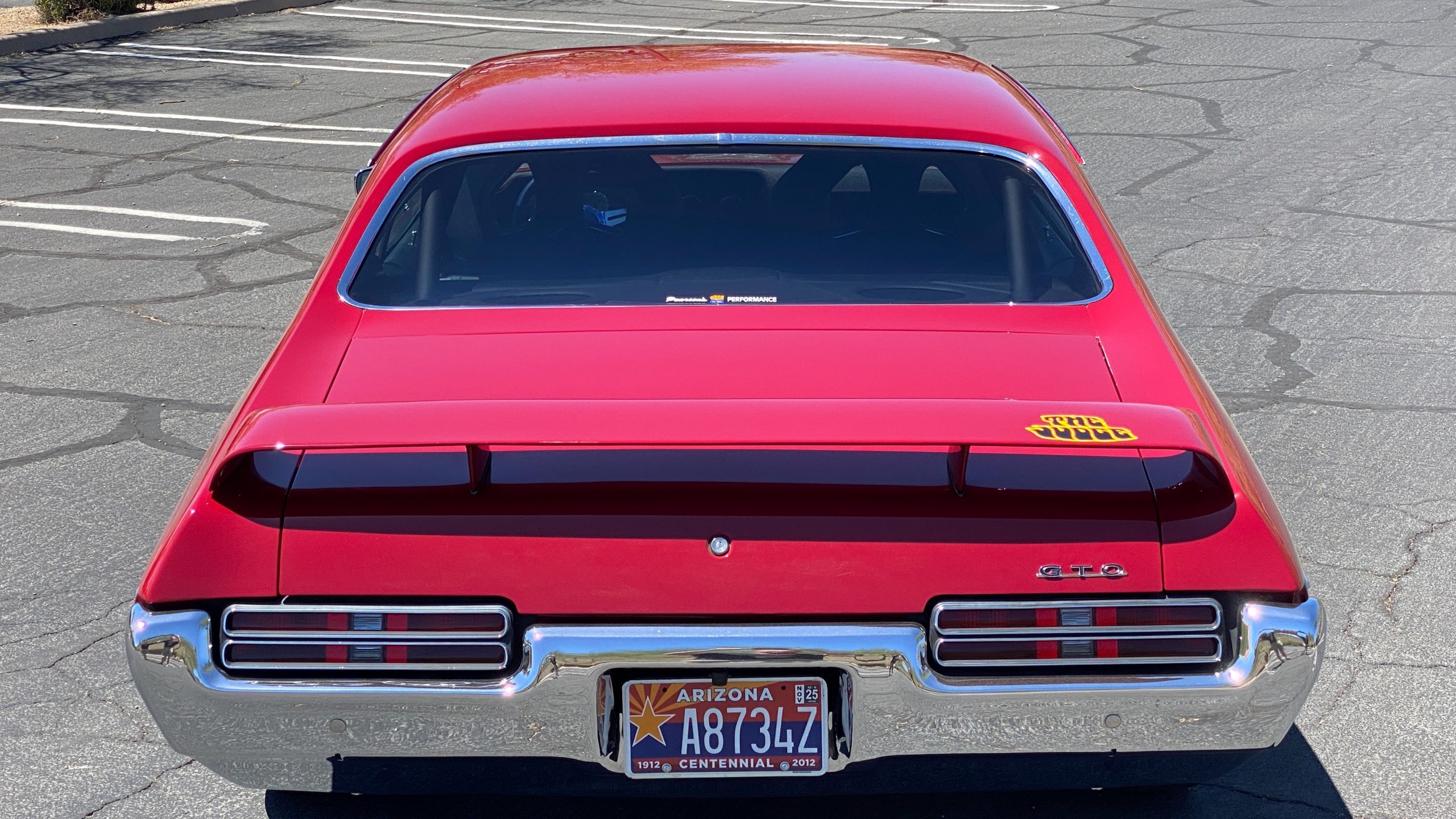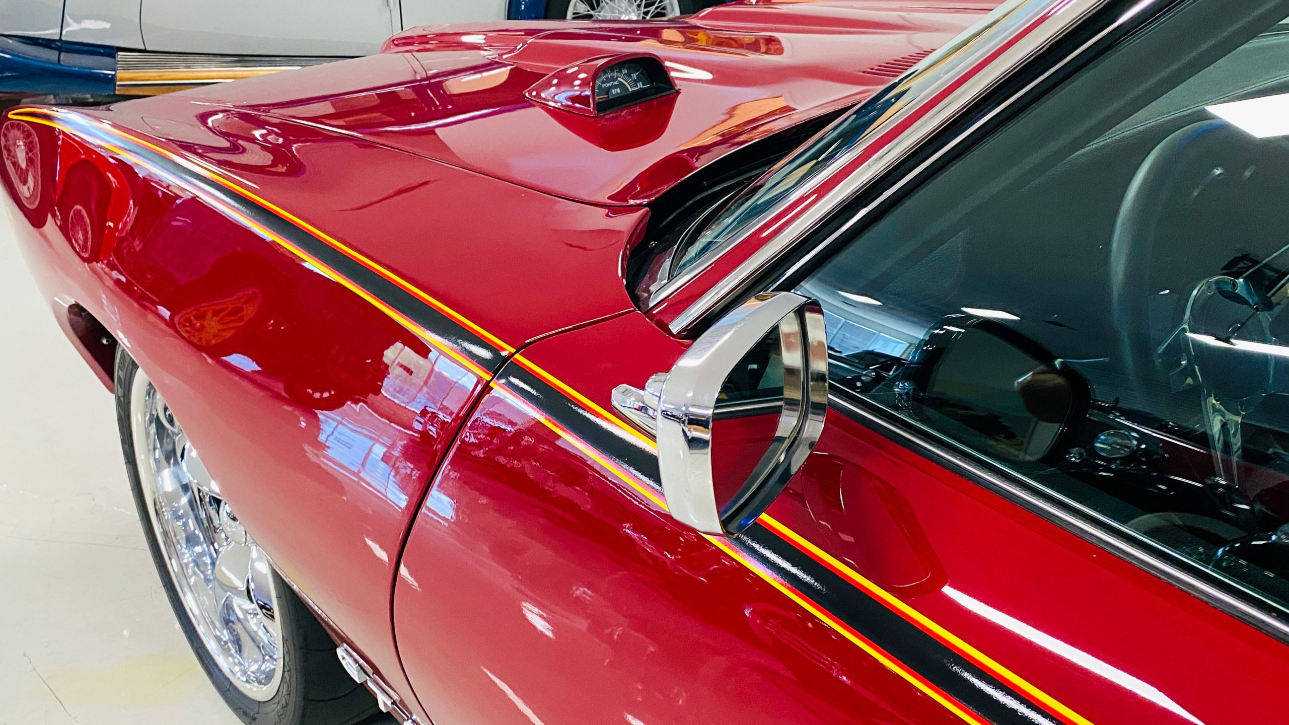 A custom built six point roll-bar all allude to the power and performance that awaits the driver in the engine bay. Added amenities include a Vintage Air AC system, custom molded and designed center console, and a full size Pioneer audio/video head unit with JL Audio speakers. The driver will also notice the AutoMeter white face gauges and Ididit steering column. One item that won’t be noticed, but is a welcome addition is the Dynamat heat and sound insulation layered throughout the car. Opening the trunk, you’ll notice the custom finished trunk with GTO badge.