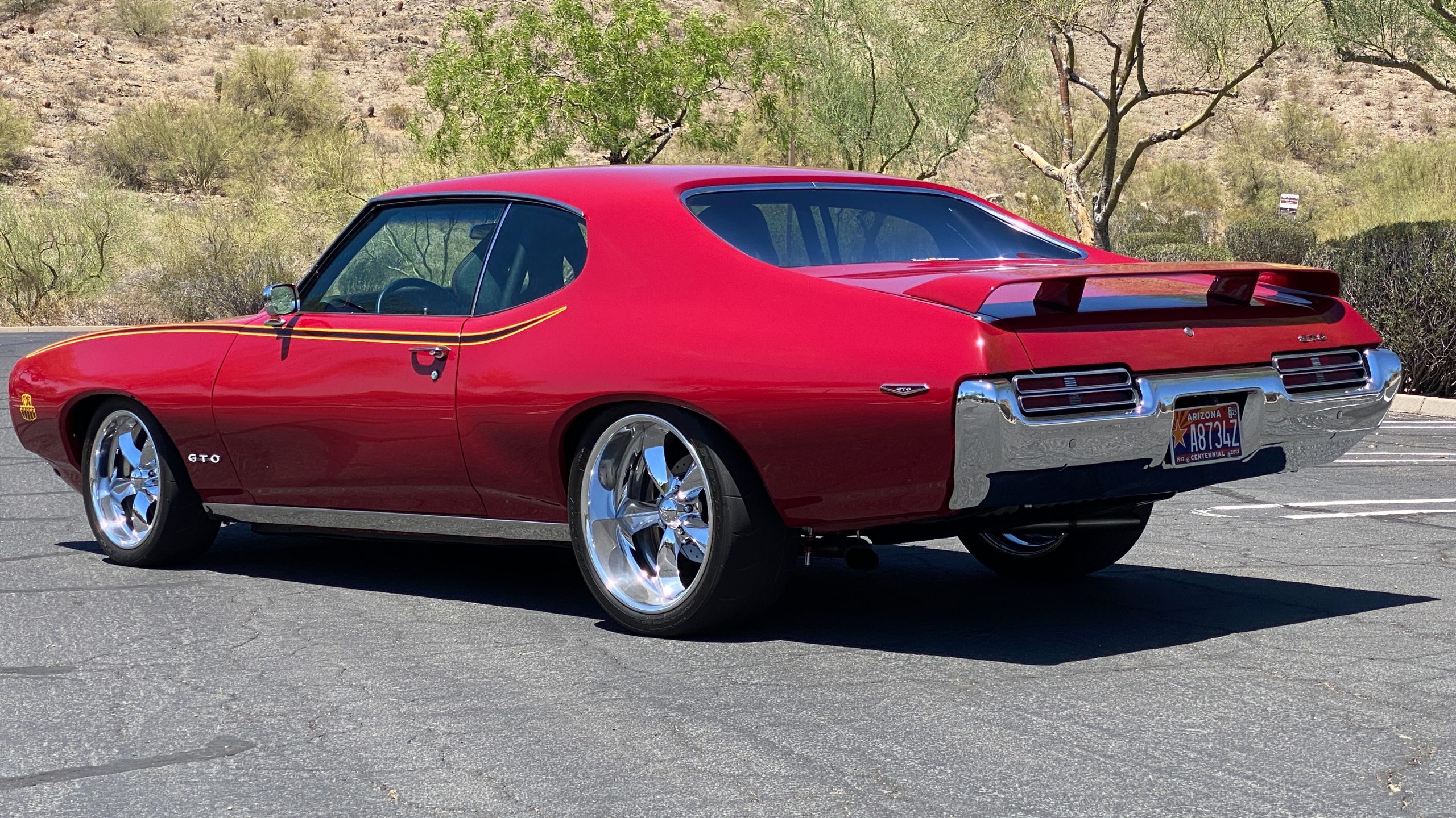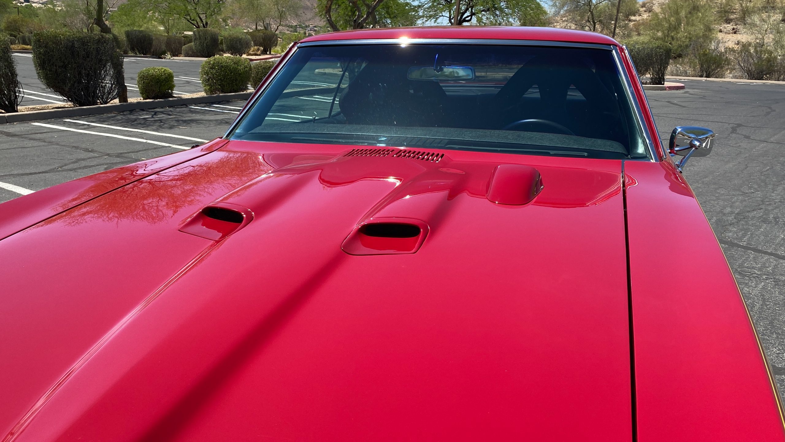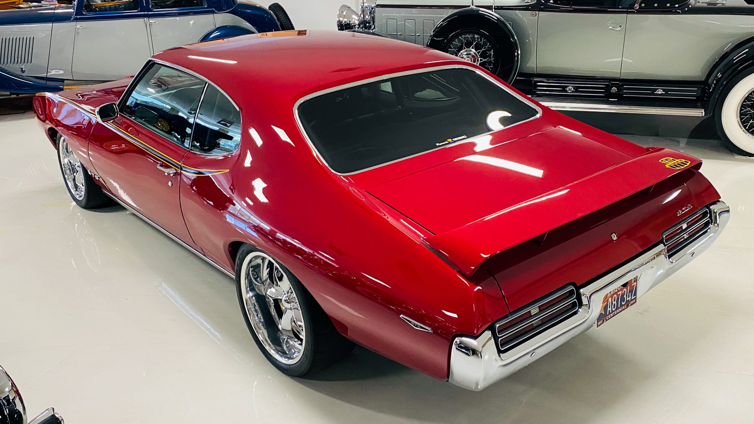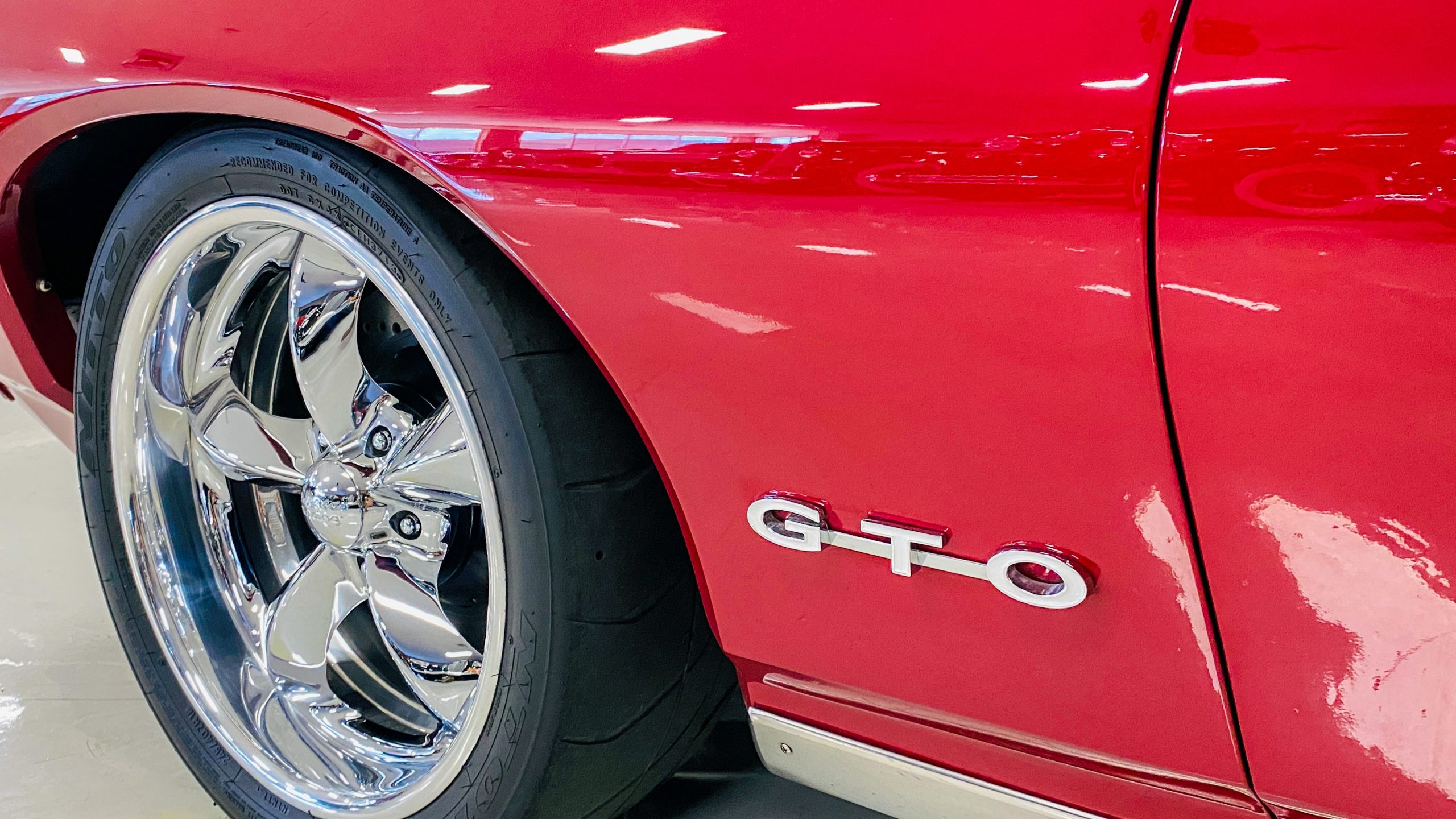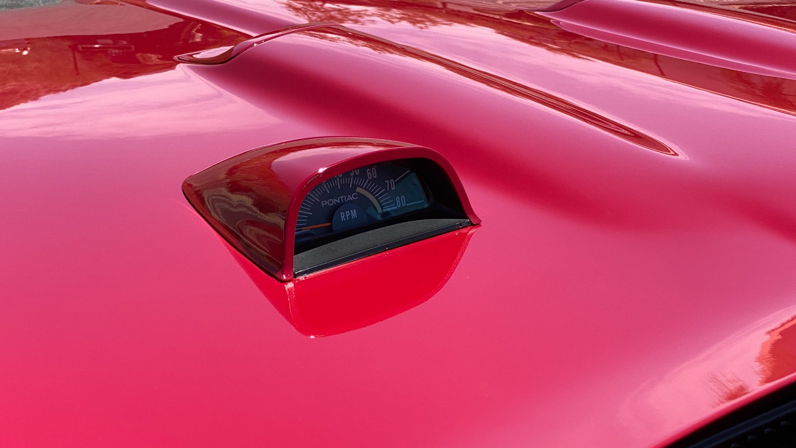 A custom built six point roll-bar all allude to the power and performance that awaits the driver in the engine bay. Added amenities include a Vintage Air AC system, custom molded and designed center console, and a full size Pioneer audio/video head unit with JL Audio speakers. The driver will also notice the AutoMeter white face gauges and Ididit steering column. One item that won’t be noticed, but is a welcome addition is the Dynamat heat and sound insulation layered throughout the car. Opening the trunk, you’ll notice the custom finished trunk with GTO badge.