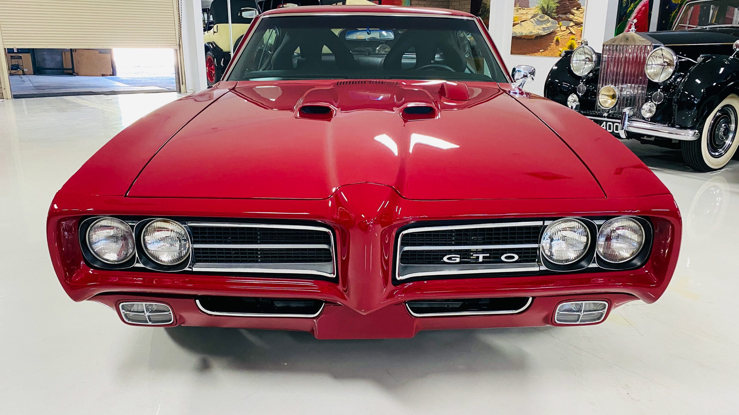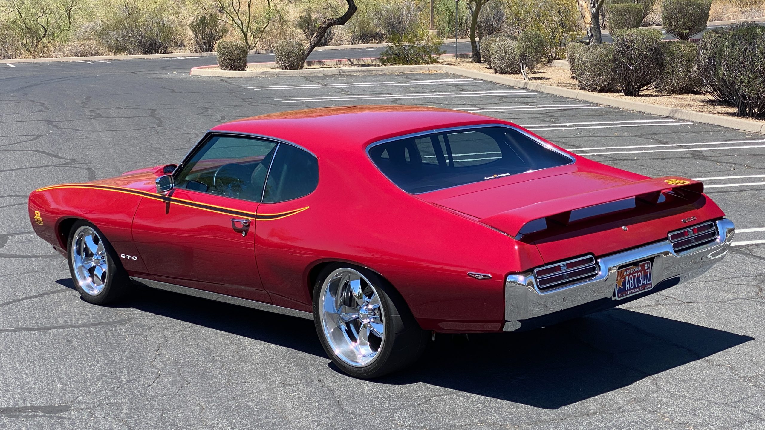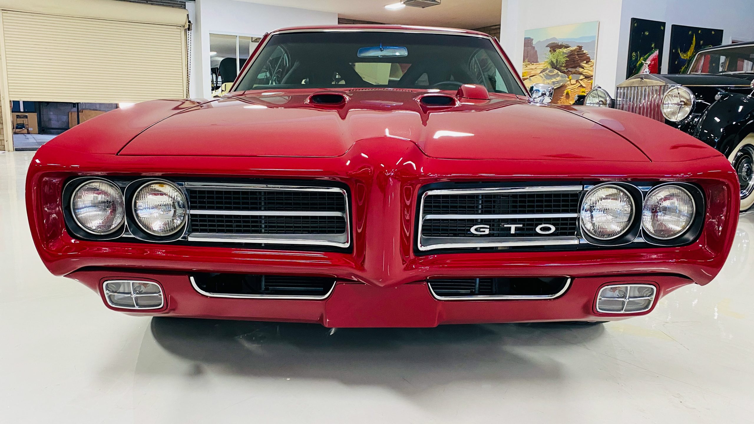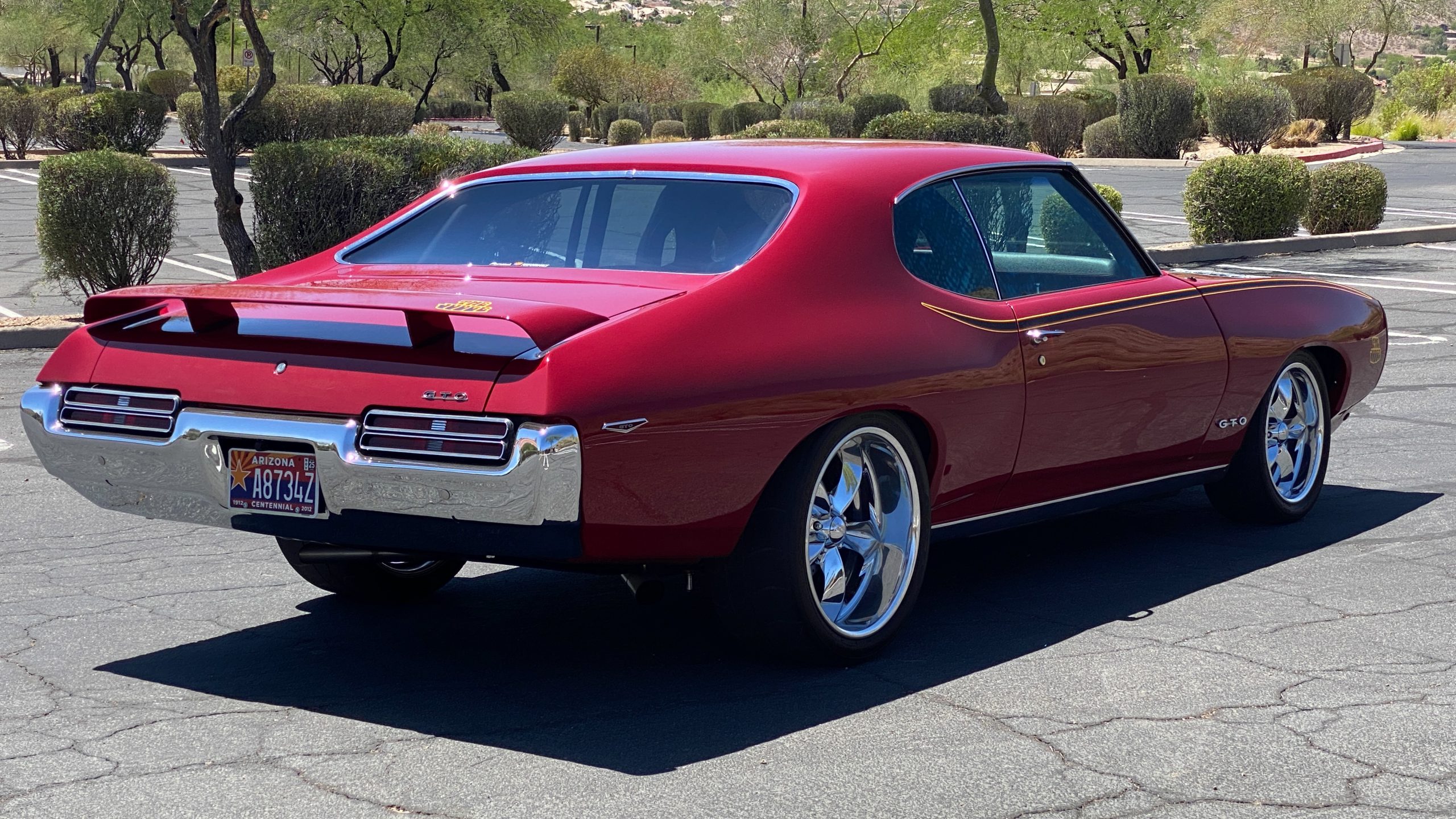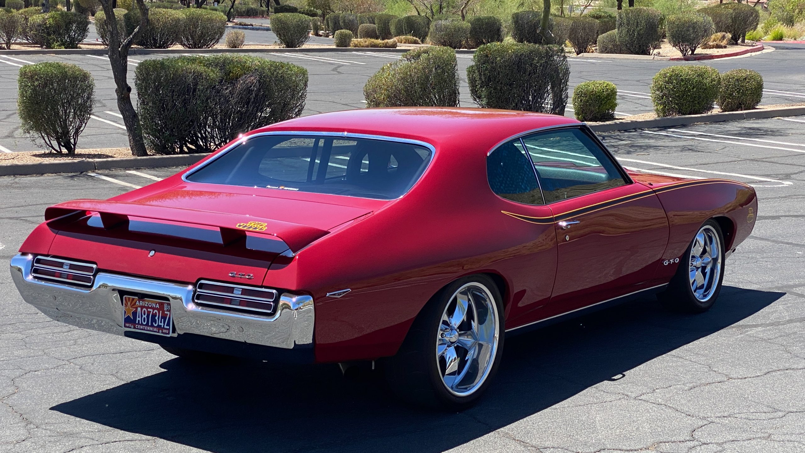 A custom built six point roll-bar all allude to the power and performance that awaits the driver in the engine bay. Added amenities include a Vintage Air AC system, custom molded and designed center console, and a full size Pioneer audio/video head unit with JL Audio speakers. The driver will also notice the AutoMeter white face gauges and Ididit steering column. One item that won’t be noticed, but is a welcome addition is the Dynamat heat and sound insulation layered throughout the car. Opening the trunk, you’ll notice the custom finished trunk with GTO badge.