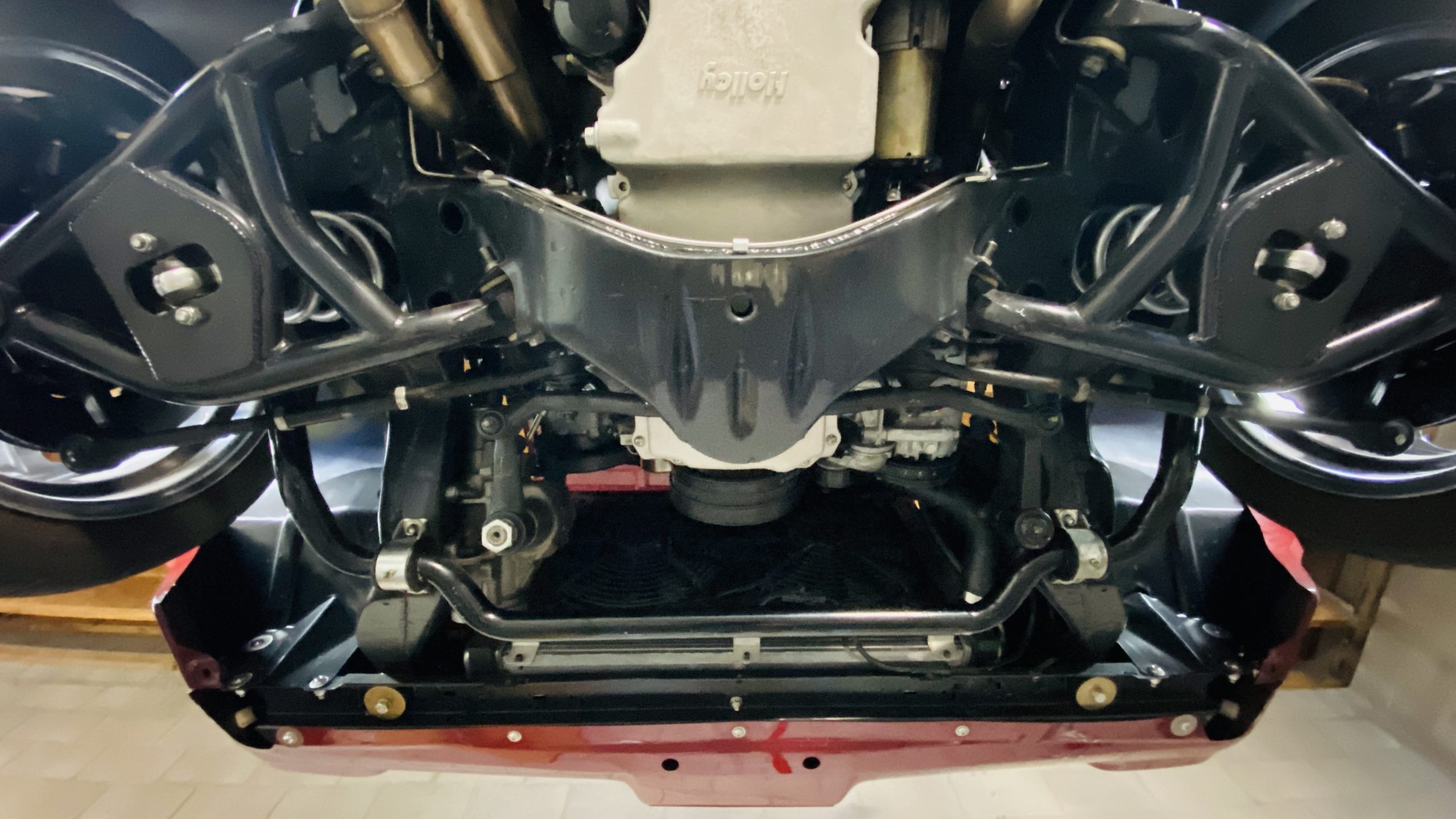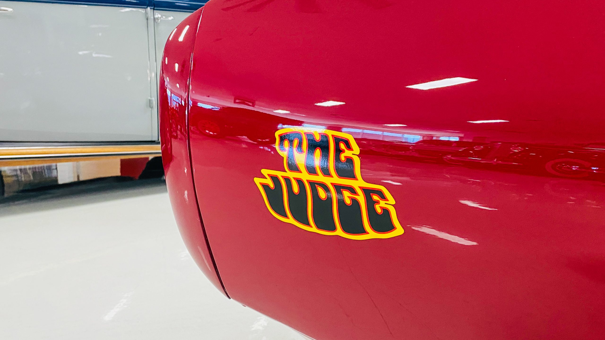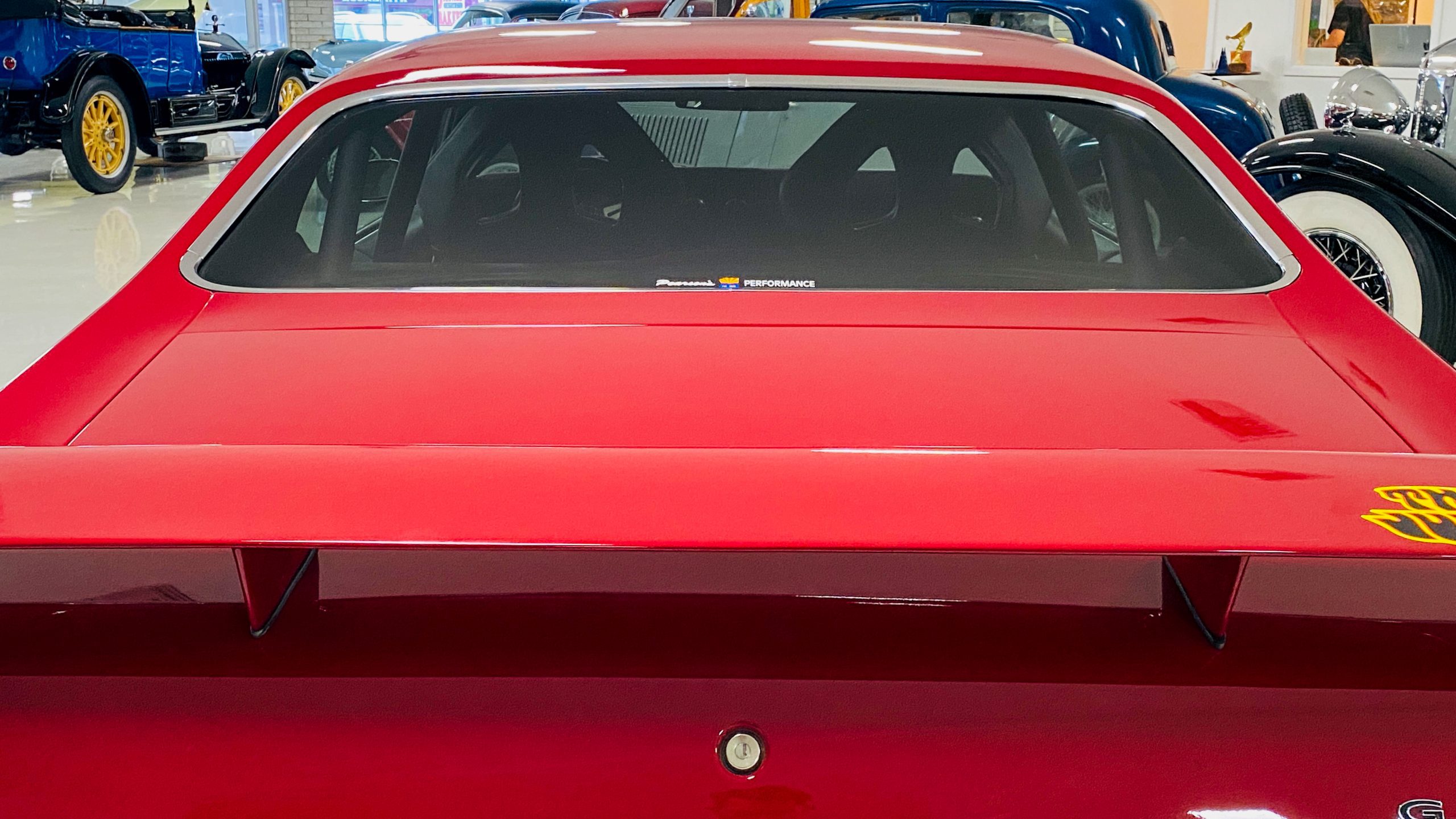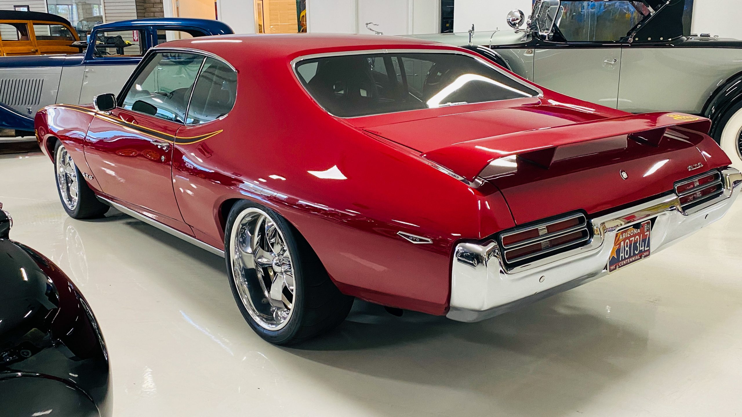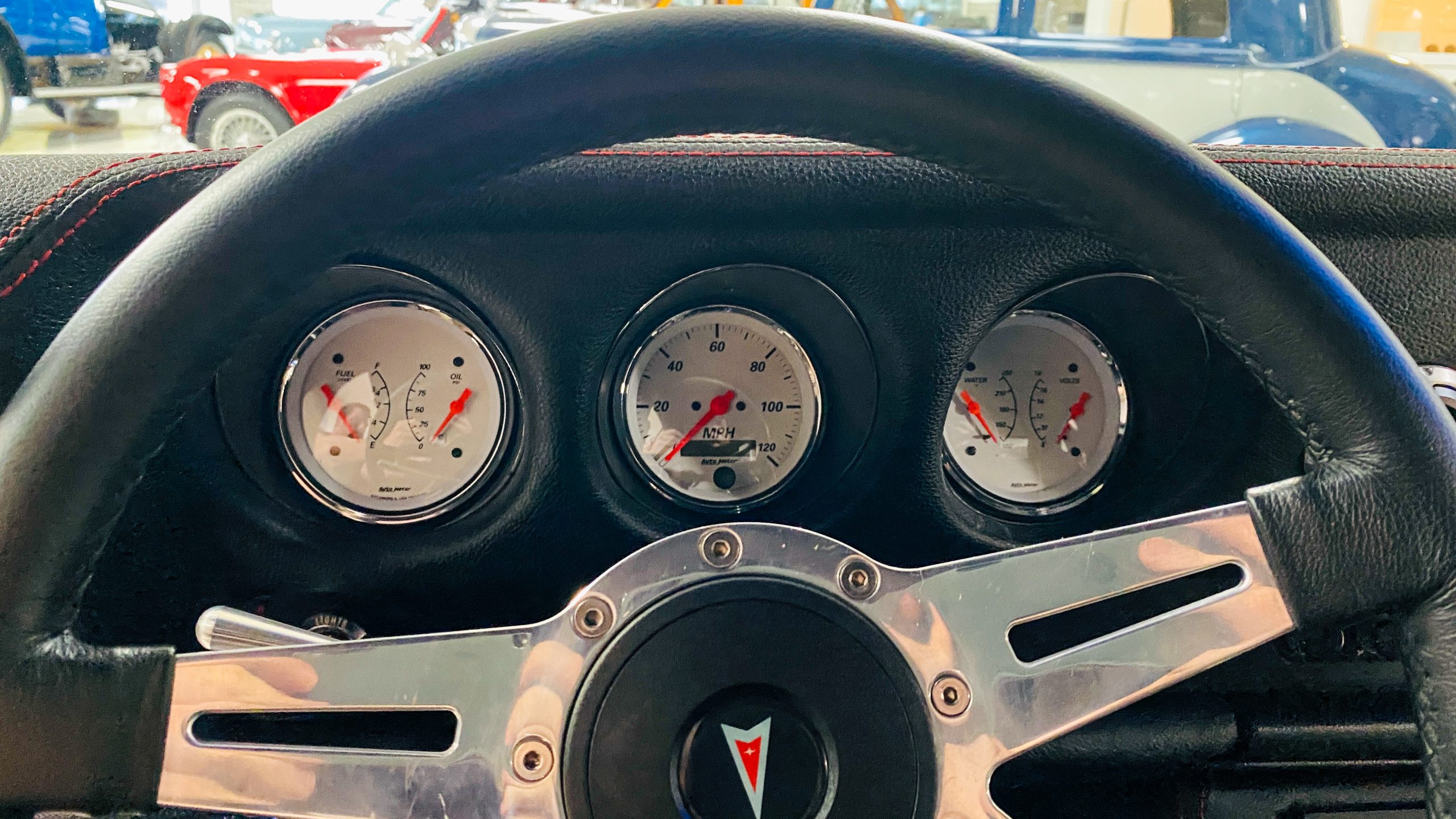 A custom built six point roll-bar all allude to the power and performance that awaits the driver in the engine bay. Added amenities include a Vintage Air AC system, custom molded and designed center console, and a full size Pioneer audio/video head unit with JL Audio speakers. The driver will also notice the AutoMeter white face gauges and Ididit steering column. One item that won’t be noticed, but is a welcome addition is the Dynamat heat and sound insulation layered throughout the car. Opening the trunk, you’ll notice the custom finished trunk with GTO badge.