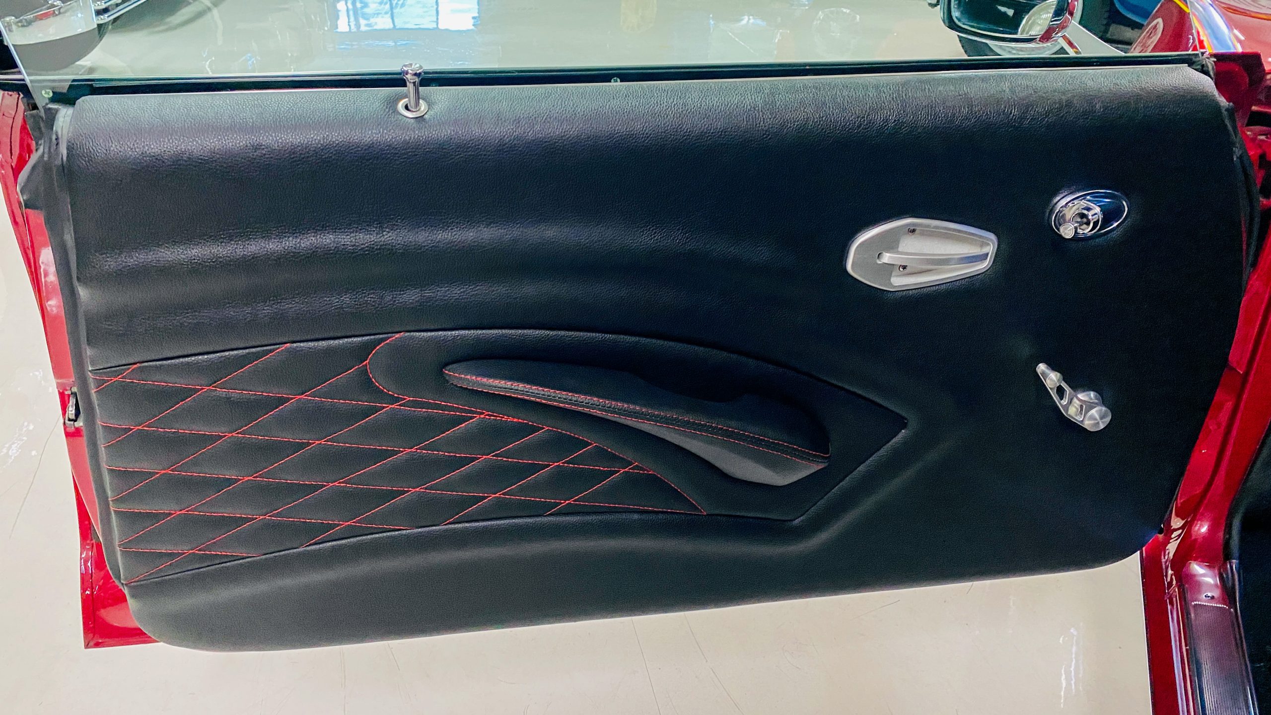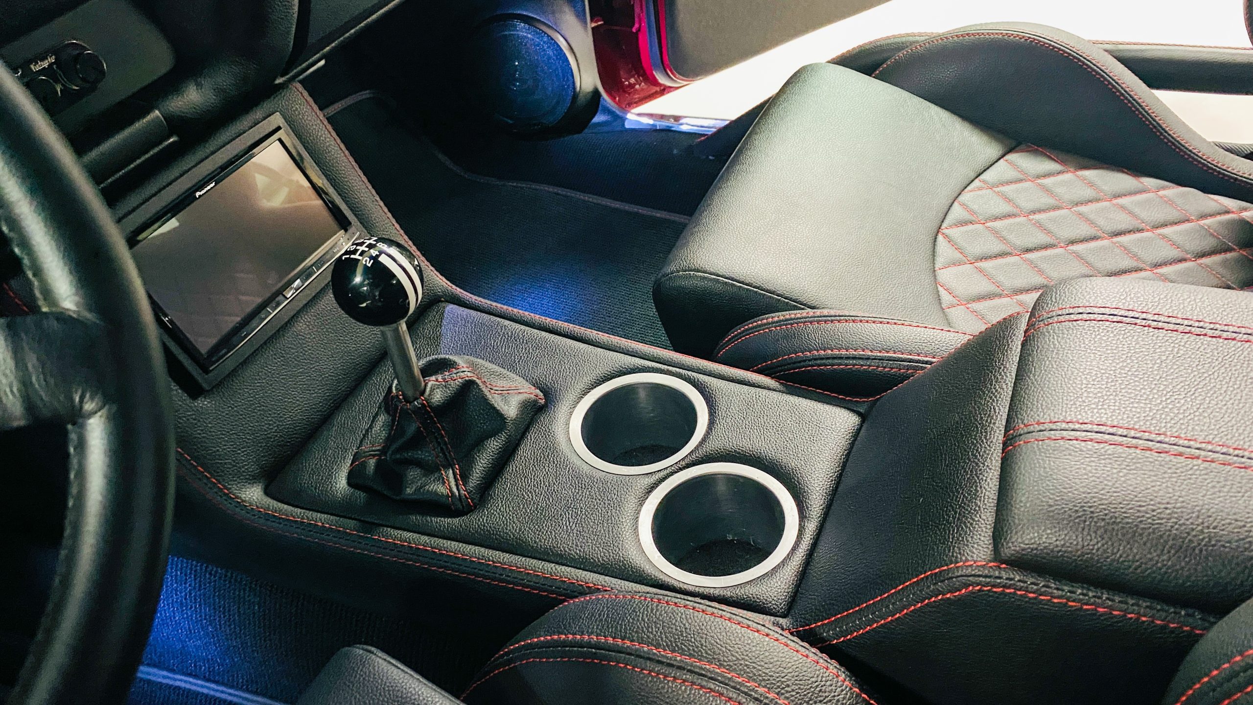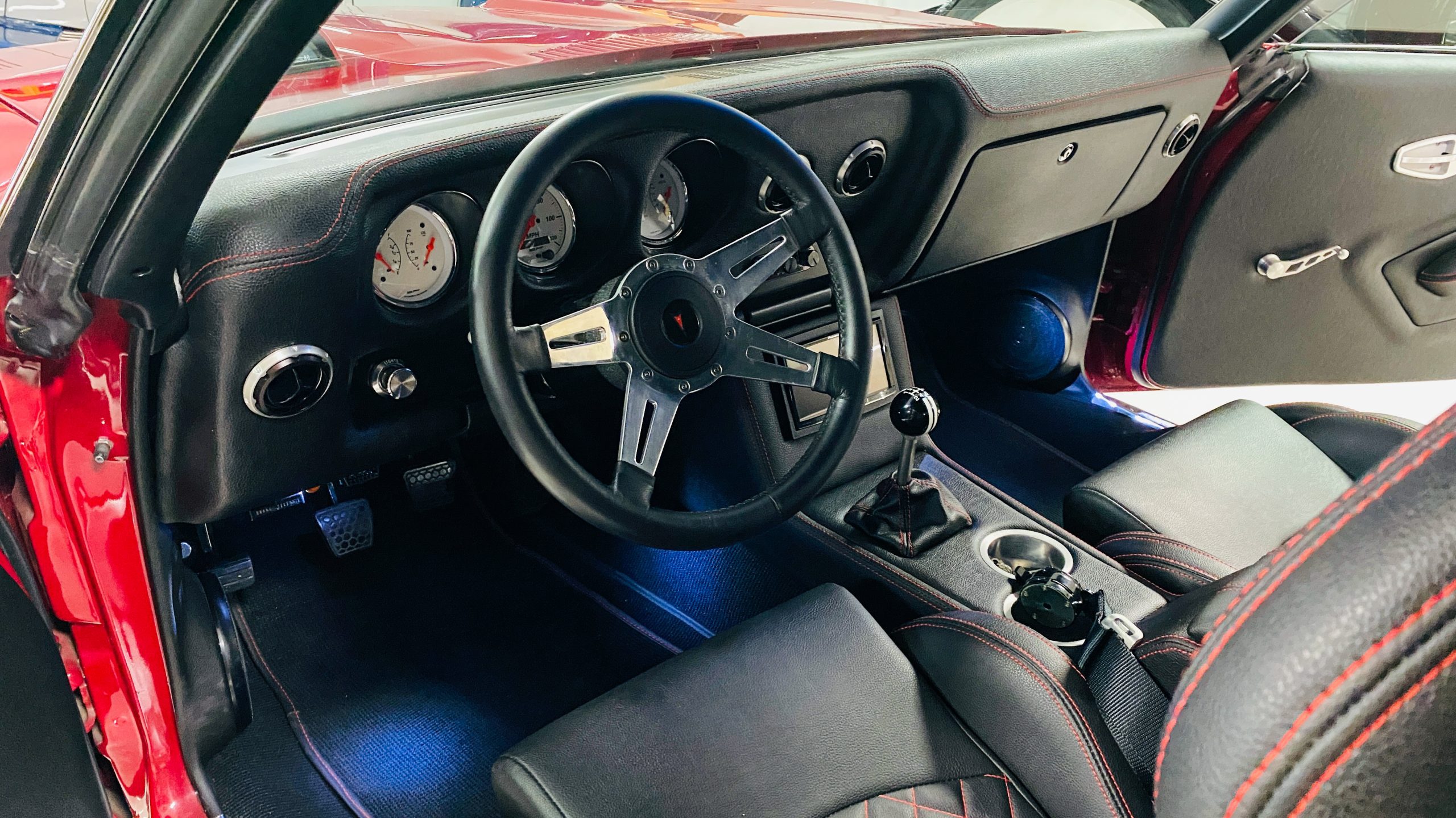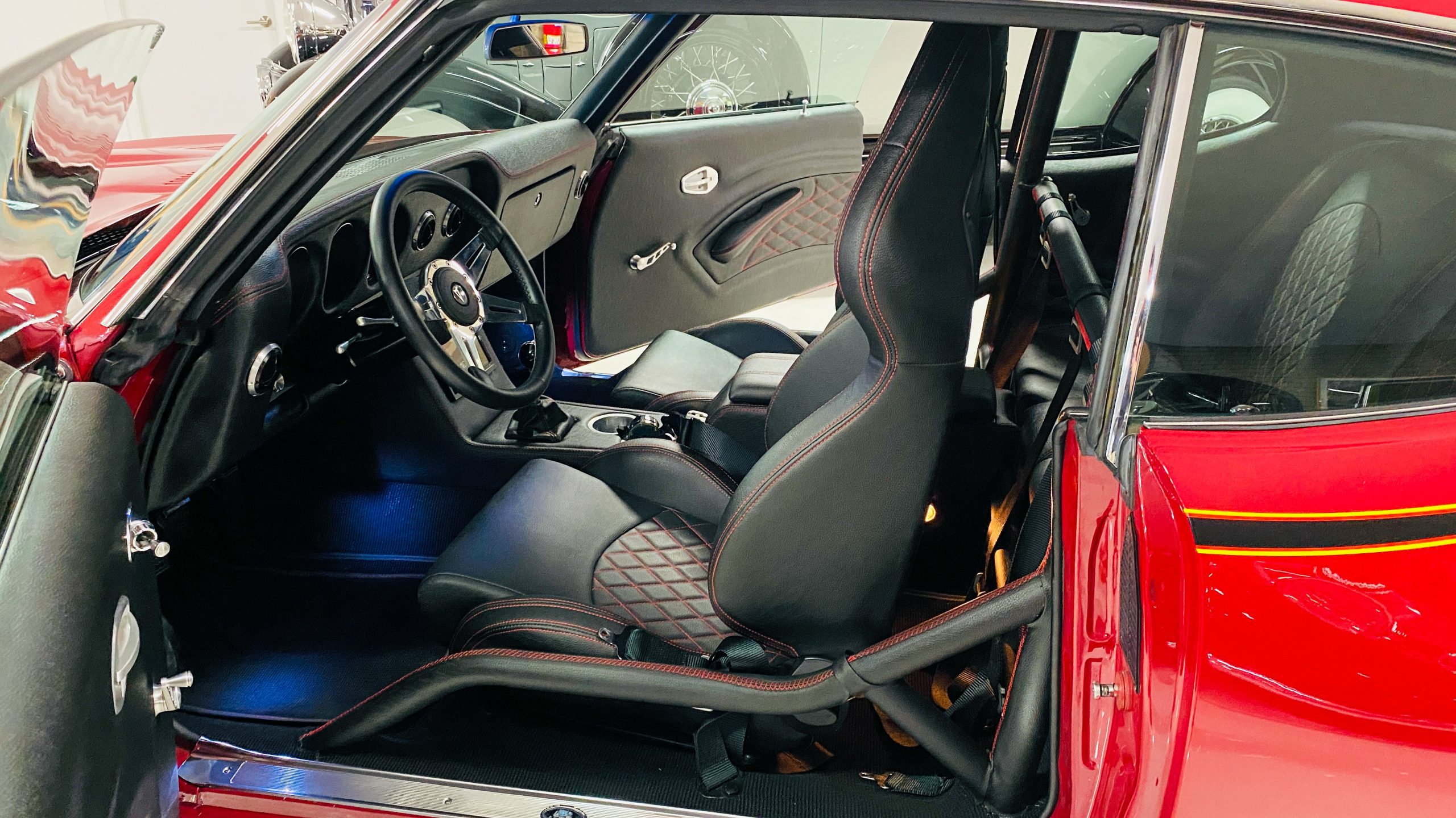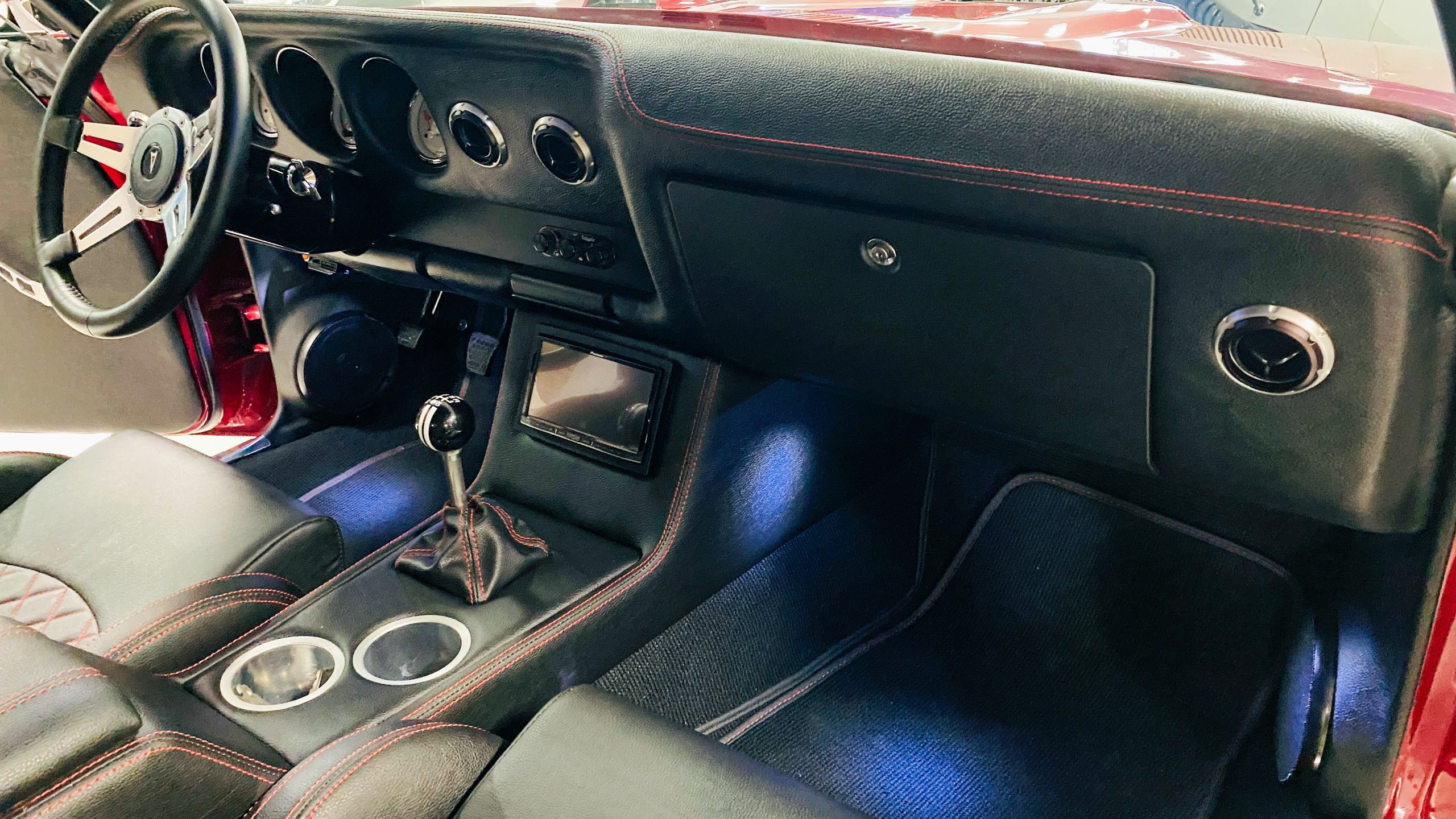 The interior of this coupe received even more attention than the exterior. While the intention of the exterior styling was to appear as a muscle car, the interior has a much more modern flair. The custom black leather interior is offset well with red accent stitching everywhere. Corbeau racing style black leather bucket seats hold the driver and passenger in place and appear as new. Matching the seats are a custom headliner, door panels and new square weave carpet. We love the red stitched diamond patterns used throughout the interior.