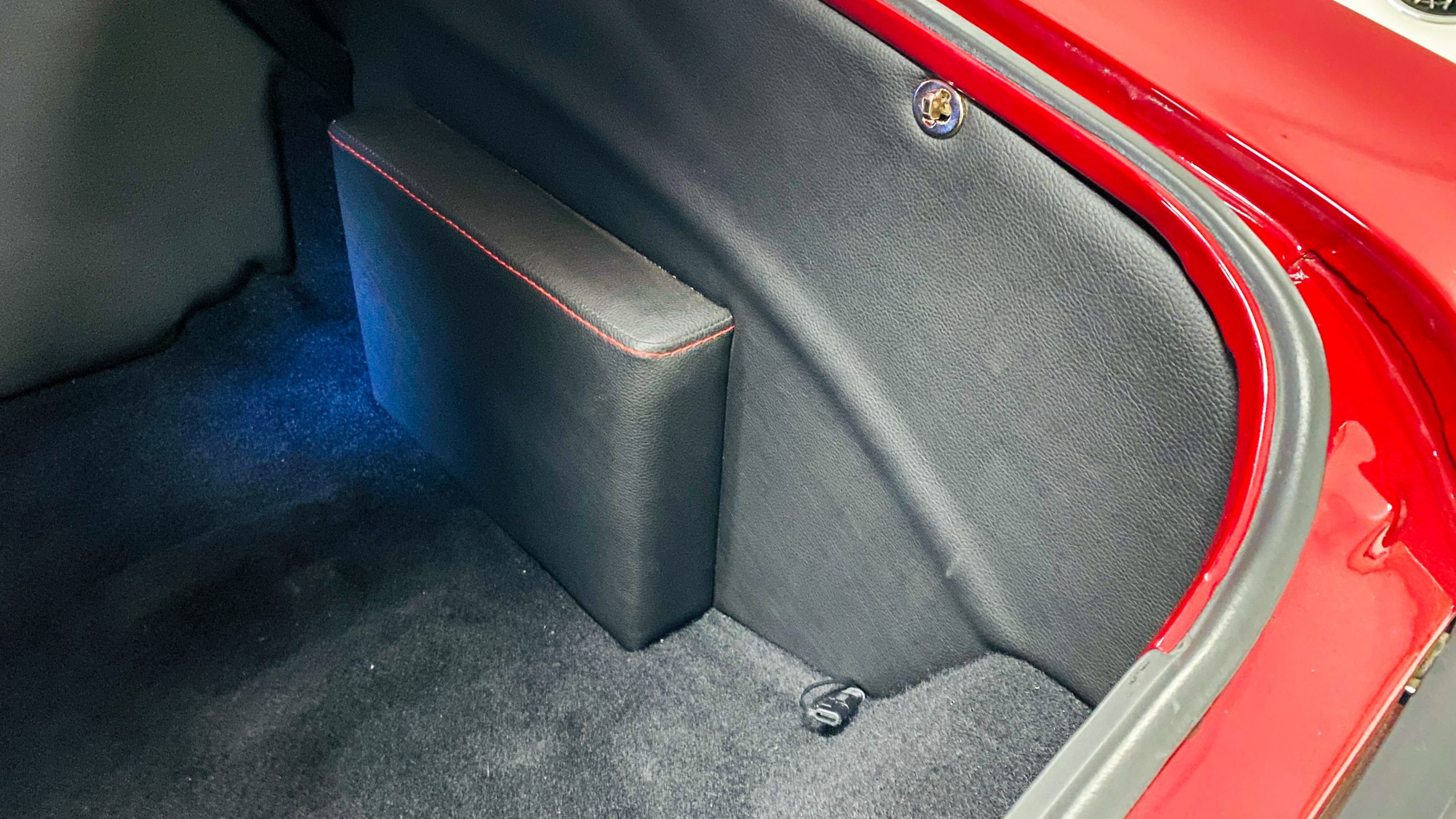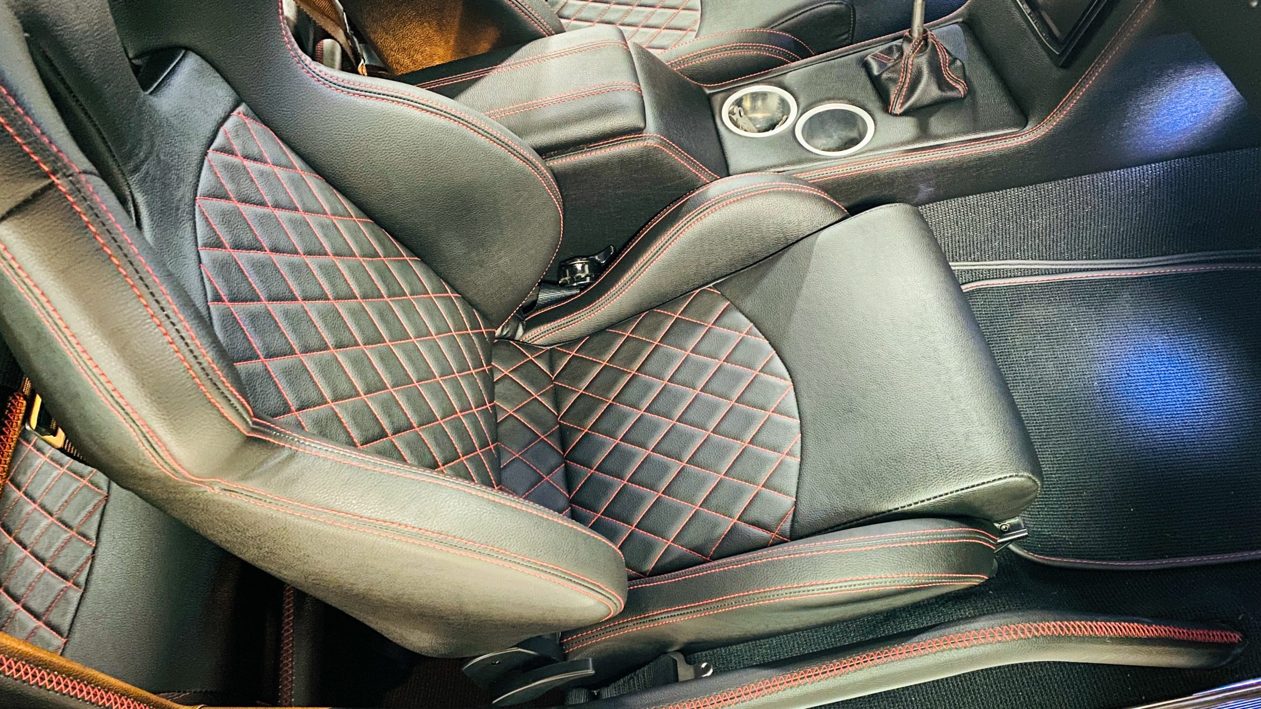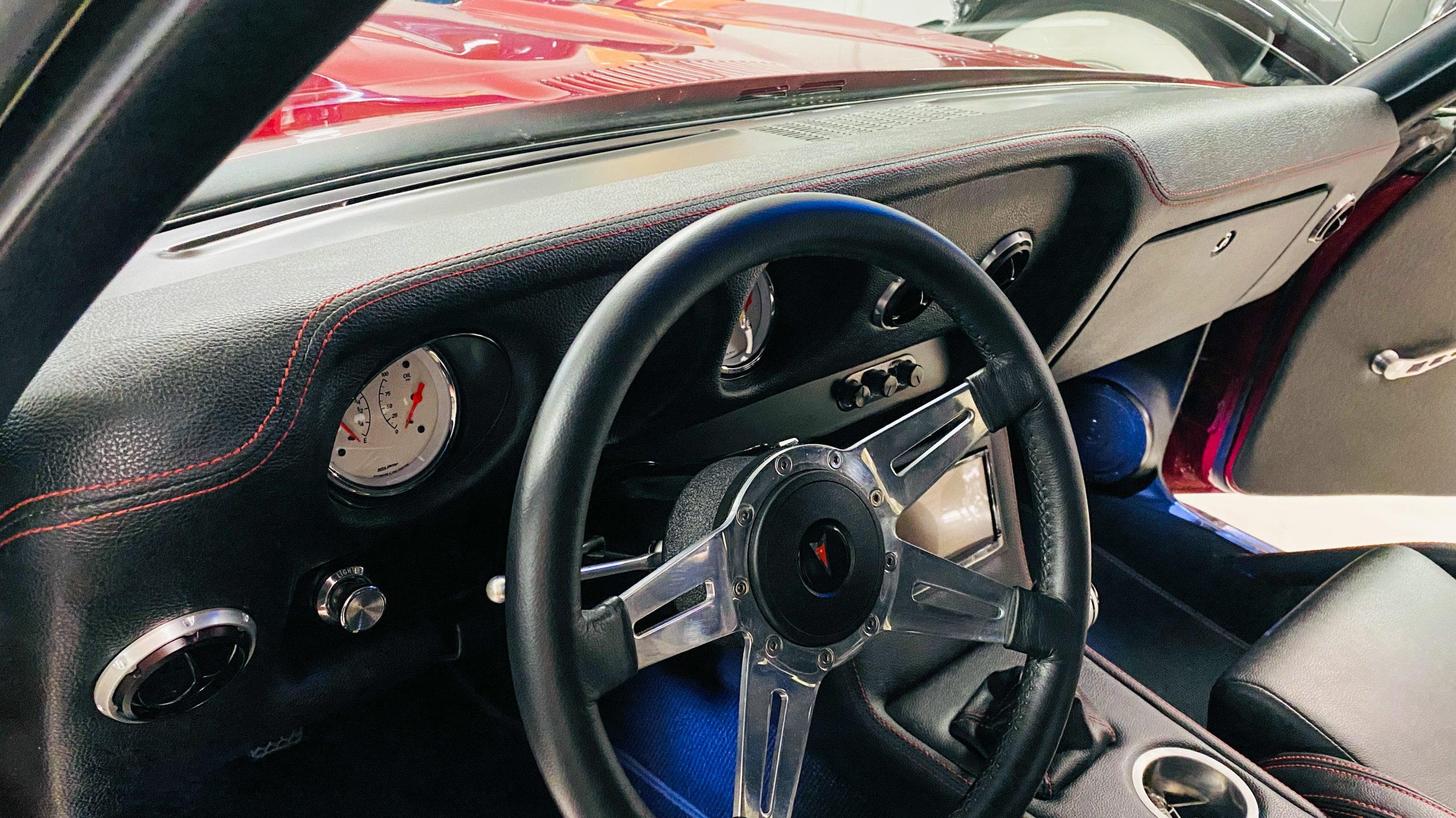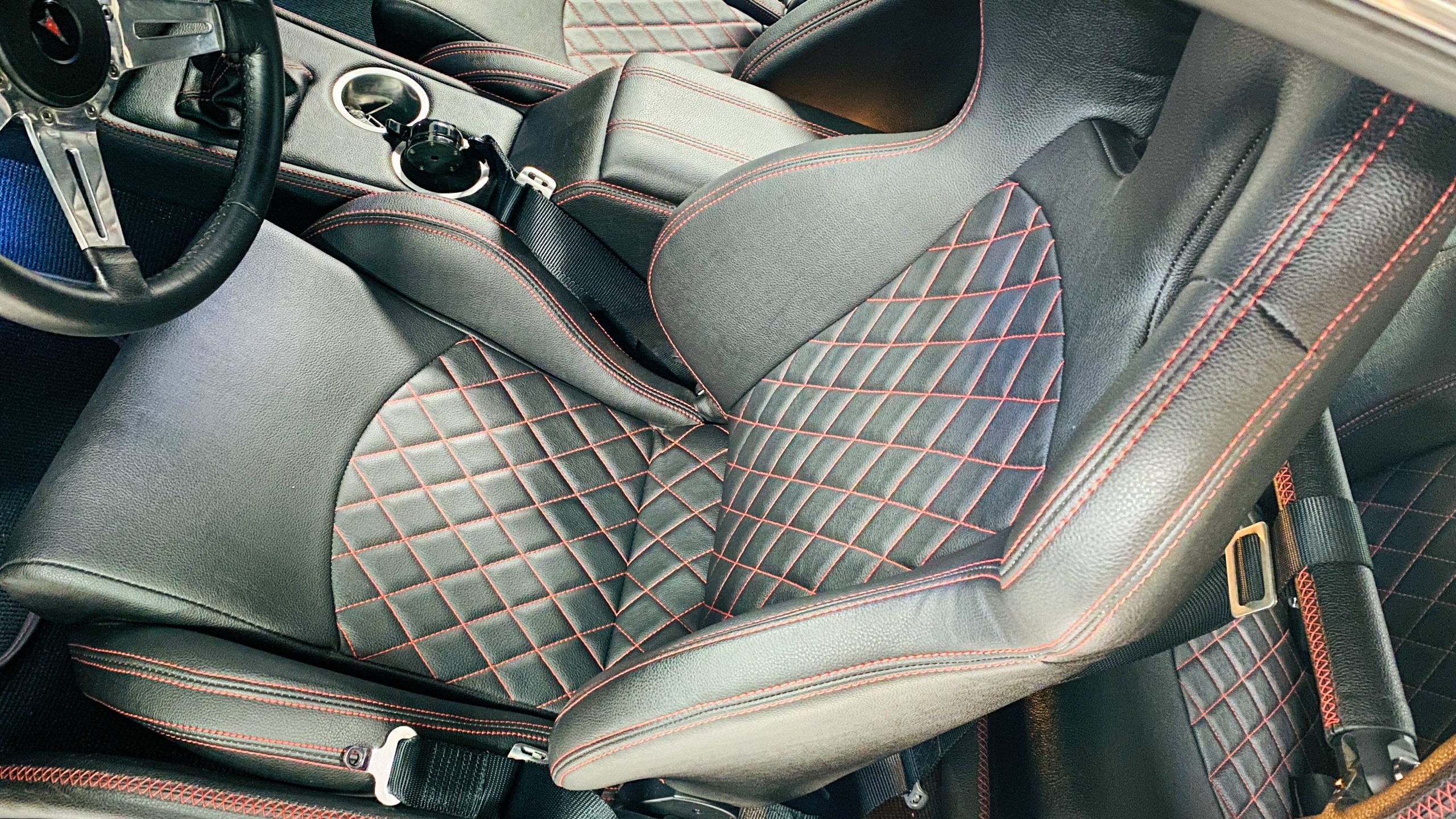 The interior of this coupe received even more attention than the exterior. While the intention of the exterior styling was to appear as a muscle car, the interior has a much more modern flair. The custom black leather interior is offset well with red accent stitching everywhere. Corbeau racing style black leather bucket seats hold the driver and passenger in place and appear as new. Matching the seats are a custom headliner, door panels and new square weave carpet. We love the red stitched diamond patterns used throughout the interior.