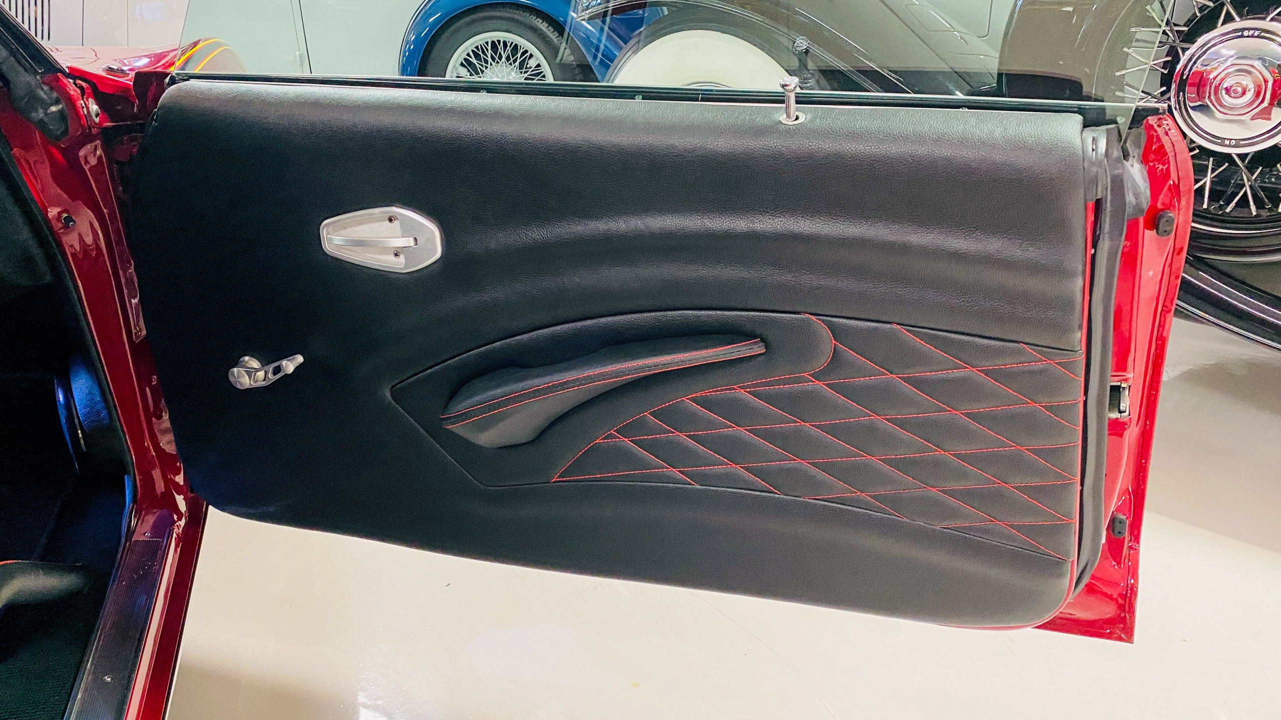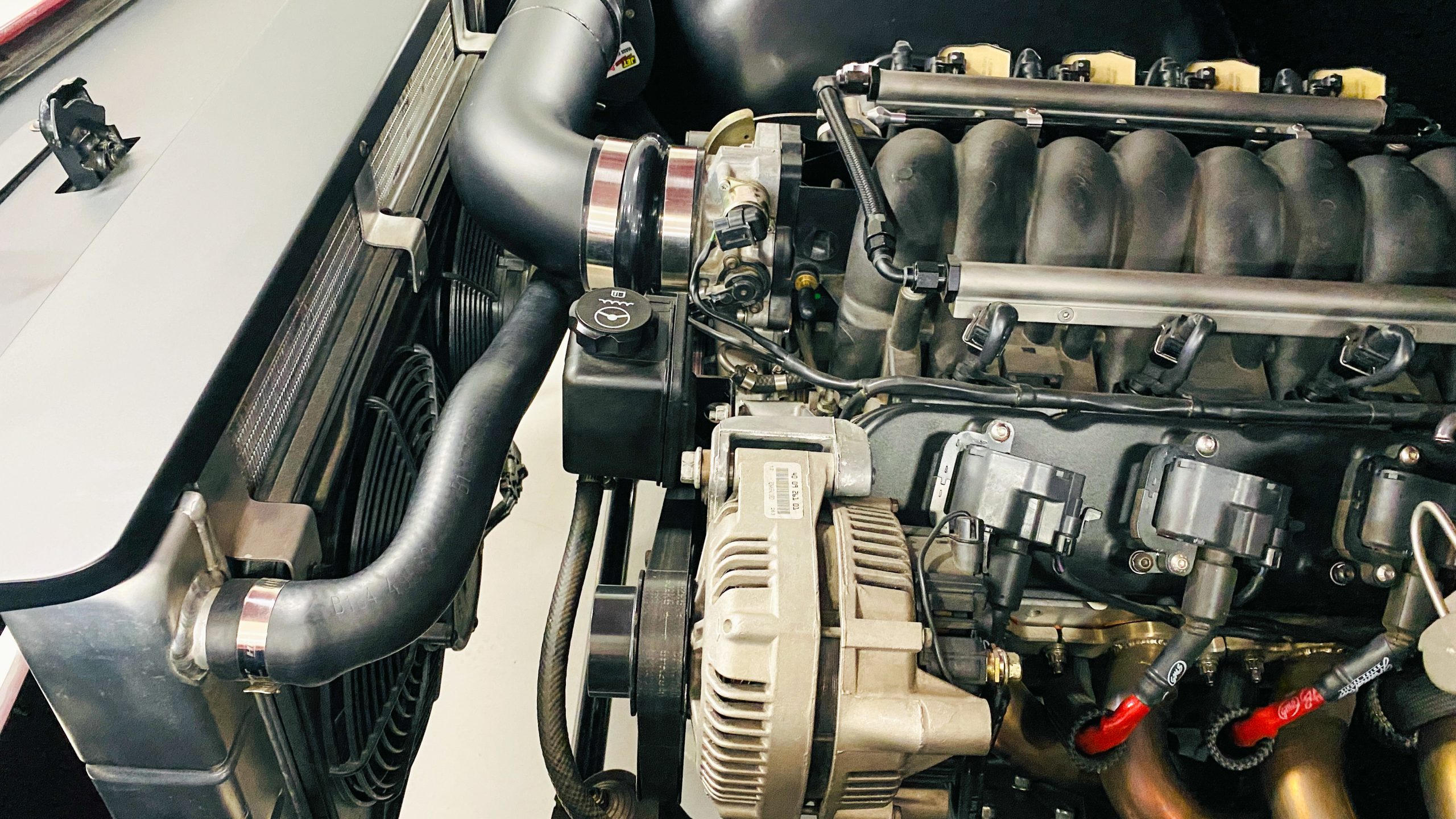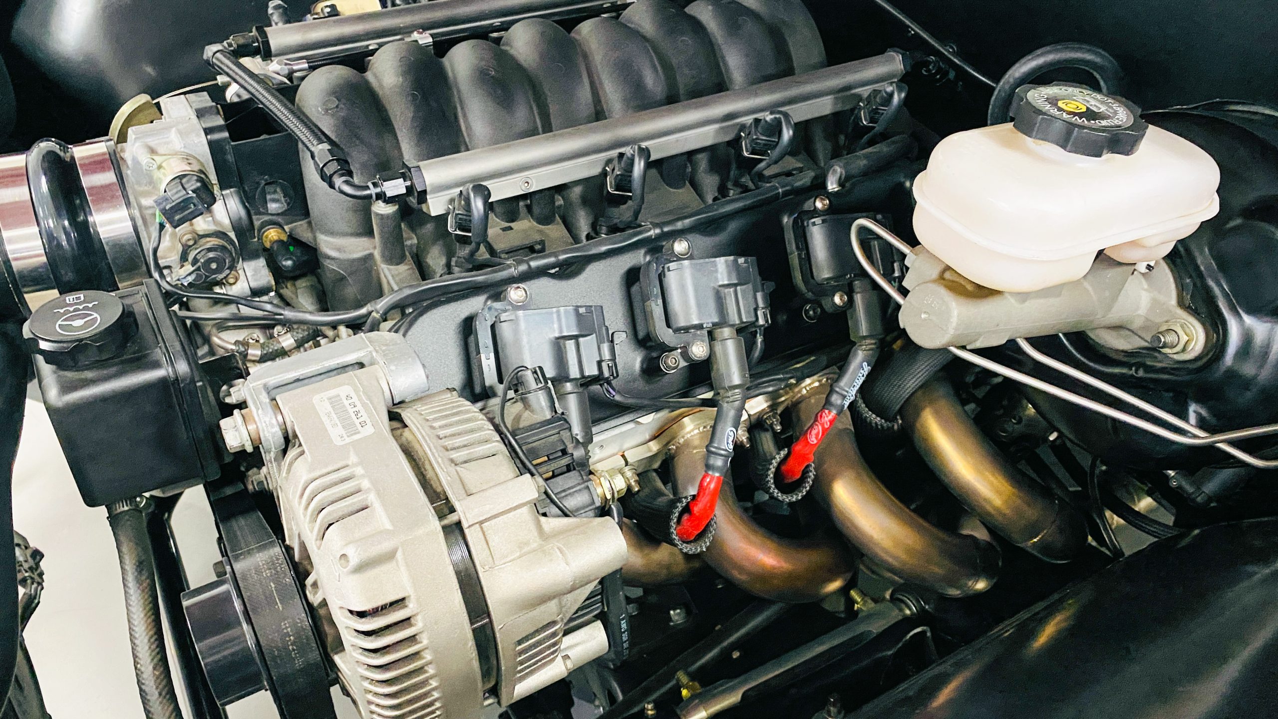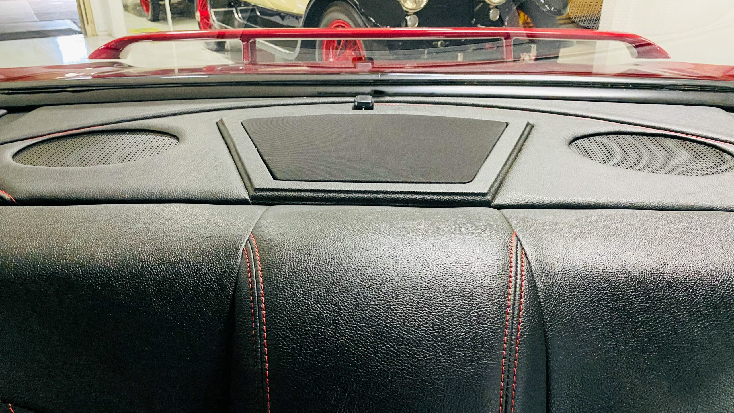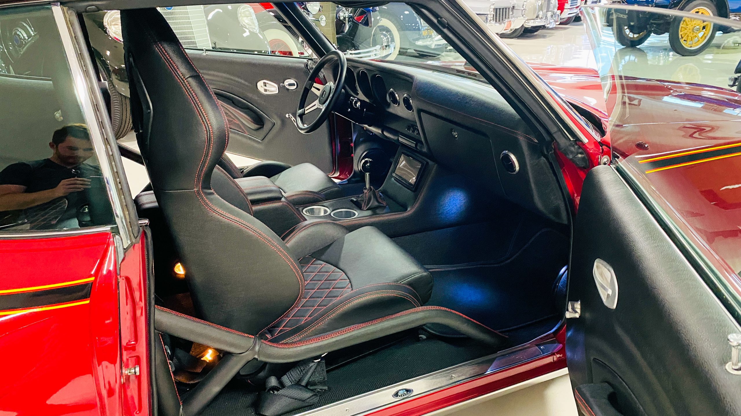The interior of this coupe received even more attention than the exterior. While the intention of the exterior styling was to appear as a muscle car, the interior has a much more modern flair. The custom black leather interior is offset well with red accent stitching everywhere. Corbeau racing style black leather bucket seats hold the driver and passenger in place and appear as new. Matching the seats are a custom headliner, door panels and new square weave carpet. We love the red stitched diamond patterns used throughout the interior.