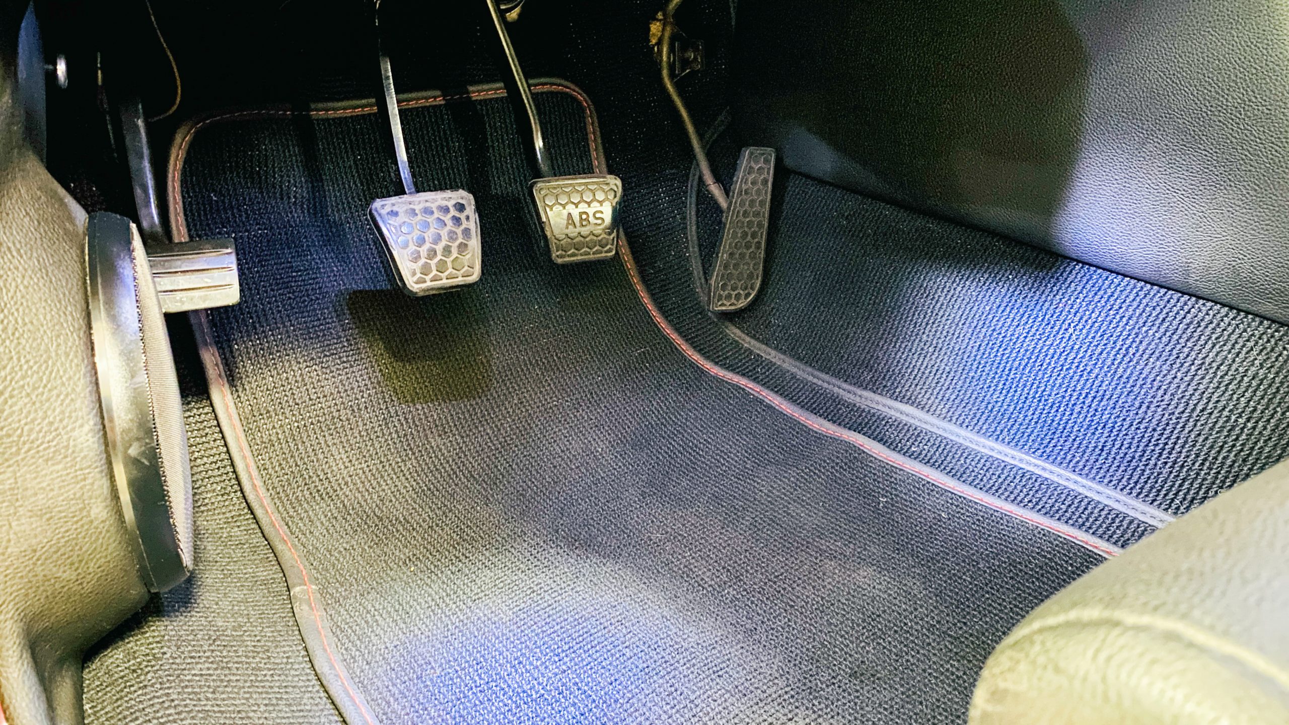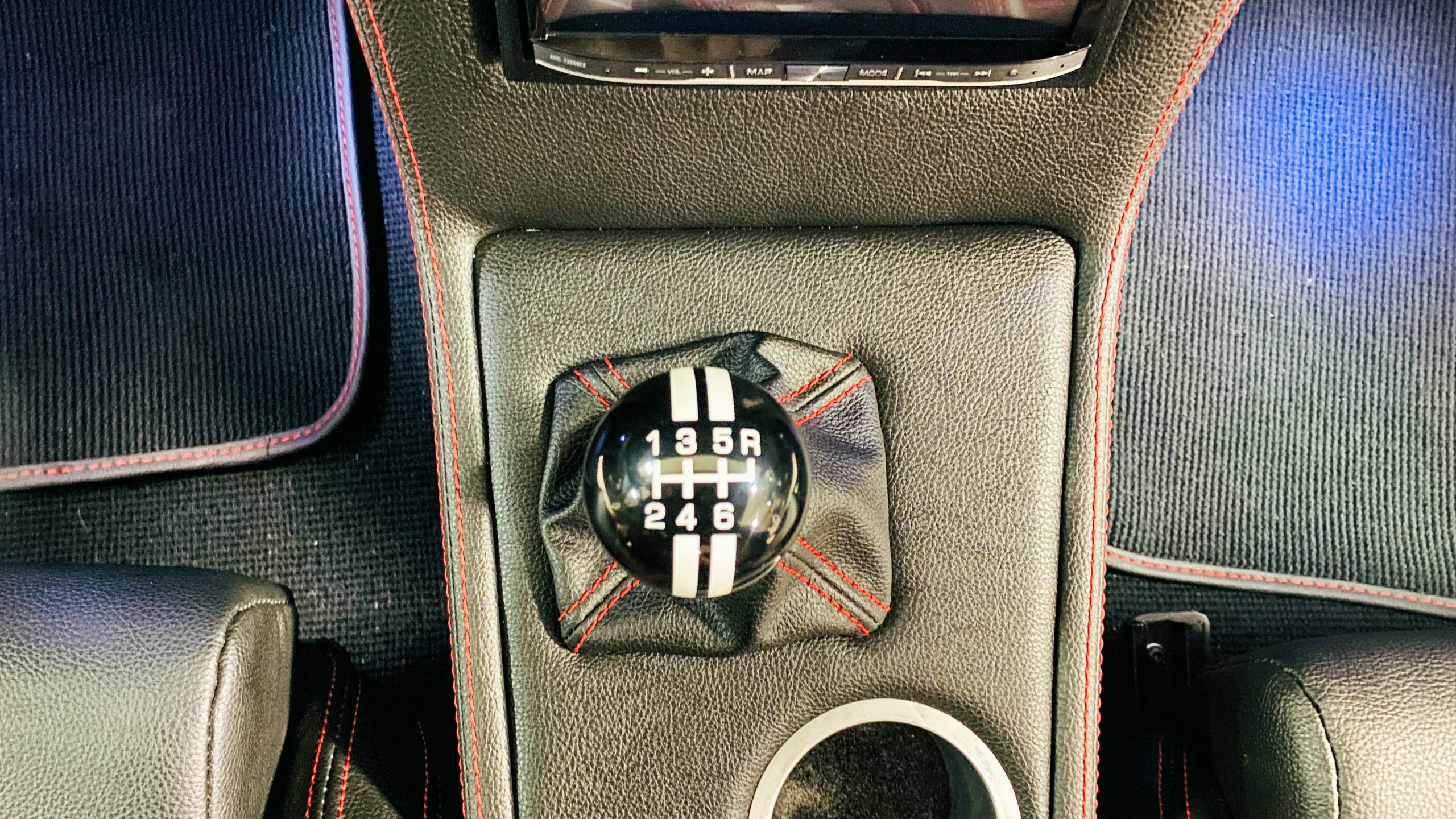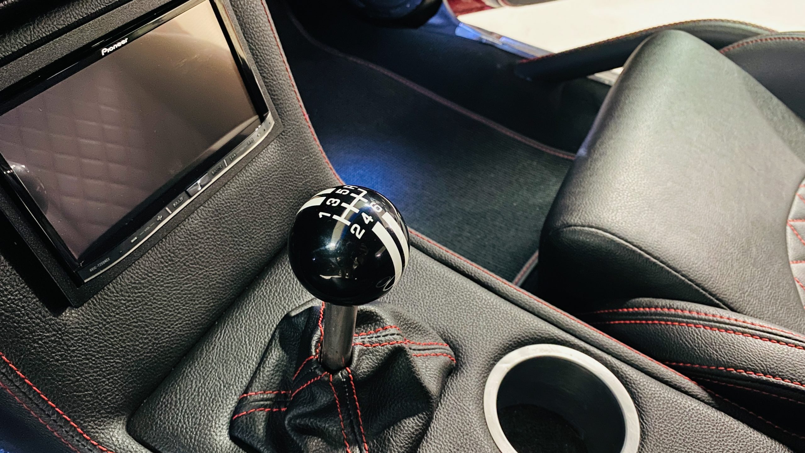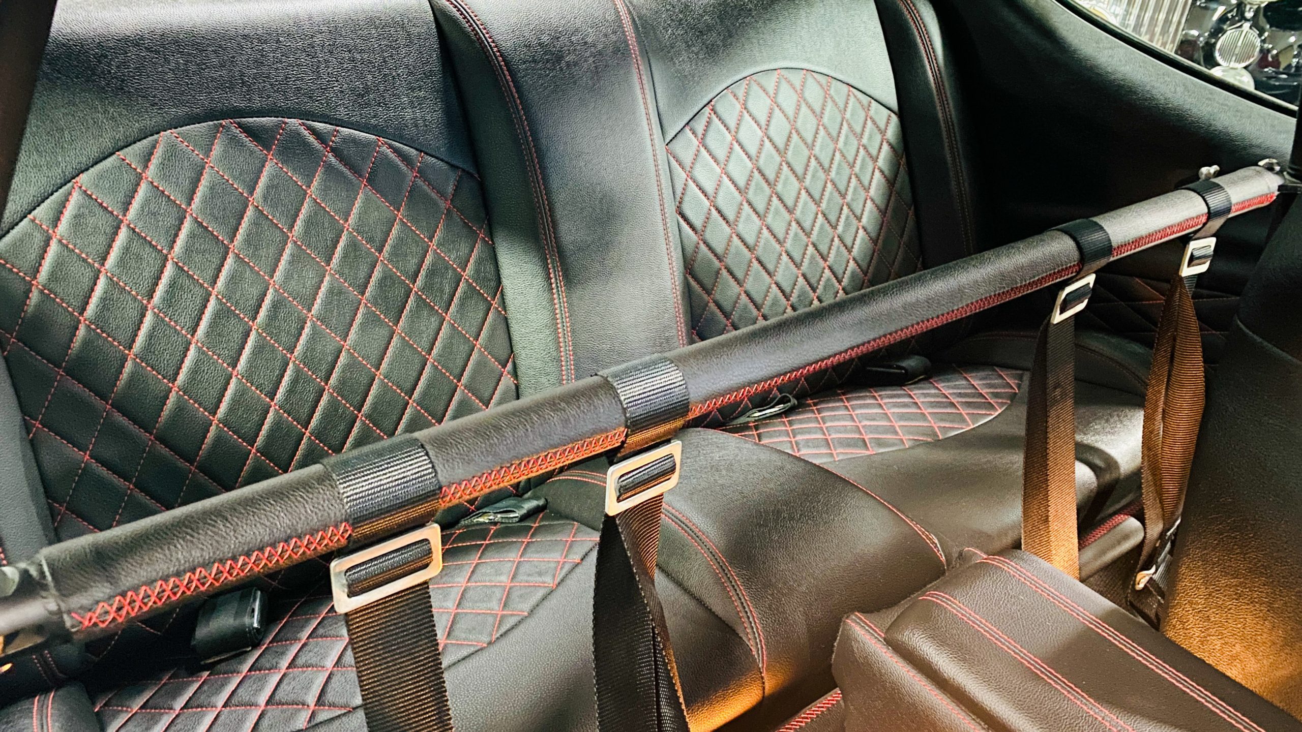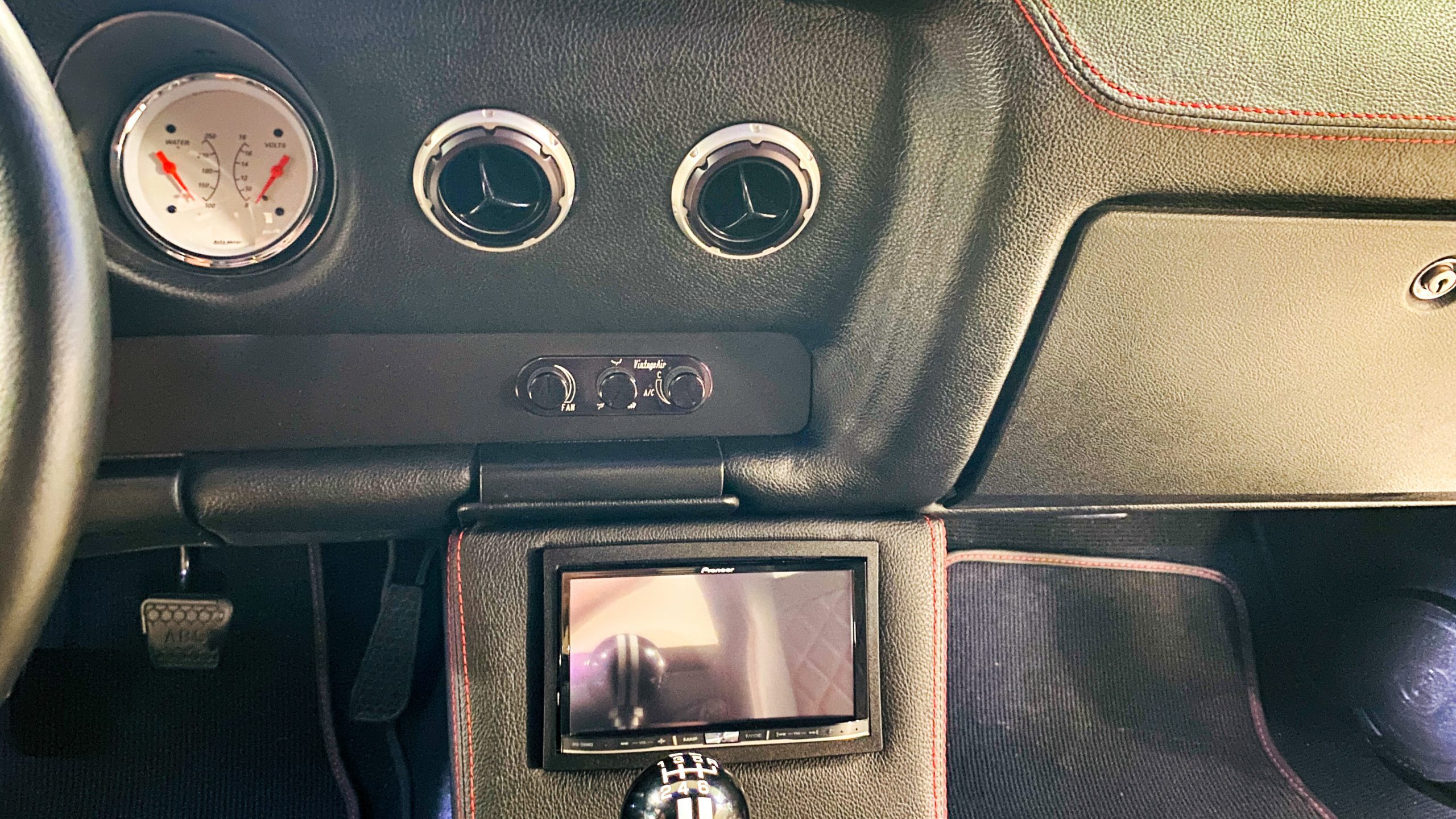 The interior of this coupe received even more attention than the exterior. While the intention of the exterior styling was to appear as a muscle car, the interior has a much more modern flair. The custom black leather interior is offset well with red accent stitching everywhere. Corbeau racing style black leather bucket seats hold the driver and passenger in place and appear as new. Matching the seats are a custom headliner, door panels and new square weave carpet. We love the red stitched diamond patterns used throughout the interior.