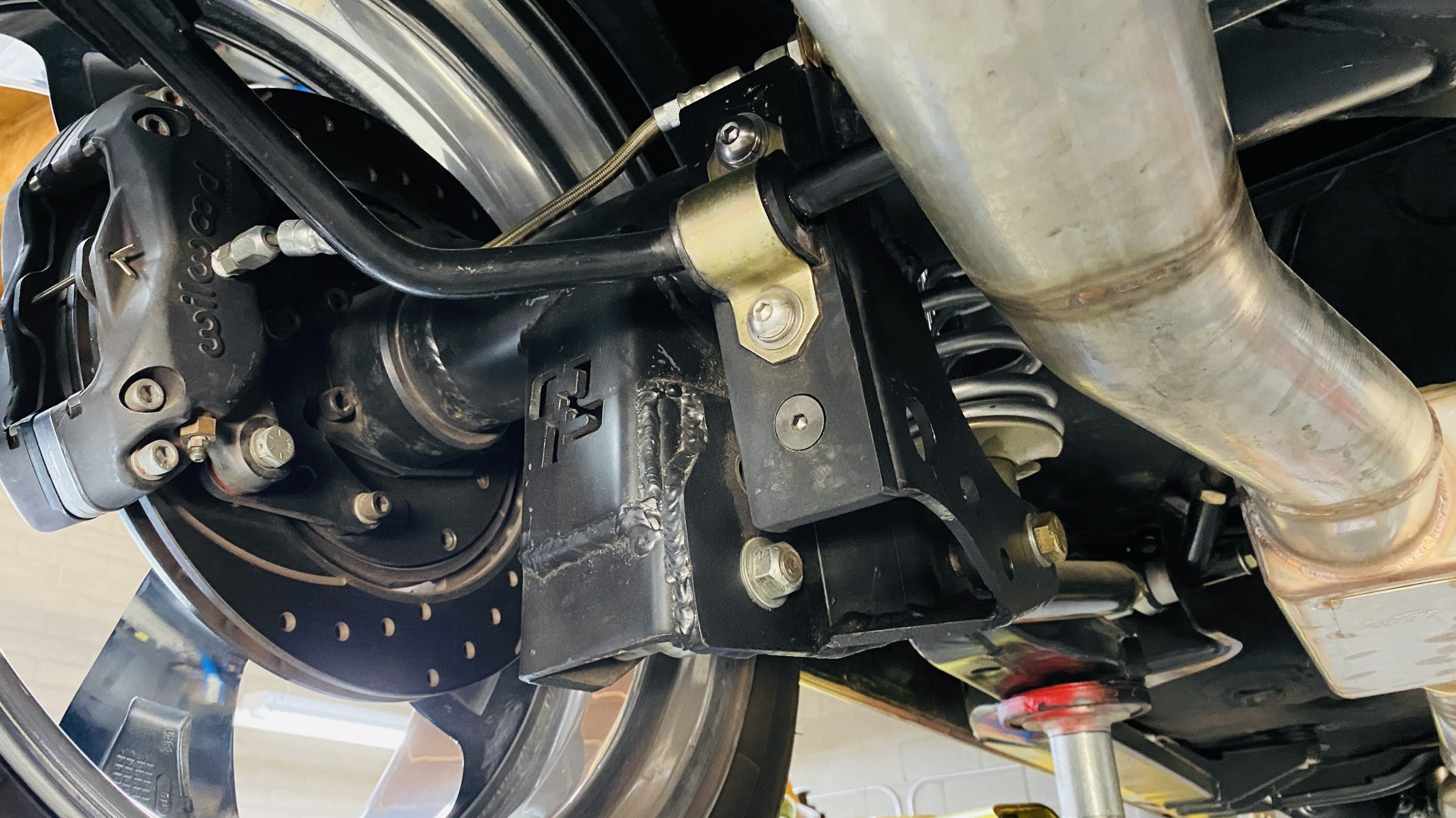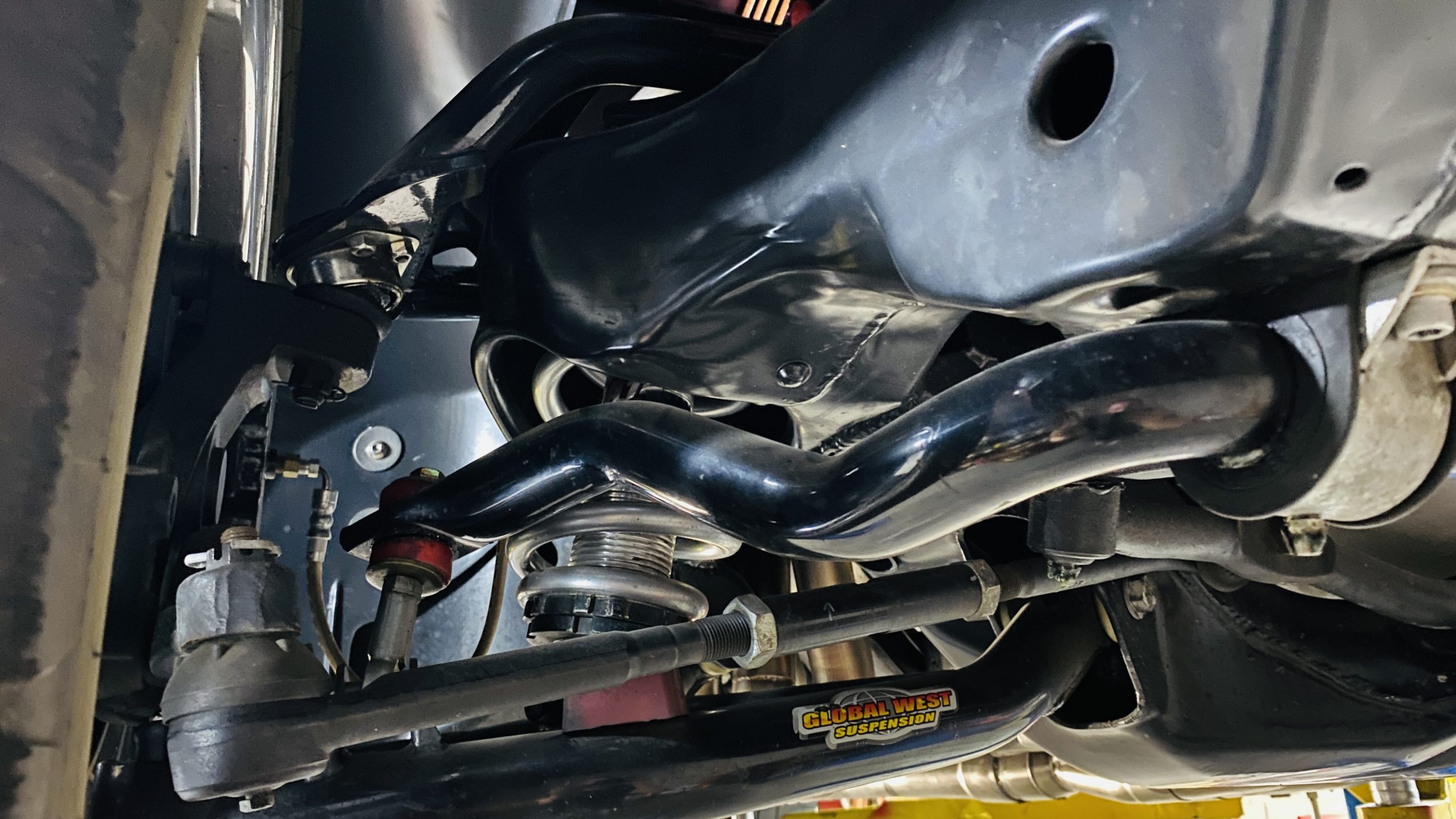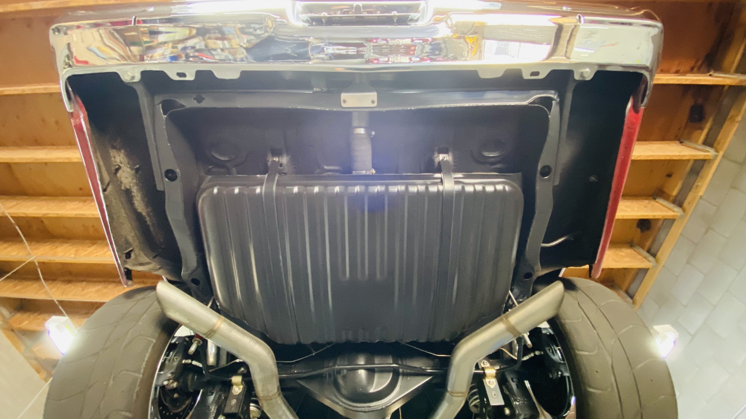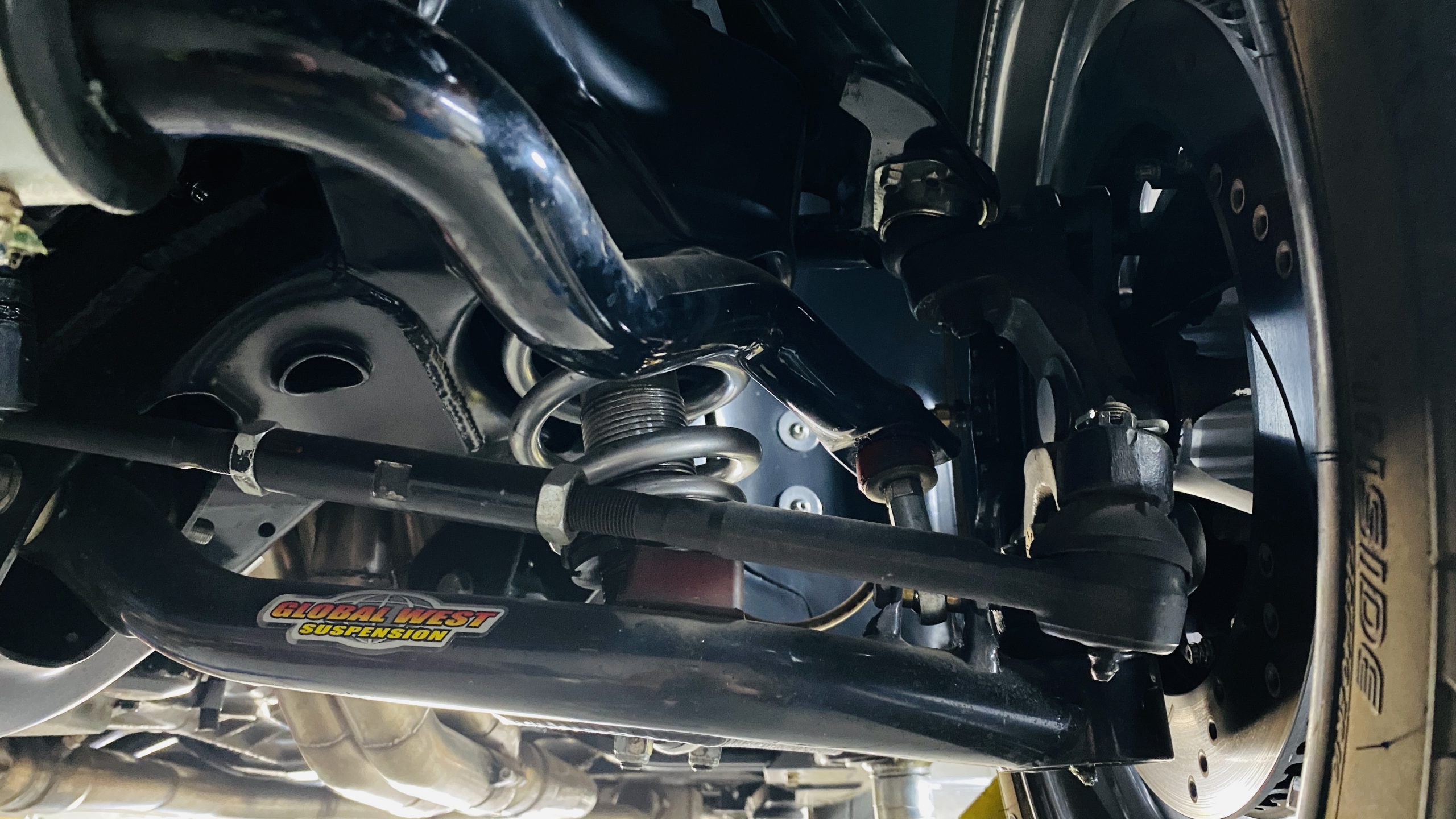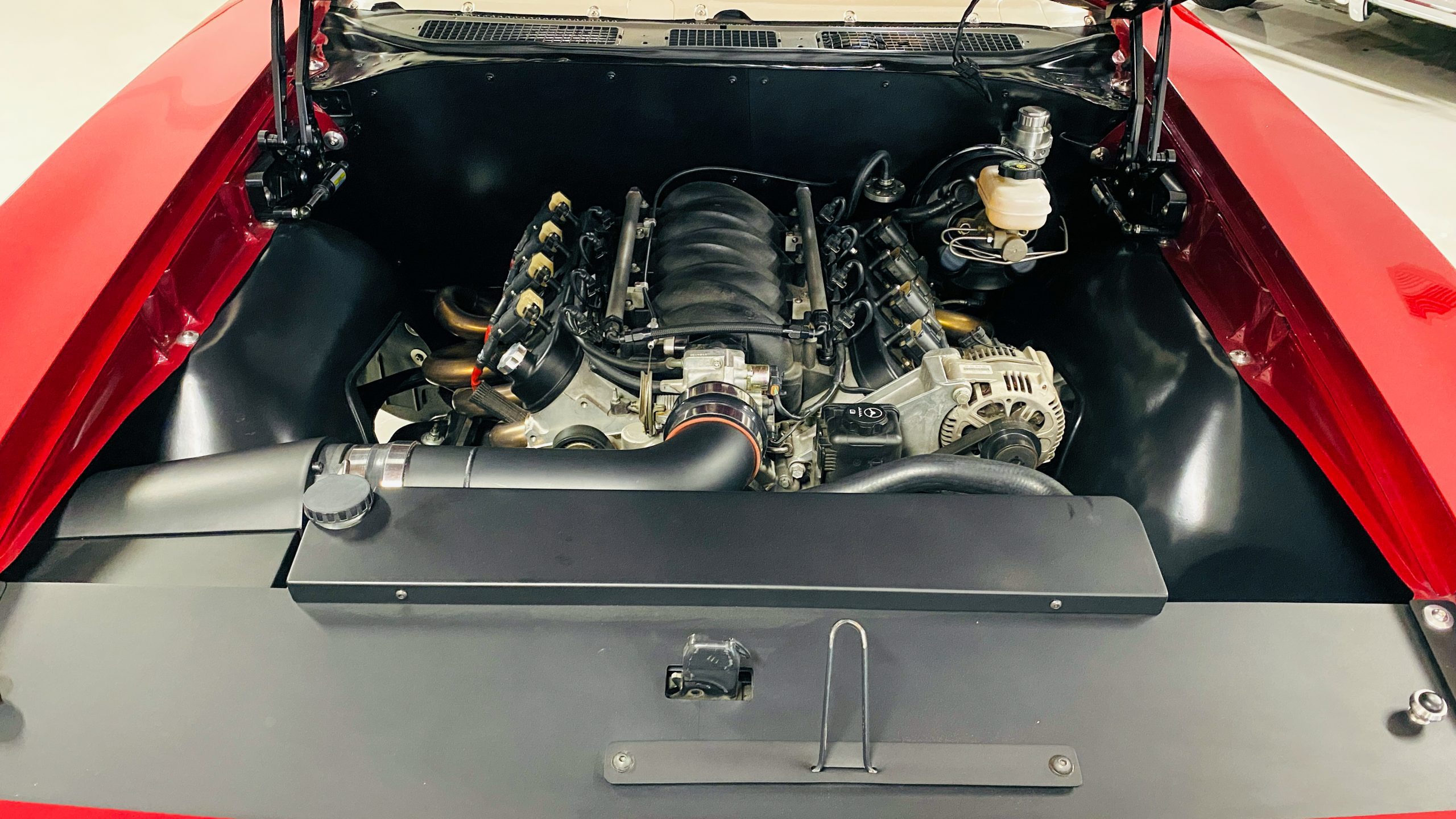 All of the exterior and interior changes that were made to this coupe would be all for naught if it weren’t for the performance upgrades. Supplying the power to this Judge is a custom built 5.7 liter LS1 mated to a Tremec T56 6-speed manual transmission. This combination offers plenty of power and each shift of the short throw shifter is quick and precise through the gears. Opening the hood, you are treated to a neat and tidy engine bay without wires and a few custom upgrades. Between the custom headers and stainless steel dual exhaust with Spintech mufflers, everyone around will be treated to a powerful modern muscle sound. A quick-ratio steering box, oversized sway bars in the front and rear, adjustable front and rear coil-over shocks and Global West tubular A-arms and a fully boxed frame allow this muscle car to move more nimbly around a track or around curves than ever before. Stopping power is aptly provided by Wilwood power disc brakes at all four corners, including slotted and drilled rotors with 6-piston calipers in the front.
