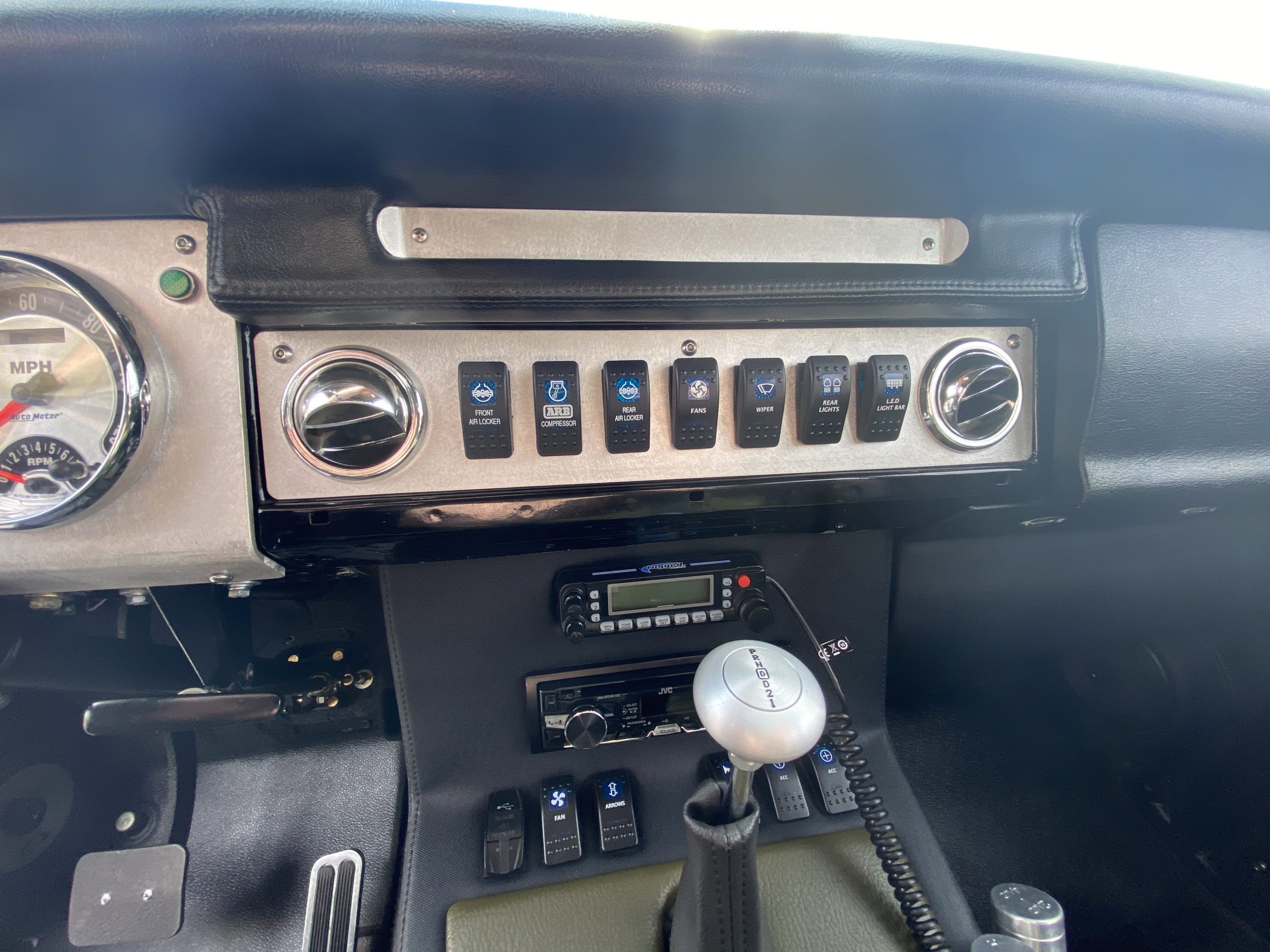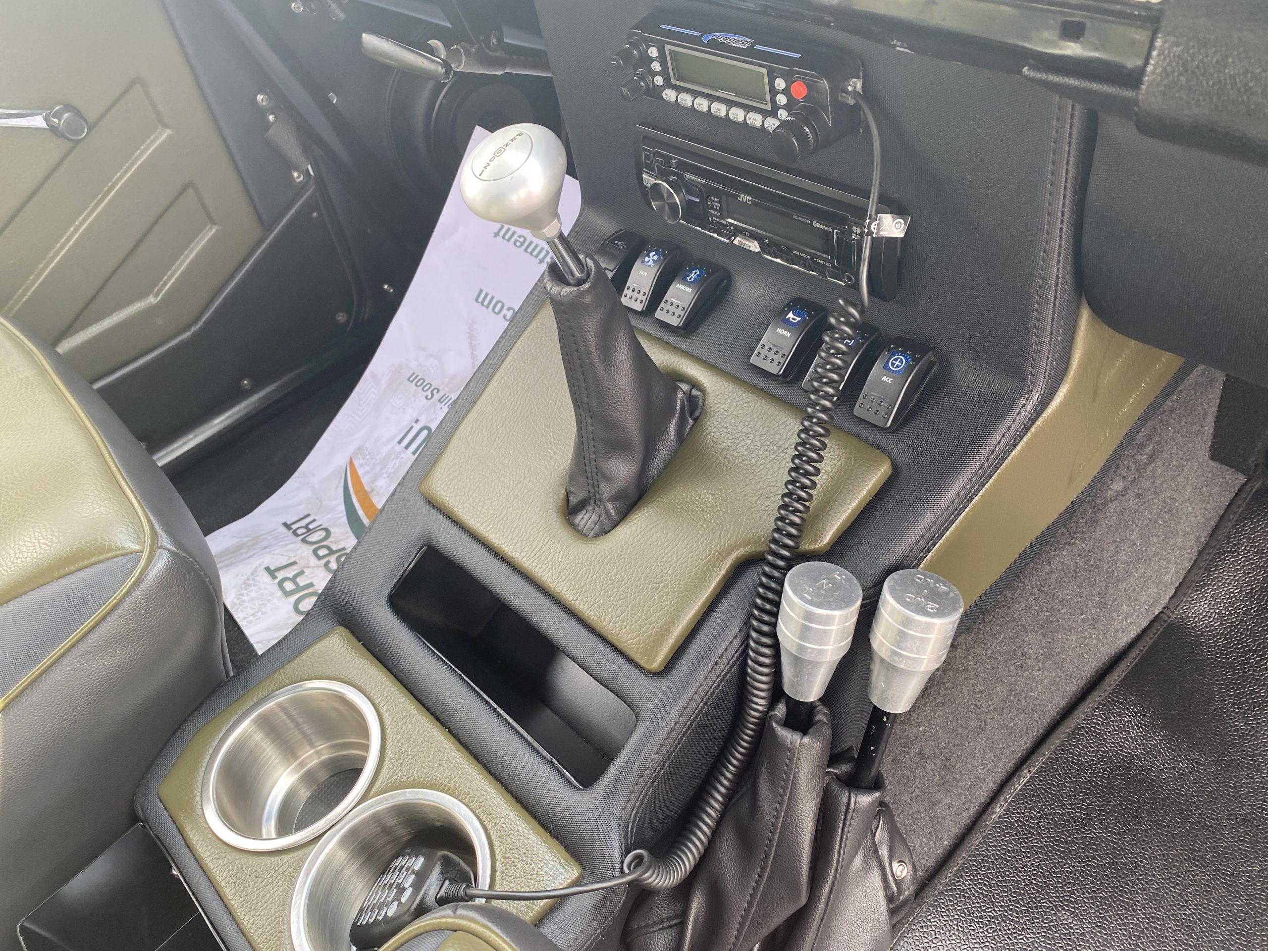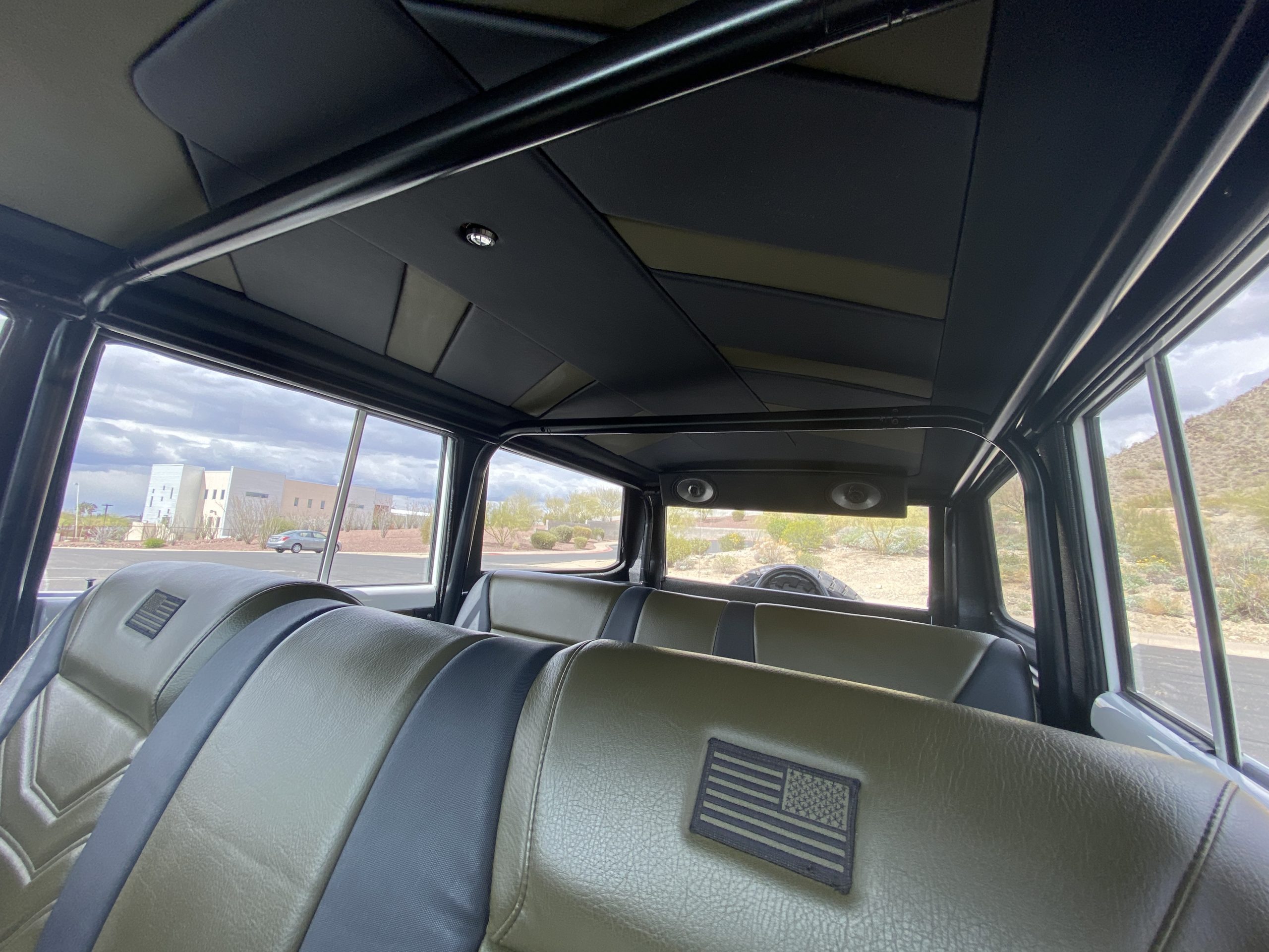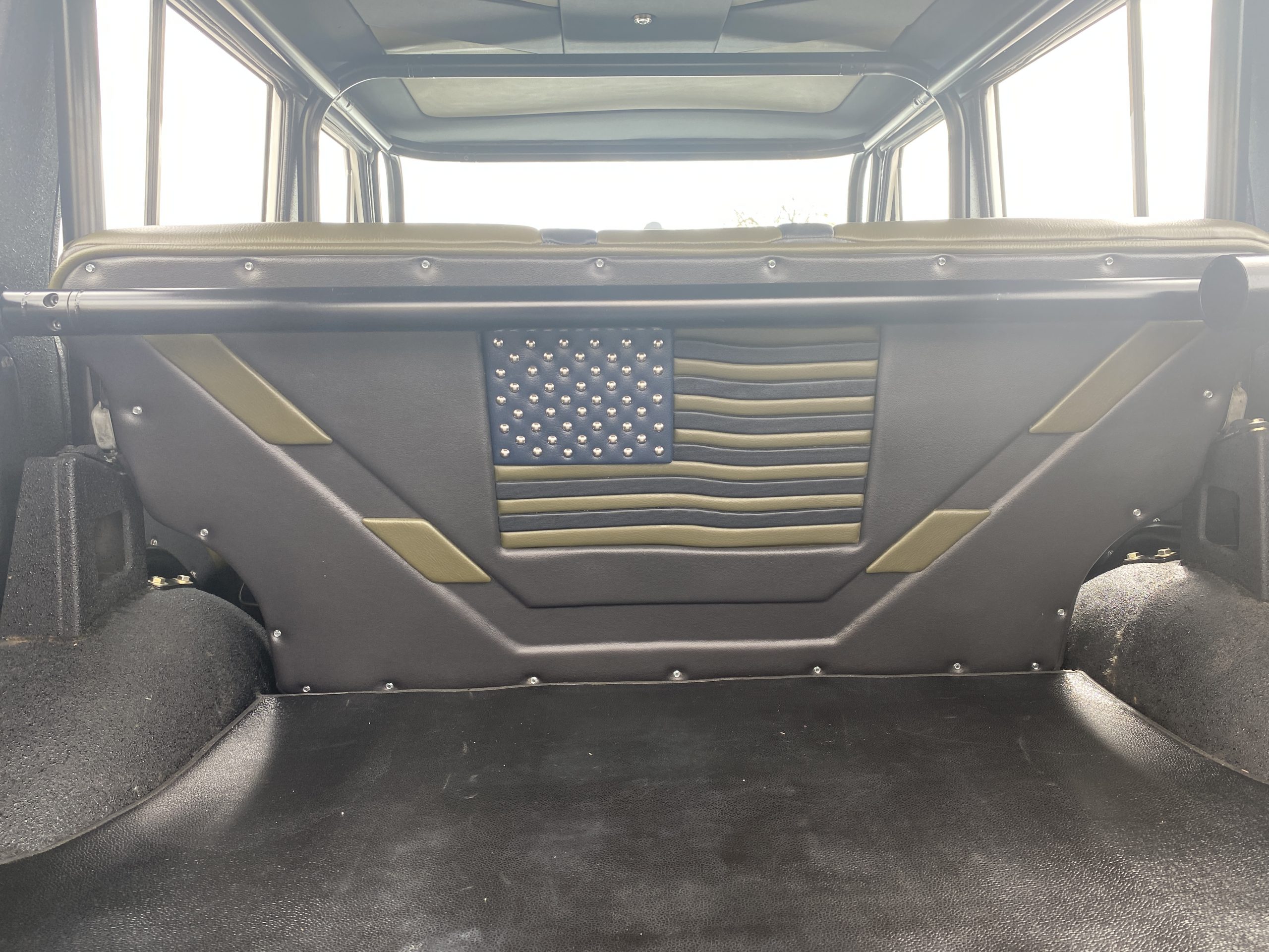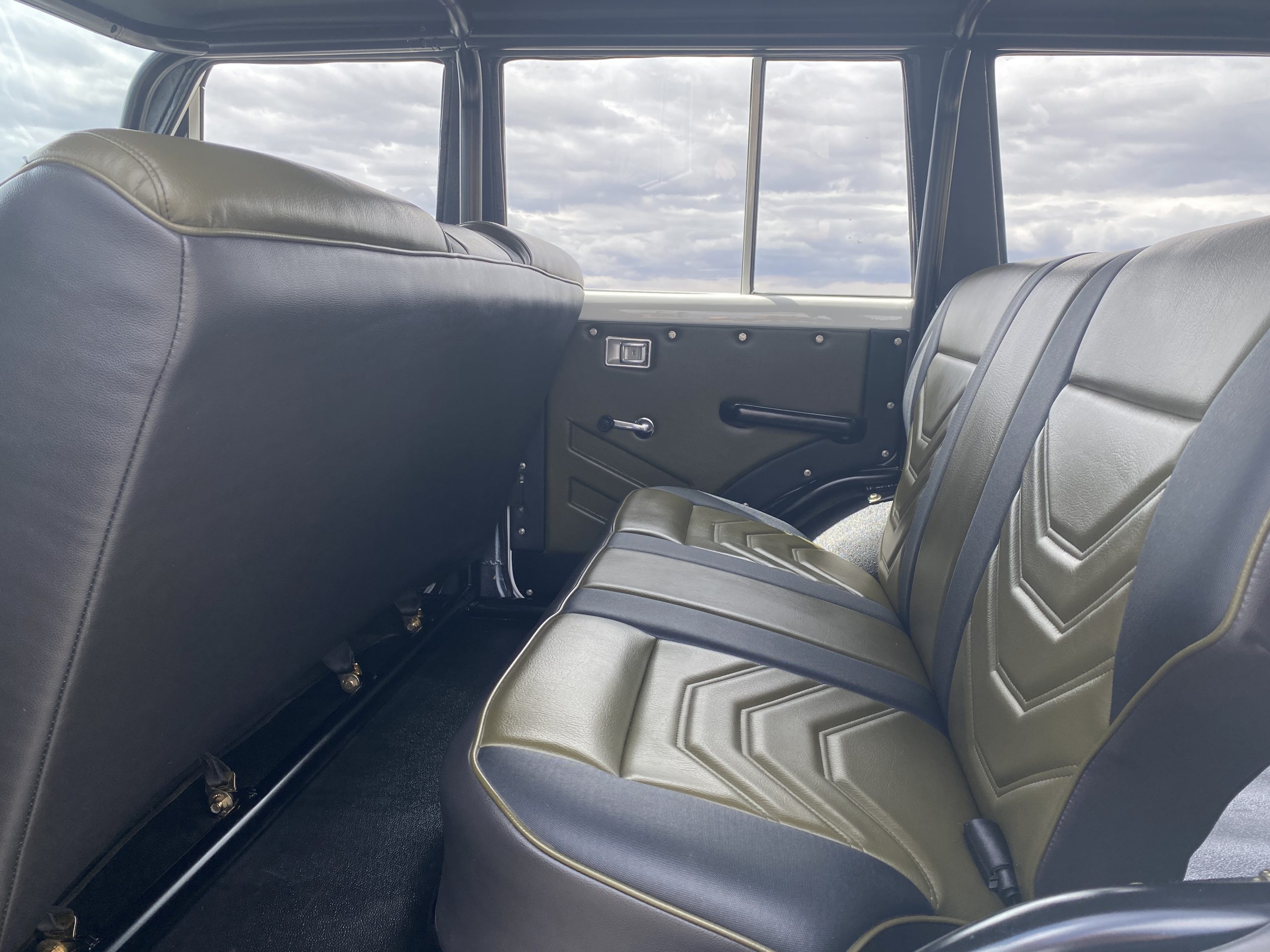 The interior is equally custom and matches the exterior like a glove. You’ll notice immediately the custom black and olive leather upholstery along with its matching leather headliner and door panels. Dynamat sound deadening has been added to the interior, and the floors have been coated in a bedliner material and lined with rubber mats. These additions help to ensure that this will be impervious to rust and will prove to be relatively quiet and comfortable.