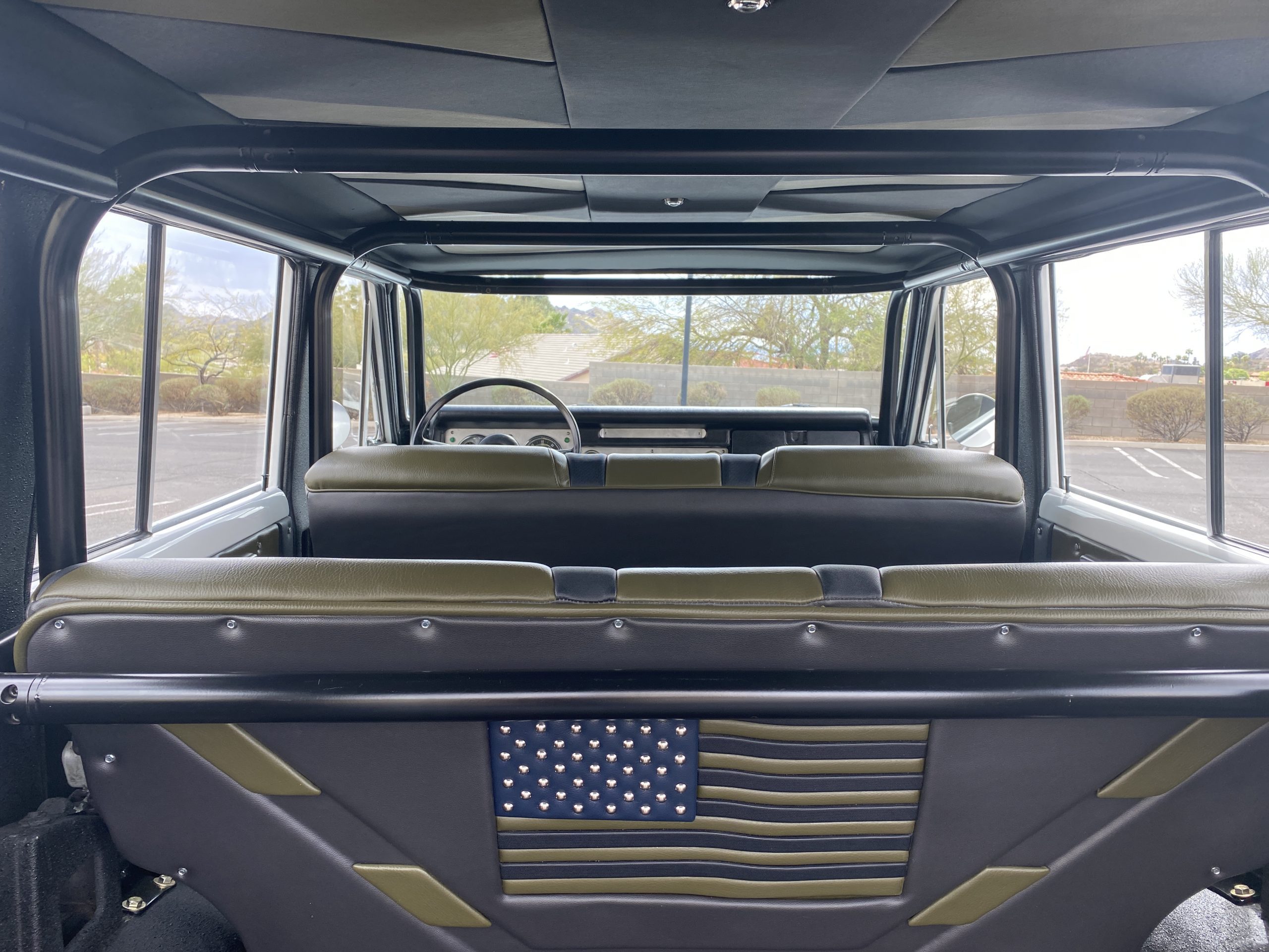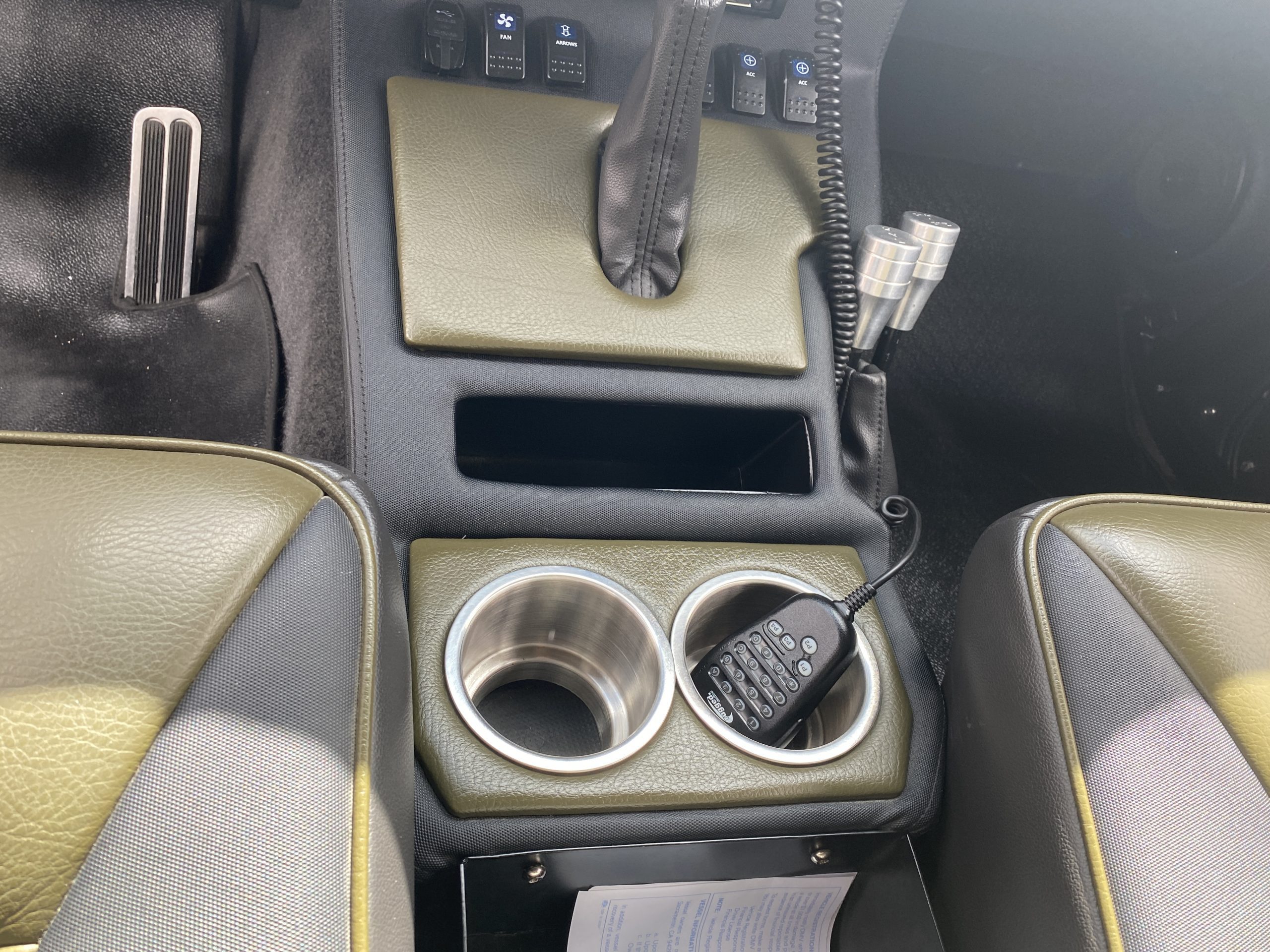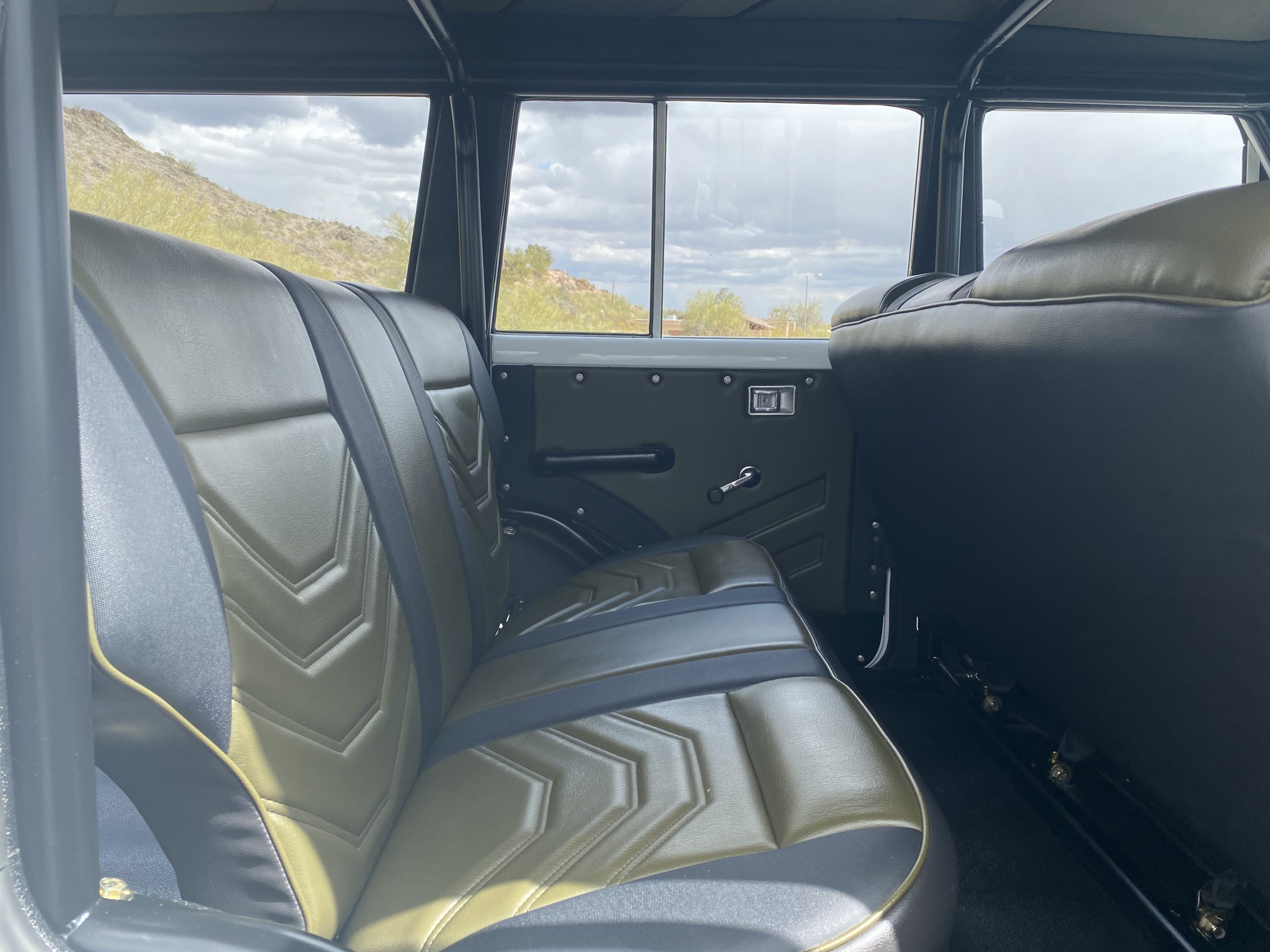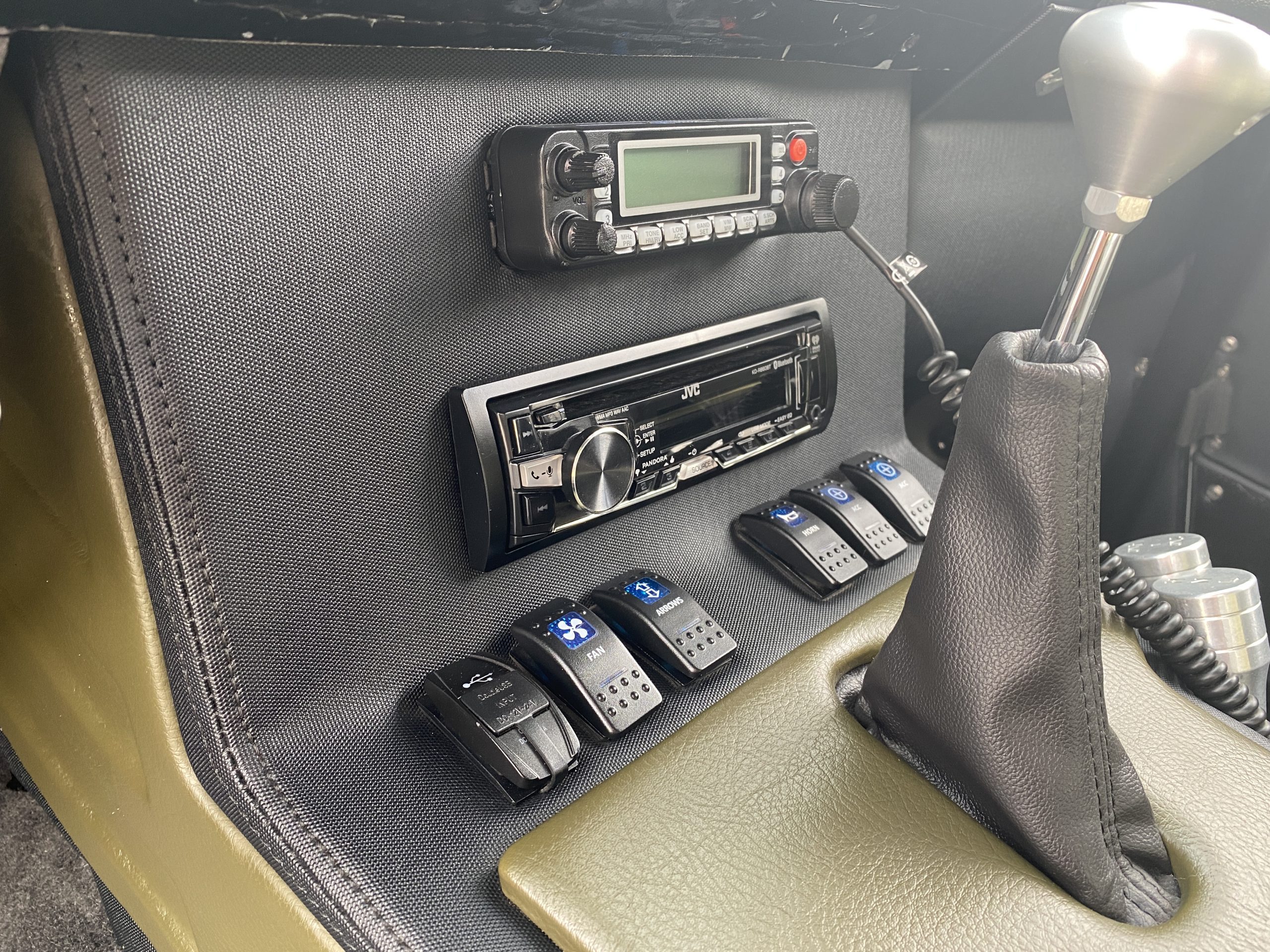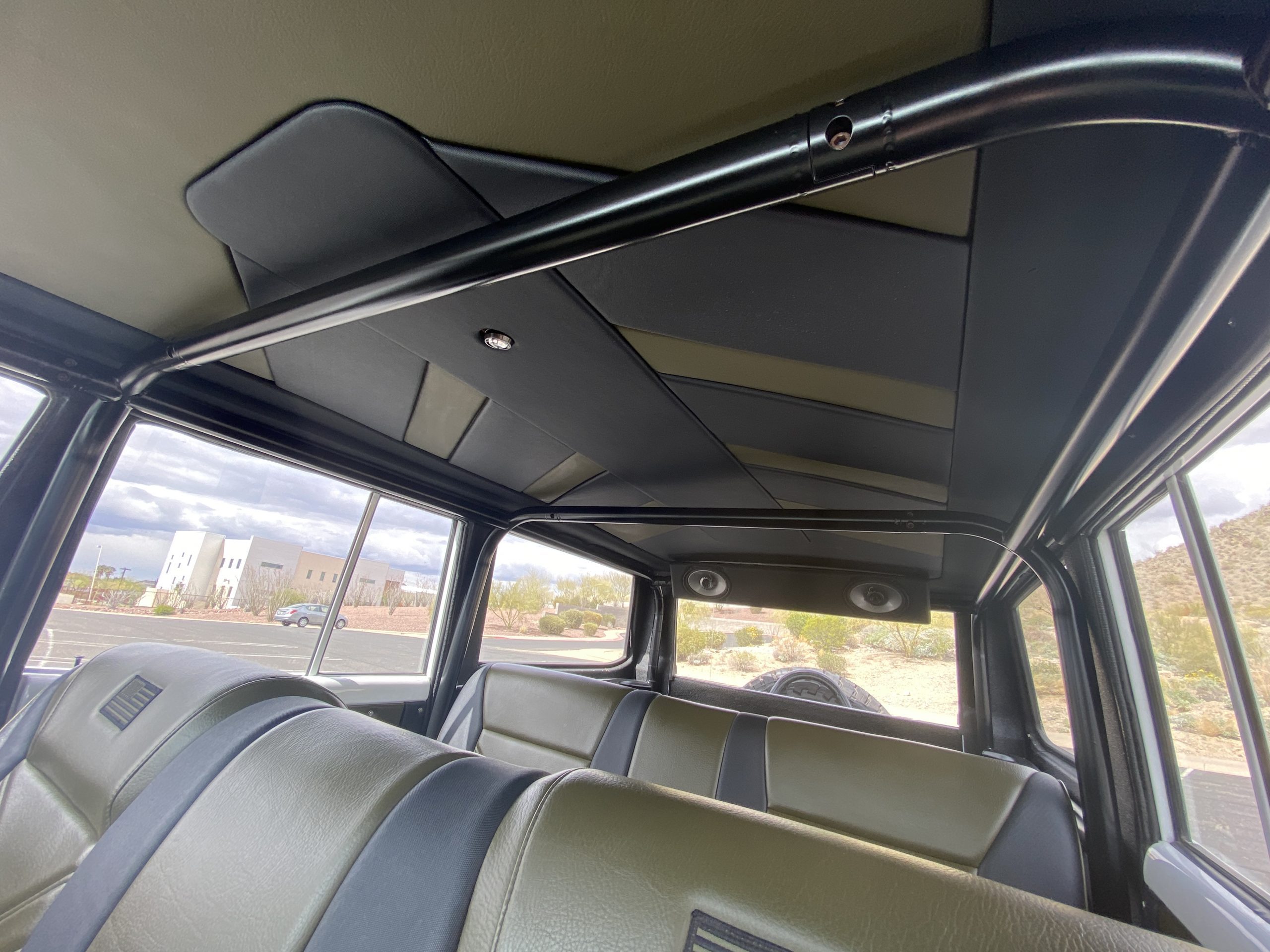 The interior is equally custom and matches the exterior like a glove. You’ll notice immediately the custom black and olive leather upholstery along with its matching leather headliner and door panels. Dynamat sound deadening has been added to the interior, and the floors have been coated in a bedliner material and lined with rubber mats. These additions help to ensure that this will be impervious to rust and will prove to be relatively quiet and comfortable.