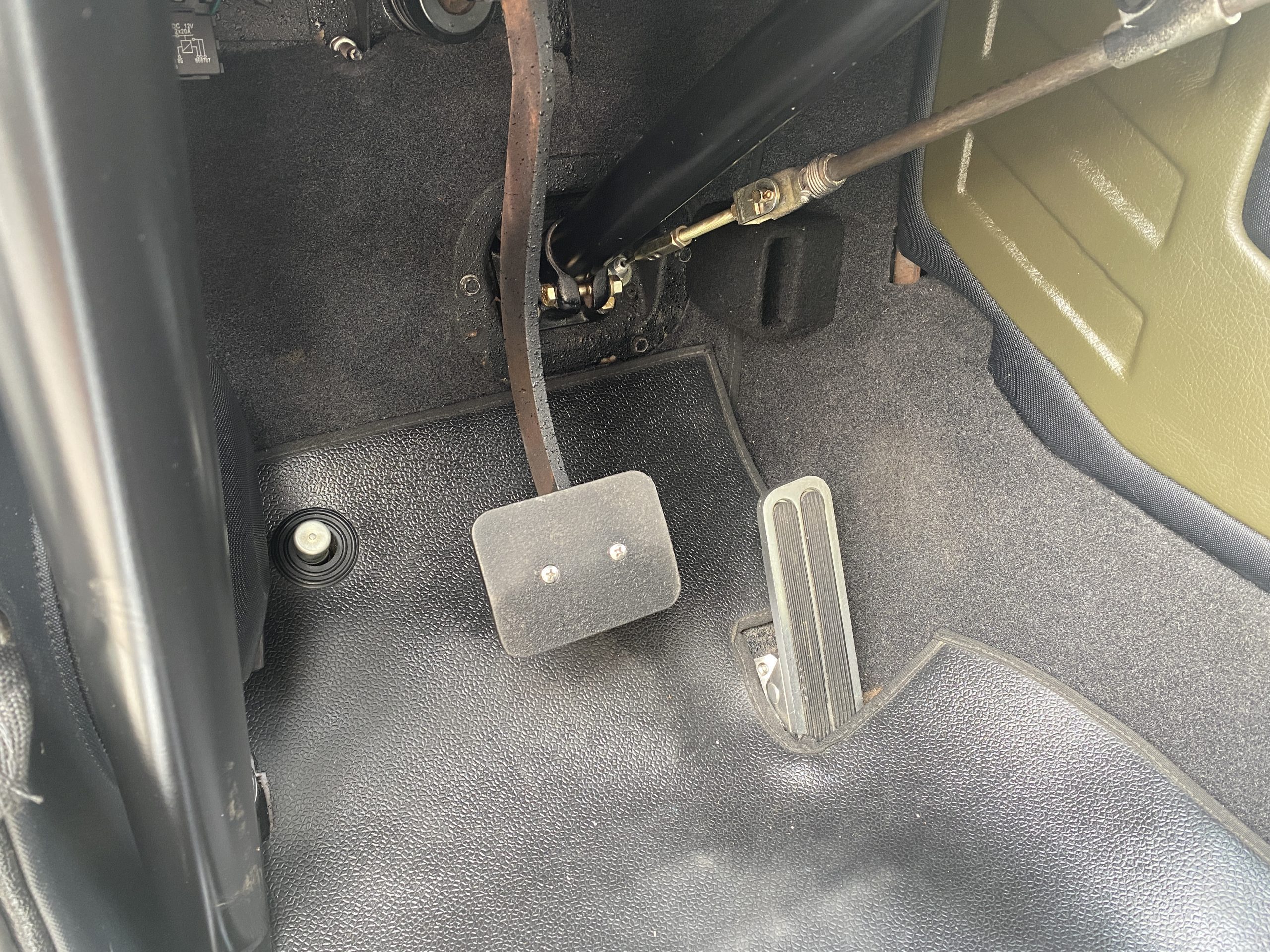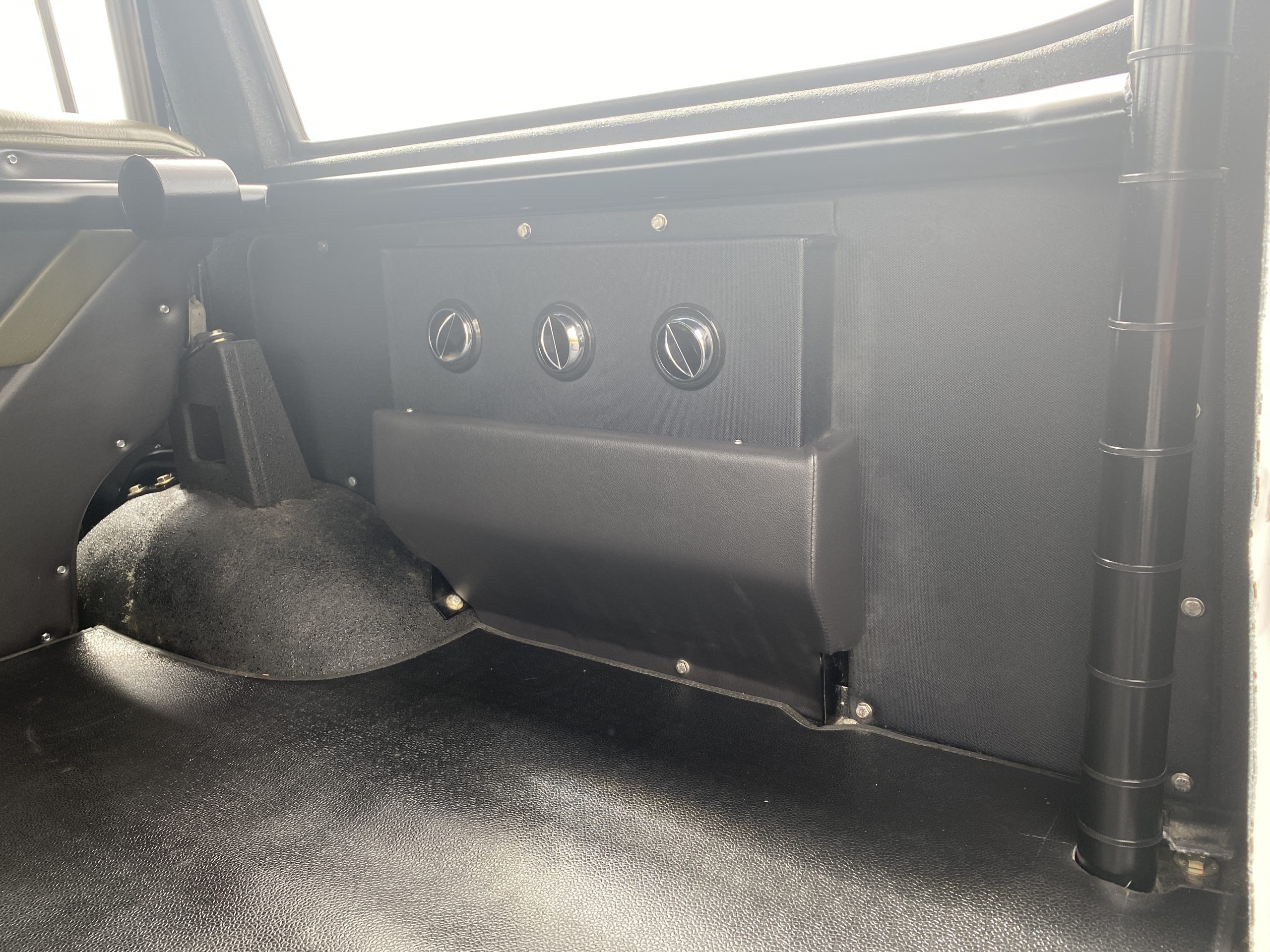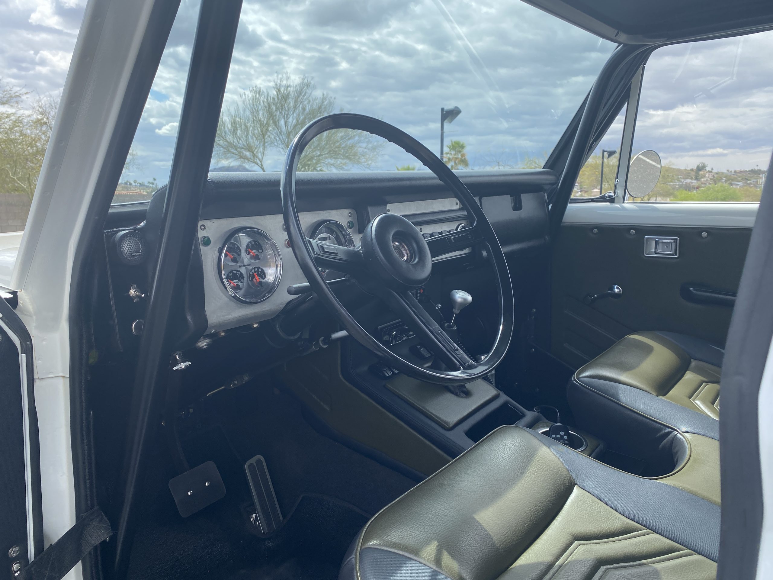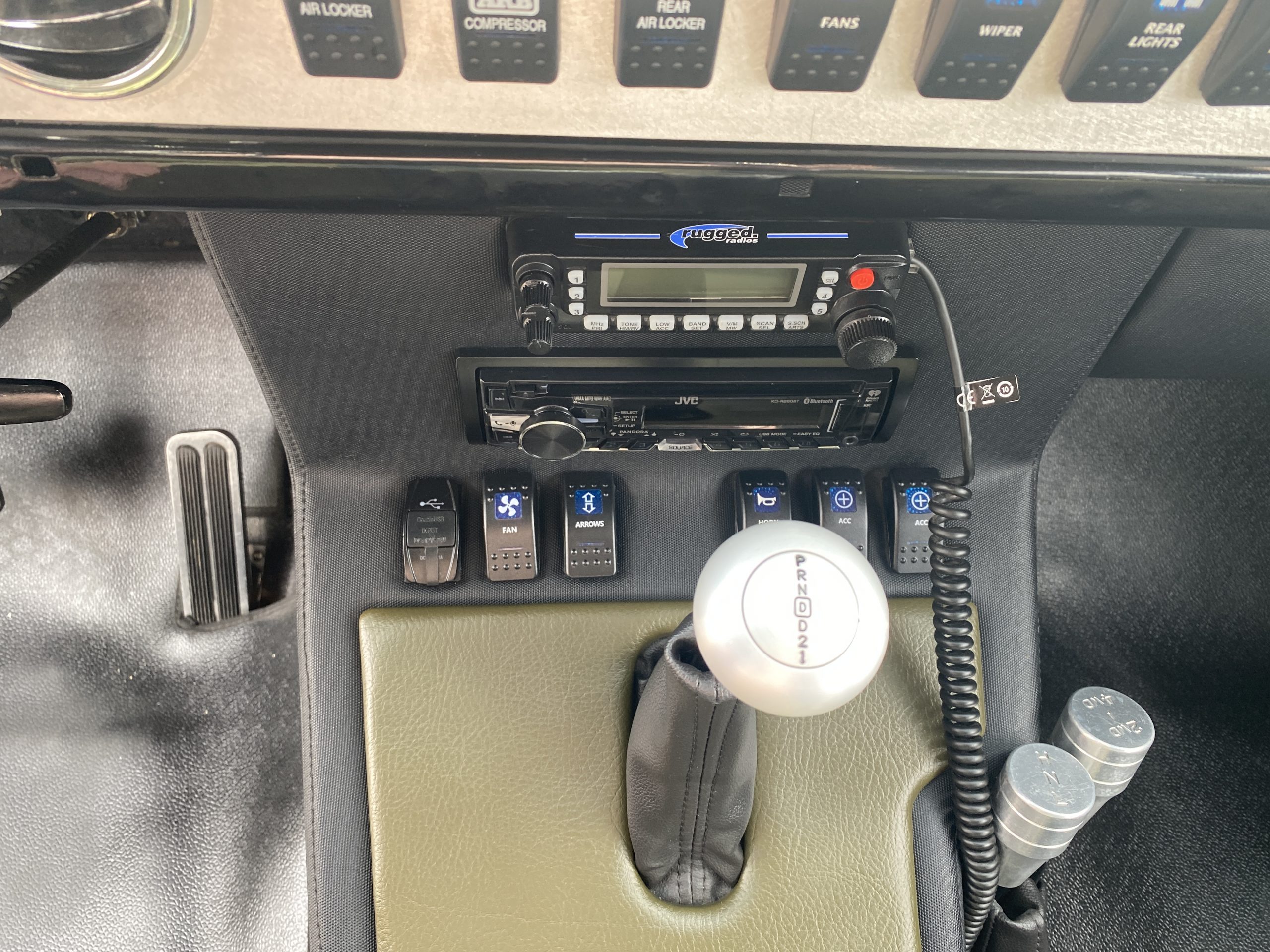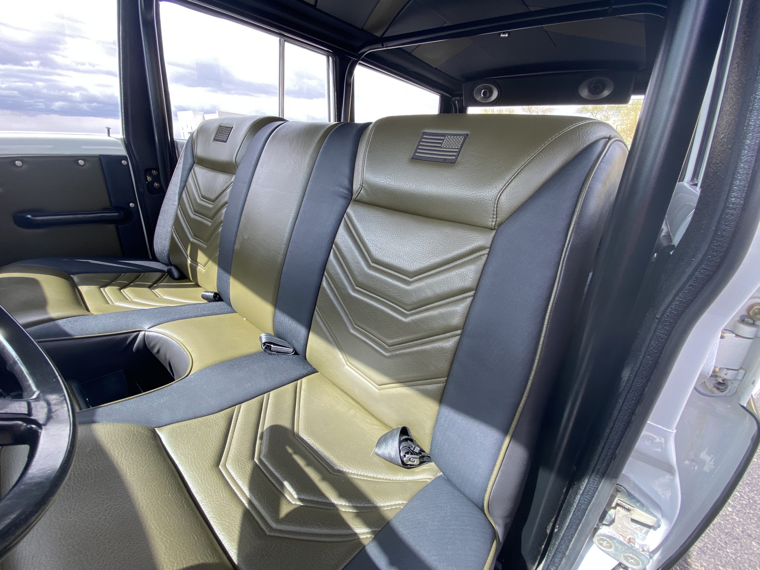The interior is equally custom and matches the exterior like a glove. You’ll notice immediately the custom black and olive leather upholstery along with its matching leather headliner and door panels. Dynamat sound deadening has been added to the interior, and the floors have been coated in a bedliner material and lined with rubber mats. These additions help to ensure that this will be impervious to rust and will prove to be relatively quiet and comfortable.