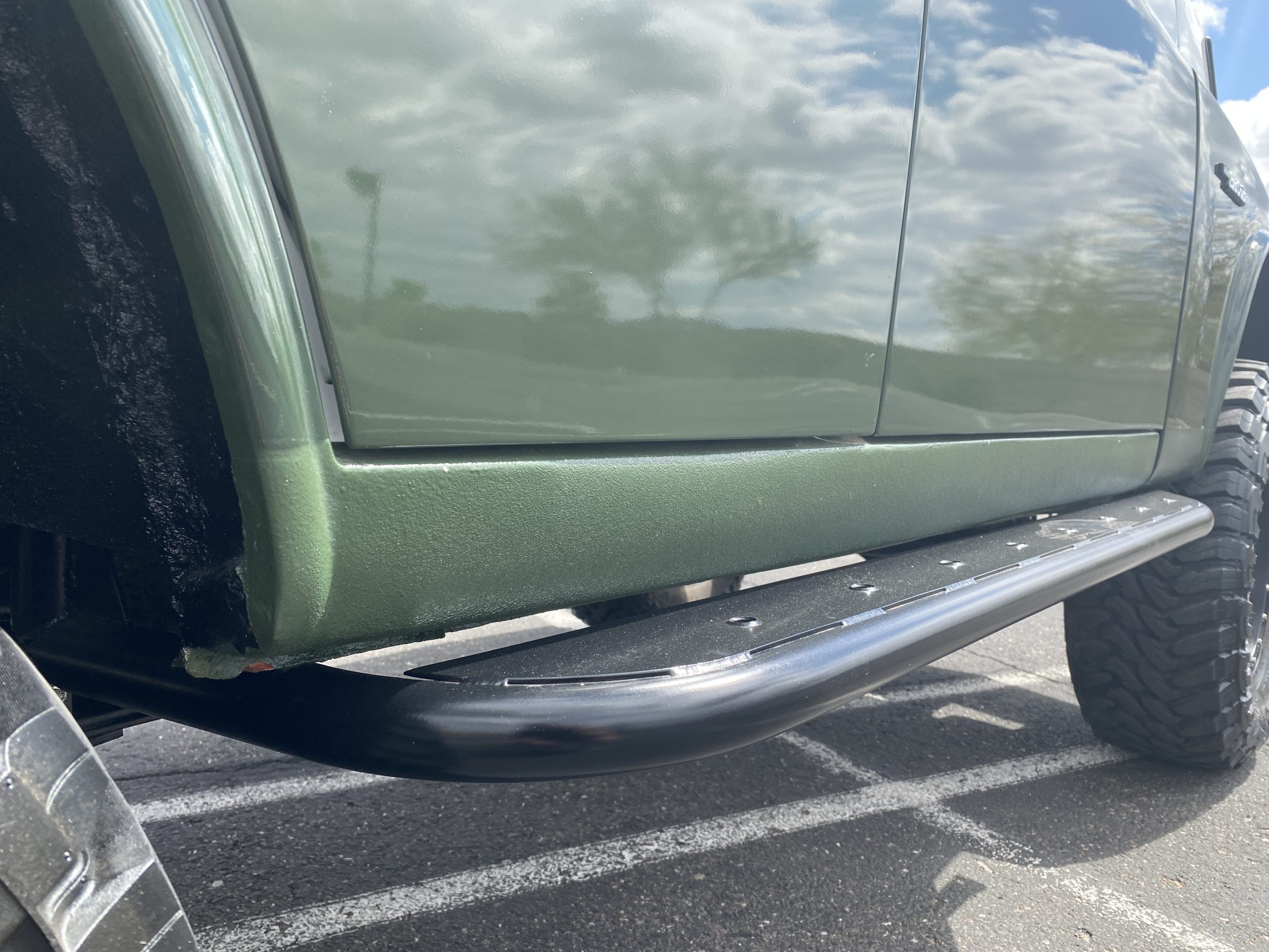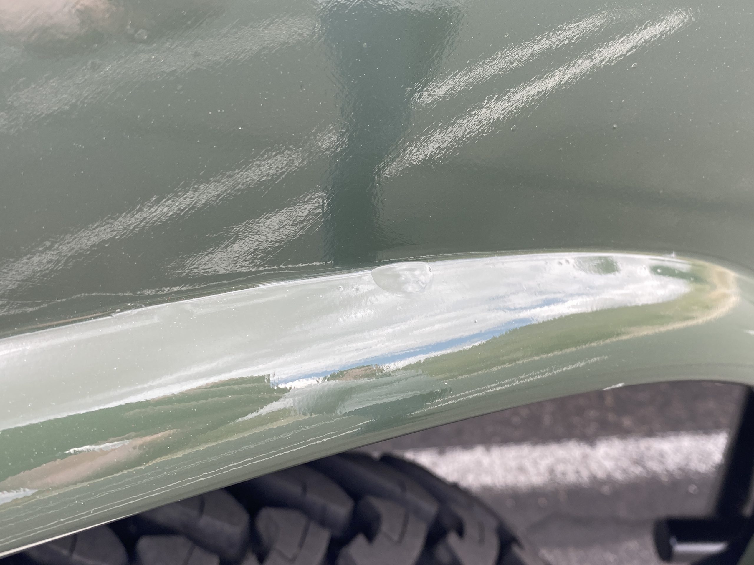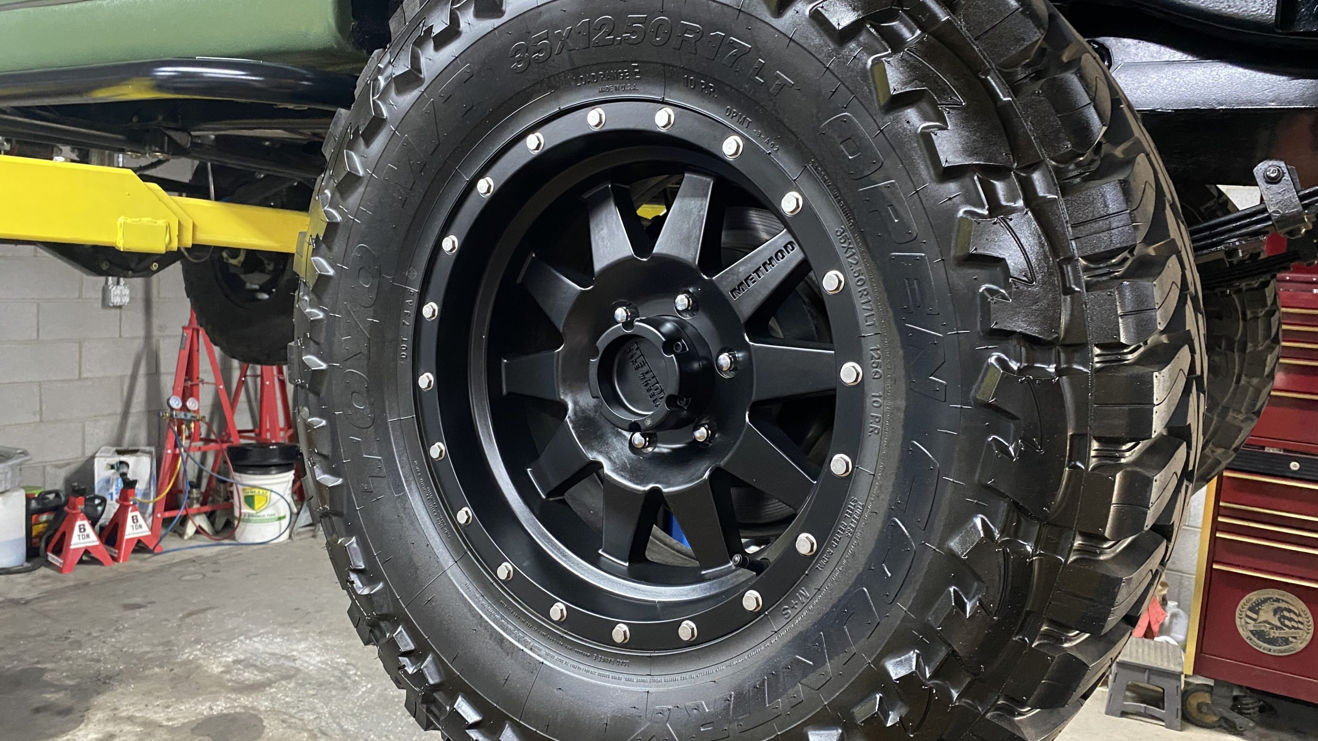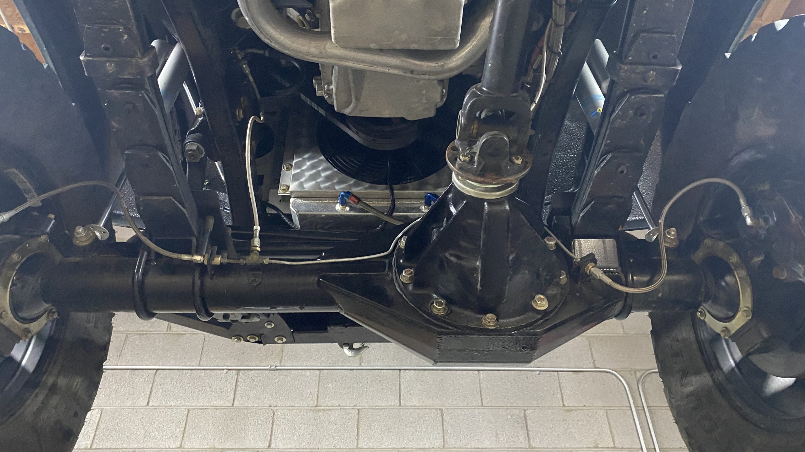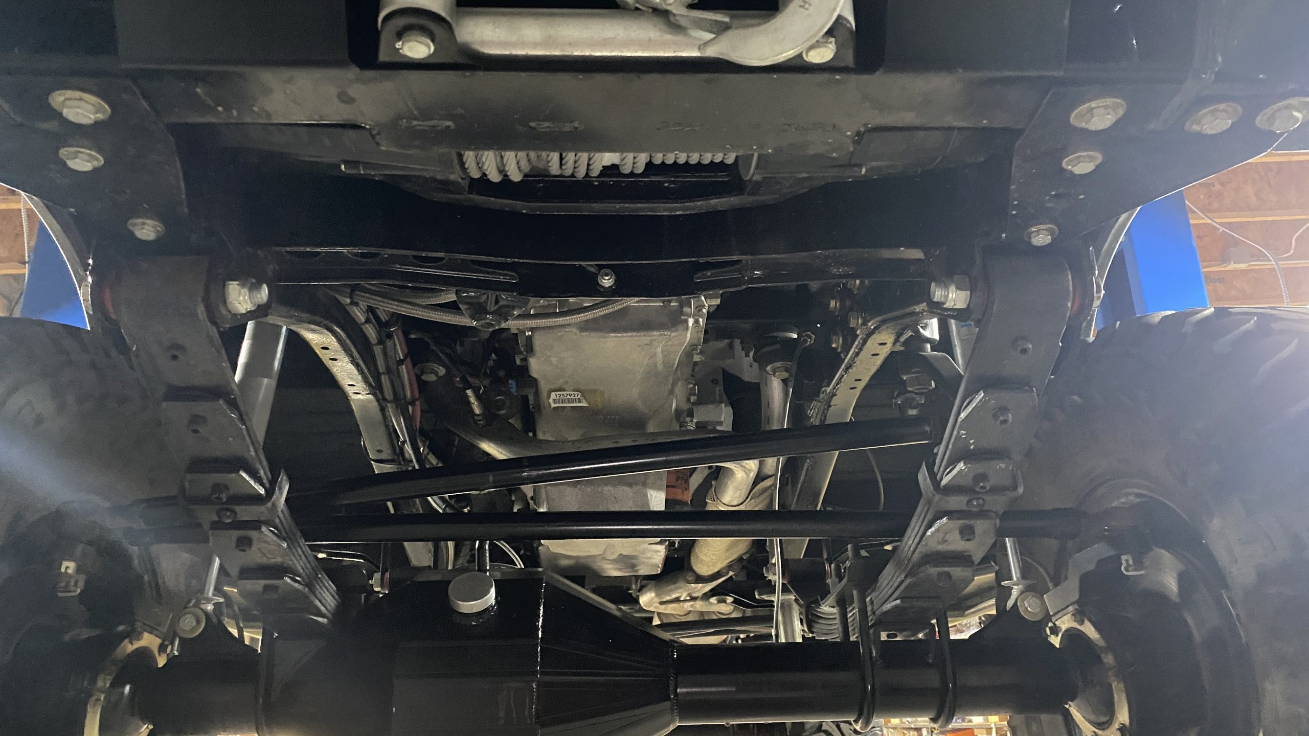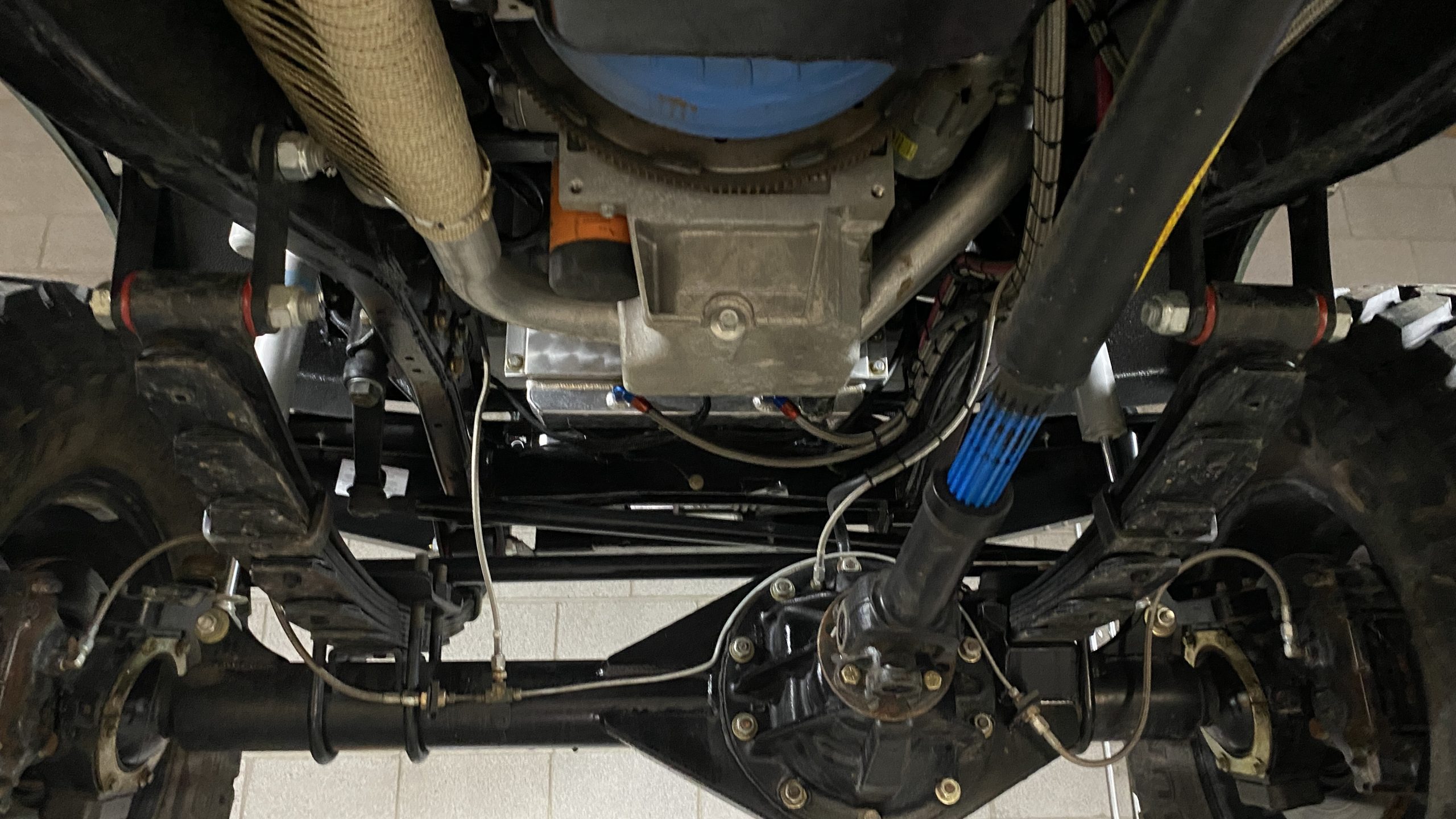 The interior is equally custom and matches the exterior like a glove. You’ll notice immediately the custom black and olive leather upholstery along with its matching leather headliner and door panels. Dynamat sound deadening has been added to the interior, and the floors have been coated in a bedliner material and lined with rubber mats. These additions help to ensure that this will be impervious to rust and will prove to be relatively quiet and comfortable.