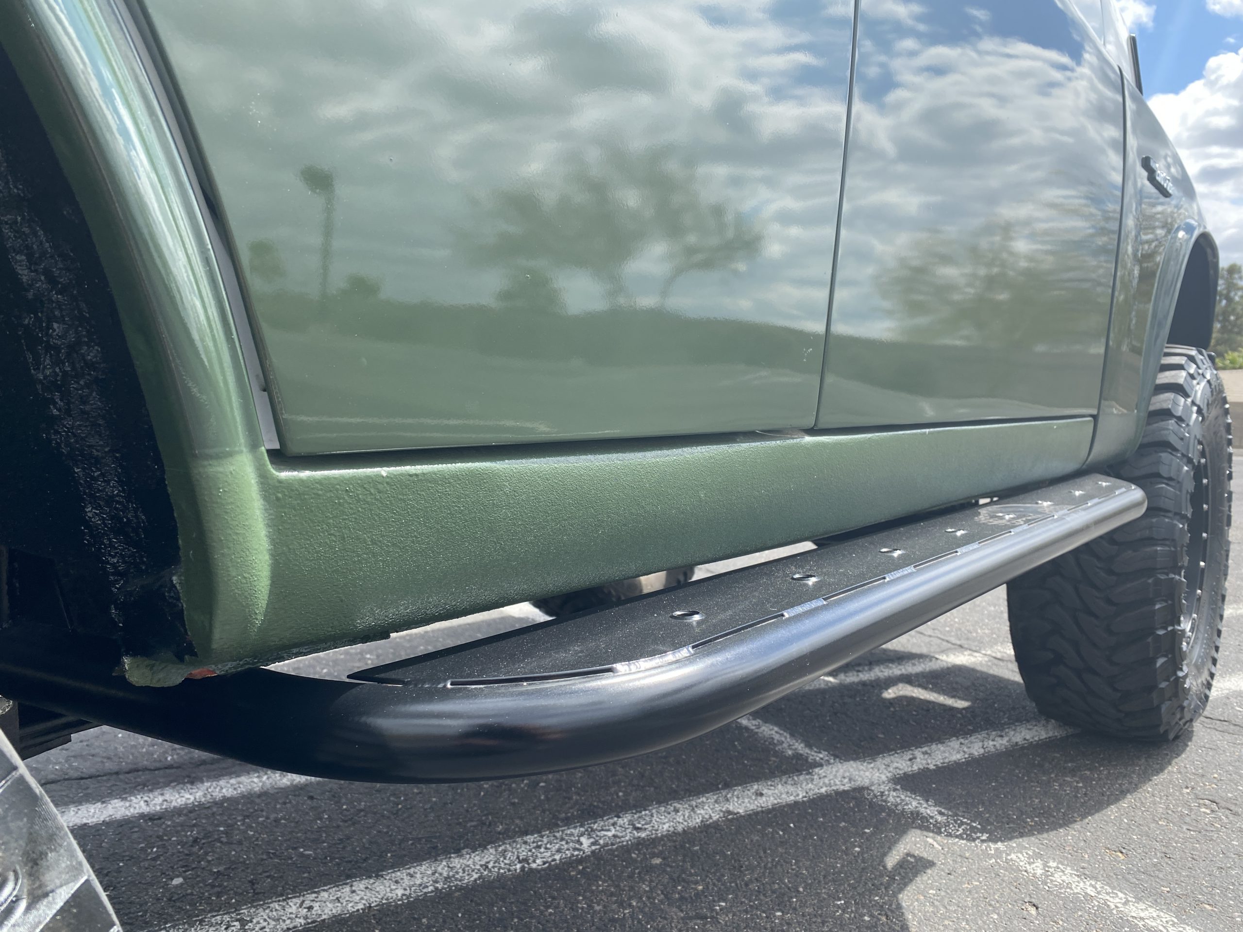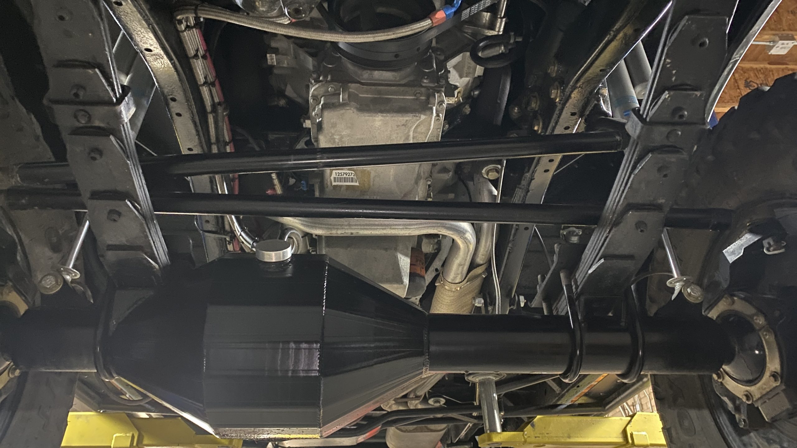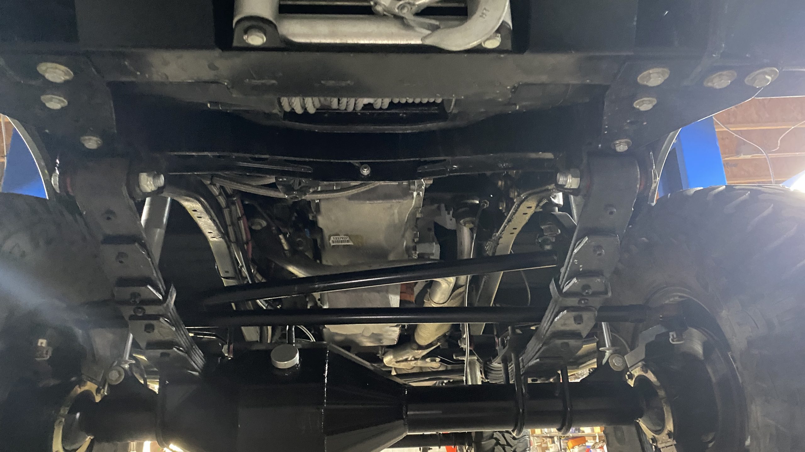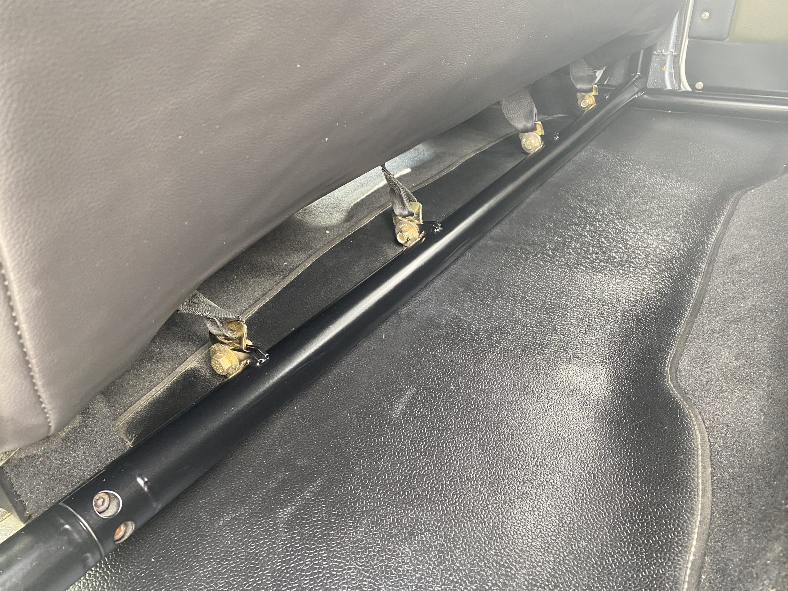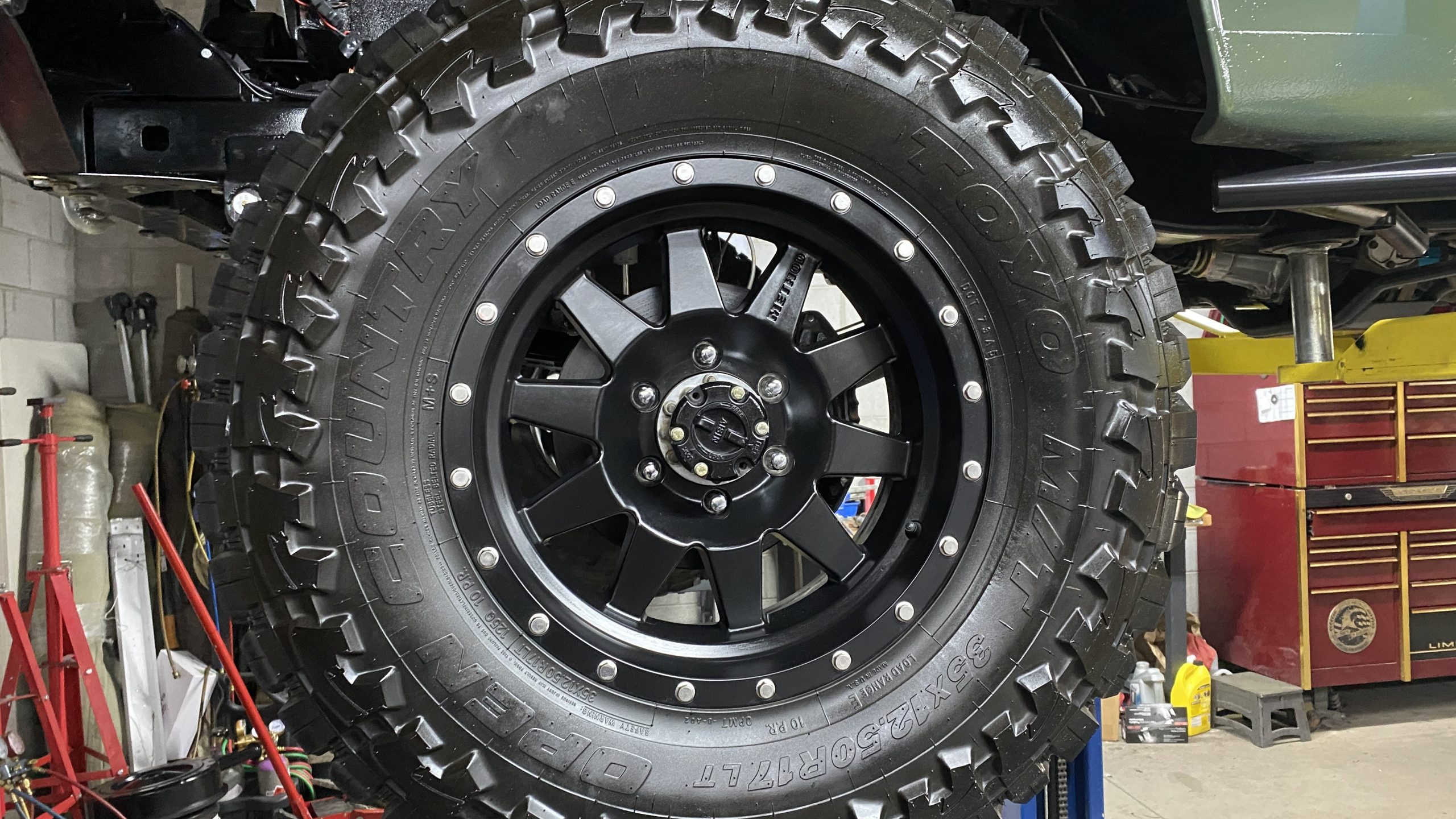 The interior is equally custom and matches the exterior like a glove. You’ll notice immediately the custom black and olive leather upholstery along with its matching leather headliner and door panels. Dynamat sound deadening has been added to the interior, and the floors have been coated in a bedliner material and lined with rubber mats. These additions help to ensure that this will be impervious to rust and will prove to be relatively quiet and comfortable.