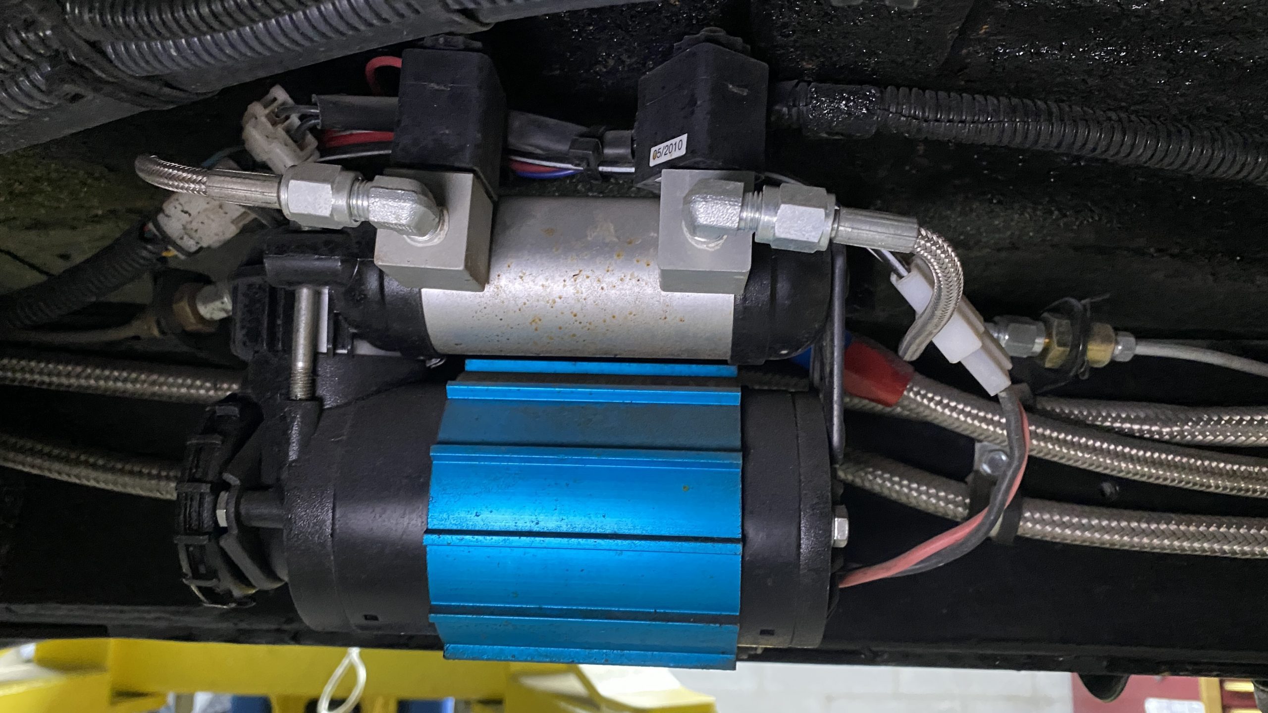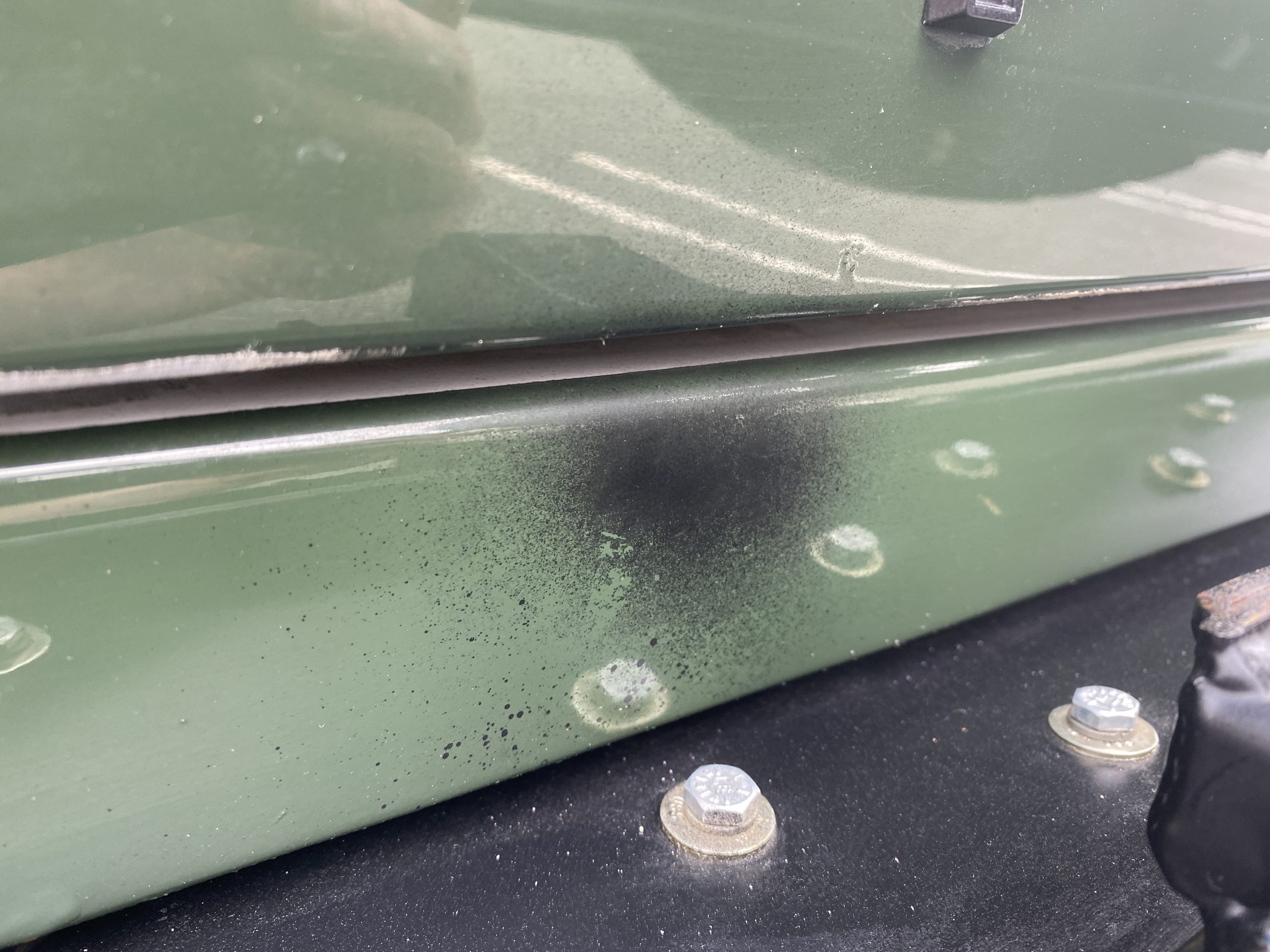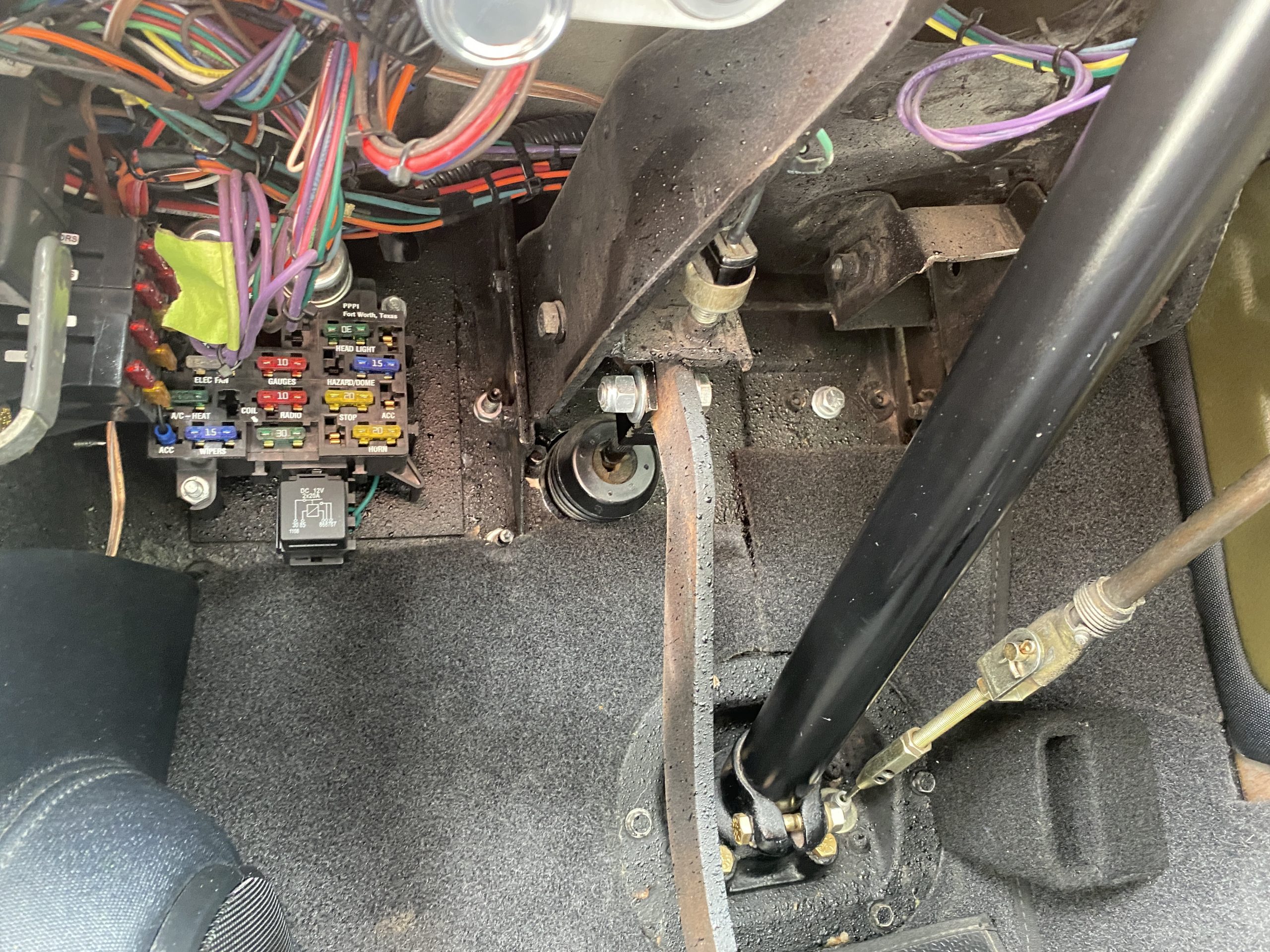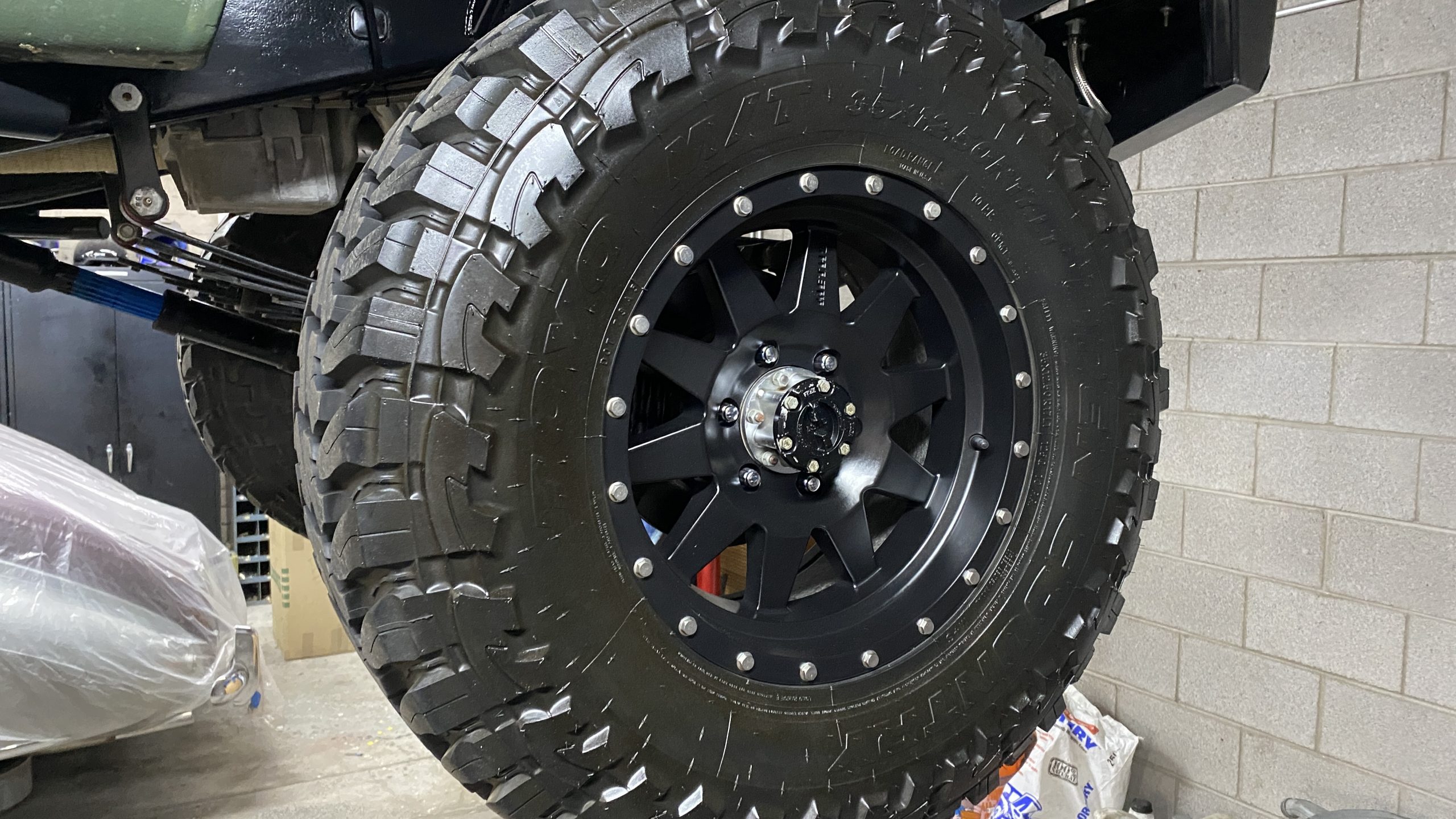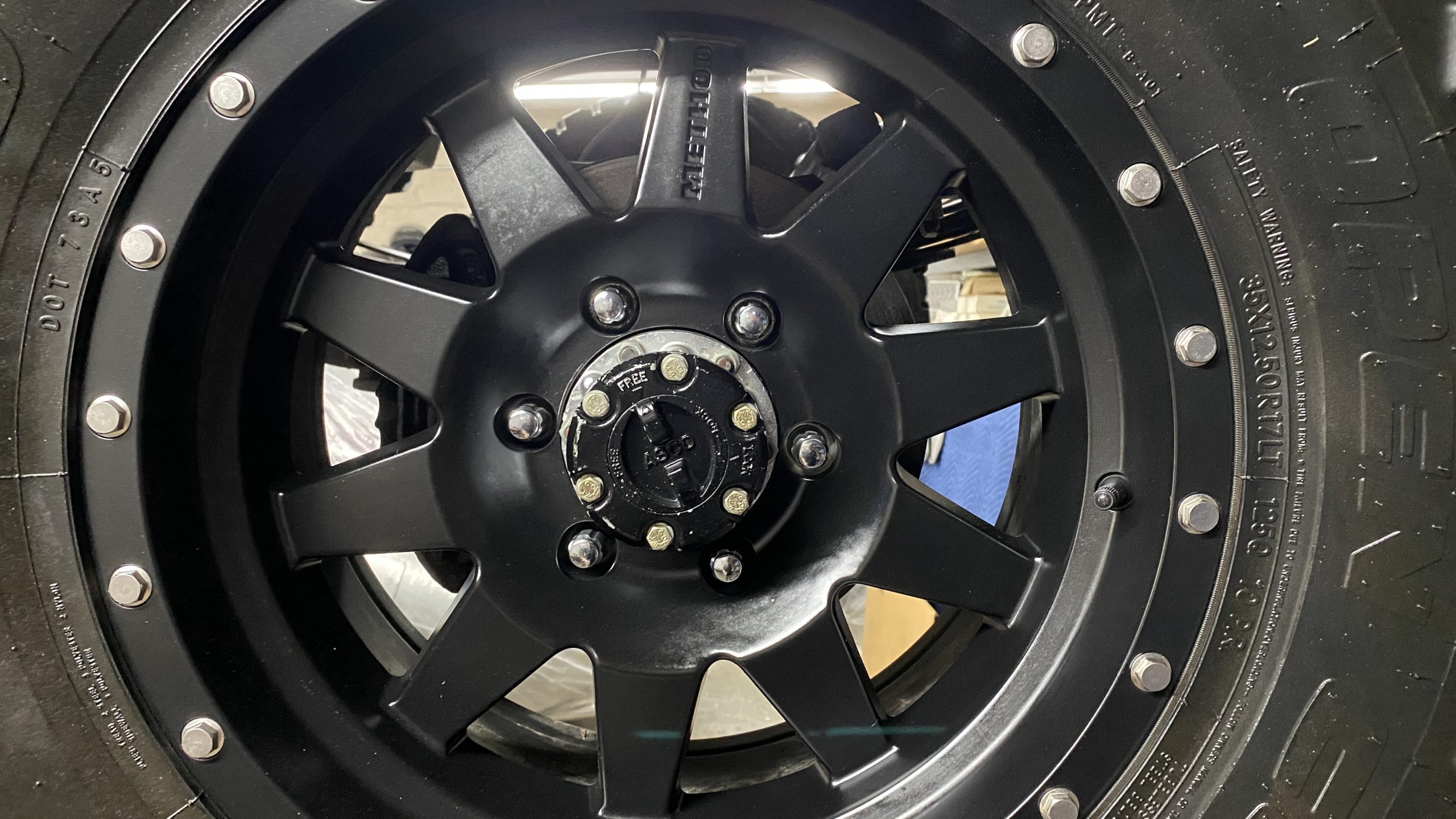 The interior is equally custom and matches the exterior like a glove. You’ll notice immediately the custom black and olive leather upholstery along with its matching leather headliner and door panels. Dynamat sound deadening has been added to the interior, and the floors have been coated in a bedliner material and lined with rubber mats. These additions help to ensure that this will be impervious to rust and will prove to be relatively quiet and comfortable.