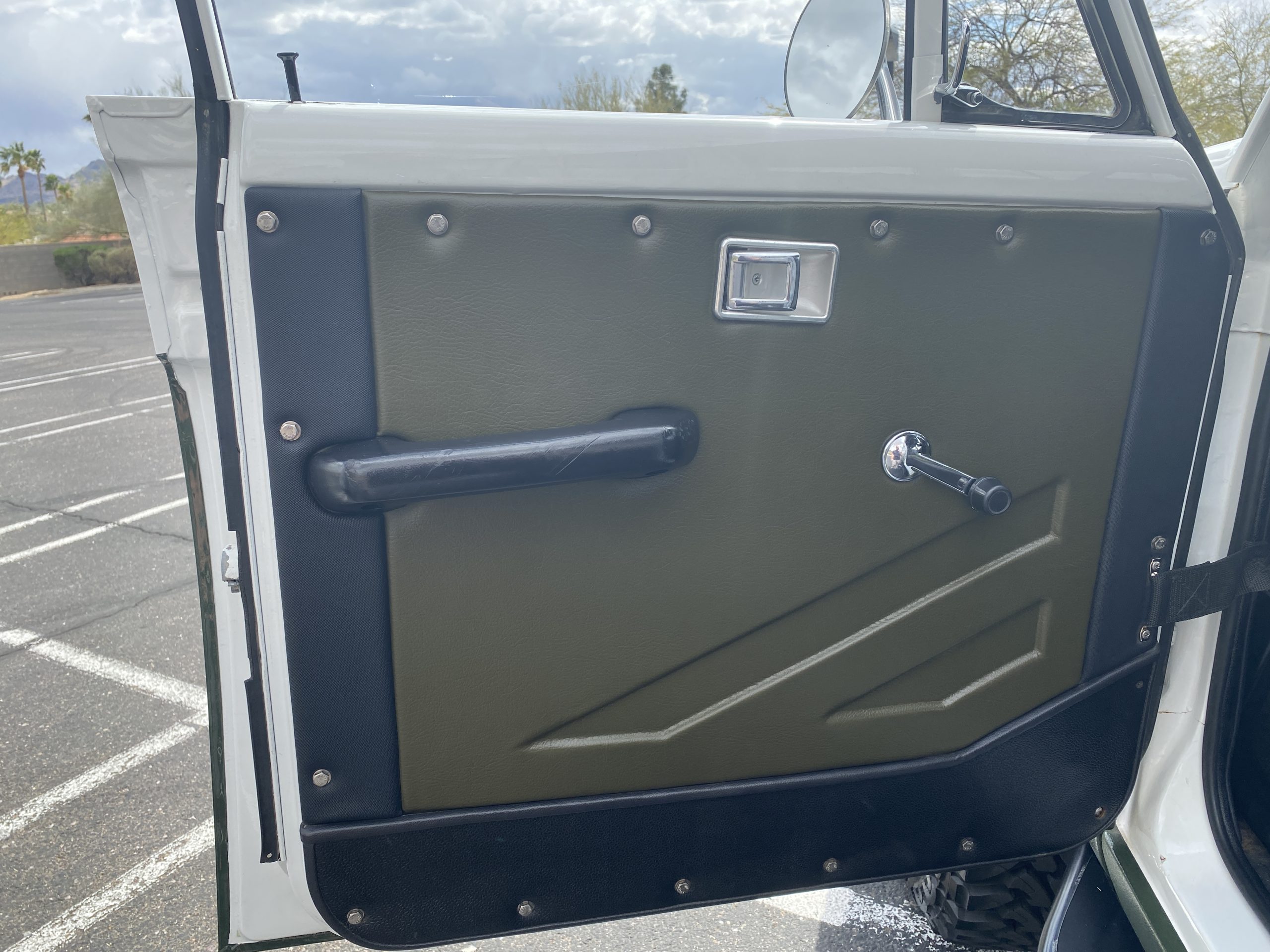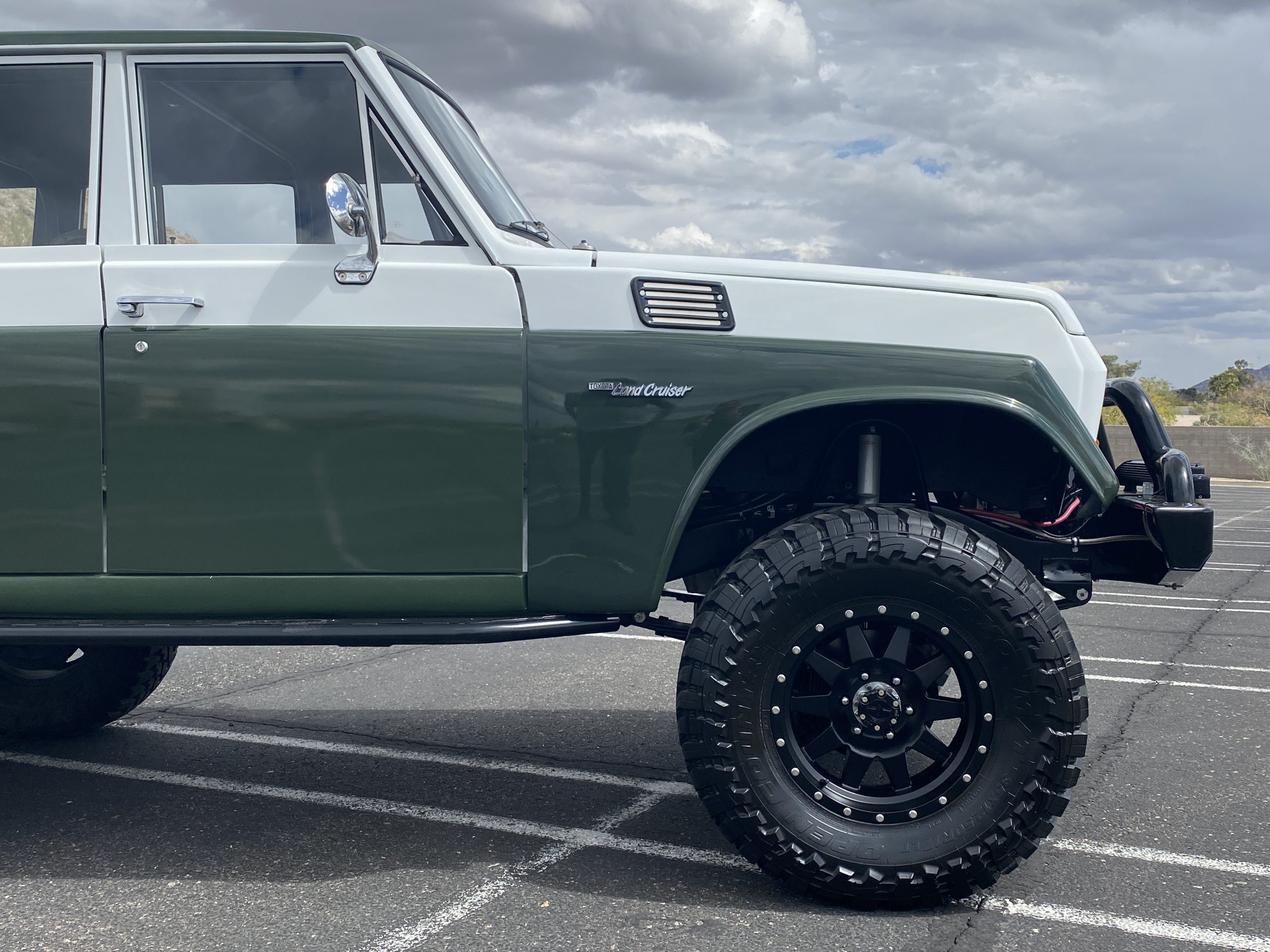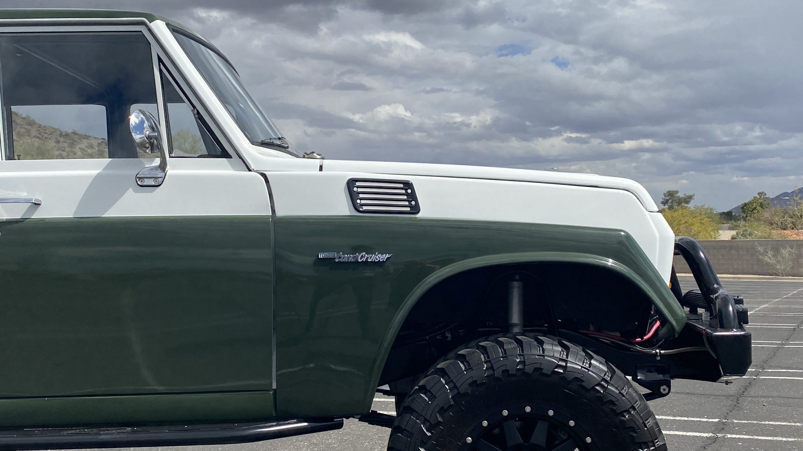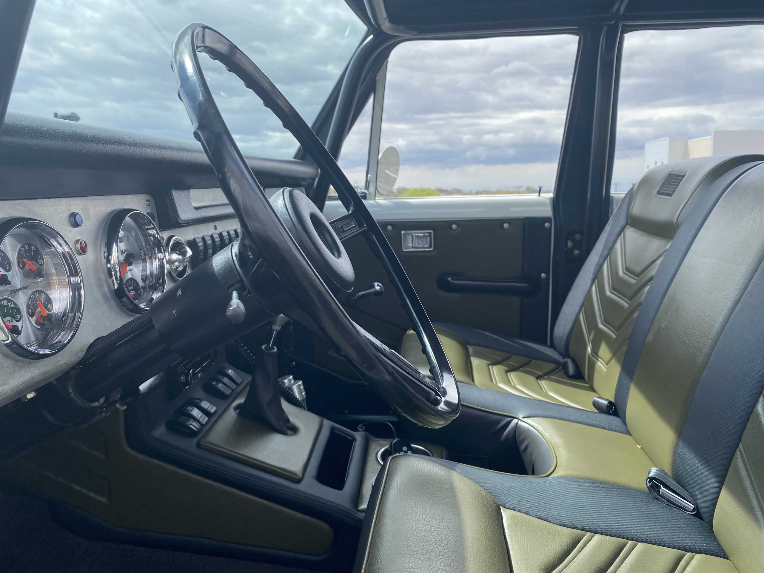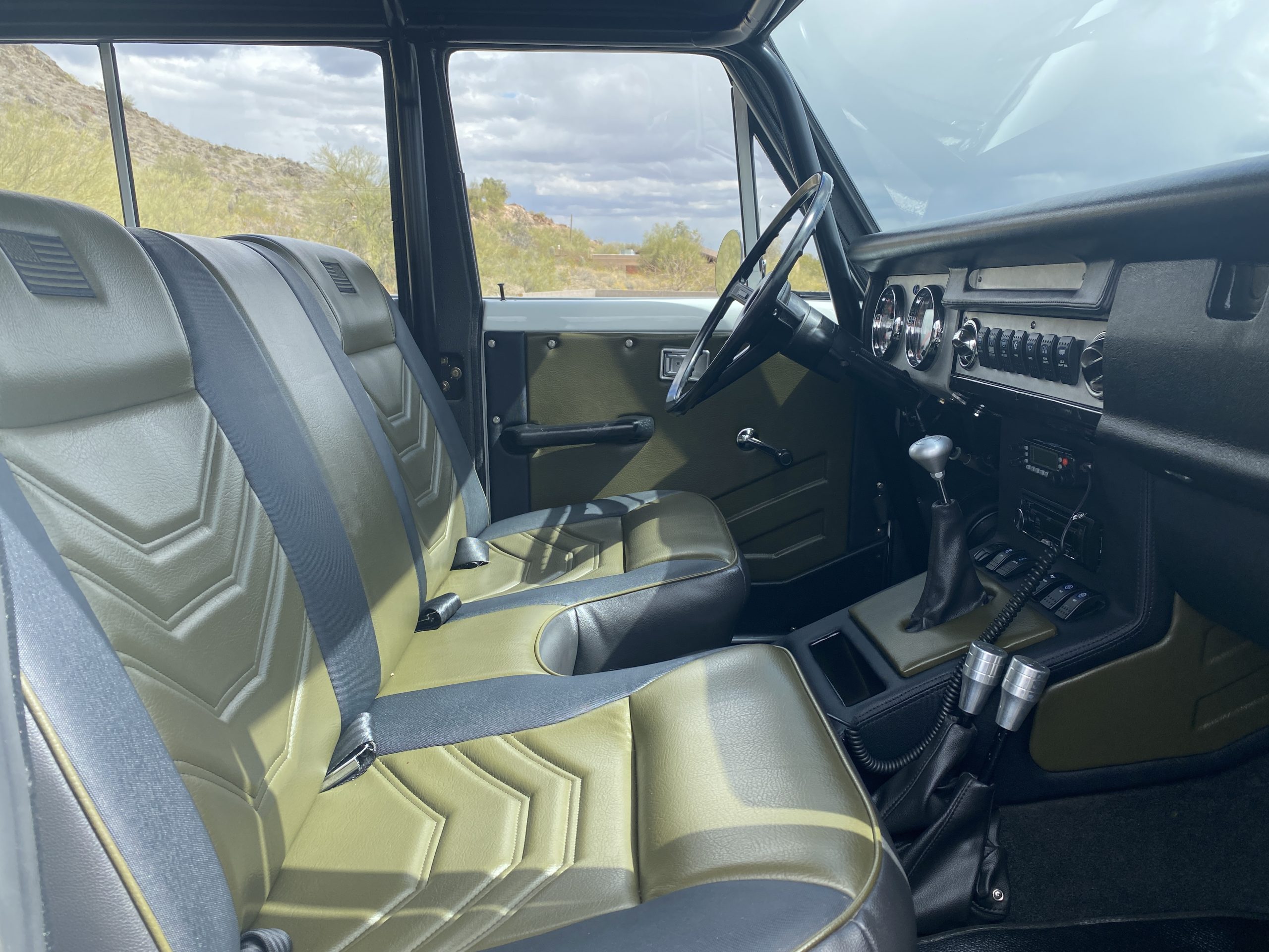The custom two-tone white over dark green paint shows well and is in overall excellent condition. Even in direct sunlight, the car has tremendous depth, shine, and luster. While not free from blemishes, most would be hard pressed to find an issue on initial inspection. The brightwork on this FJ is largely original and in good condition with some minor scratches and some very minor pitting, most notably on the door handles. The custom ARB front bumper with integrated WARN Zeon 10 winch looks right at home on this Toyota and many will notice the three LED light bars seated on the bumper, which pair well with the aftermarket black LED headlamps and black painted grille. Adding to the overall dark theme of the accessories are 35″ Toyo Open Country M/T tires wrapped around flat-black 17″ Method wheels with Aisin front lockers. Other exterior highlights include removable doors, custom rock sliders and a custom swing-out rear tire carrier.