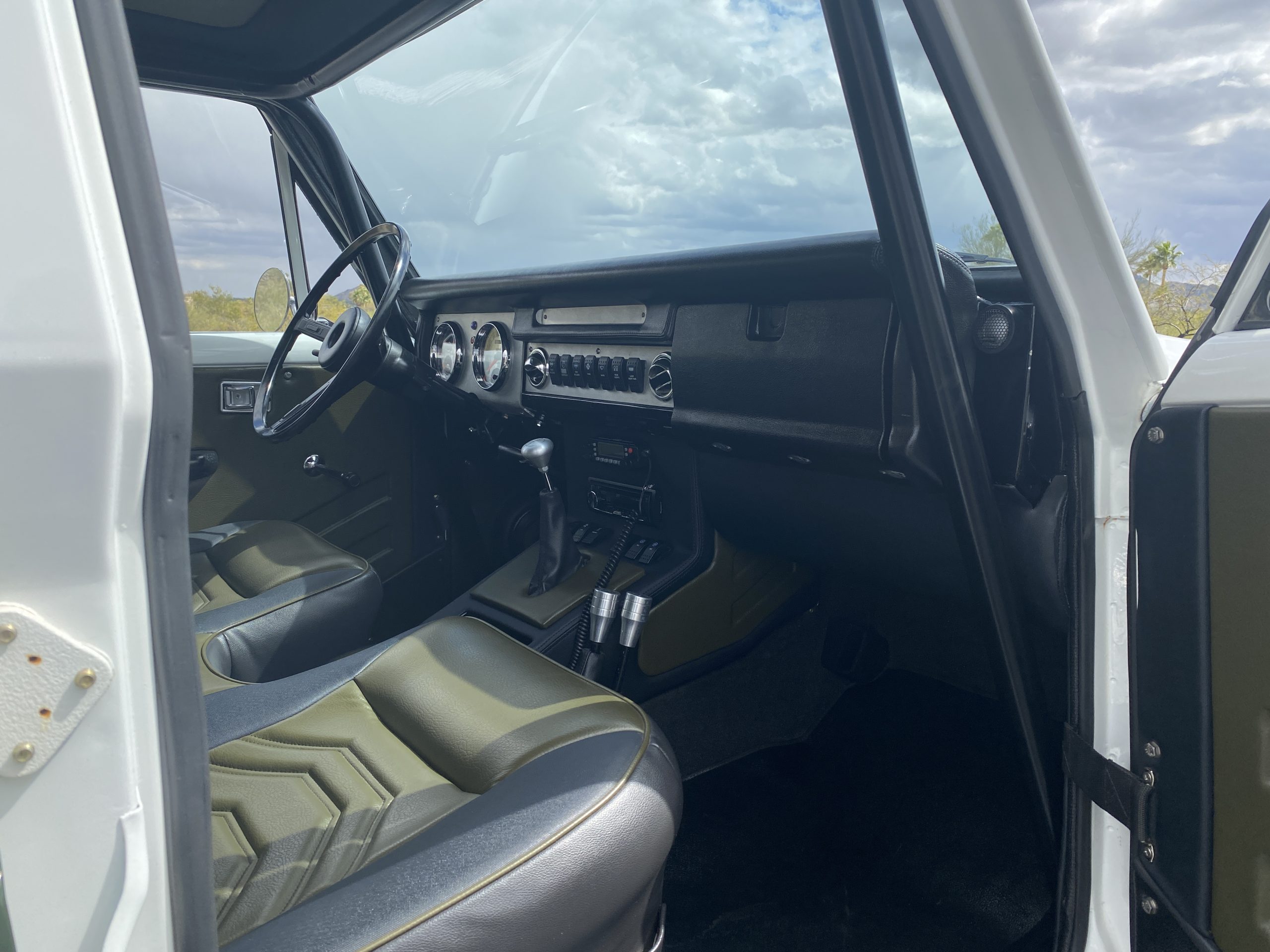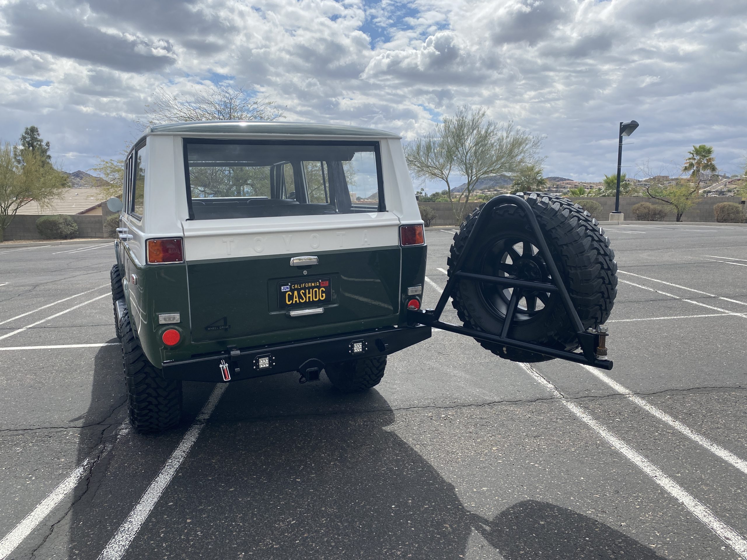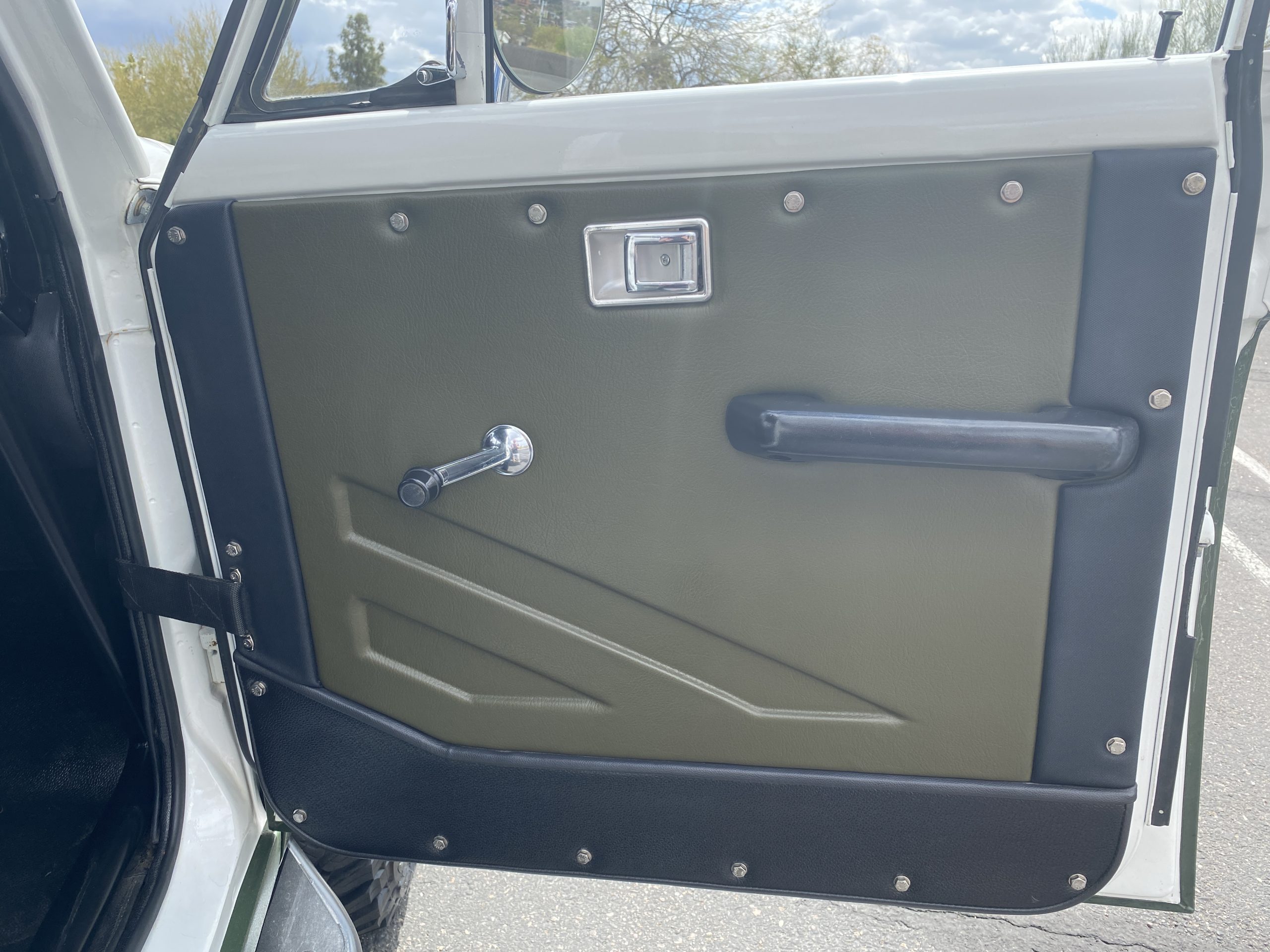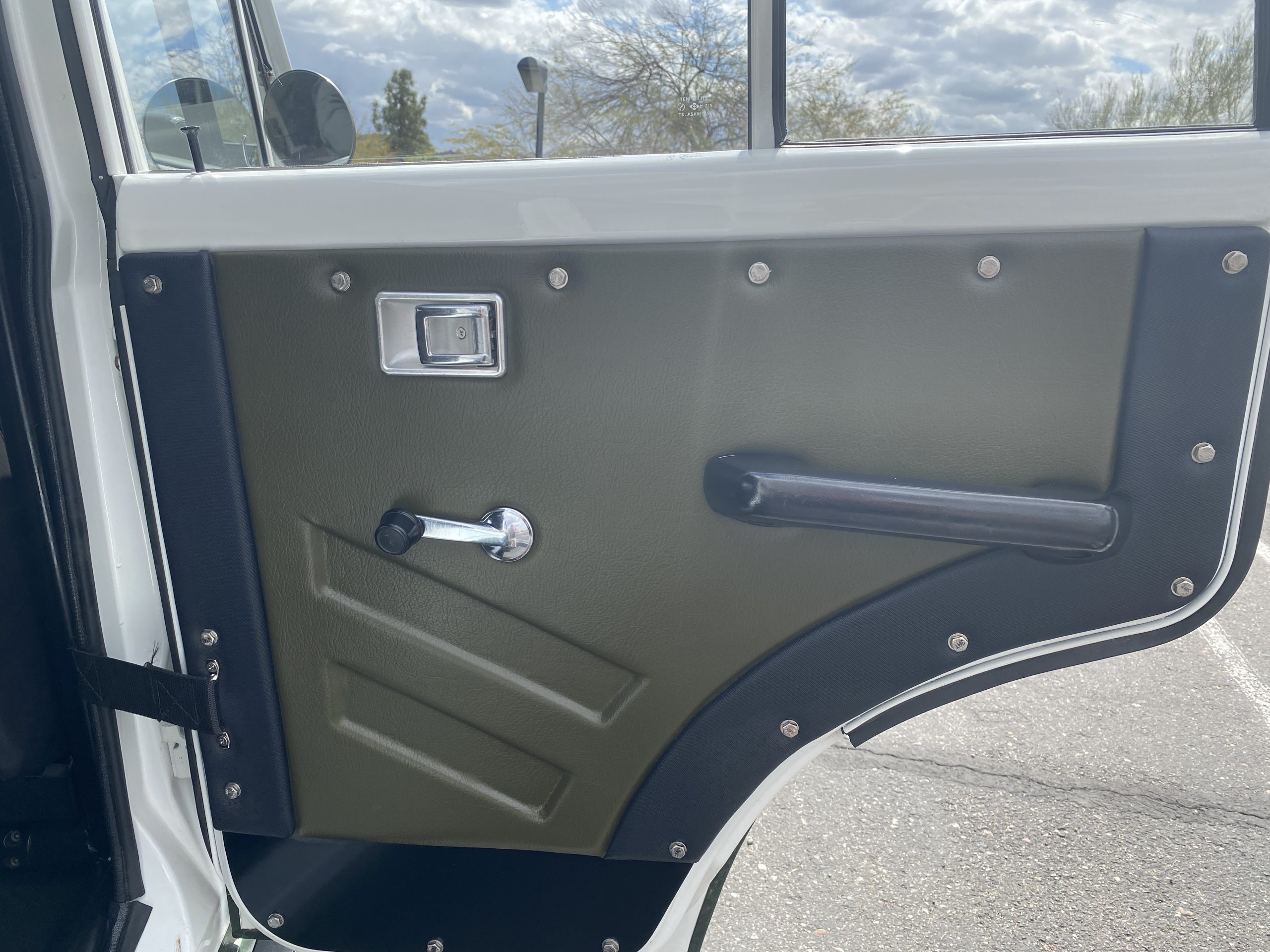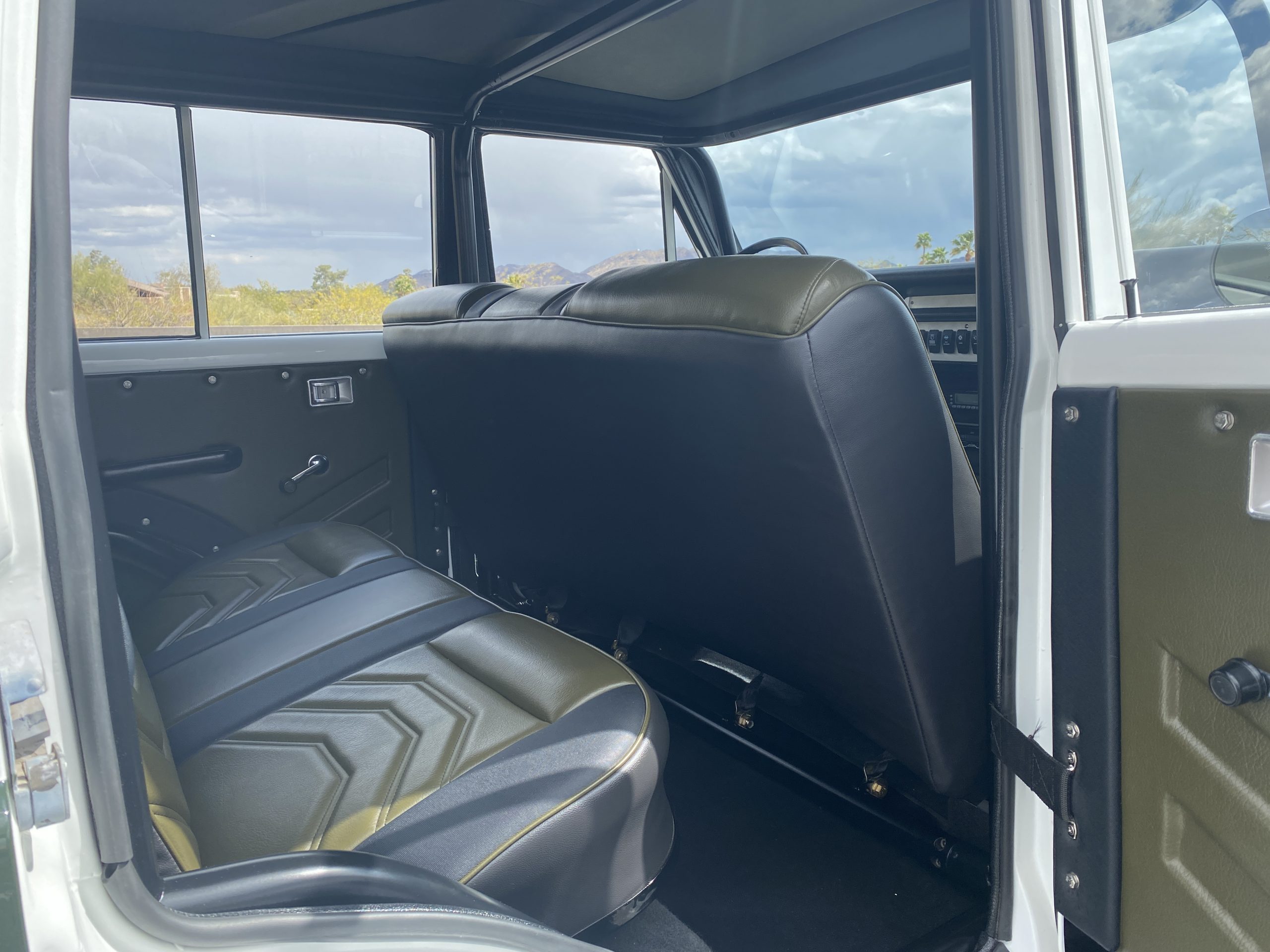 The custom two-tone white over dark green paint shows well and is in overall excellent condition. Even in direct sunlight, the car has tremendous depth, shine, and luster. While not free from blemishes, most would be hard pressed to find an issue on initial inspection. The brightwork on this FJ is largely original and in good condition with some minor scratches and some very minor pitting, most notably on the door handles. The custom ARB front bumper with integrated WARN Zeon 10 winch looks right at home on this Toyota and many will notice the three LED light bars seated on the bumper, which pair well with the aftermarket black LED headlamps and black painted grille. Adding to the overall dark theme of the accessories are 35″ Toyo Open Country M/T tires wrapped around flat-black 17″ Method wheels with Aisin front lockers. Other exterior highlights include removable doors, custom rock sliders and a custom swing-out rear tire carrier.