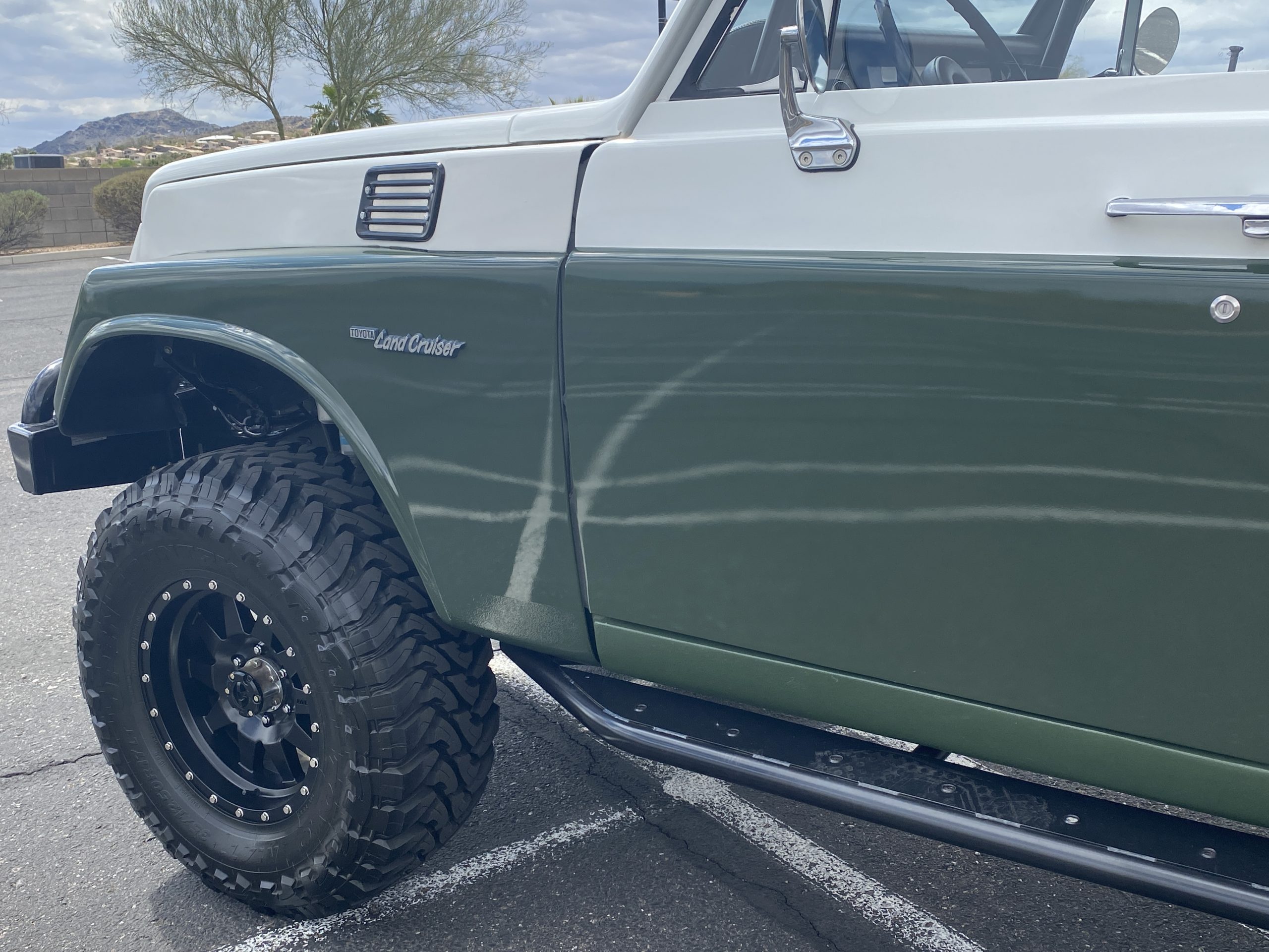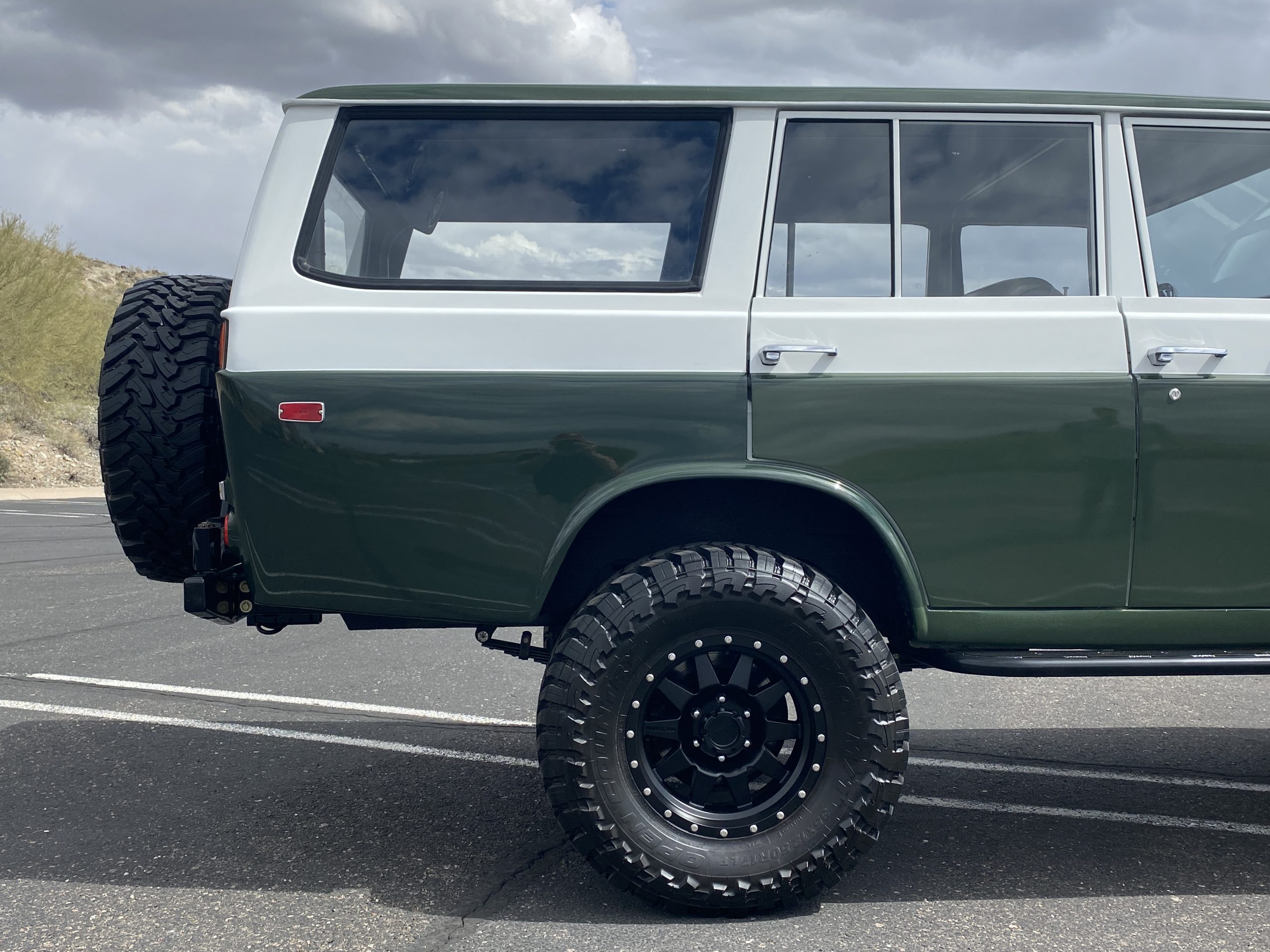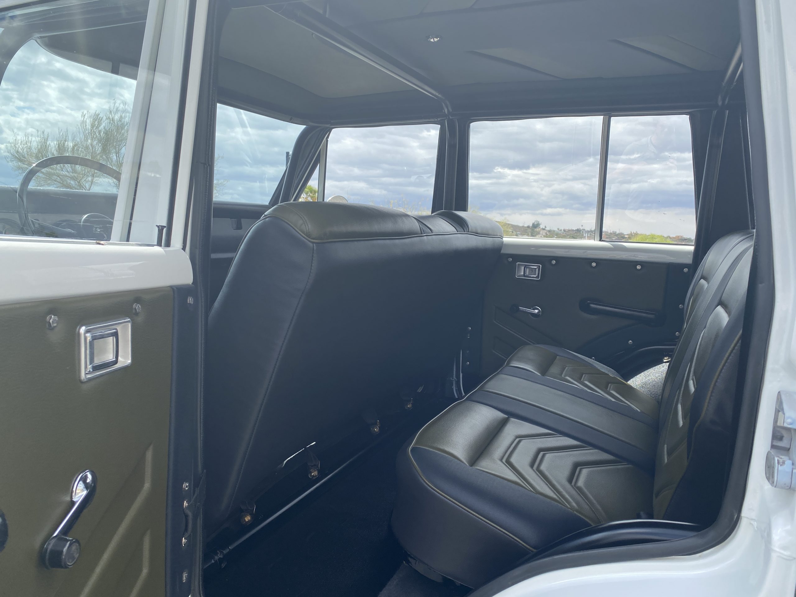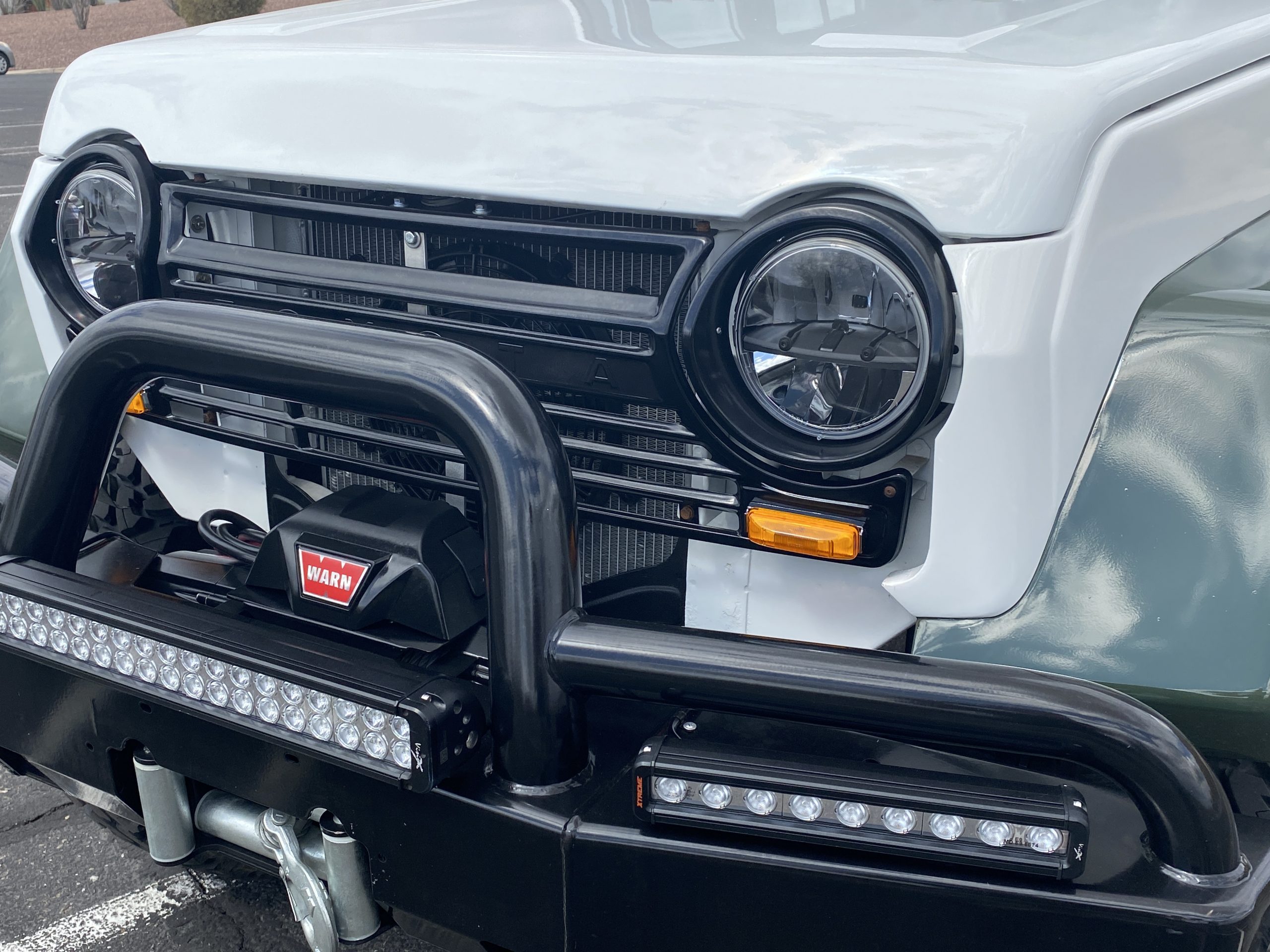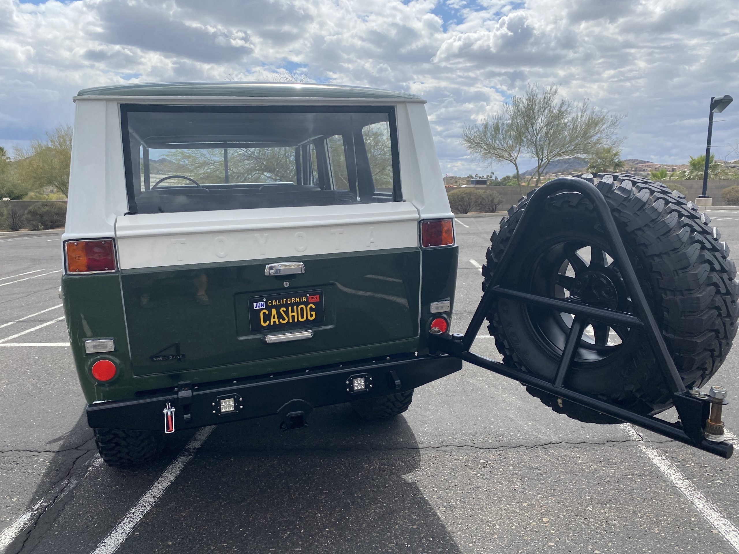 The custom two-tone white over dark green paint shows well and is in overall excellent condition. Even in direct sunlight, the car has tremendous depth, shine, and luster. While not free from blemishes, most would be hard pressed to find an issue on initial inspection. The brightwork on this FJ is largely original and in good condition with some minor scratches and some very minor pitting, most notably on the door handles. The custom ARB front bumper with integrated WARN Zeon 10 winch looks right at home on this Toyota and many will notice the three LED light bars seated on the bumper, which pair well with the aftermarket black LED headlamps and black painted grille. Adding to the overall dark theme of the accessories are 35″ Toyo Open Country M/T tires wrapped around flat-black 17″ Method wheels with Aisin front lockers. Other exterior highlights include removable doors, custom rock sliders and a custom swing-out rear tire carrier.