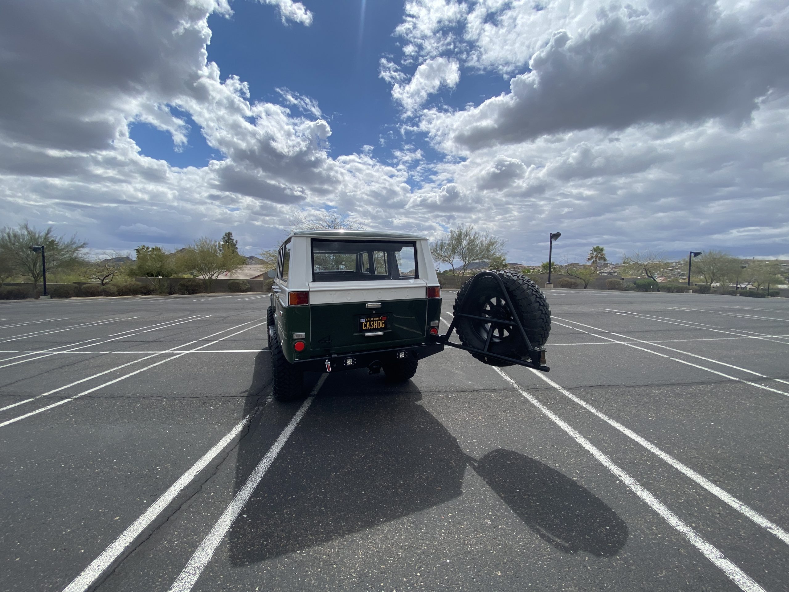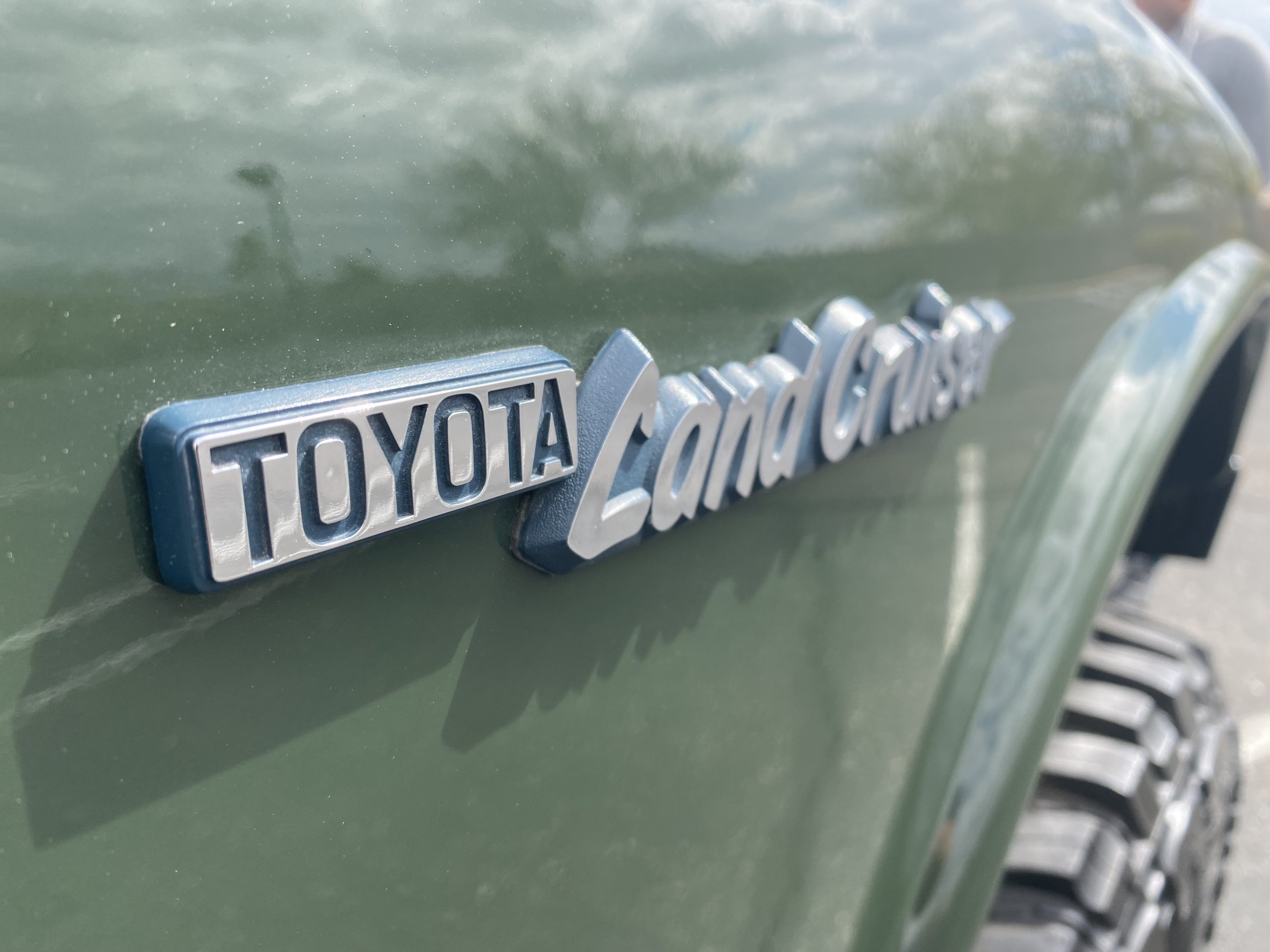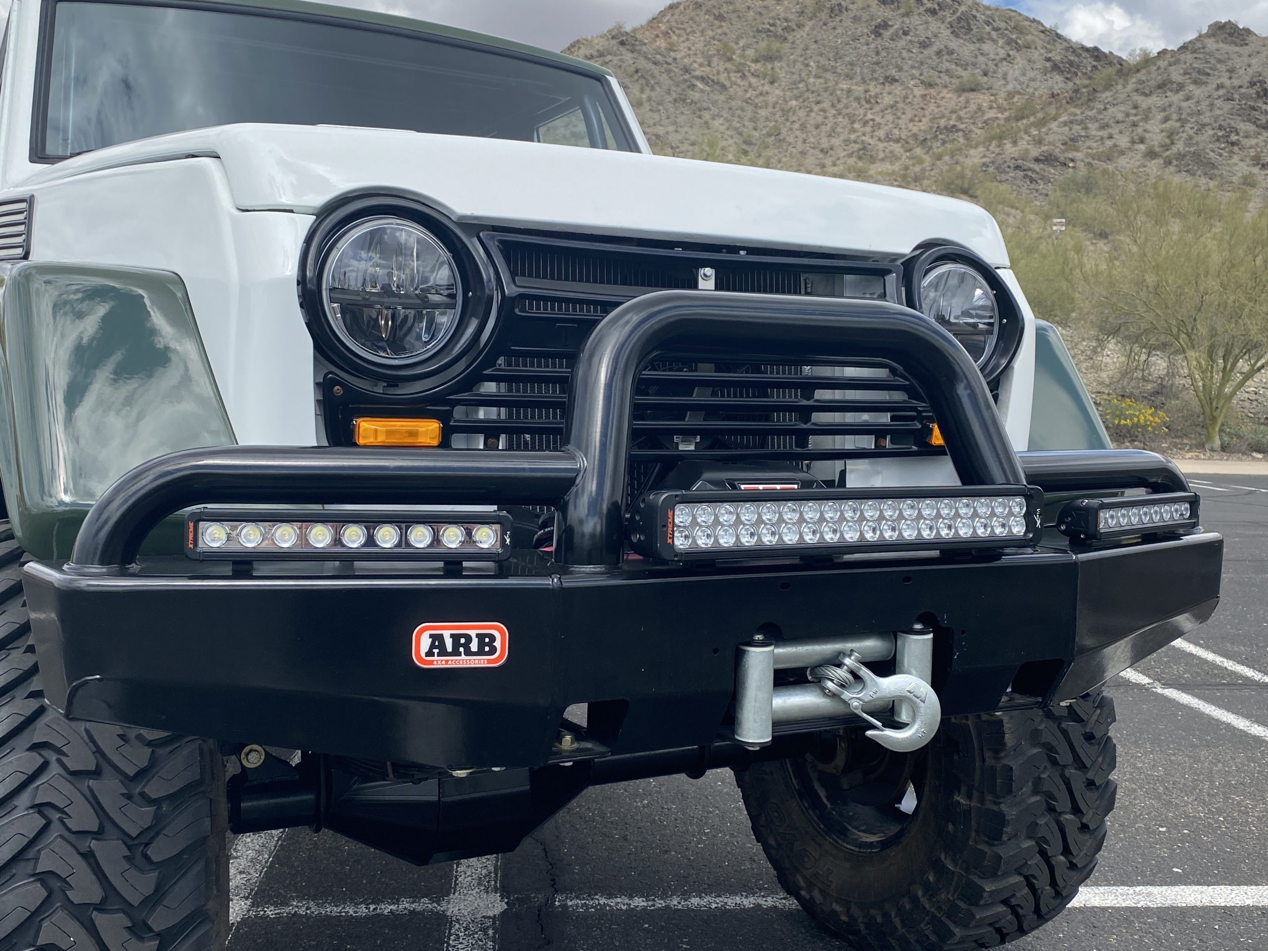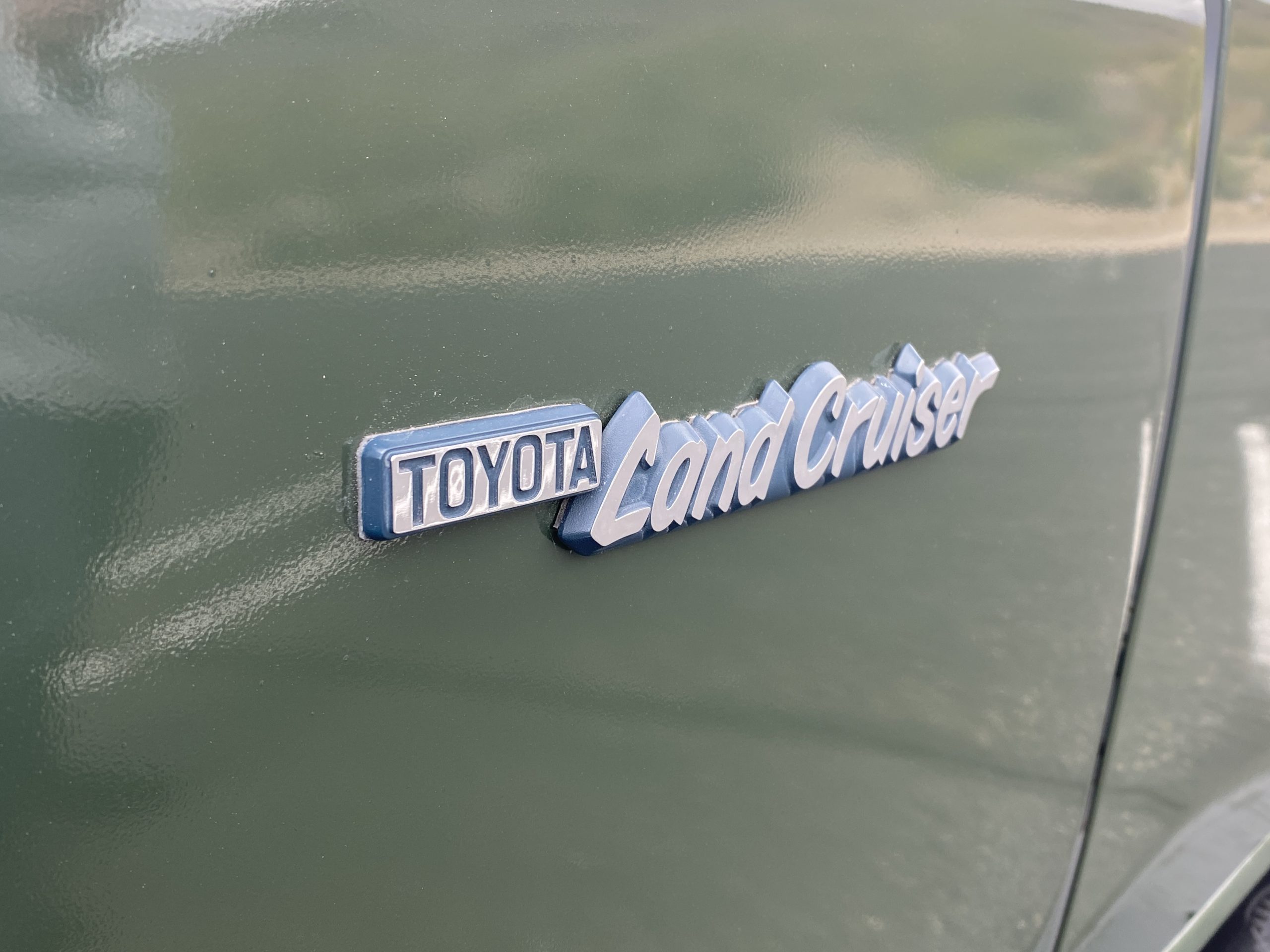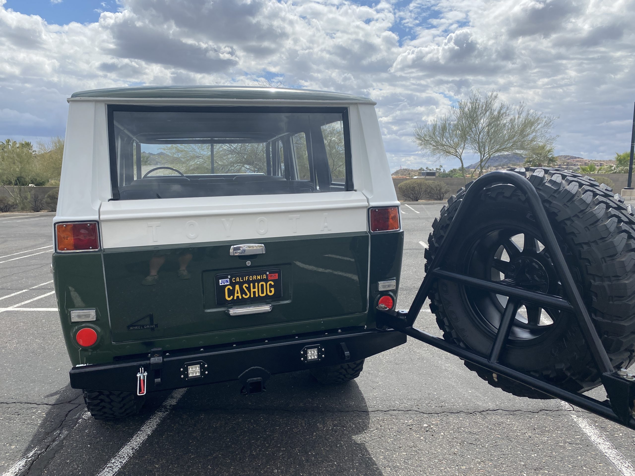 The custom two-tone white over dark green paint shows well and is in overall excellent condition. Even in direct sunlight, the car has tremendous depth, shine, and luster. While not free from blemishes, most would be hard pressed to find an issue on initial inspection. The brightwork on this FJ is largely original and in good condition with some minor scratches and some very minor pitting, most notably on the door handles. The custom ARB front bumper with integrated WARN Zeon 10 winch looks right at home on this Toyota and many will notice the three LED light bars seated on the bumper, which pair well with the aftermarket black LED headlamps and black painted grille. Adding to the overall dark theme of the accessories are 35″ Toyo Open Country M/T tires wrapped around flat-black 17″ Method wheels with Aisin front lockers. Other exterior highlights include removable doors, custom rock sliders and a custom swing-out rear tire carrier.