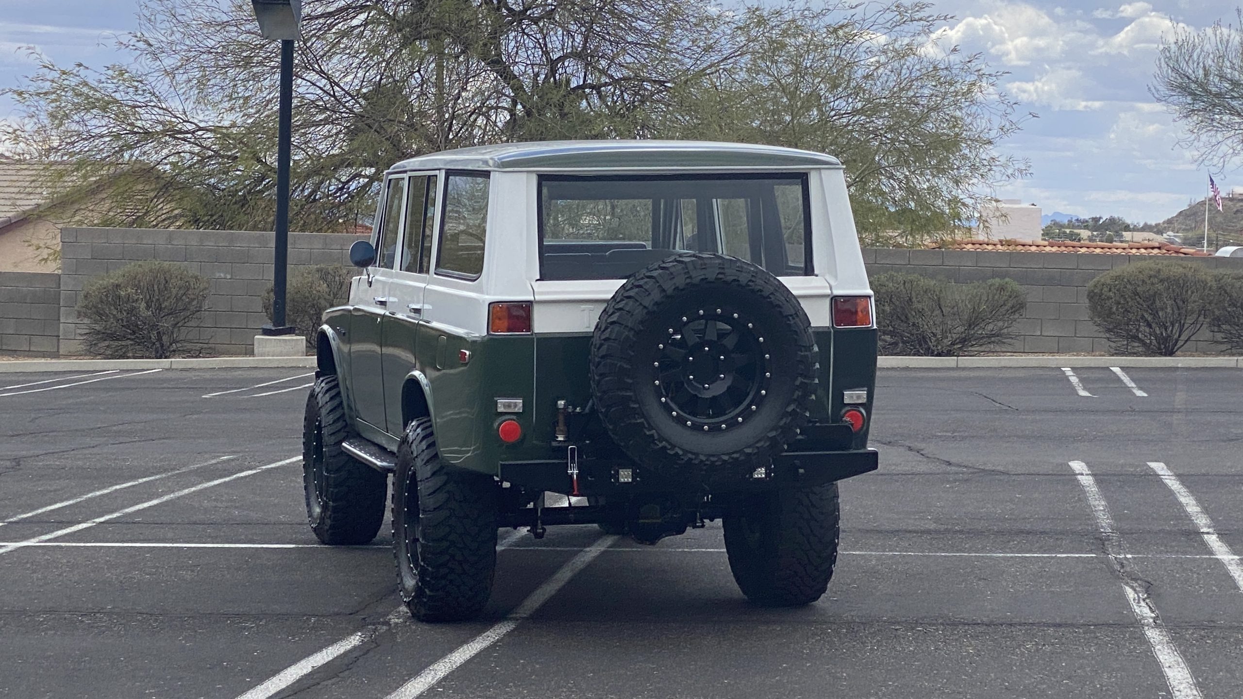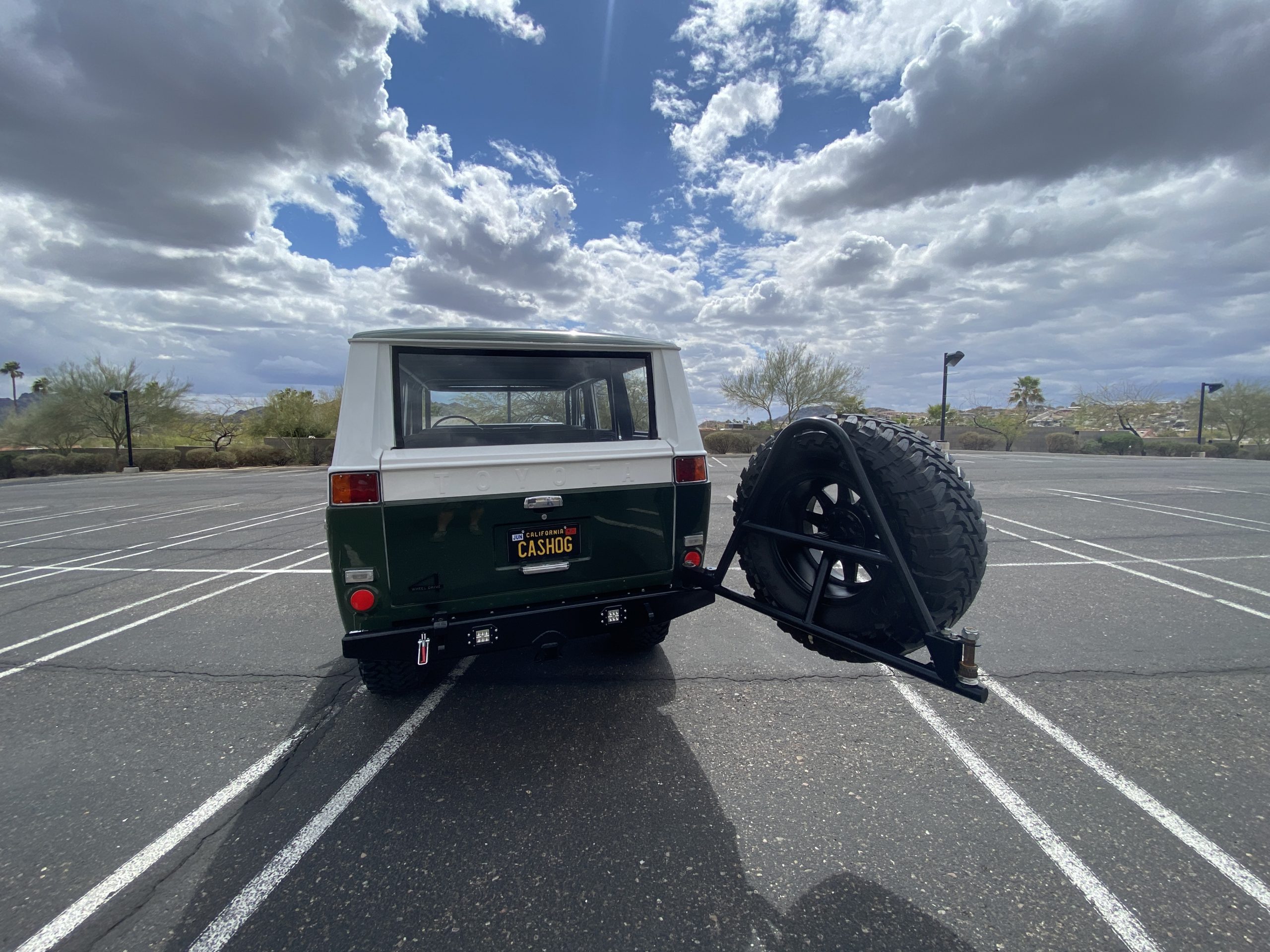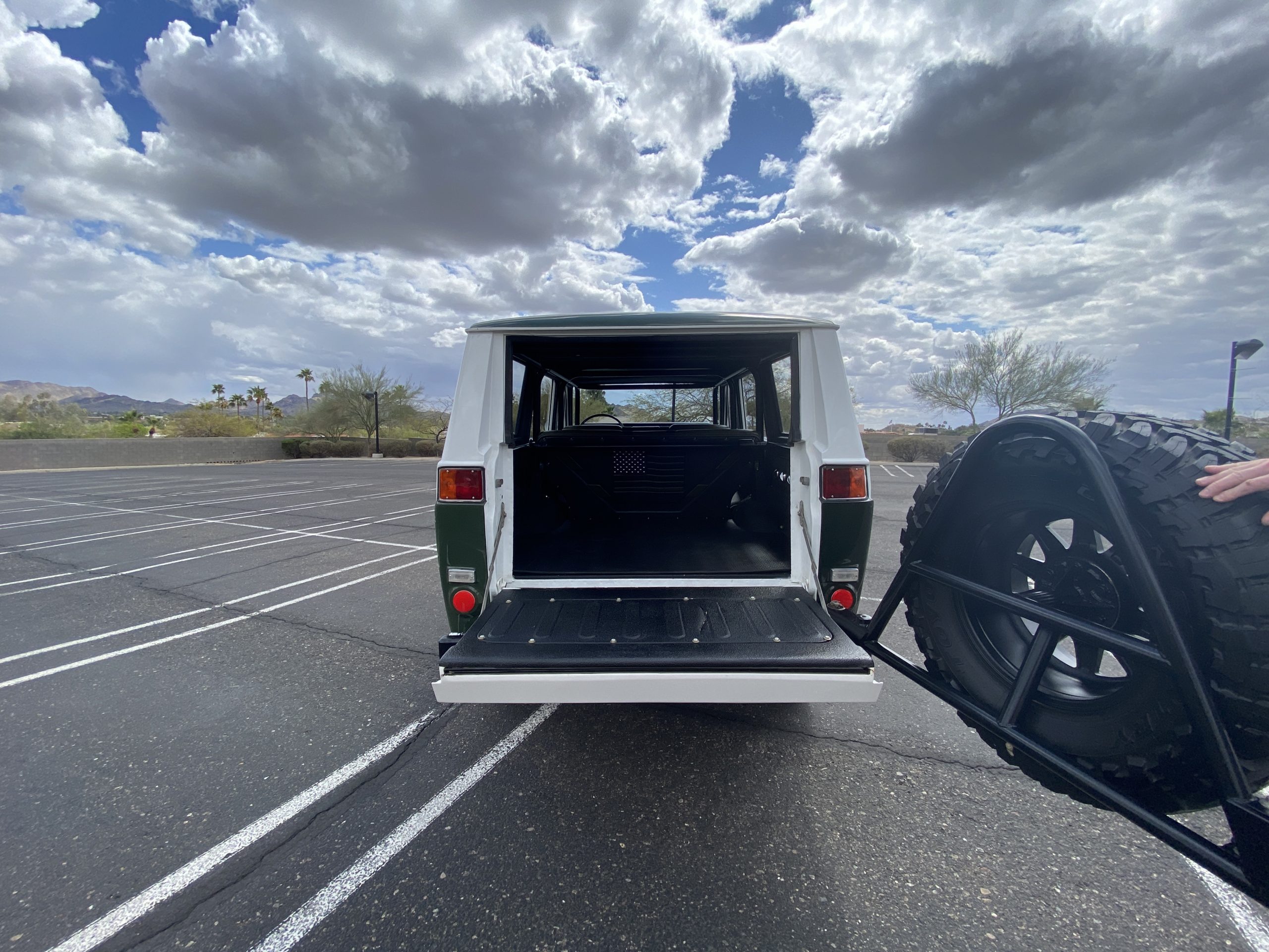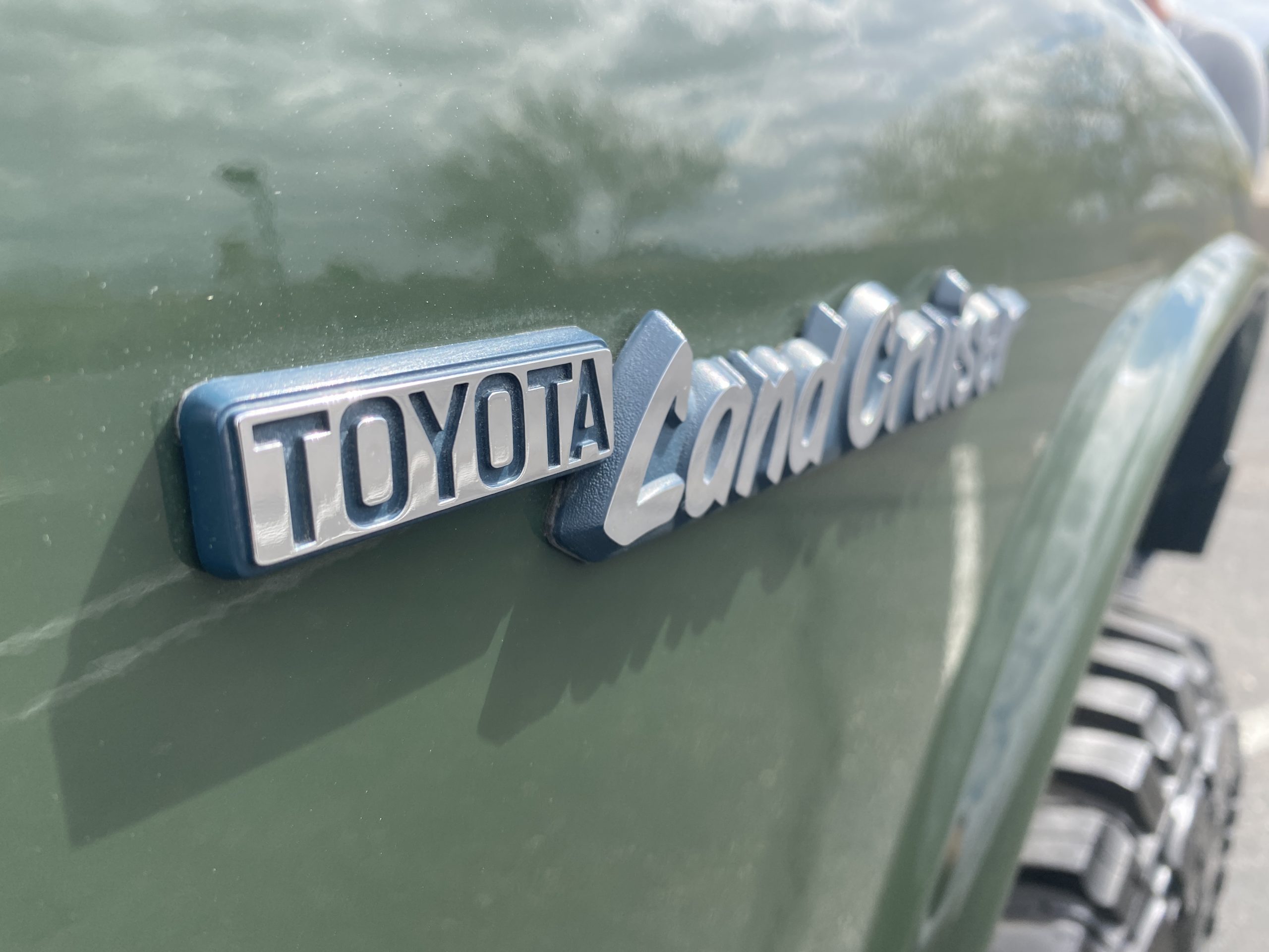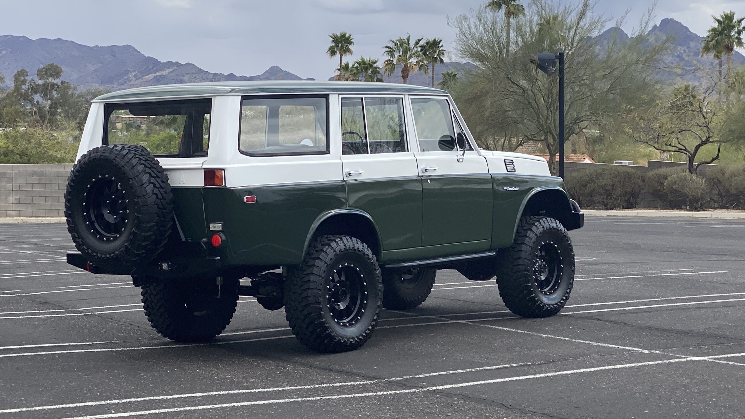 The custom two-tone white over dark green paint shows well and is in overall excellent condition. Even in direct sunlight, the car has tremendous depth, shine, and luster. While not free from blemishes, most would be hard pressed to find an issue on initial inspection. The brightwork on this FJ is largely original and in good condition with some minor scratches and some very minor pitting, most notably on the door handles. The custom ARB front bumper with integrated WARN Zeon 10 winch looks right at home on this Toyota and many will notice the three LED light bars seated on the bumper, which pair well with the aftermarket black LED headlamps and black painted grille. Adding to the overall dark theme of the accessories are 35″ Toyo Open Country M/T tires wrapped around flat-black 17″ Method wheels with Aisin front lockers. Other exterior highlights include removable doors, custom rock sliders and a custom swing-out rear tire carrier.