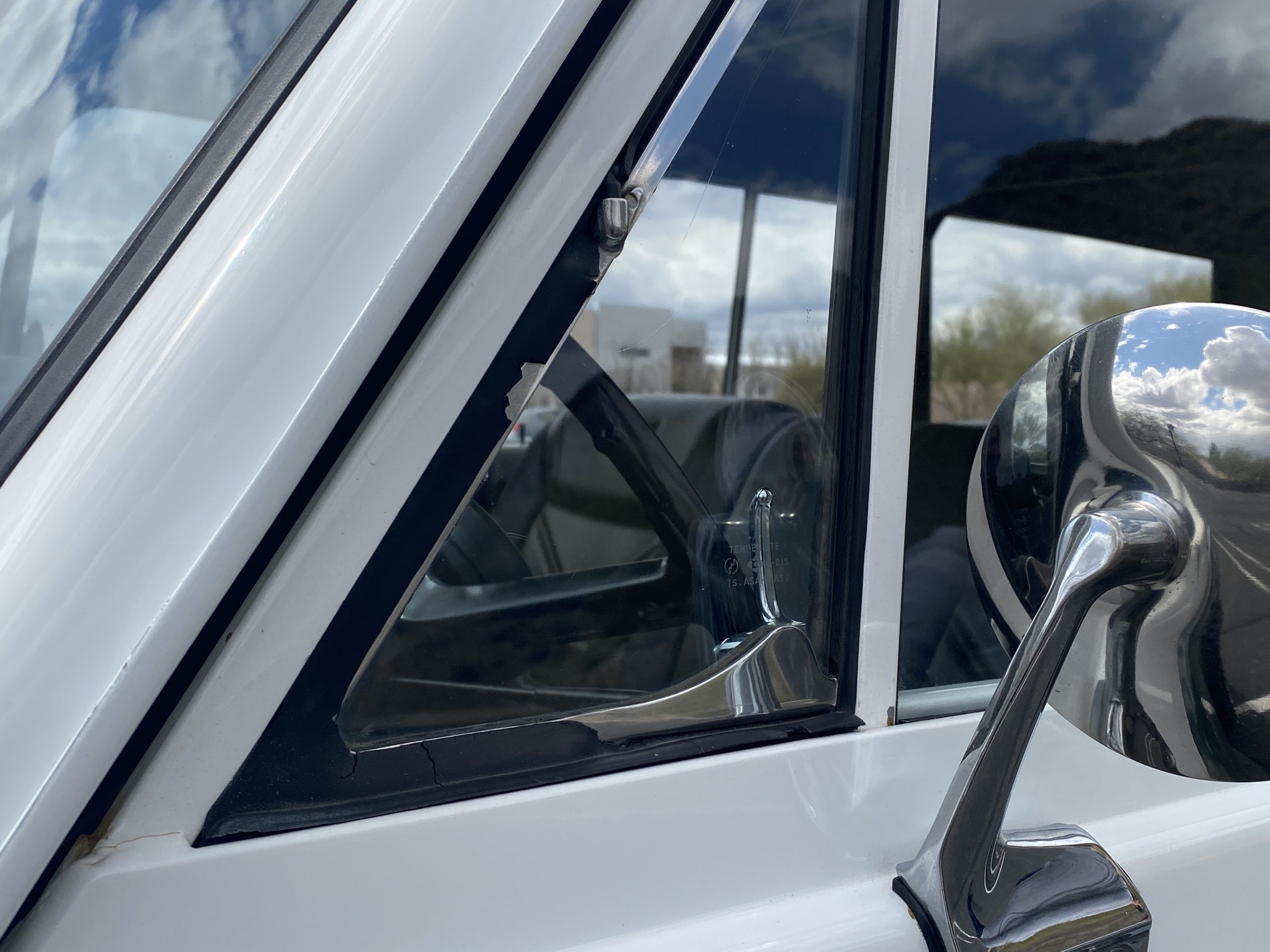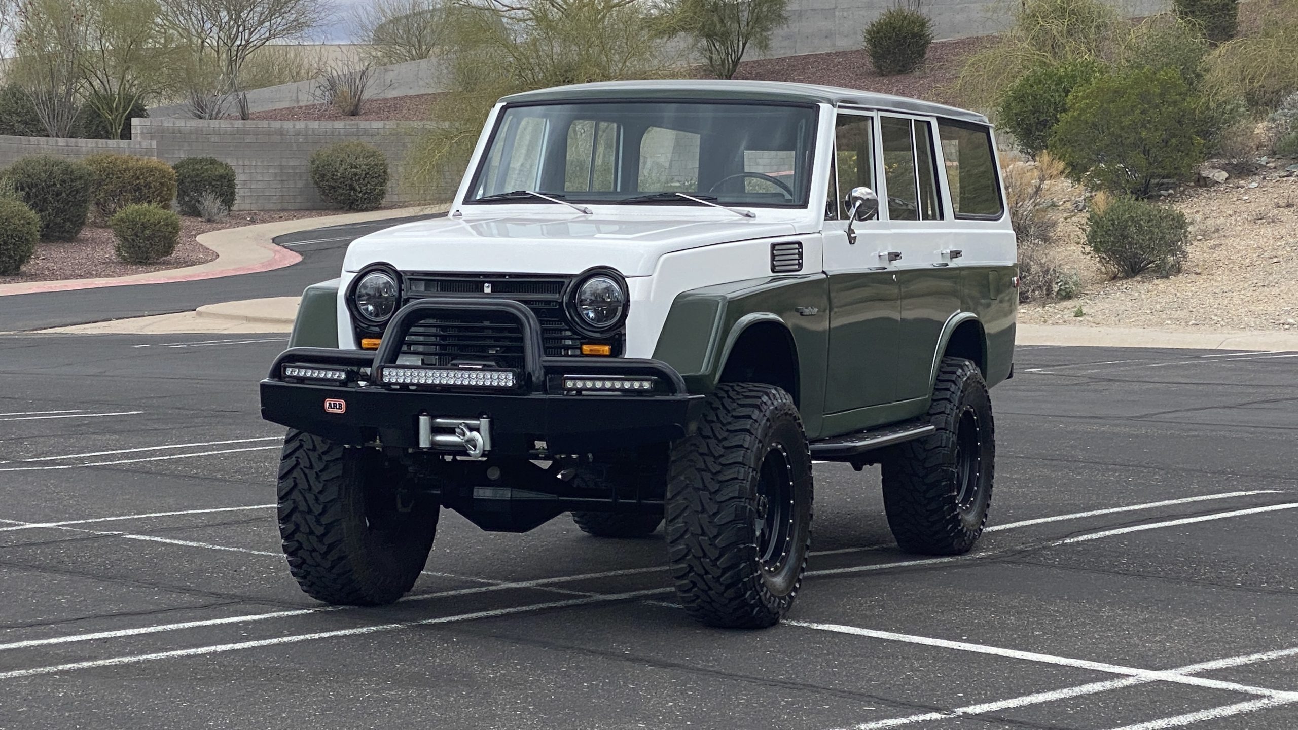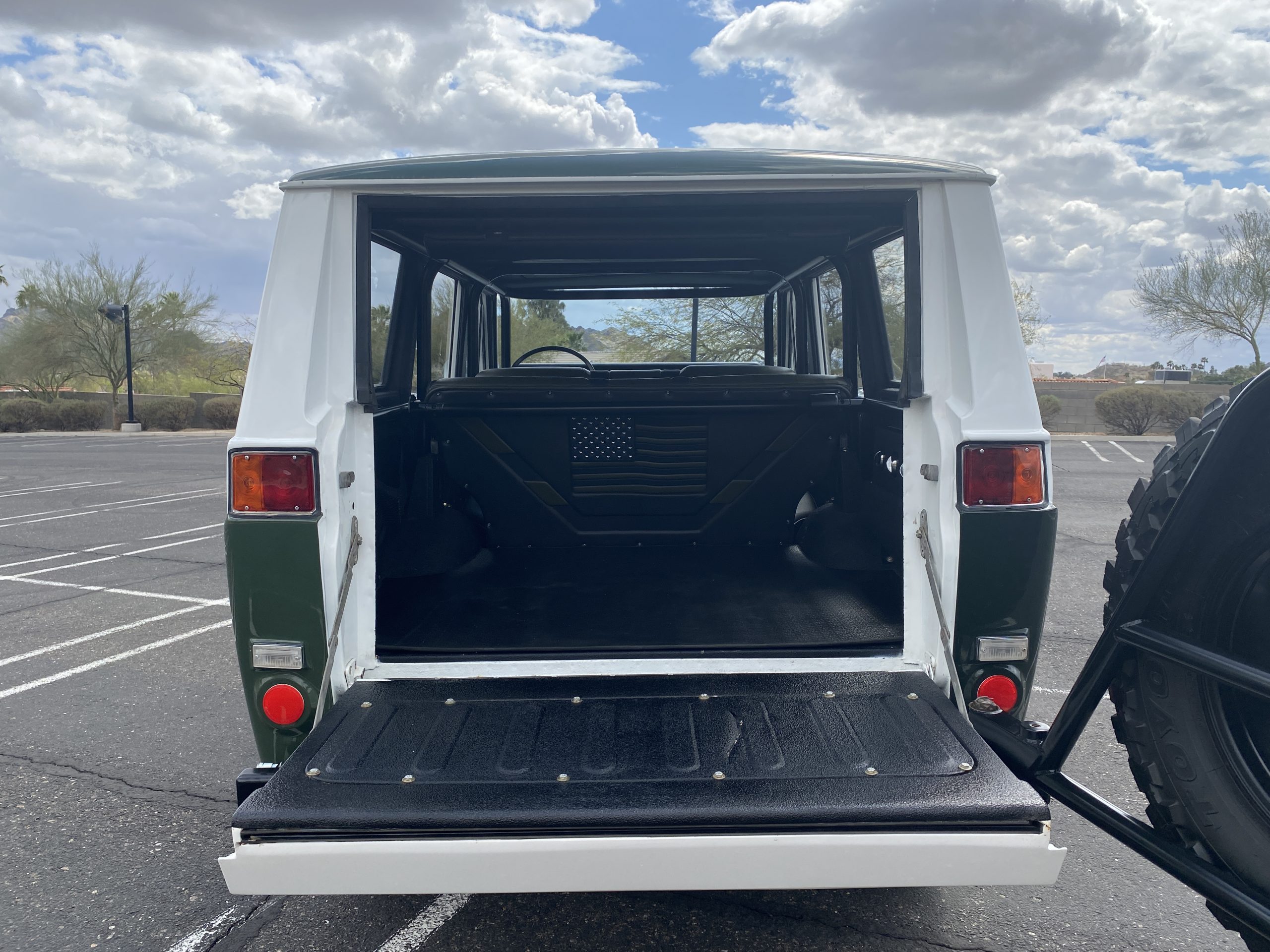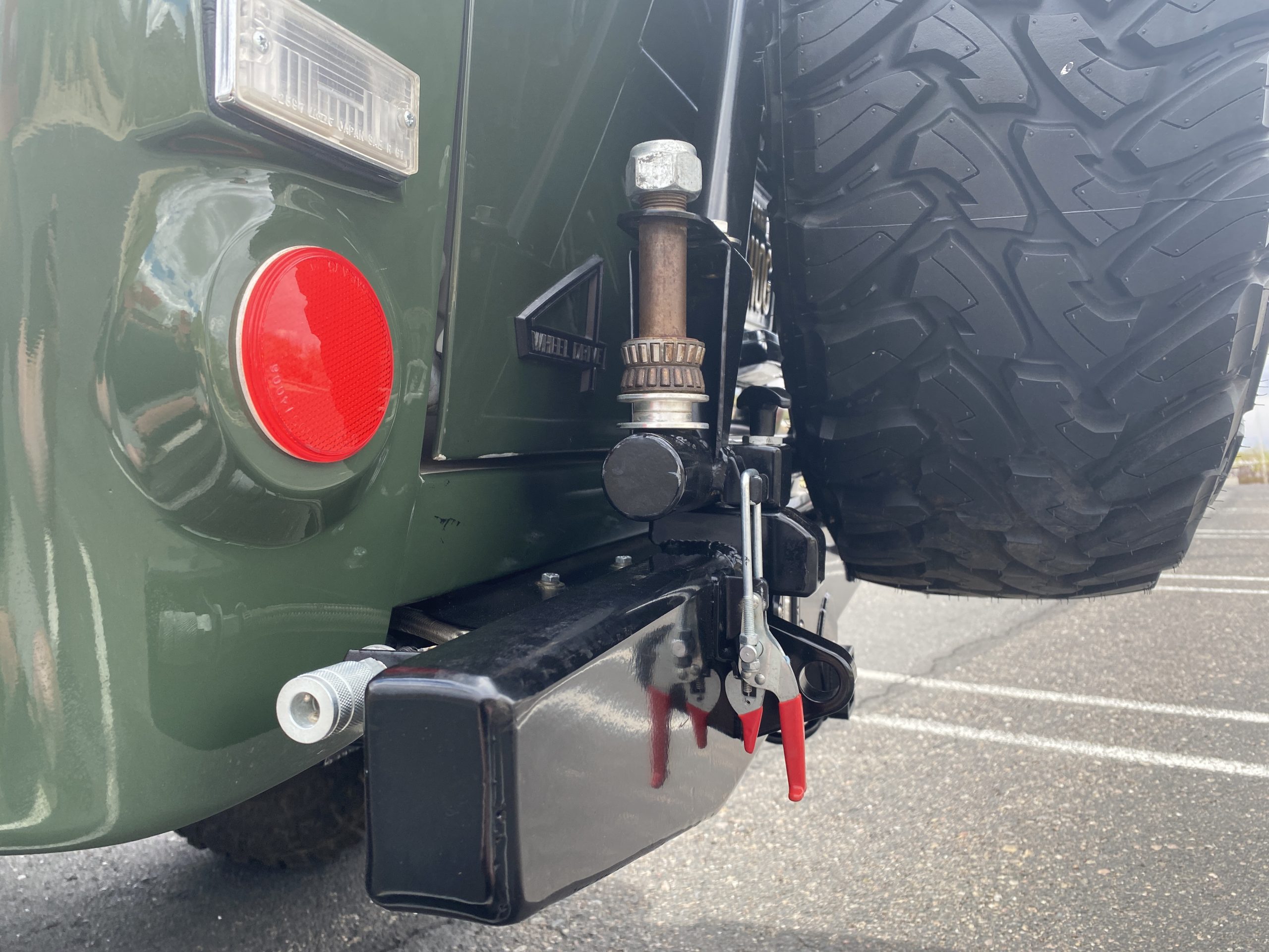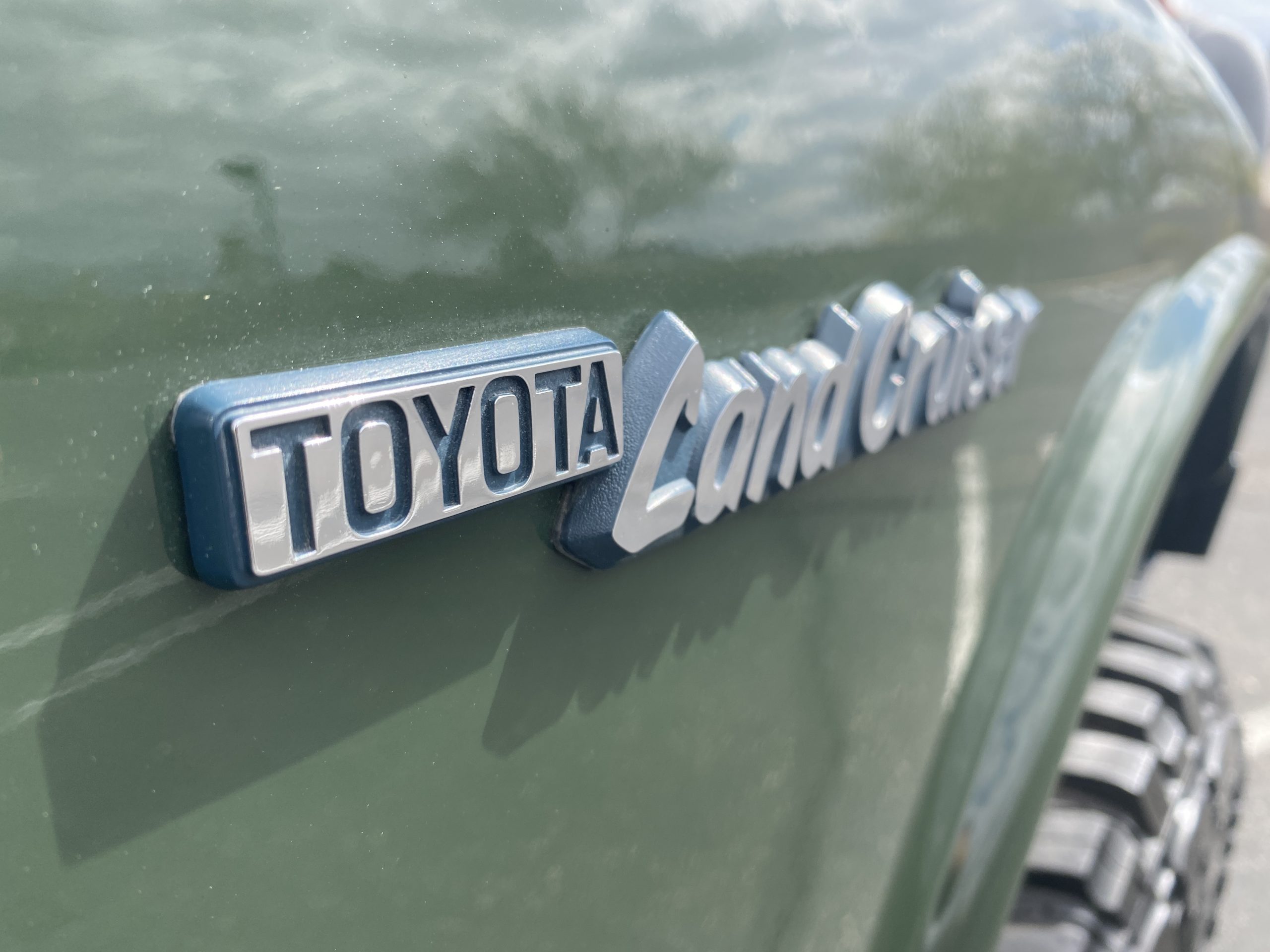 The custom two-tone white over dark green paint shows well and is in overall excellent condition. Even in direct sunlight, the car has tremendous depth, shine, and luster. While not free from blemishes, most would be hard pressed to find an issue on initial inspection. The brightwork on this FJ is largely original and in good condition with some minor scratches and some very minor pitting, most notably on the door handles. The custom ARB front bumper with integrated WARN Zeon 10 winch looks right at home on this Toyota and many will notice the three LED light bars seated on the bumper, which pair well with the aftermarket black LED headlamps and black painted grille. Adding to the overall dark theme of the accessories are 35″ Toyo Open Country M/T tires wrapped around flat-black 17″ Method wheels with Aisin front lockers. Other exterior highlights include removable doors, custom rock sliders and a custom swing-out rear tire carrier.