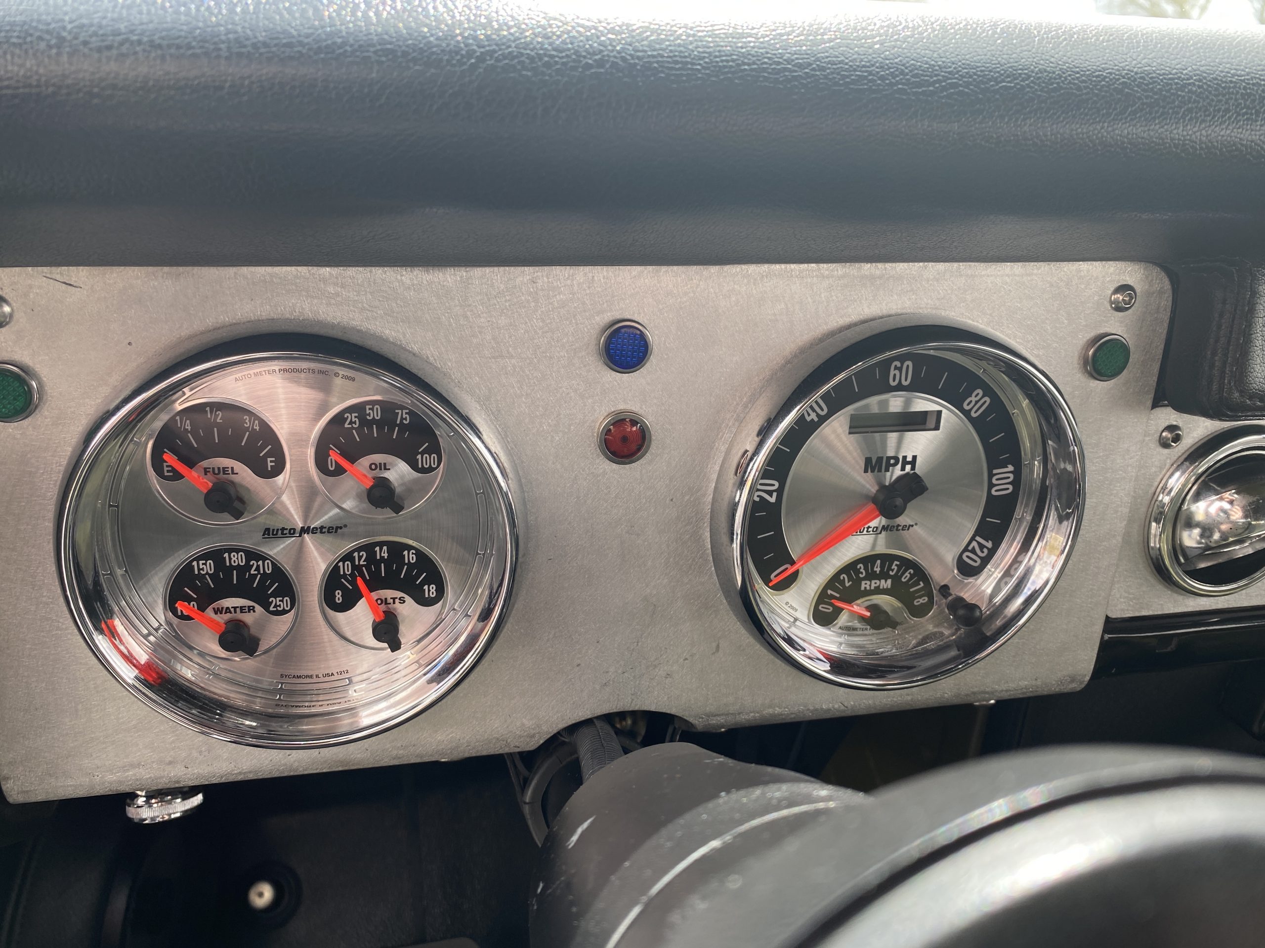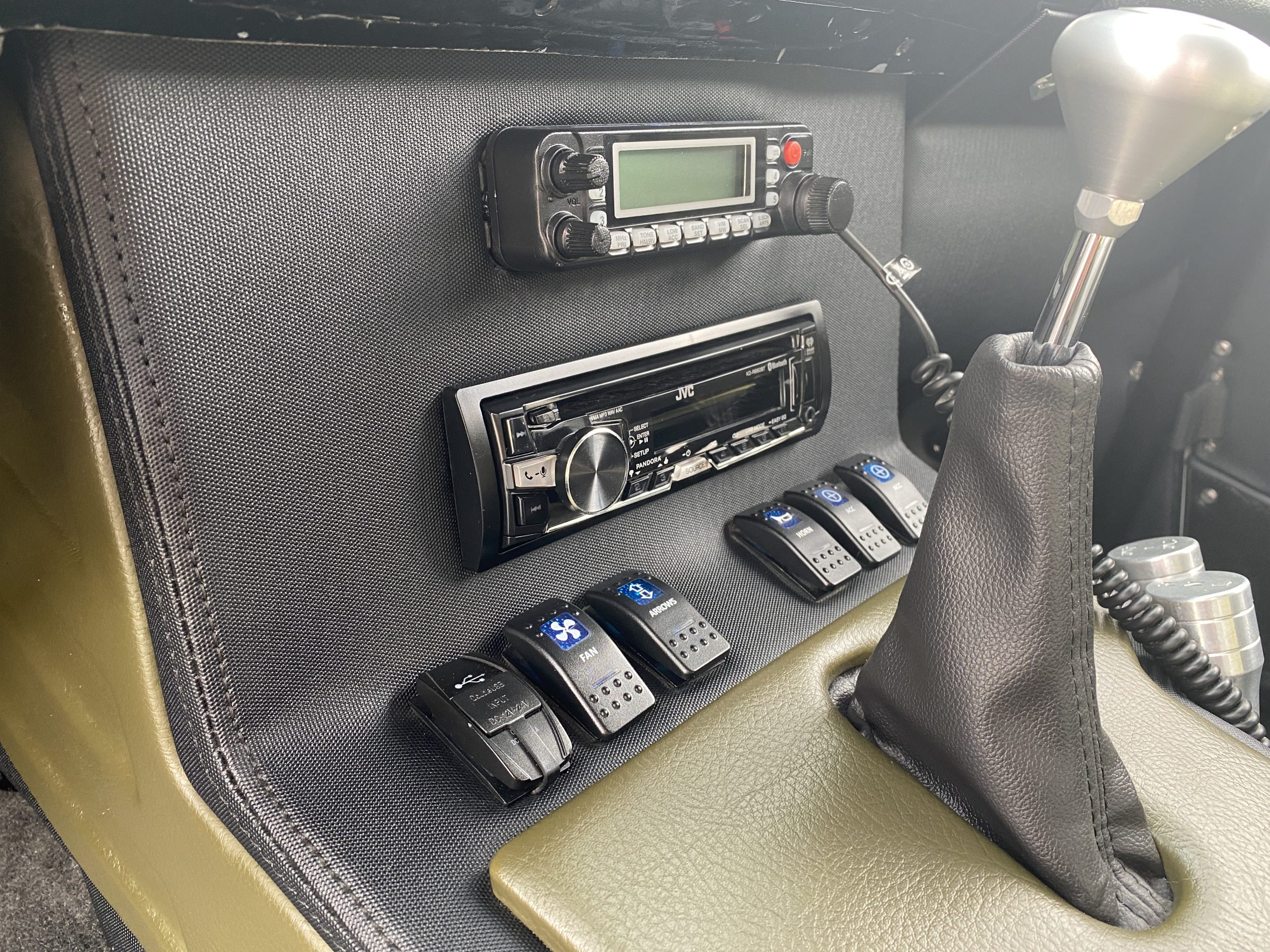 Additional features include an integrated roll cage, a custom center console, a Rugged Radio CB system, a heater with ducting to the front and rear, an ARB on-board air compressor, and a JVC CD stereo wired to a 410-watt power inverter and four Alpine speakers and tweeters. A black three-spoke steering wheel frames a custom instrument panel that houses AutoMeter instrumentation including a 120-mph speedometer with an inset 8k-rpm tachometer, and a combination gauge for fuel level, oil pressure, coolant temperature, and voltage. Custom rocker switches for vehicle functions have been added to the dash, and the digital odometer shows just over 300 miles, all of which have been added by the seller.