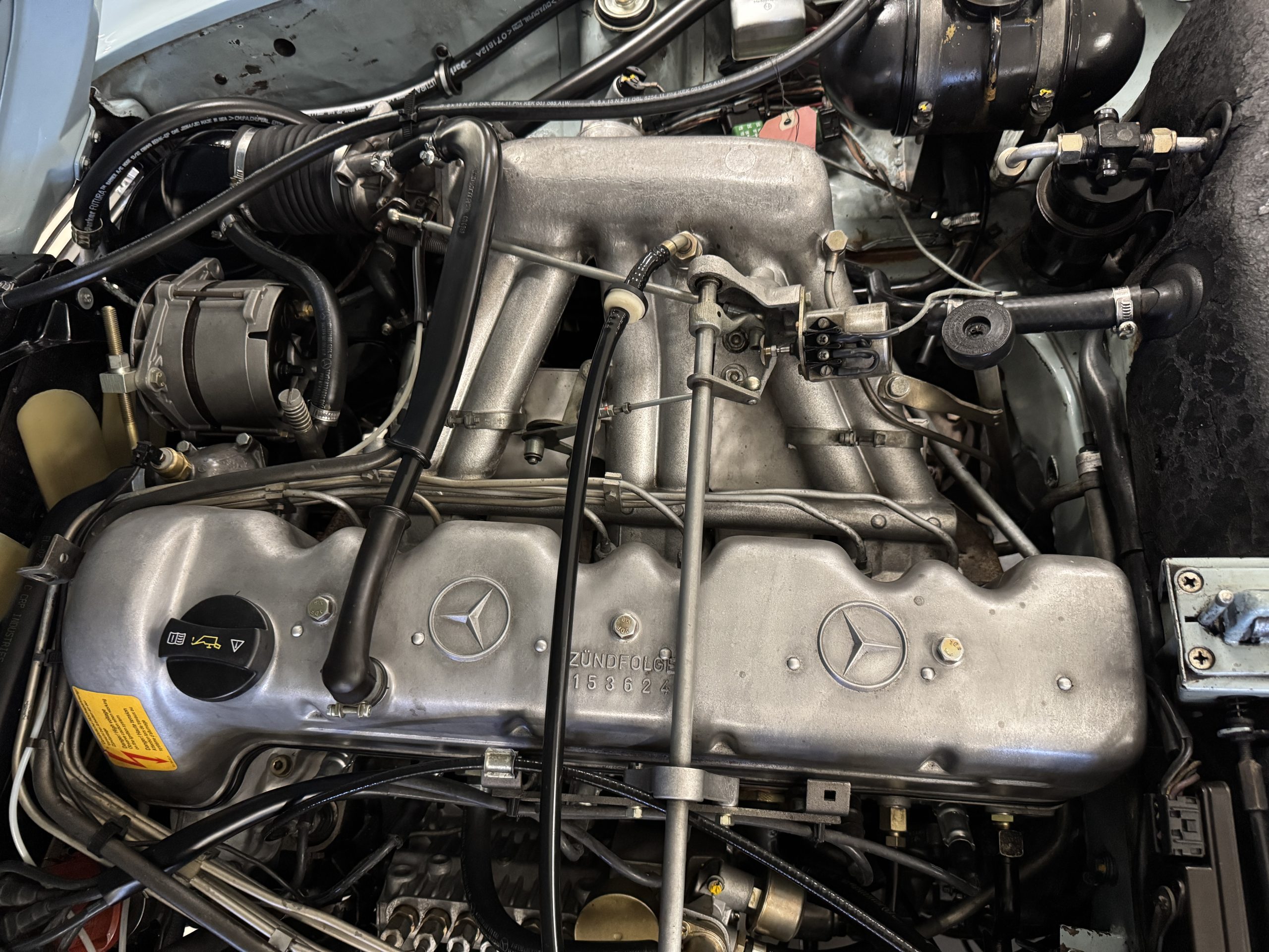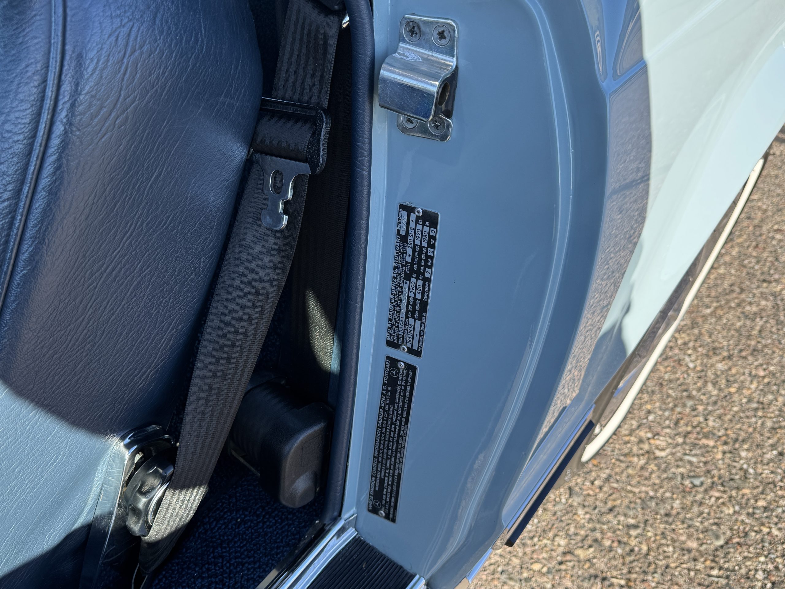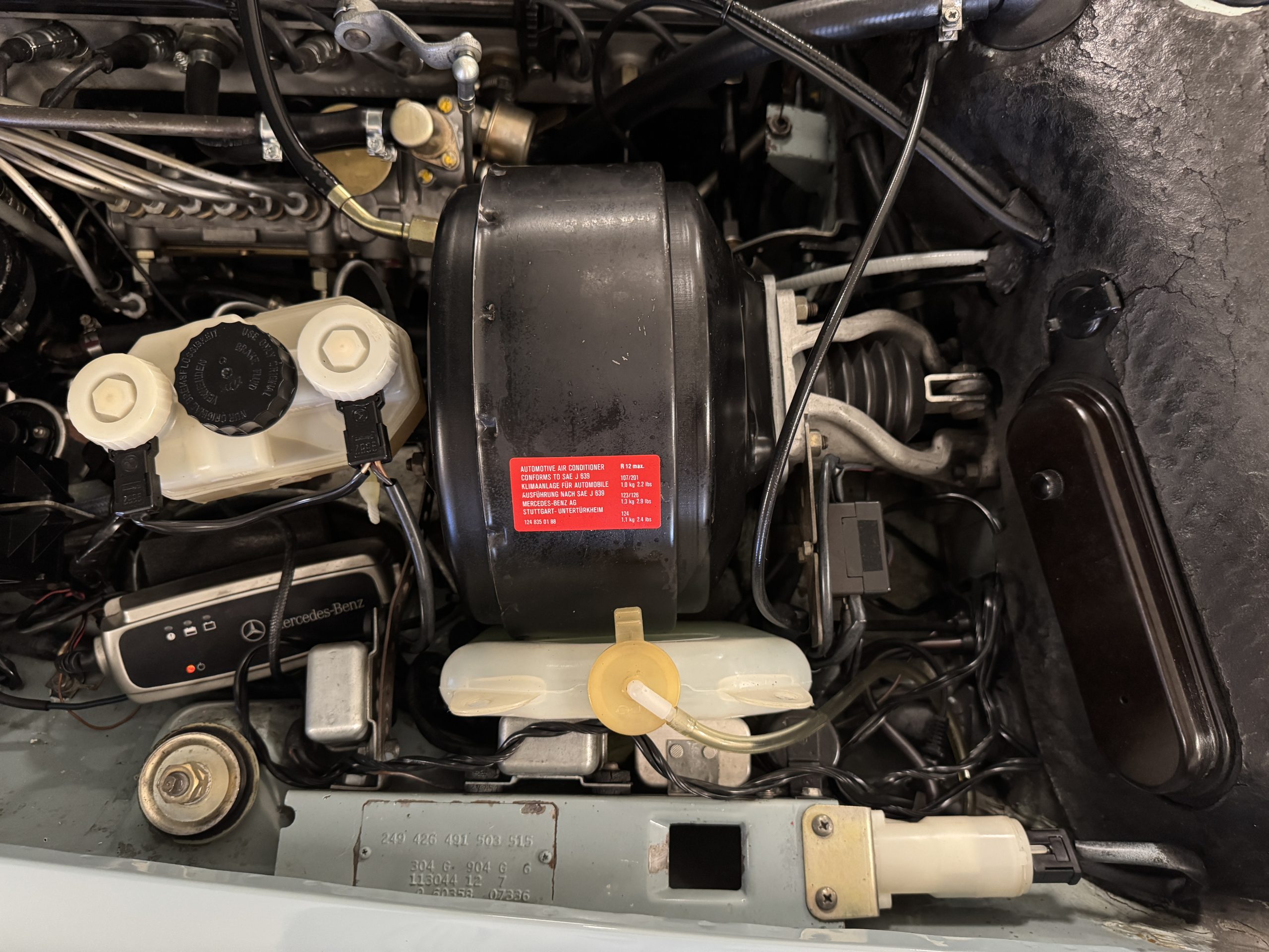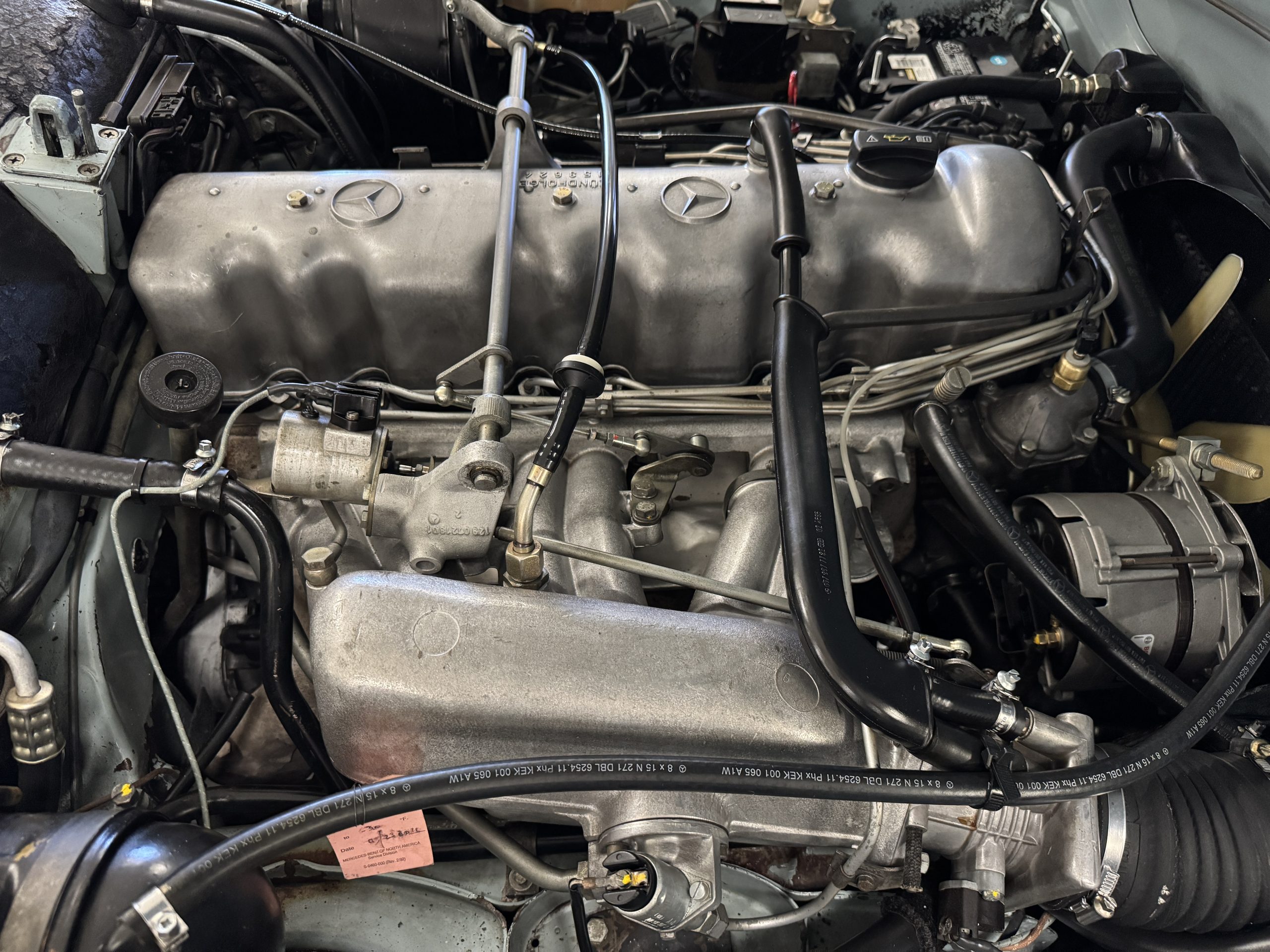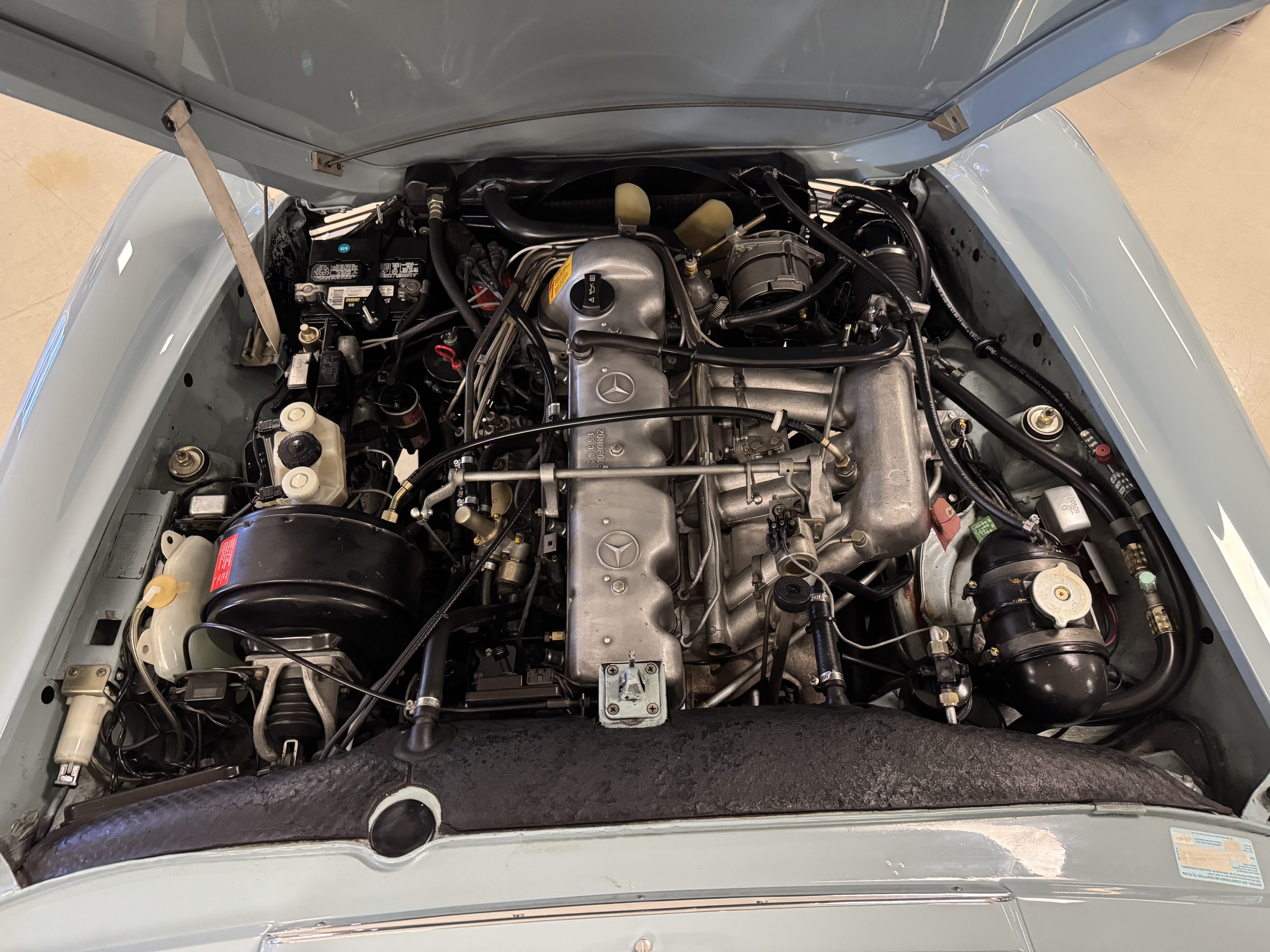 Power is provided by the 2.8L inline-six producing approximately 180 horsepower, paired with a four-speed automatic transmission. The Mercedes has power steering, disc brakes all around, and dual exhaust. During its lifetime, this Mercedes has been cared for meticulously, proactively and underwent a no expense spared frame off restoration. Unless unavailable, parts were replaced with original factory parts. The engine was replaced with a factory rebuilt engine special ordered from Germany. Key items that were completed in its history including a rebuilt fuel injection pump, distributor replaced with a modern improved distributor that delivers three times the voltage but looks original, the radiator was rebuilt featuring a high efficiency core, and fully replaced air condition system including compressor, hoses, evaporator and condenser. The right front fender is missing the weld spots on the inner trim though we don’t have historical information on why or when that happened. After being kept in storage and driven infrequently, the Mercedes was fully inspected and serviced to be road ready in November 2025. The items most recently replaced were all four tires (Phoenix 185R14), battery, bushings, valve cover gaskets, fuel line and all fluids. The Mercedes is fully sorted and is in great mechanical condition!