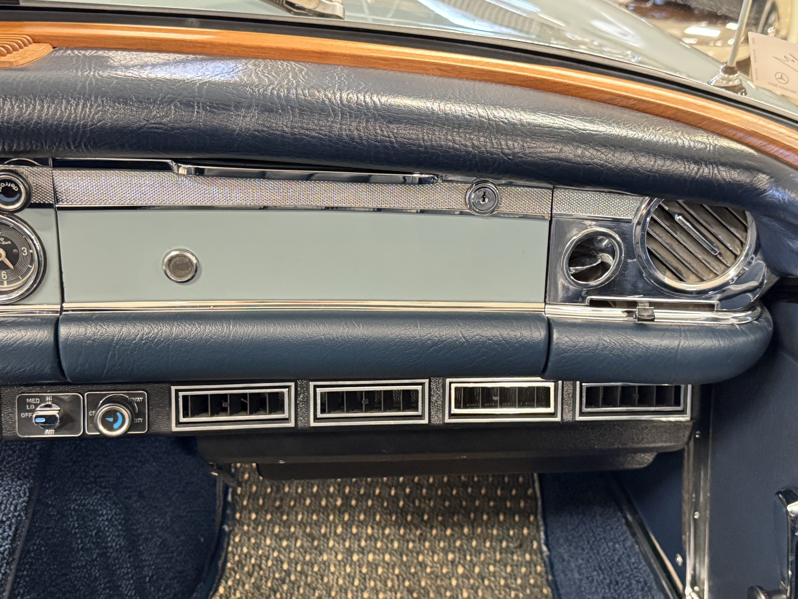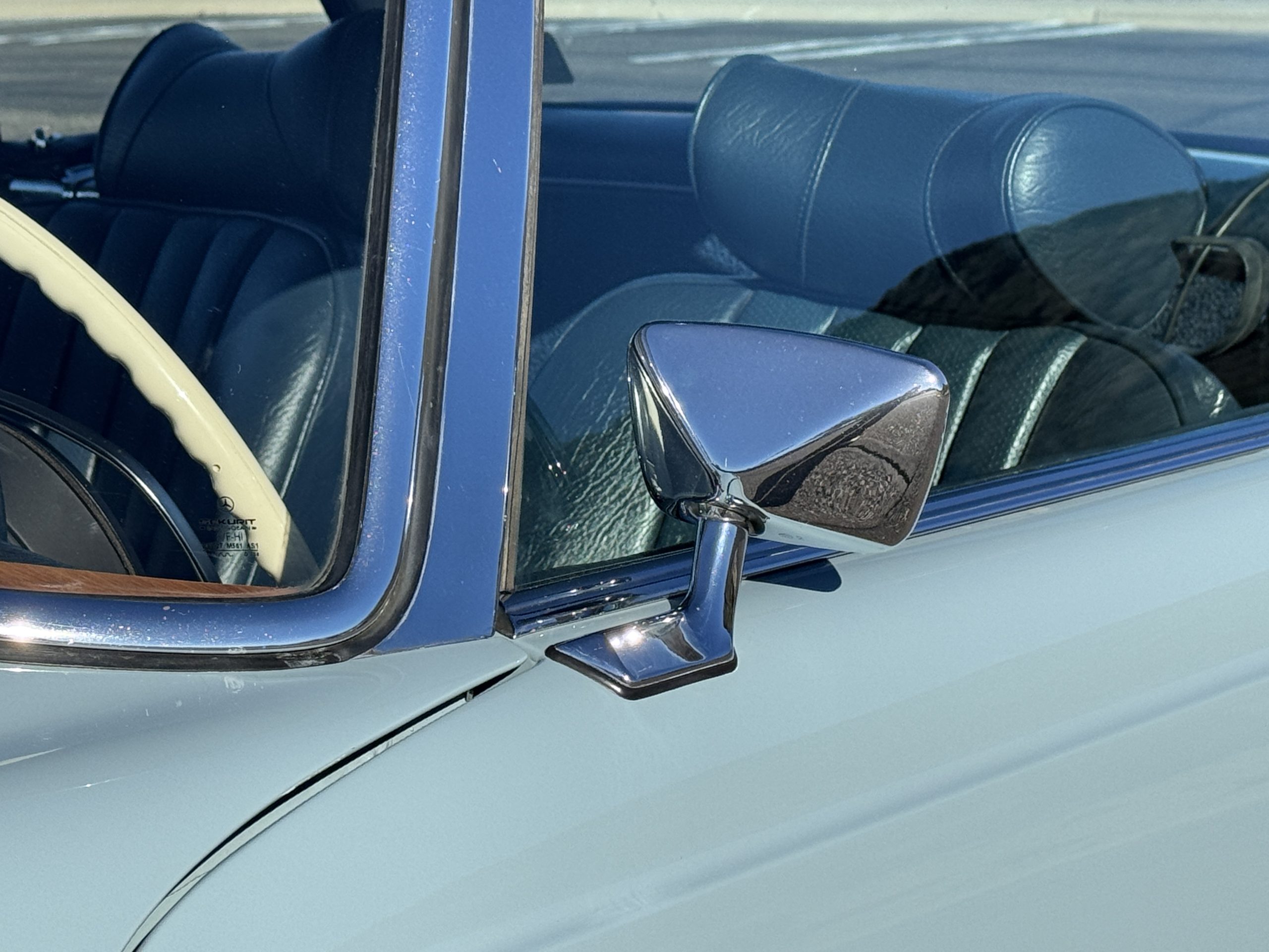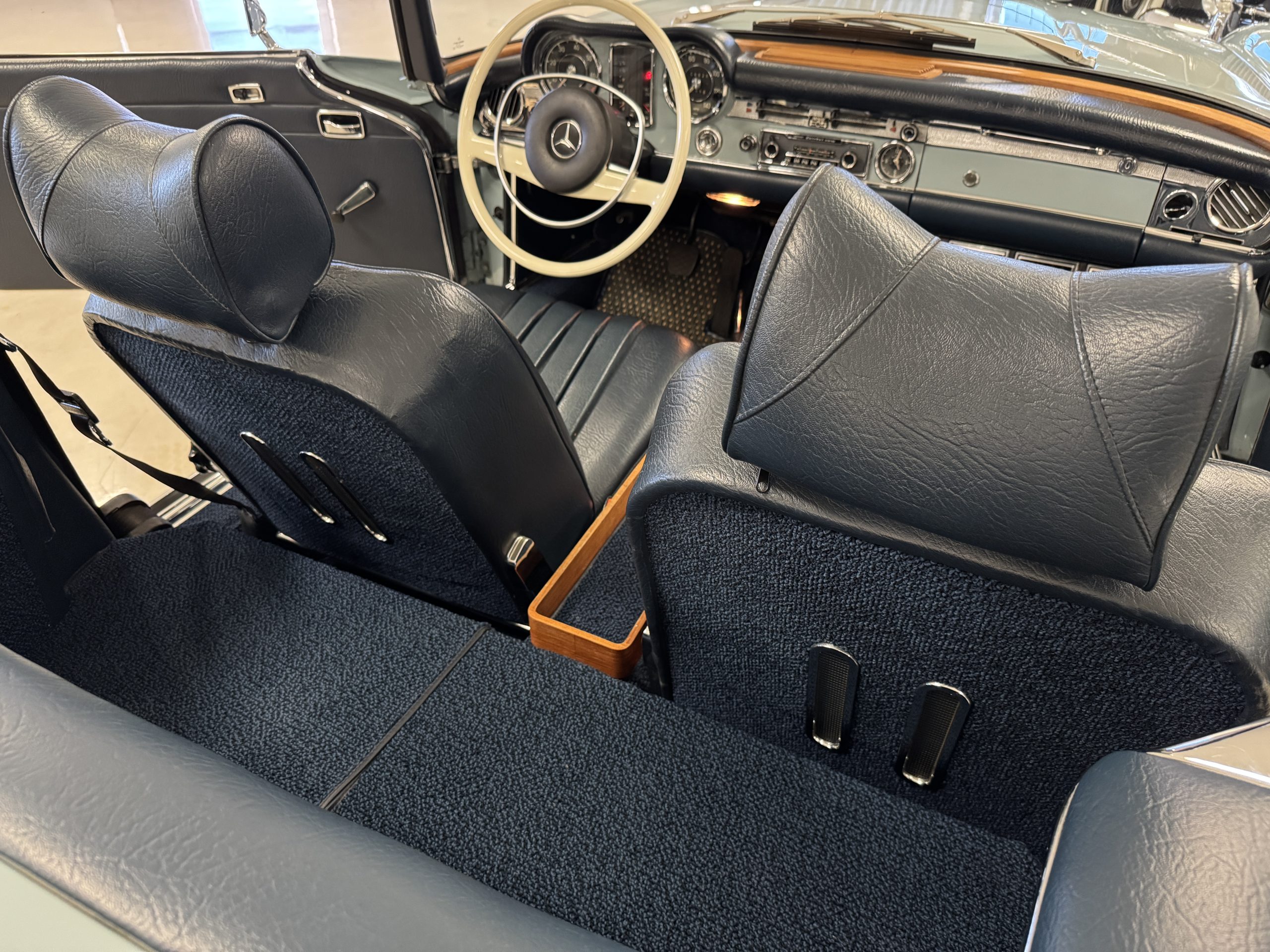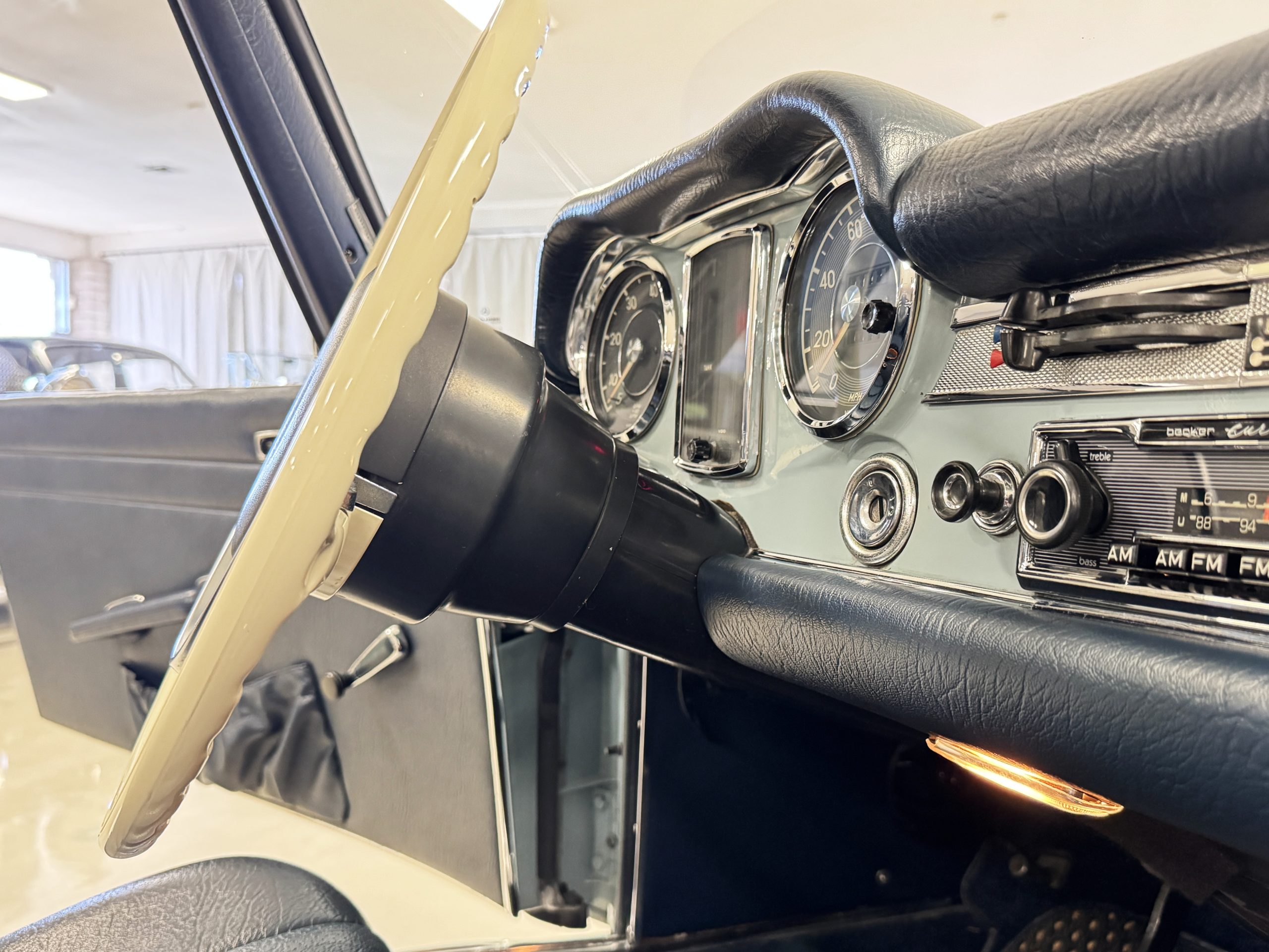 The two-tone exterior of the 280SL 022804 is finished in Horizon Blue (304 G) paired with a Midnight Blue removable Pagoda hard top (904 G) and a replaced stowable soft top of the same shade. The Mercedes was repainted (bare metal respray) with Horizon Blue paint when restored. The paint displays depth and consistency throughout remaining in excellent condition and the chrome trim is in excellent condition too. The windshield was replaced when restored with genuine Mercedes-Benz glass and remains in excellent condition. The hard top in Midnight Blue and dark blue softop are in excellent condition. Additional features include dual rearview mirrors, brand new thin-band whitewall tires, color-matched Mercedes hubcaps, and 14-inch steel wheels.
