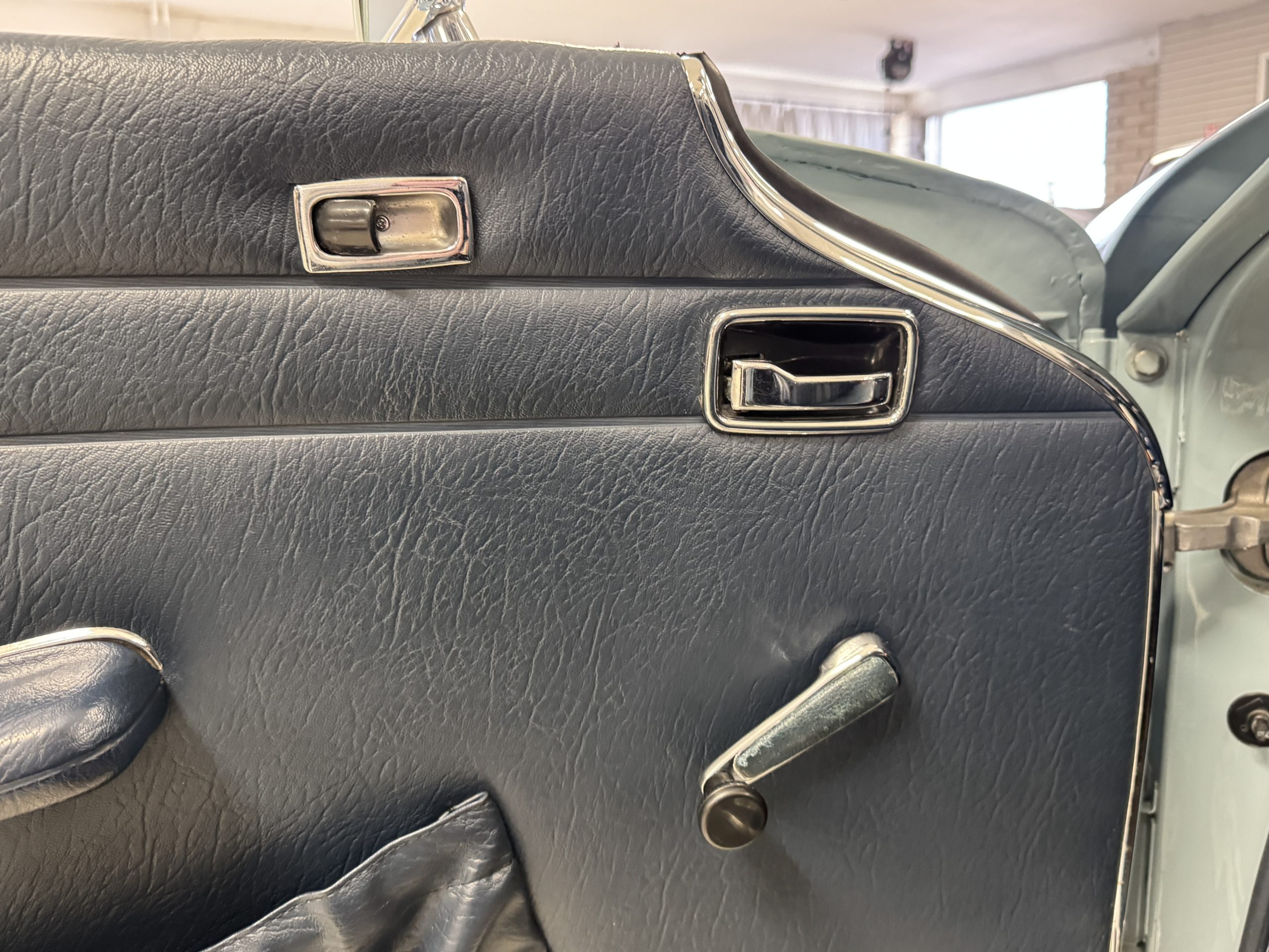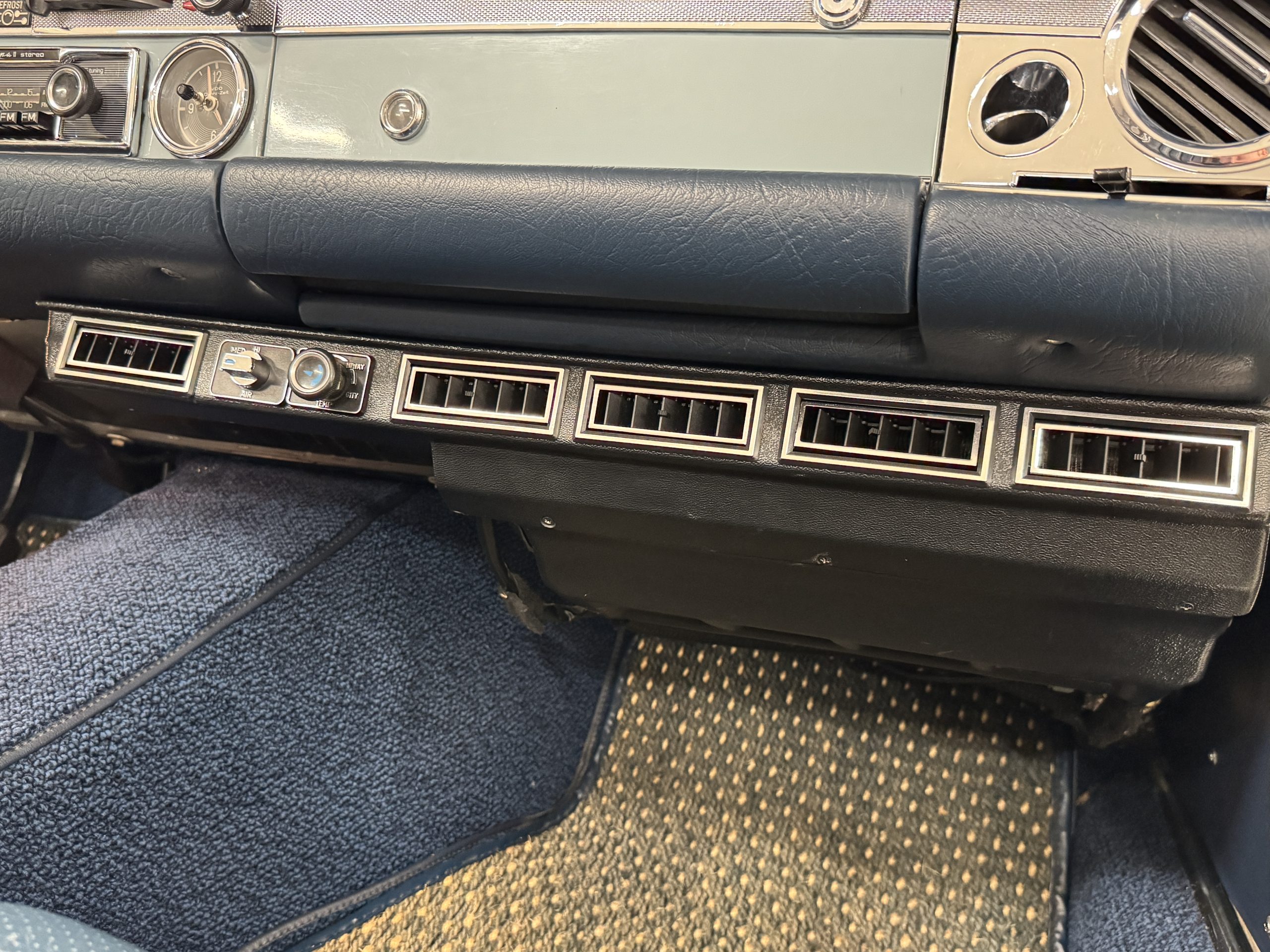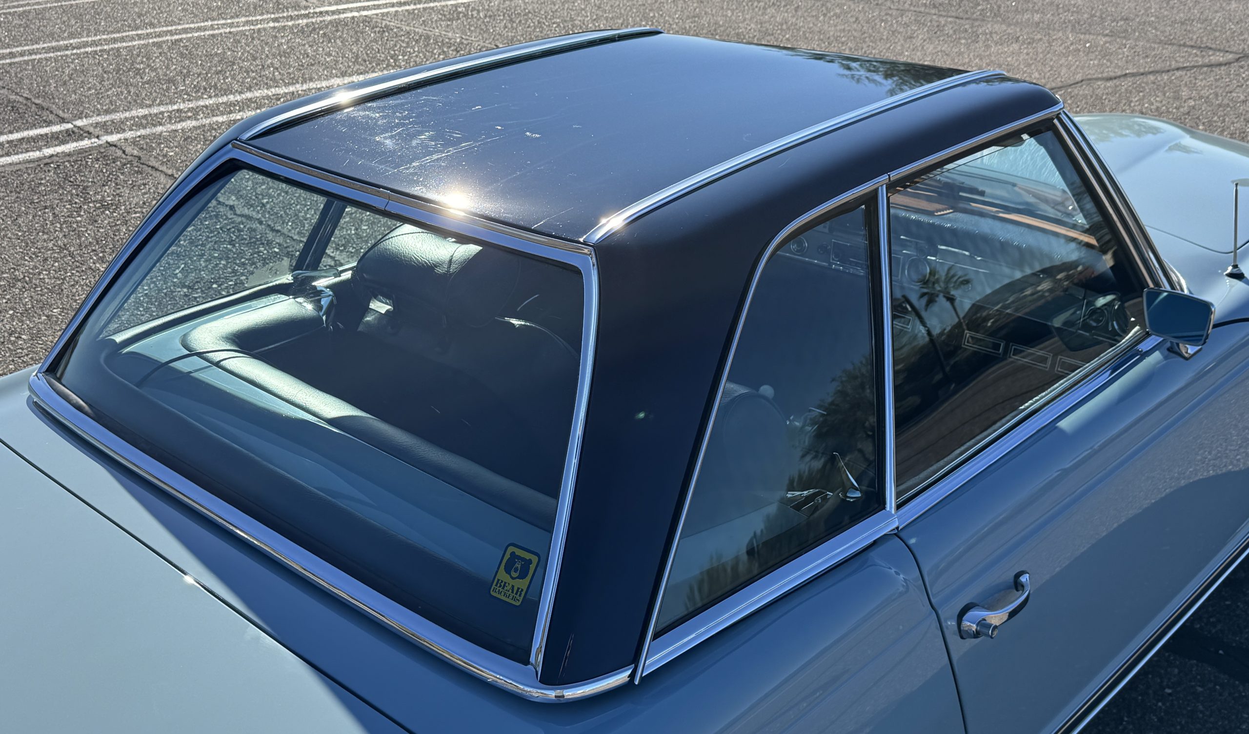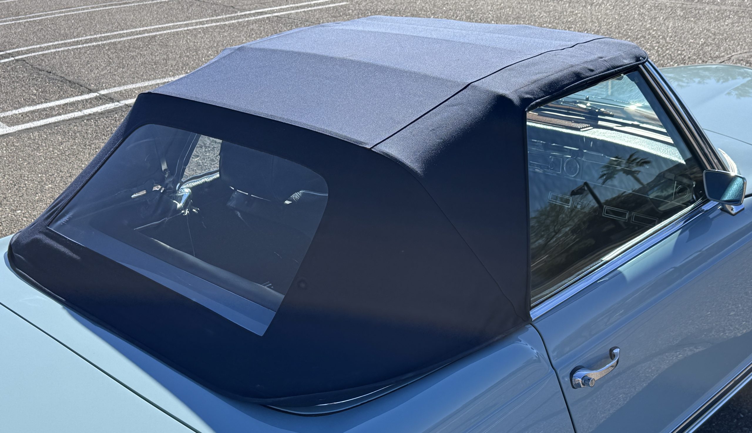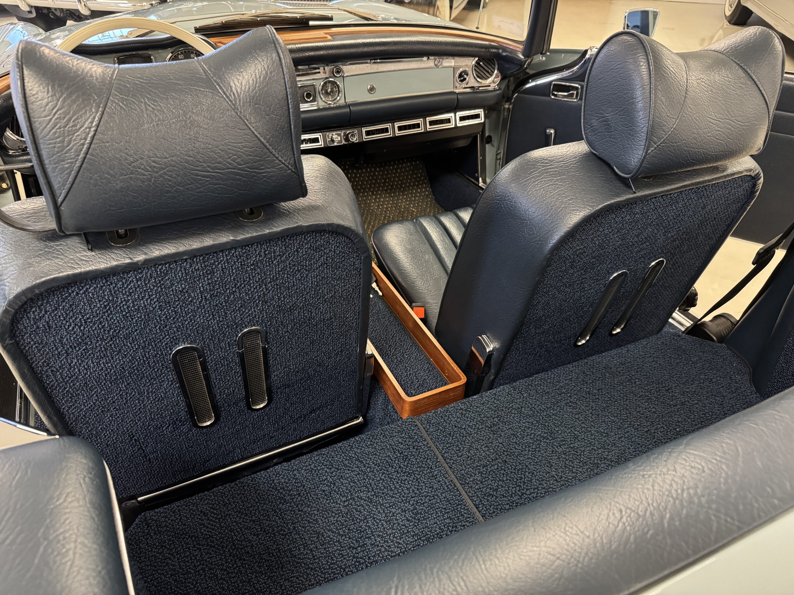 The two-tone exterior of the 280SL 022804 is finished in Horizon Blue (304 G) paired with a Midnight Blue removable Pagoda hard top (904 G) and a replaced stowable soft top of the same shade. The Mercedes was repainted (bare metal respray) with Horizon Blue paint when restored. The paint displays depth and consistency throughout remaining in excellent condition and the chrome trim is in excellent condition too. The windshield was replaced when restored with genuine Mercedes-Benz glass and remains in excellent condition. The hard top in Midnight Blue and dark blue softop are in excellent condition. Additional features include dual rearview mirrors, brand new thin-band whitewall tires, color-matched Mercedes hubcaps, and 14-inch steel wheels.