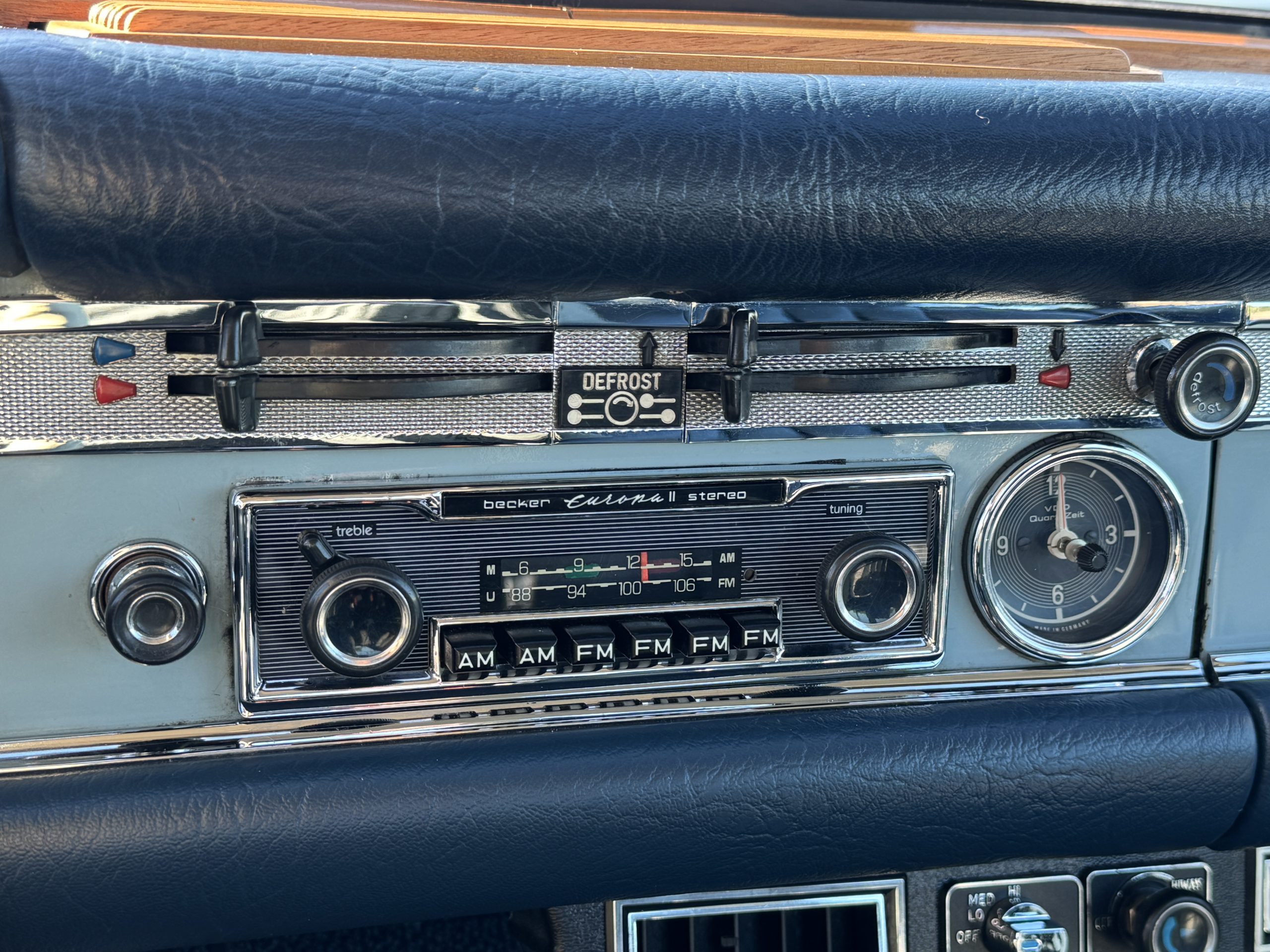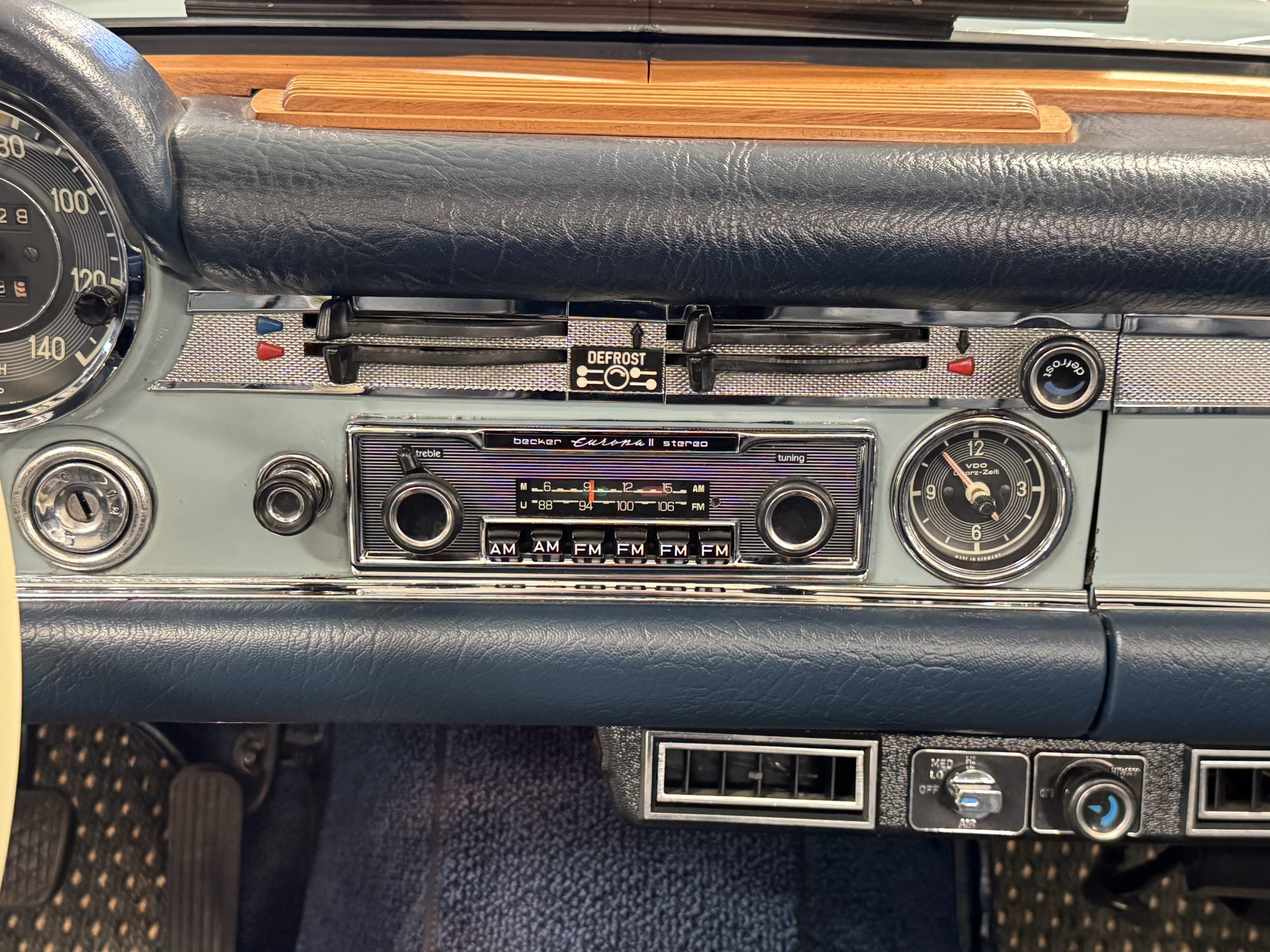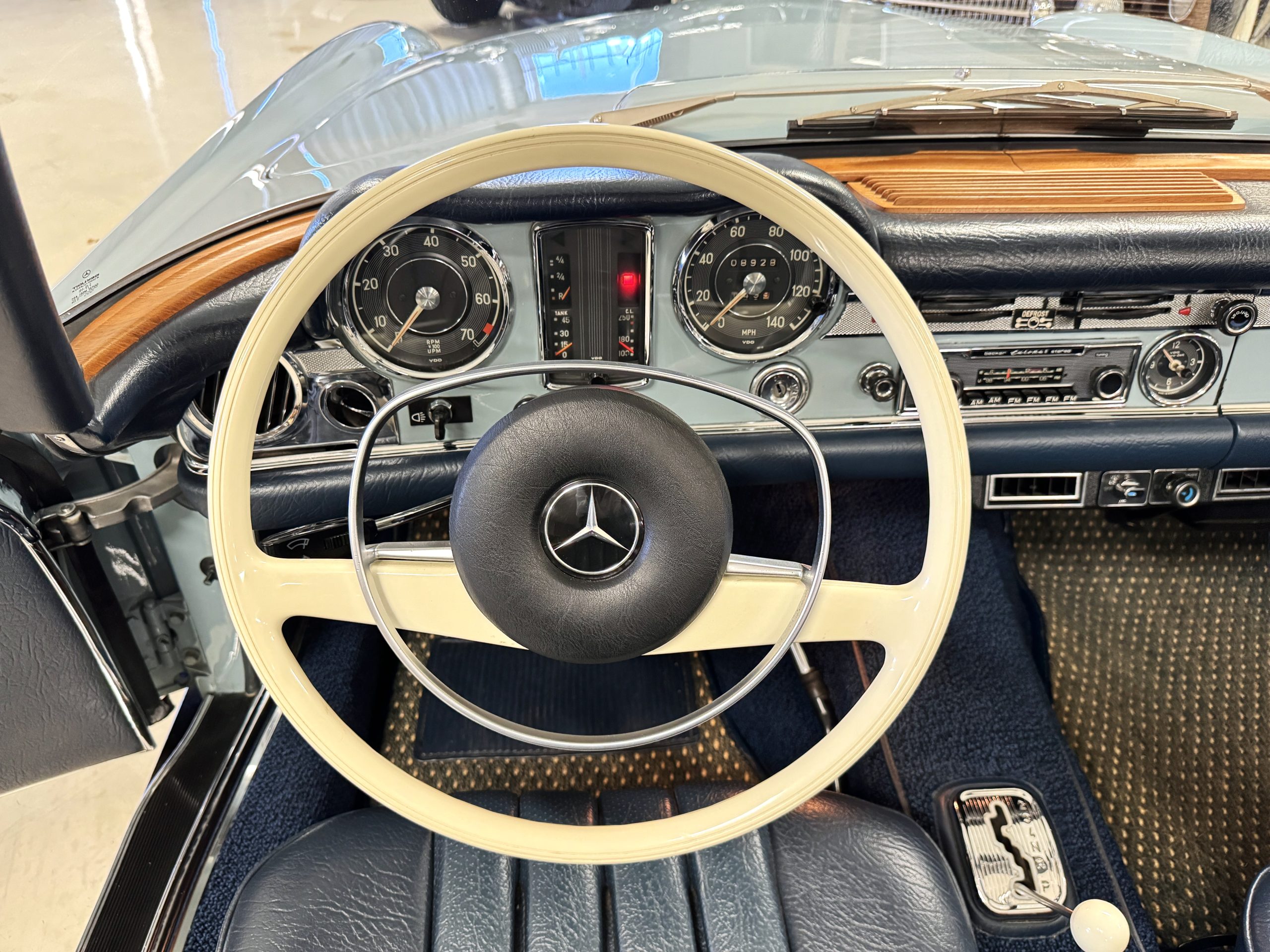 Inside, the Mercedes features dark blue MB-Tex vinyl bucket seats in excellent condition paired with matching rolled-pile carpeting that remains in excellent overall condition. The interior features beautiful wood trim, a period correct Becker Europa II AM/FM stereo upgraded with an iPod connection, white steering wheel that matches an original option, and functional gauges. Desirable upgraded amenities include air conditioning and rear-window defrost for the hard top. The seating position, switchgear, and ergonomics reflect the thoughtful construction that made the 280SL one of the most respected grand touring roadsters of its time.