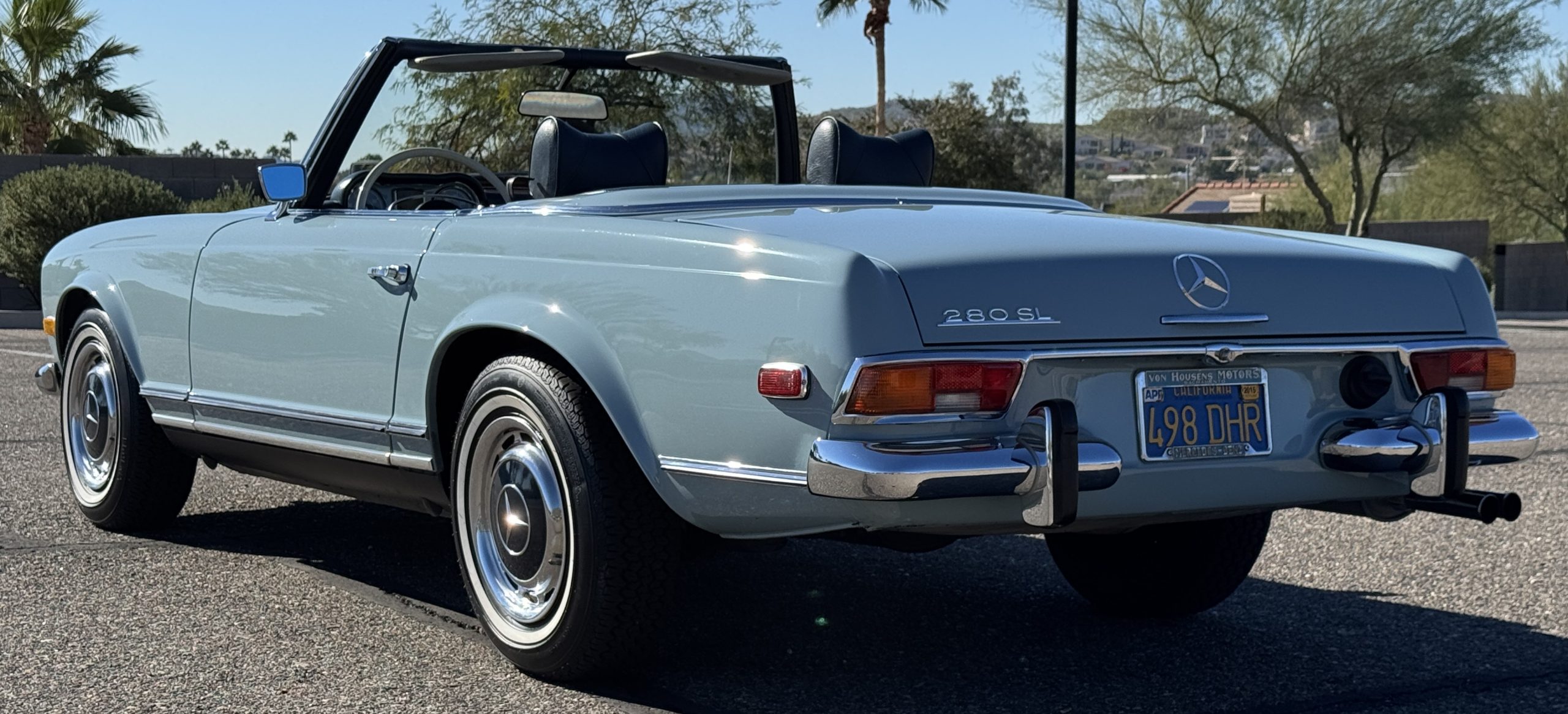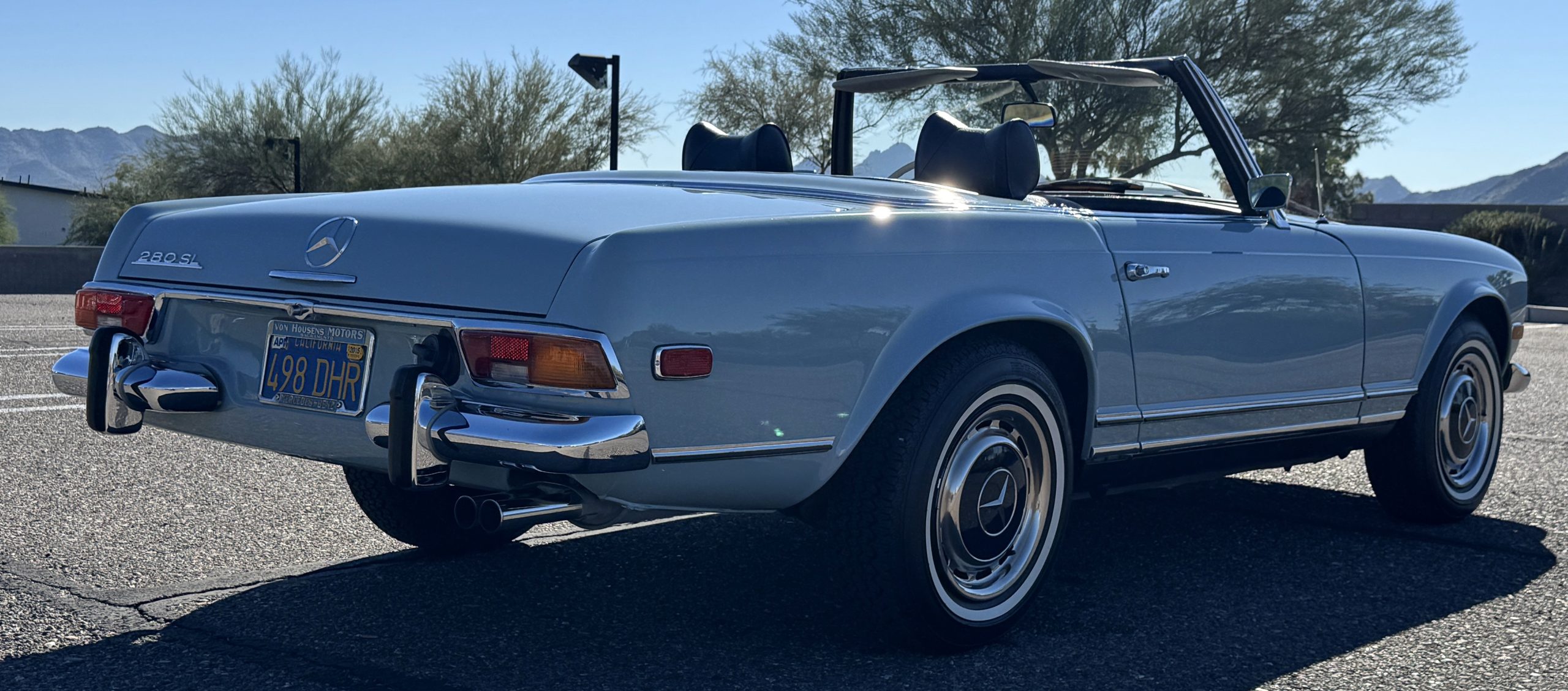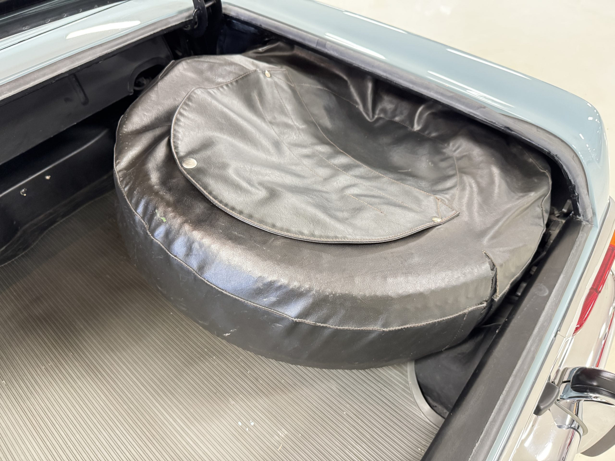 This 280SL comes complete with original owner’s and service manuals, owner certificate card, new blue Coco floor mats, spare tire with cover in the trunk, partial service records, and four additional hubcaps.